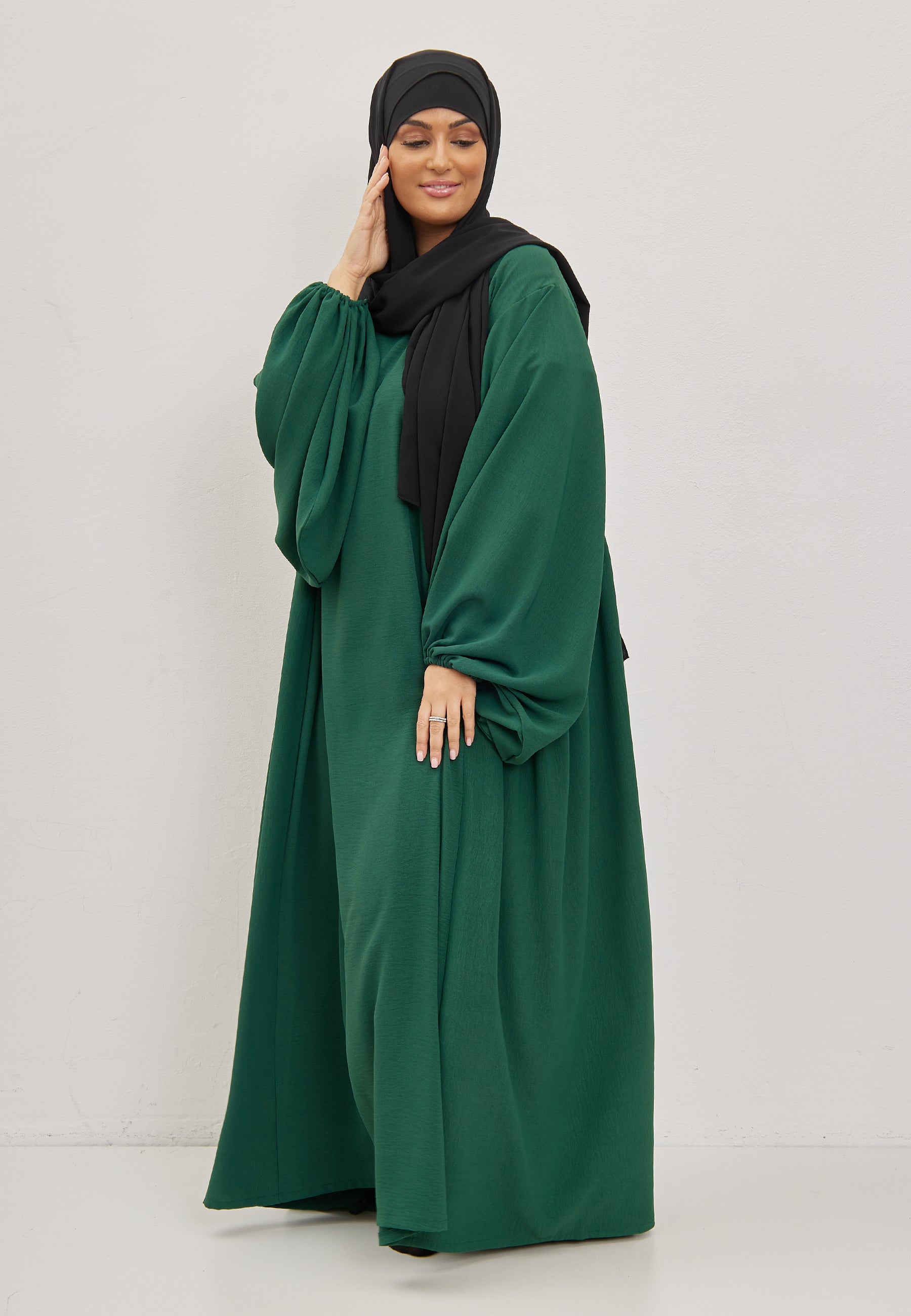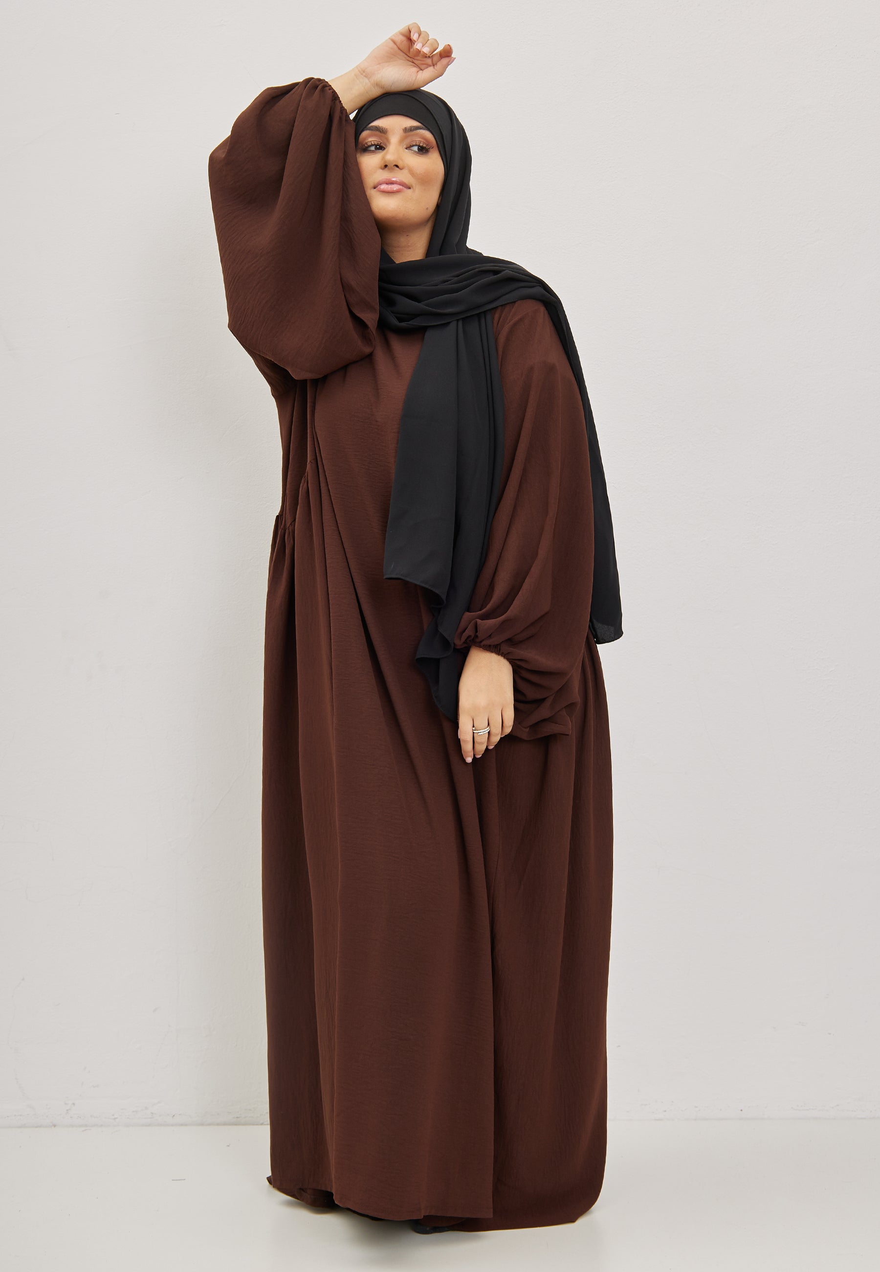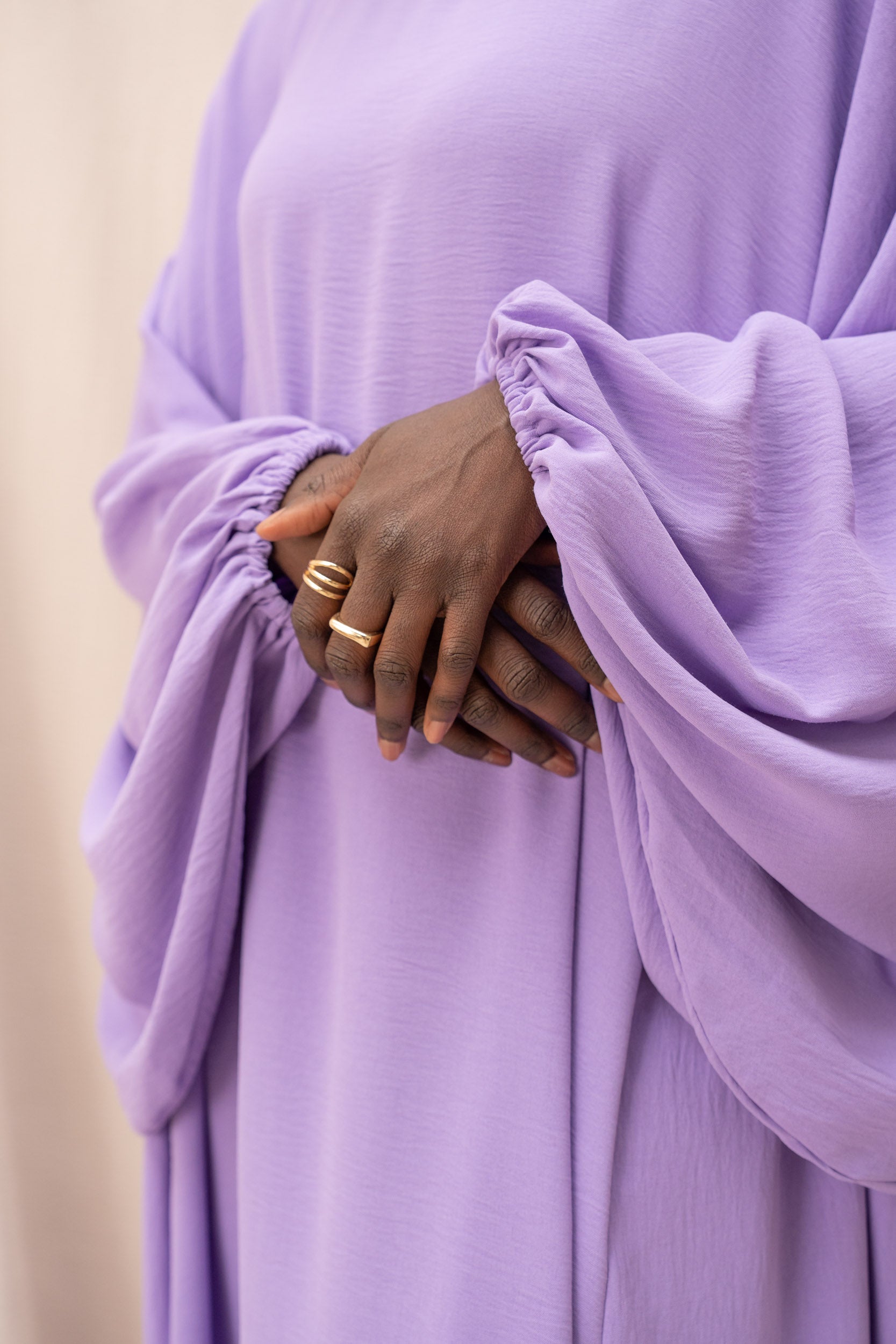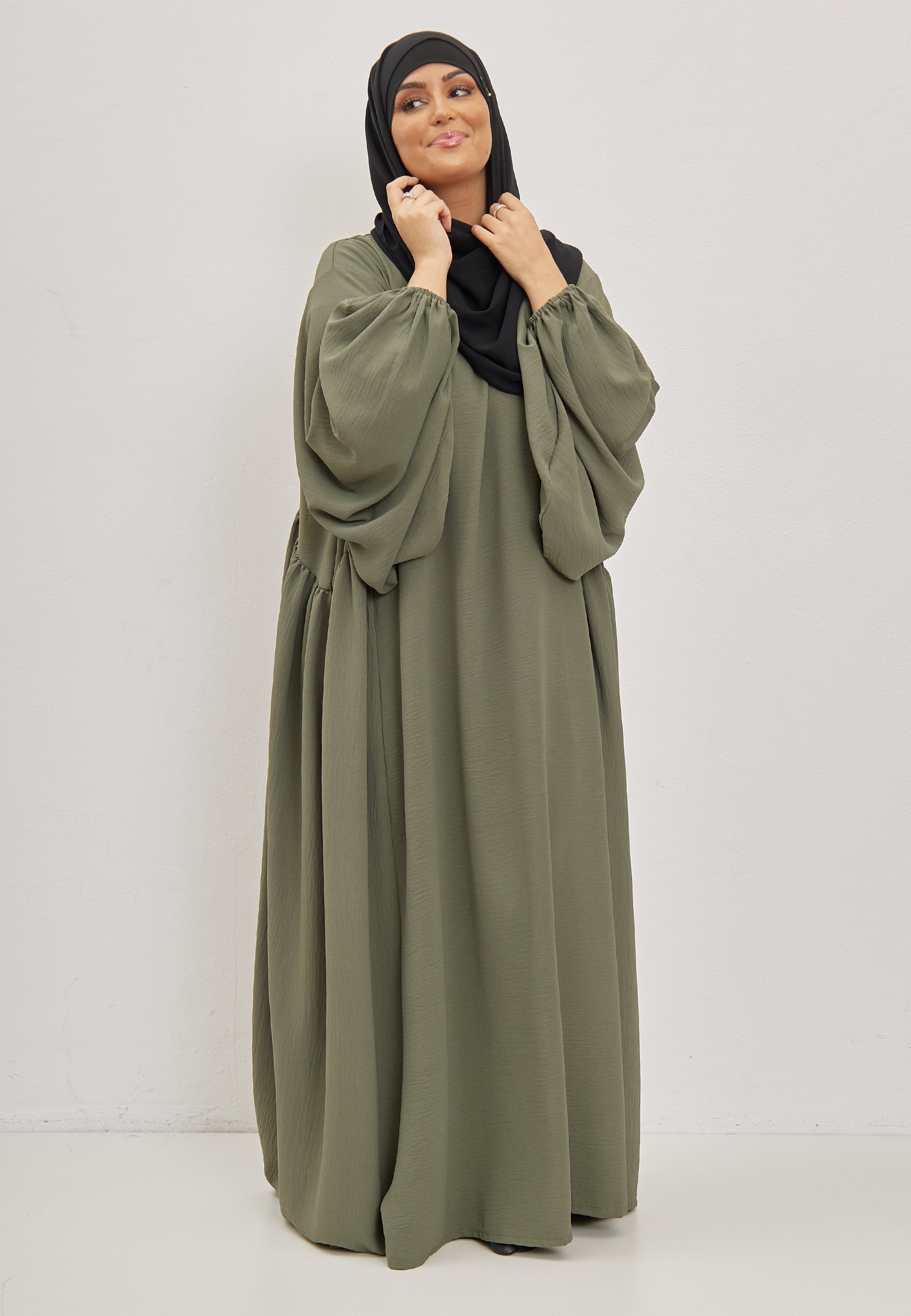 L’Abaya Jada, en jazz fluide, mêle modernité et légèreté. Idéale pour l’été, elle se porte aussi bien lors d’occasions entre amis ou en famille. Ses manches ballon ajoutent du volume pour une silhouette équilibrée.