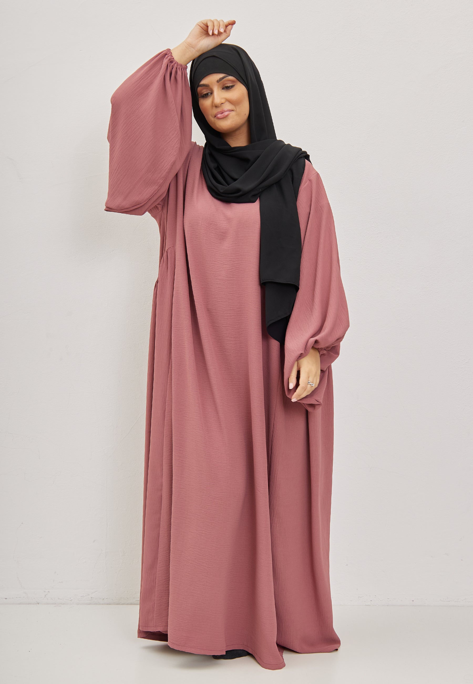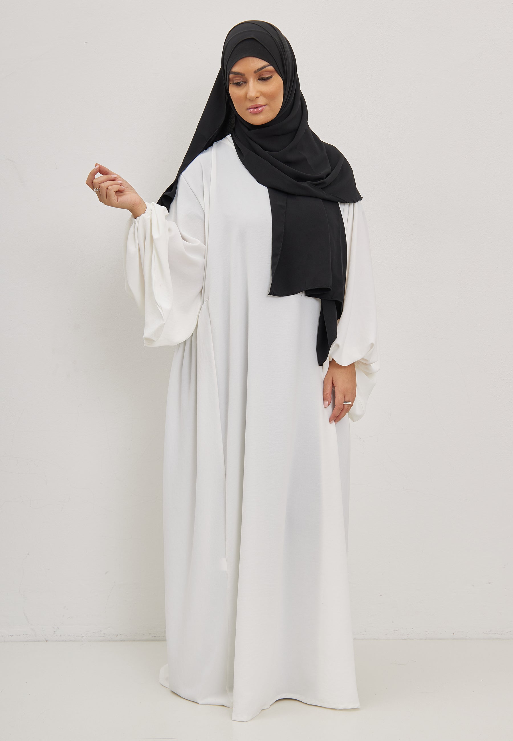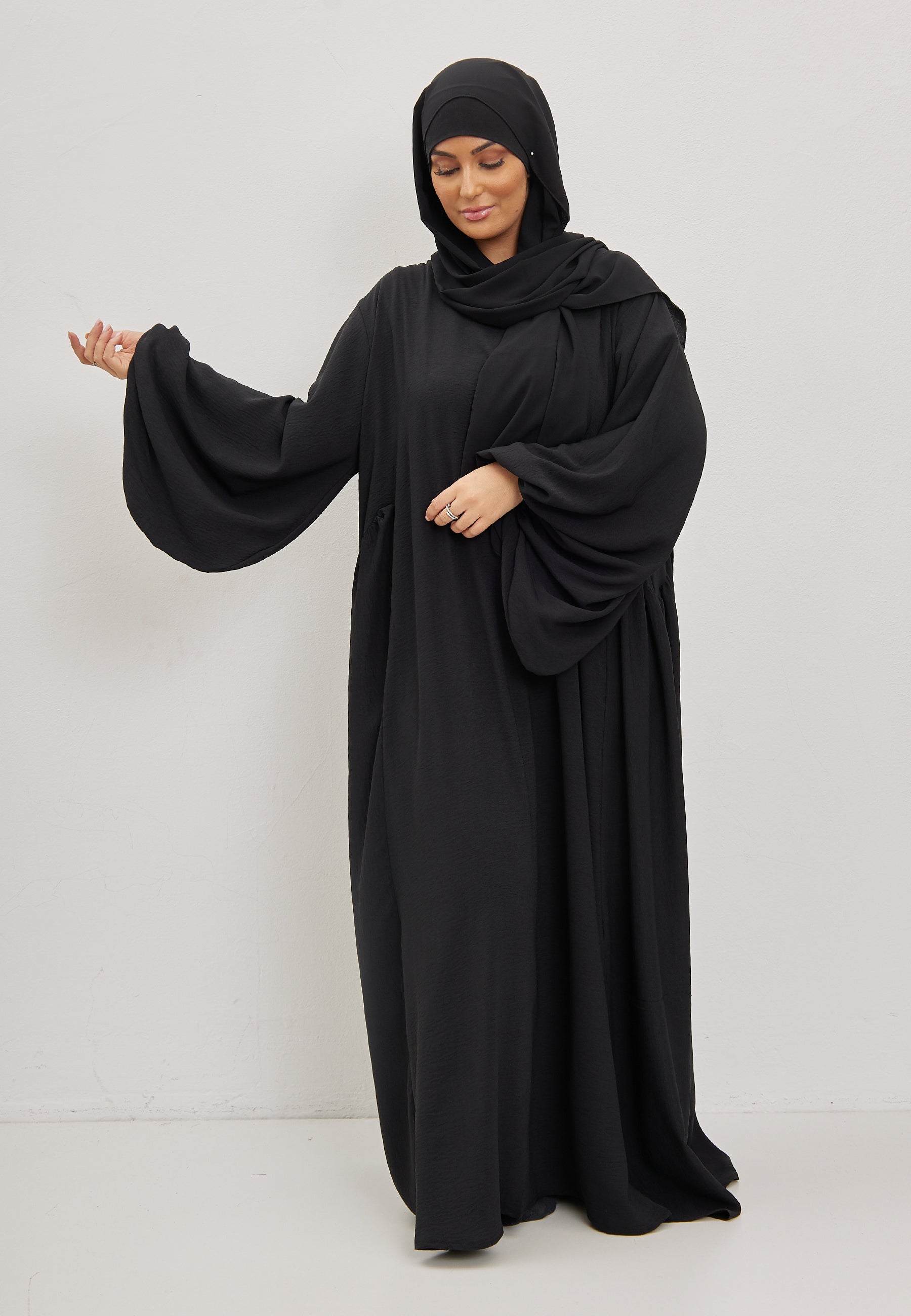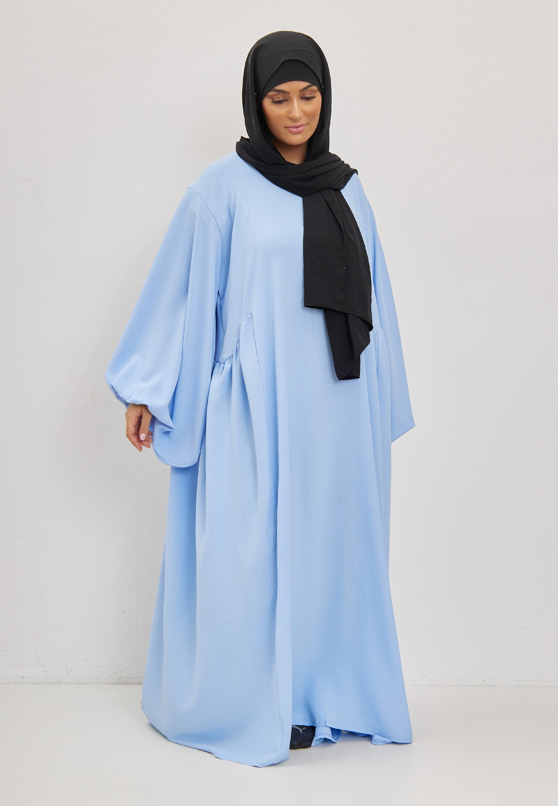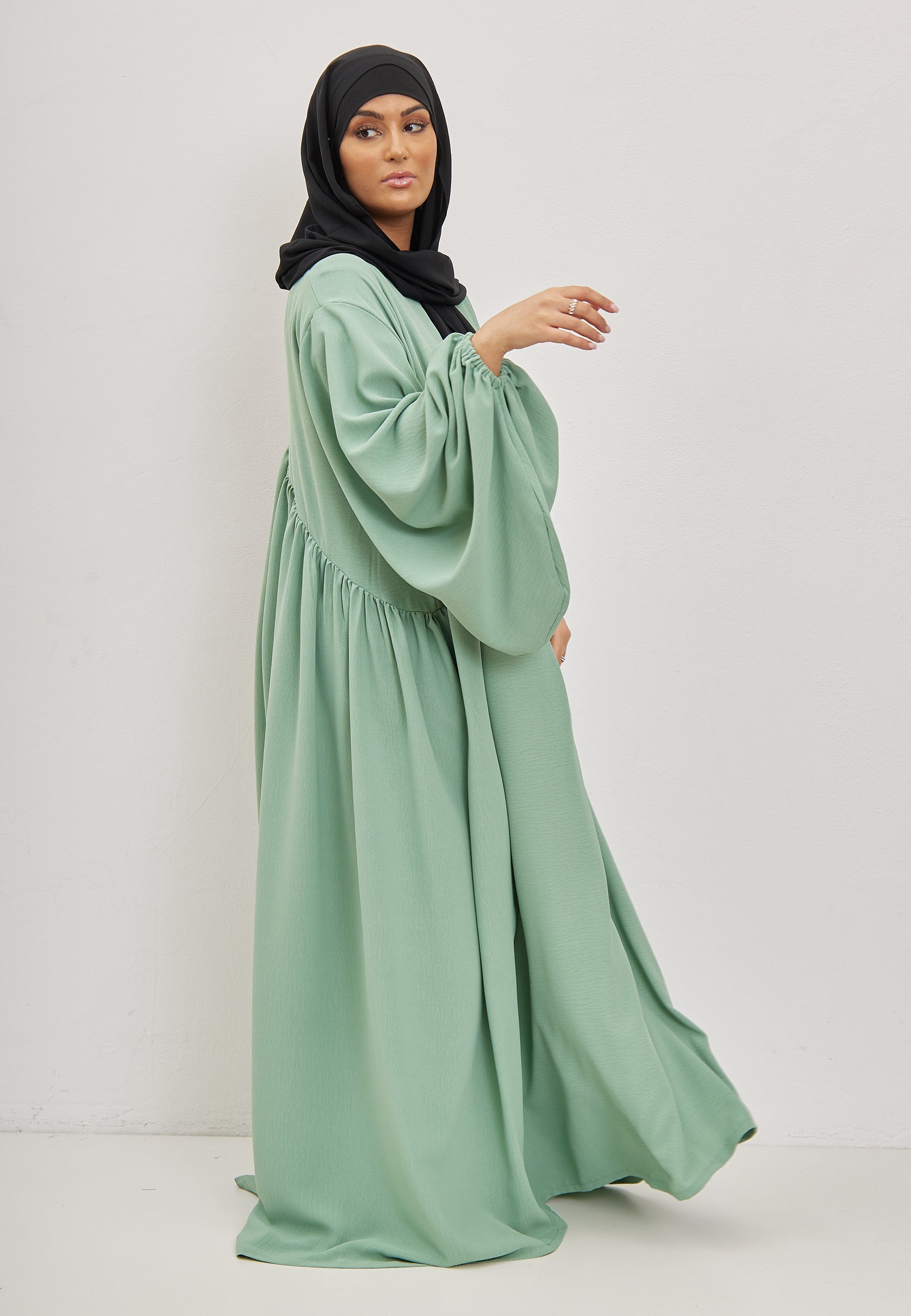 L’Abaya Jada, en jazz fluide, mêle modernité et légèreté. Idéale pour l’été, elle se porte aussi bien lors d’occasions entre amis ou en famille. Ses manches ballon ajoutent du volume pour une silhouette équilibrée.