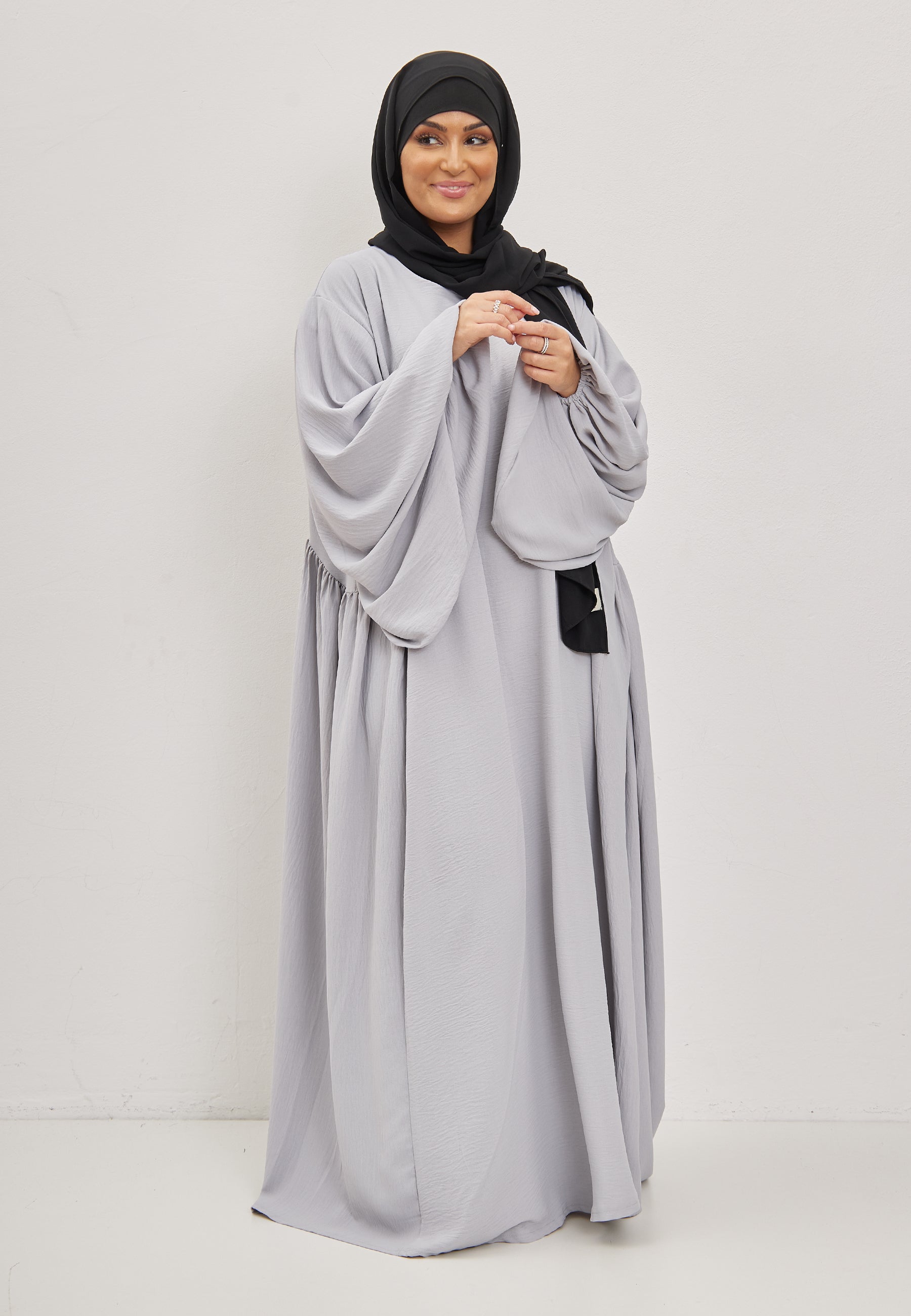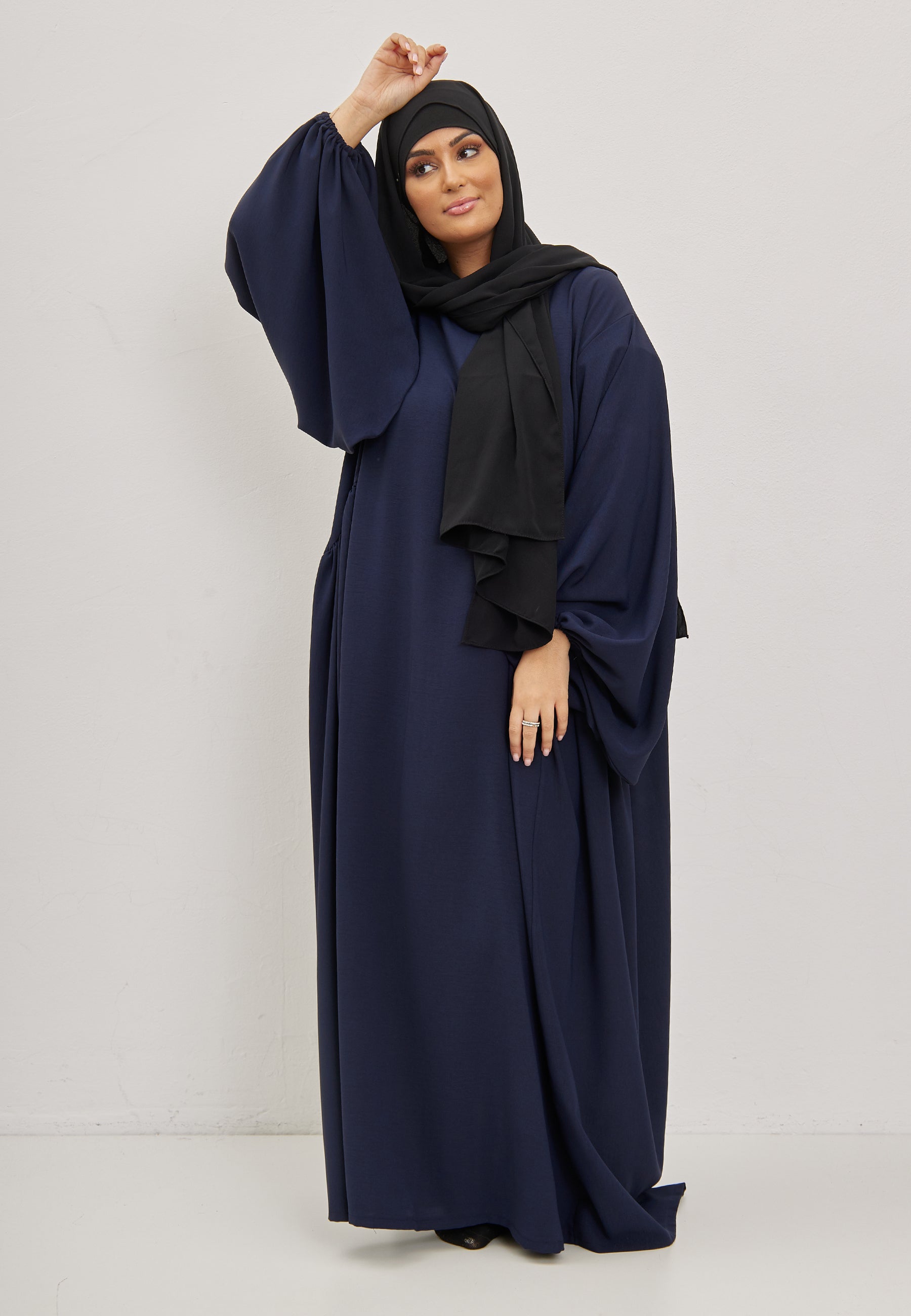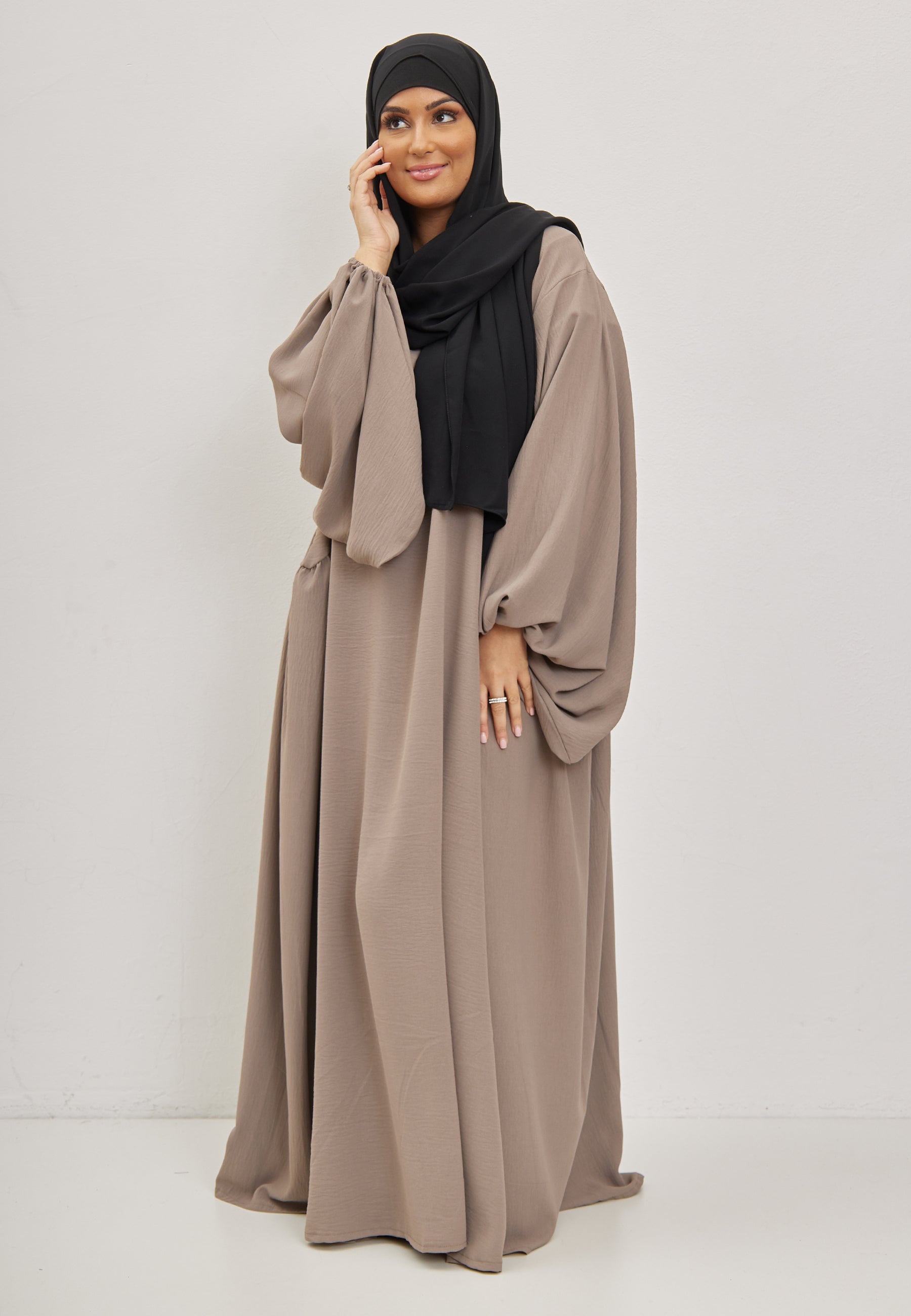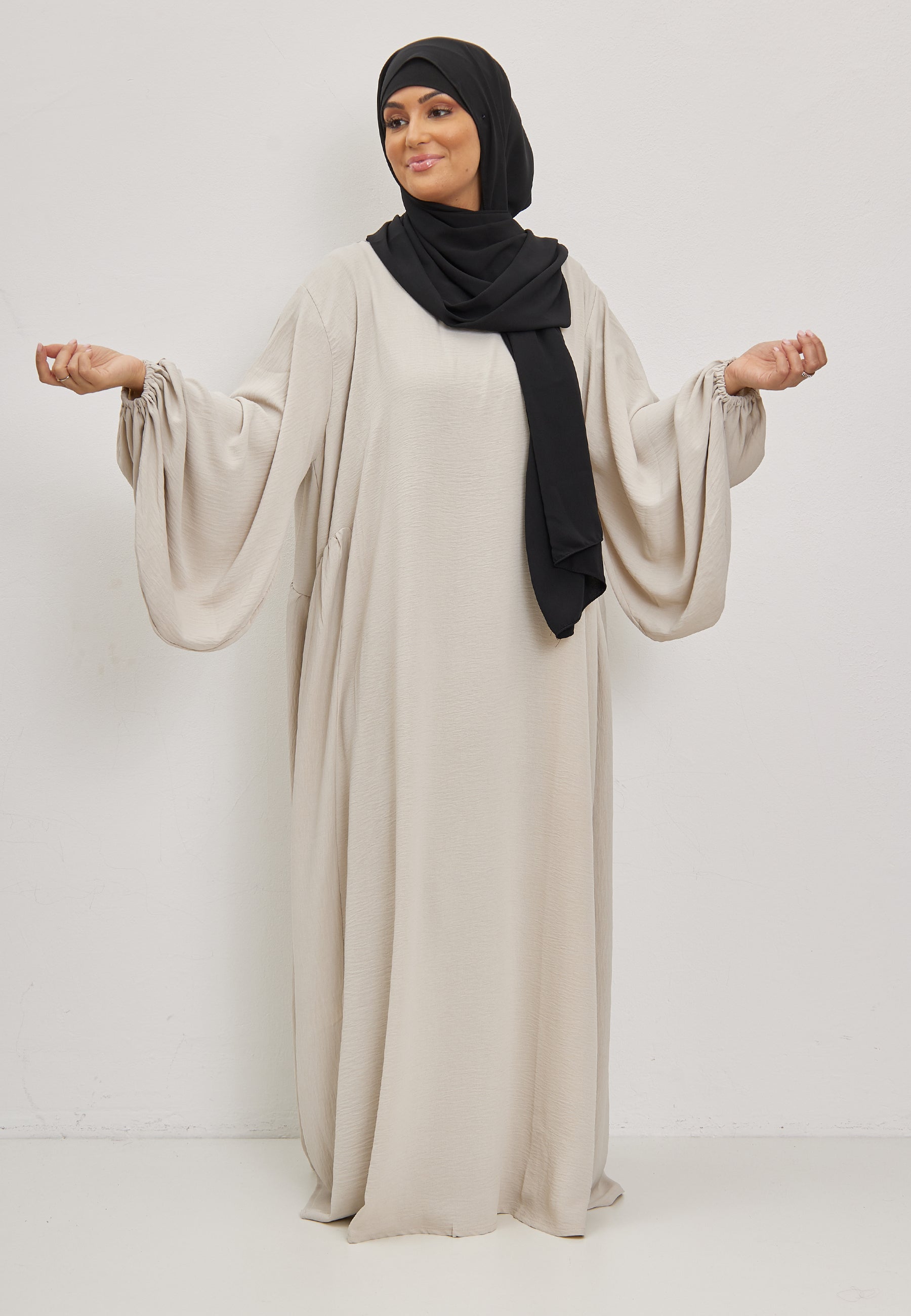 L’Abaya Jada, en jazz fluide, mêle modernité et légèreté. Idéale pour l’été, elle se porte aussi bien lors d’occasions entre amis ou en famille. Ses manches ballon ajoutent du volume pour une silhouette équilibrée.