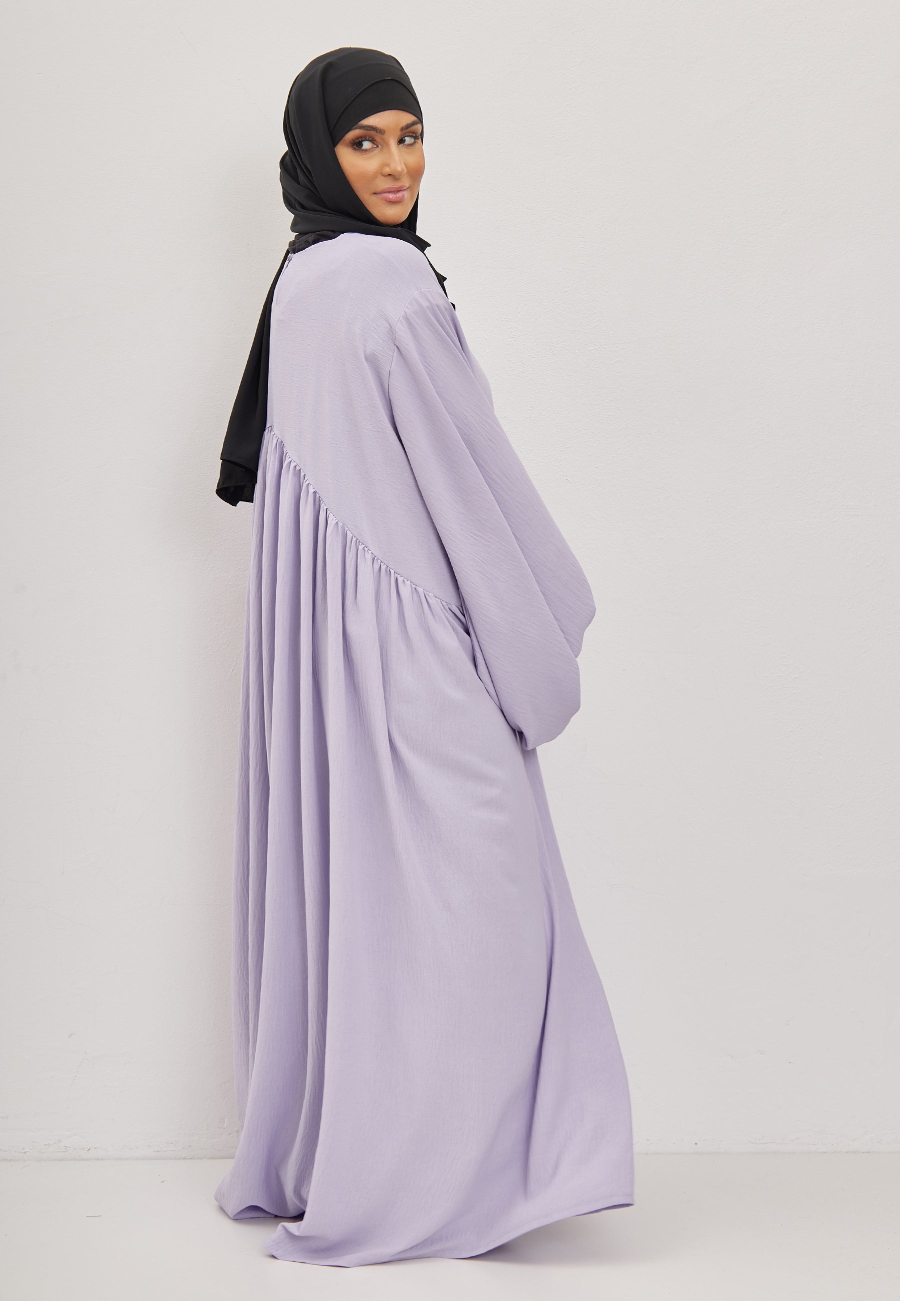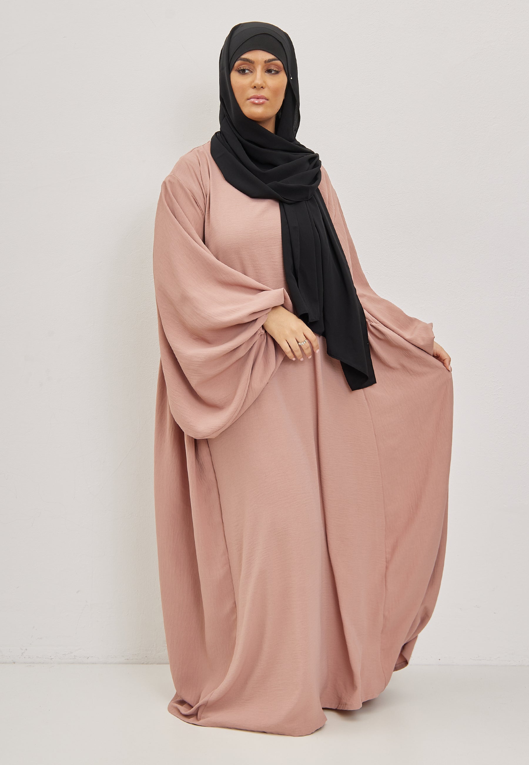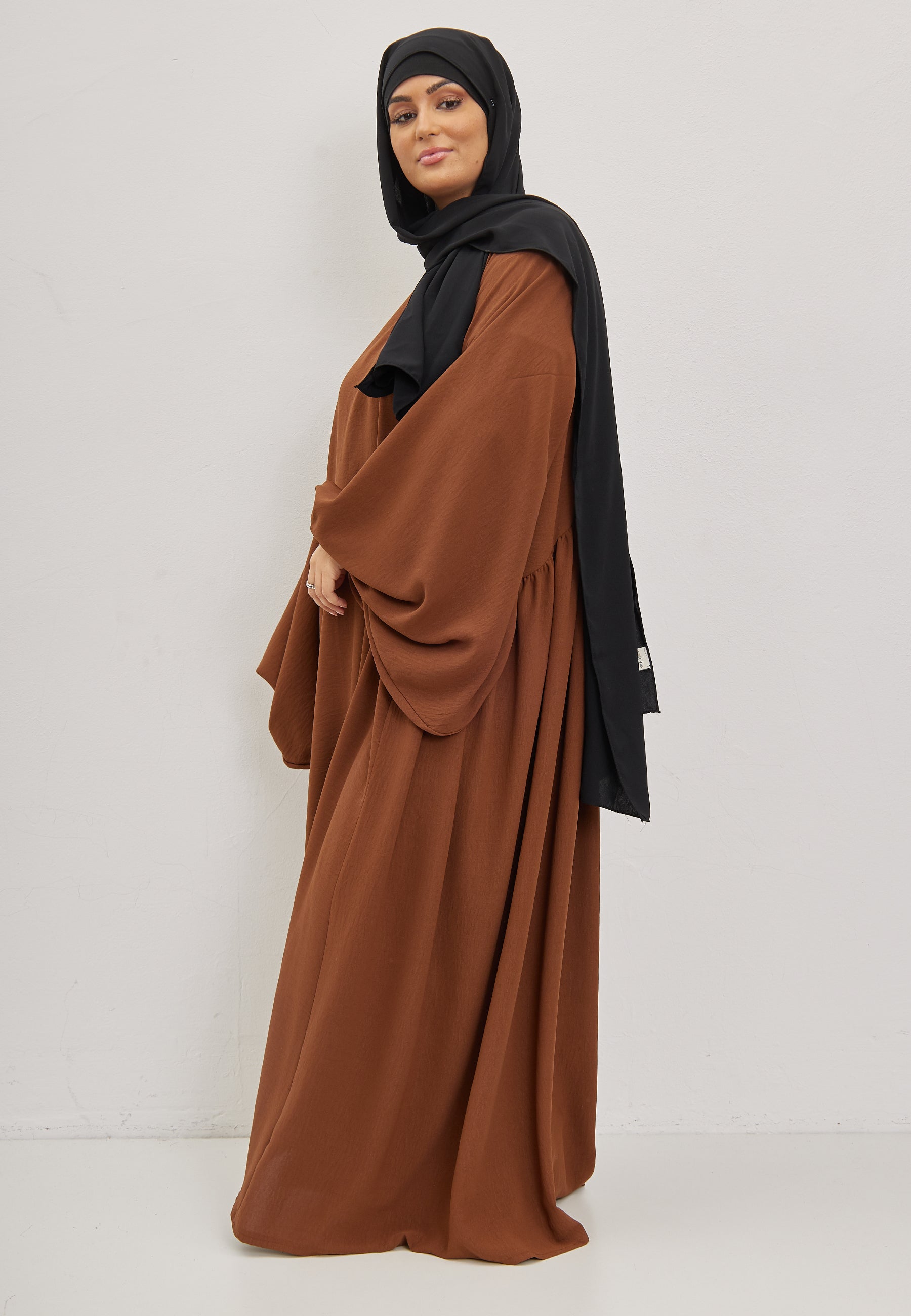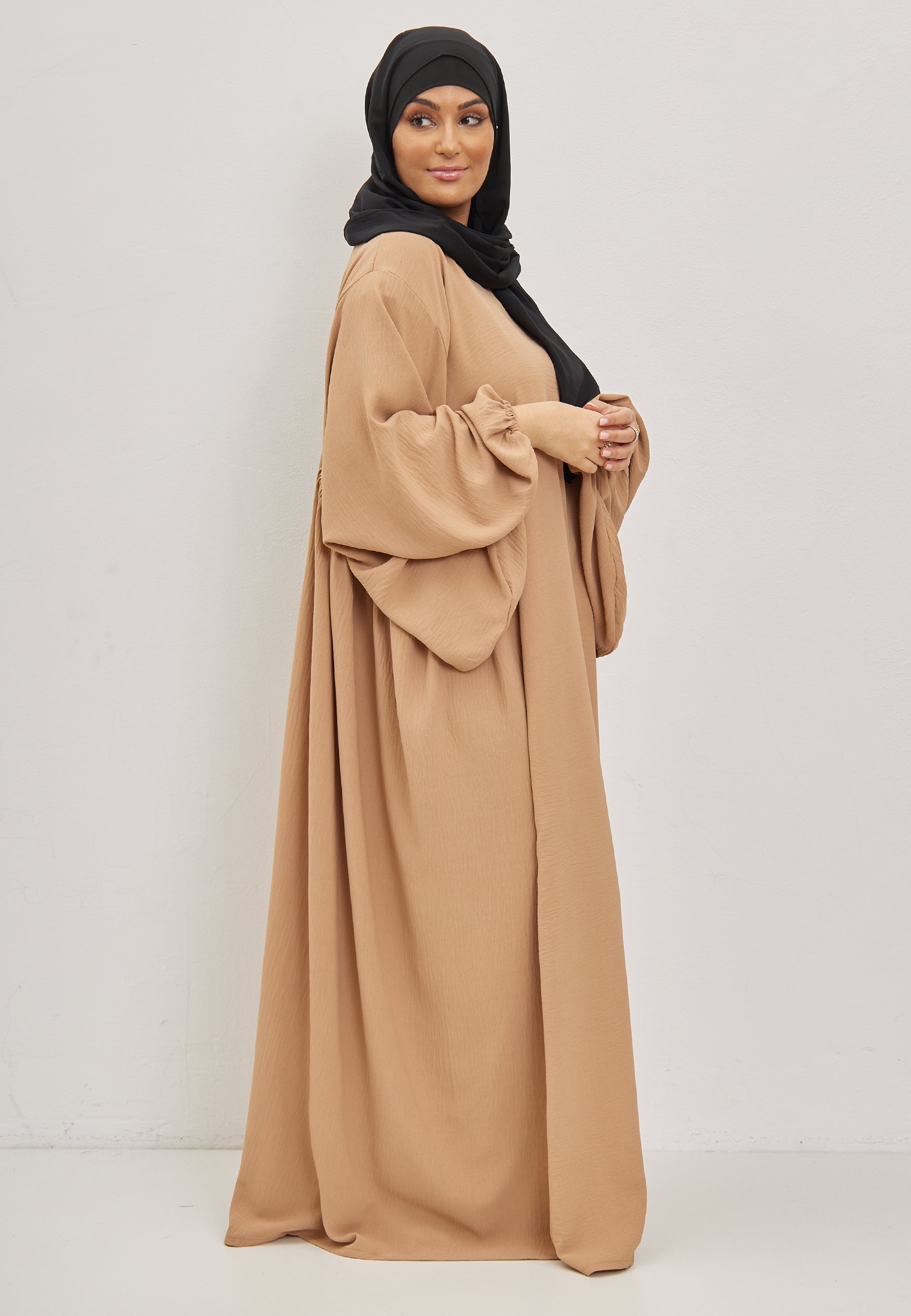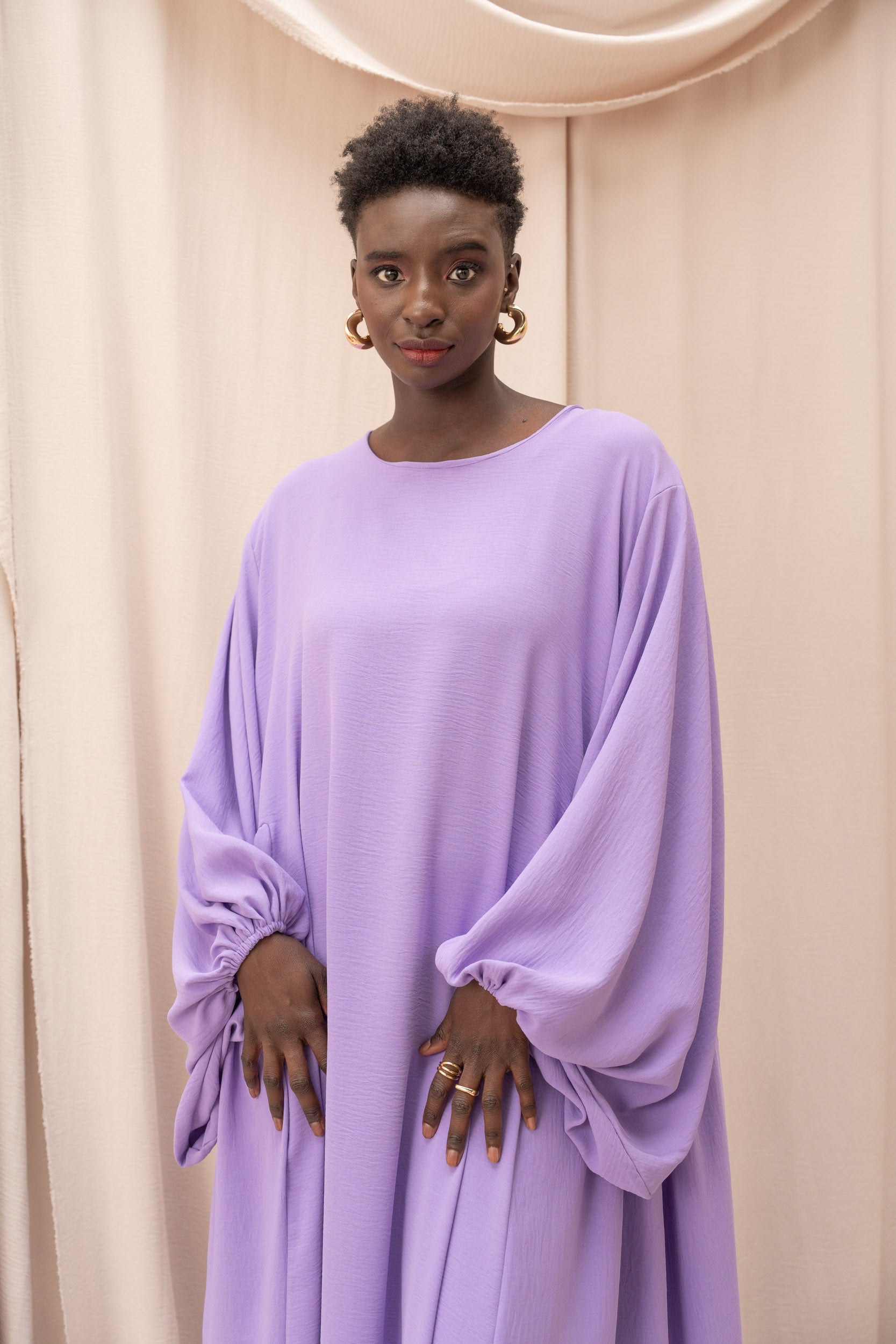 L’Abaya Jada, en jazz fluide, mêle modernité et légèreté. Idéale pour l’été, elle se porte aussi bien lors d’occasions entre amis ou en famille. Ses manches ballon ajoutent du volume pour une silhouette équilibrée.