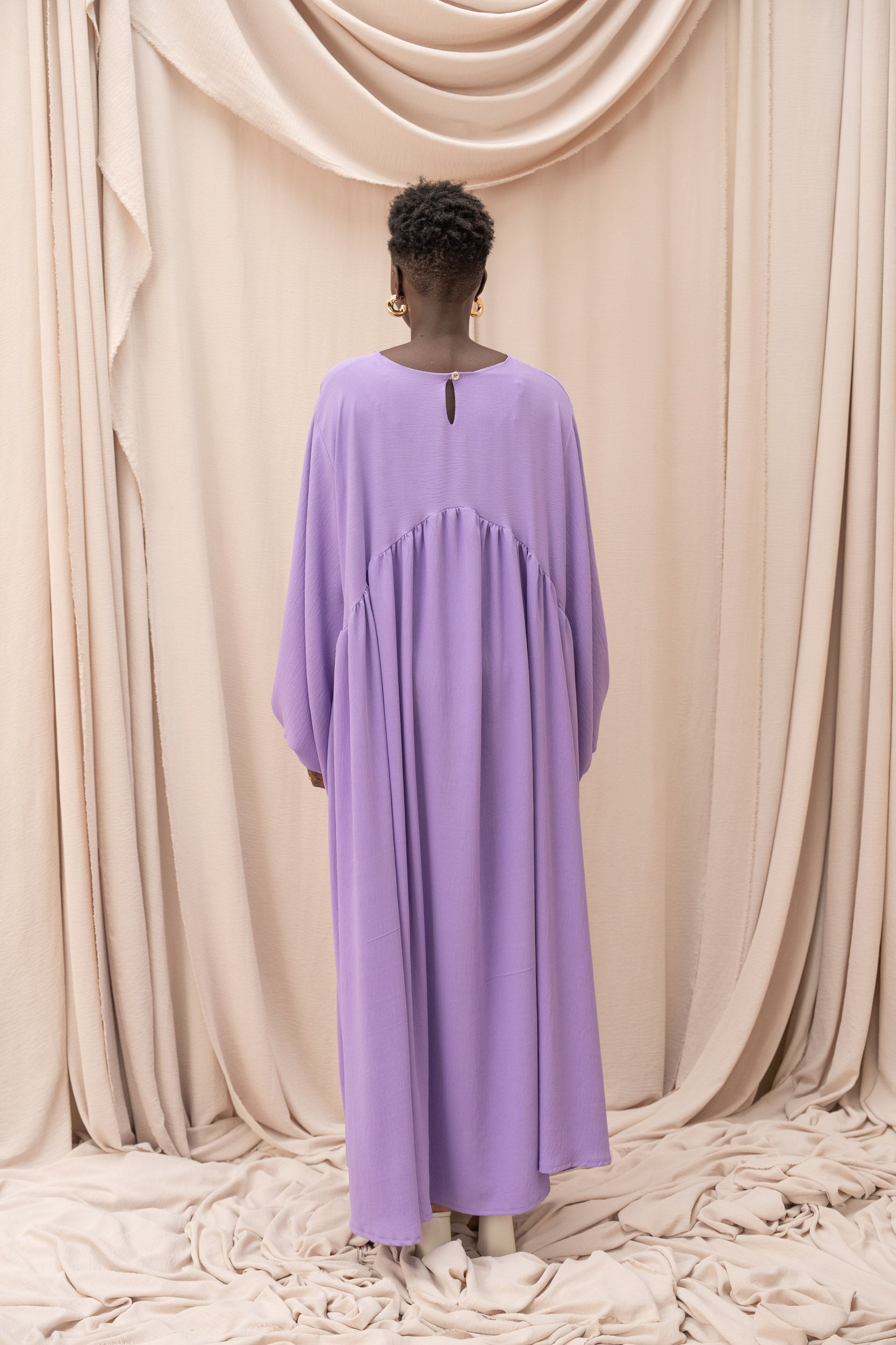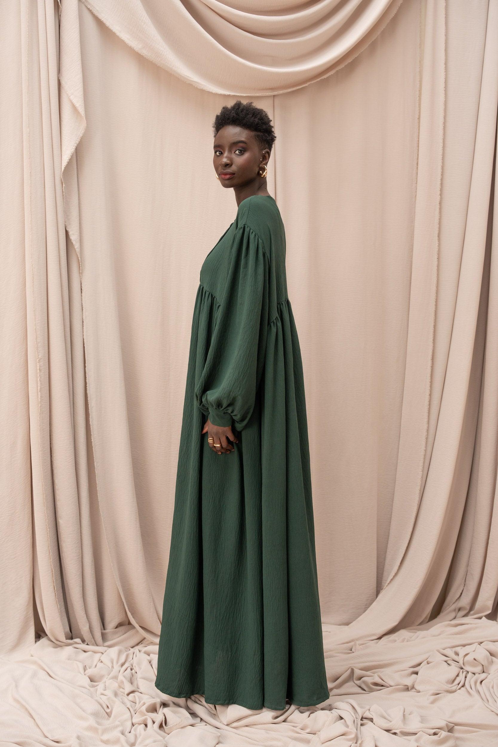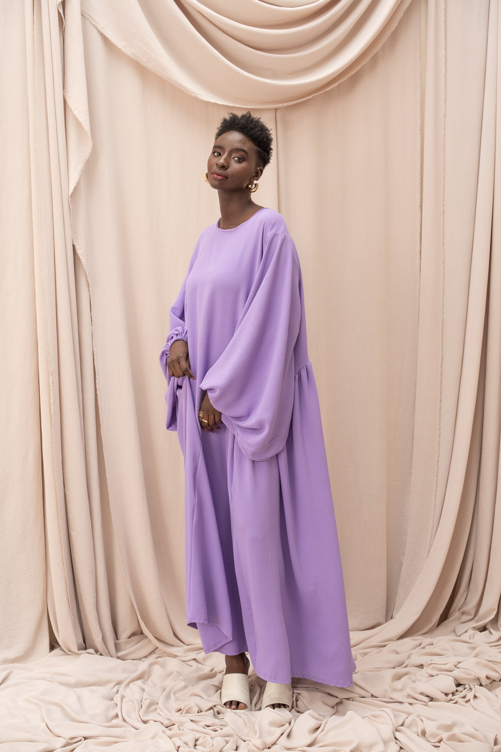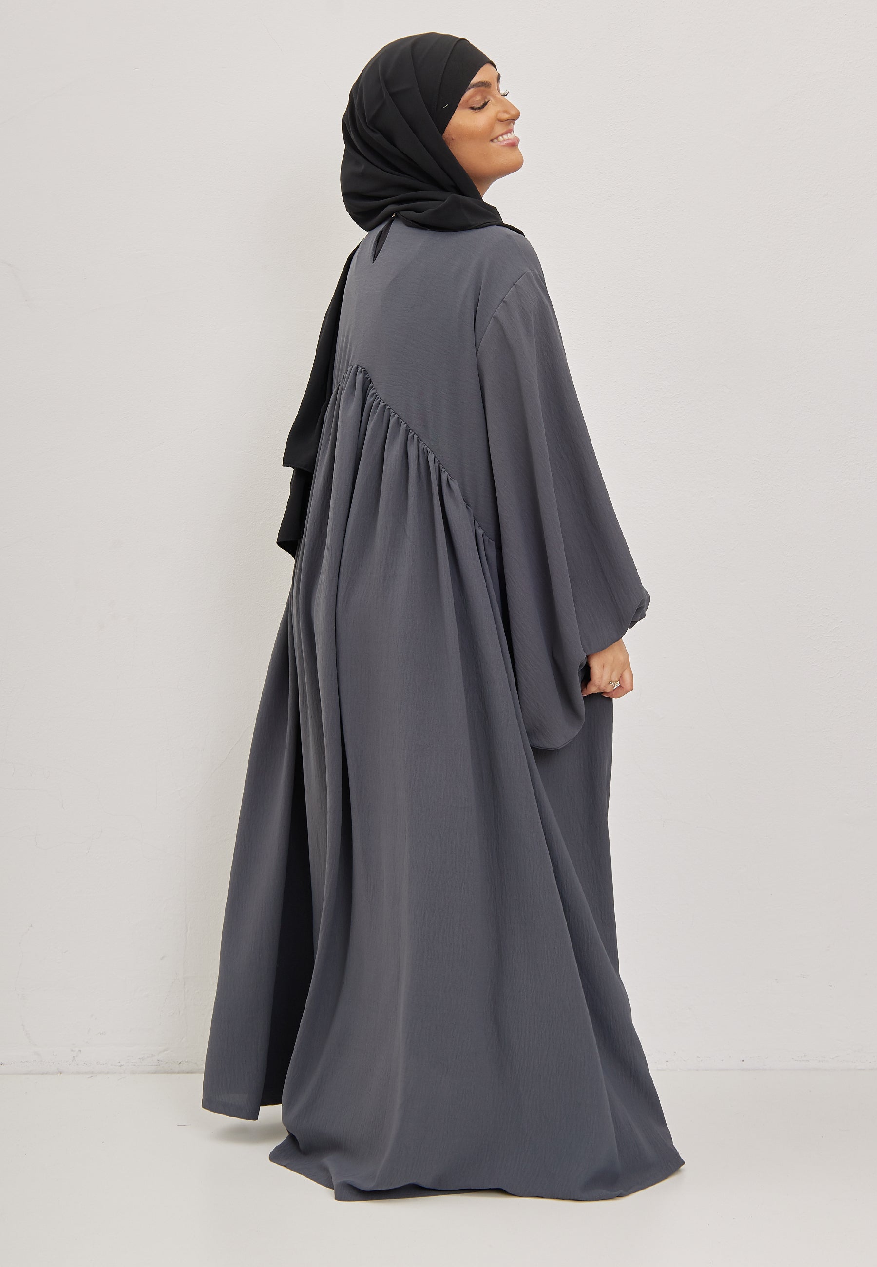 L’Abaya Jada, en jazz fluide, mêle modernité et légèreté. Idéale pour l’été, elle se porte aussi bien lors d’occasions entre amis ou en famille. Ses manches ballon ajoutent du volume pour une silhouette équilibrée.
