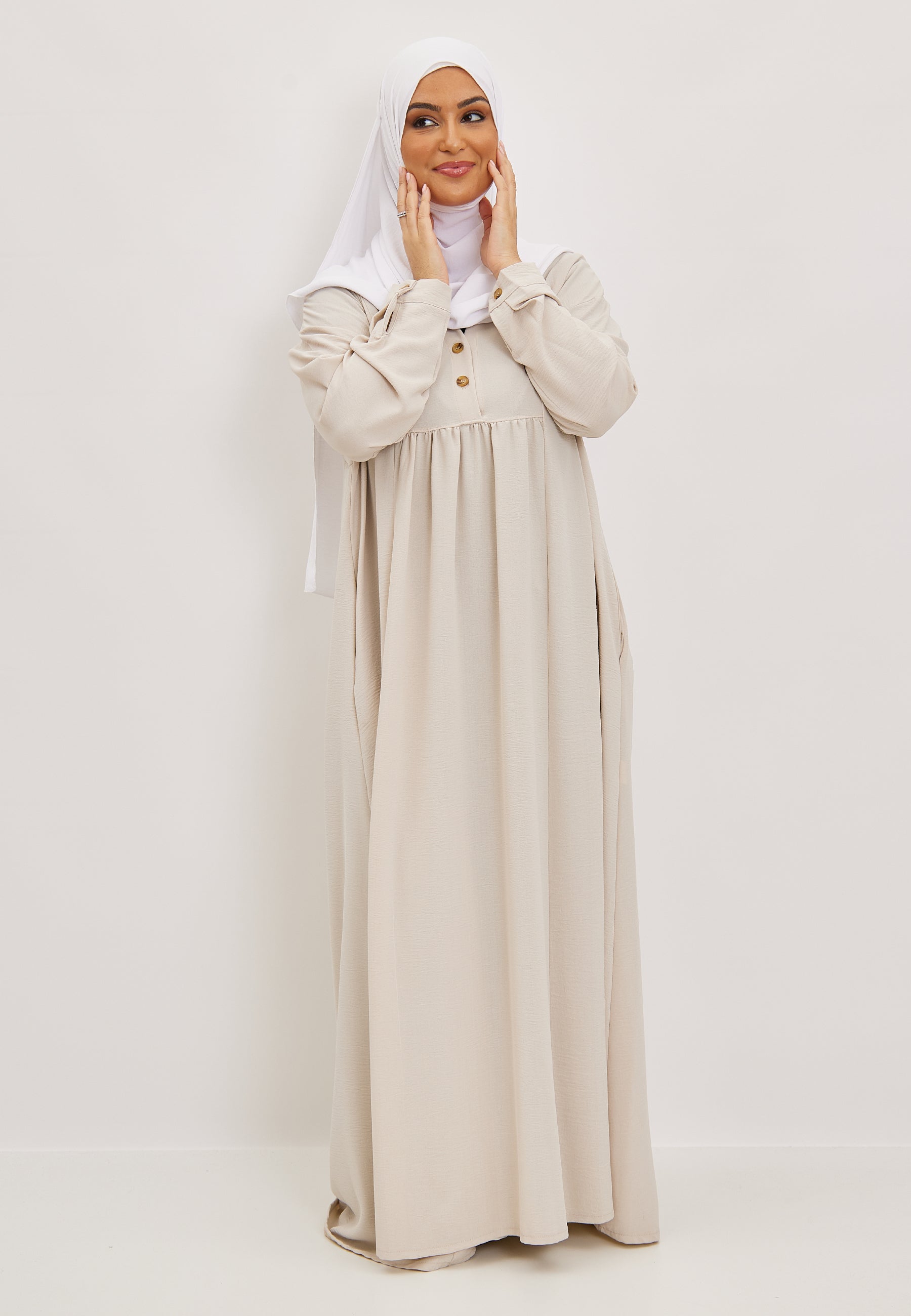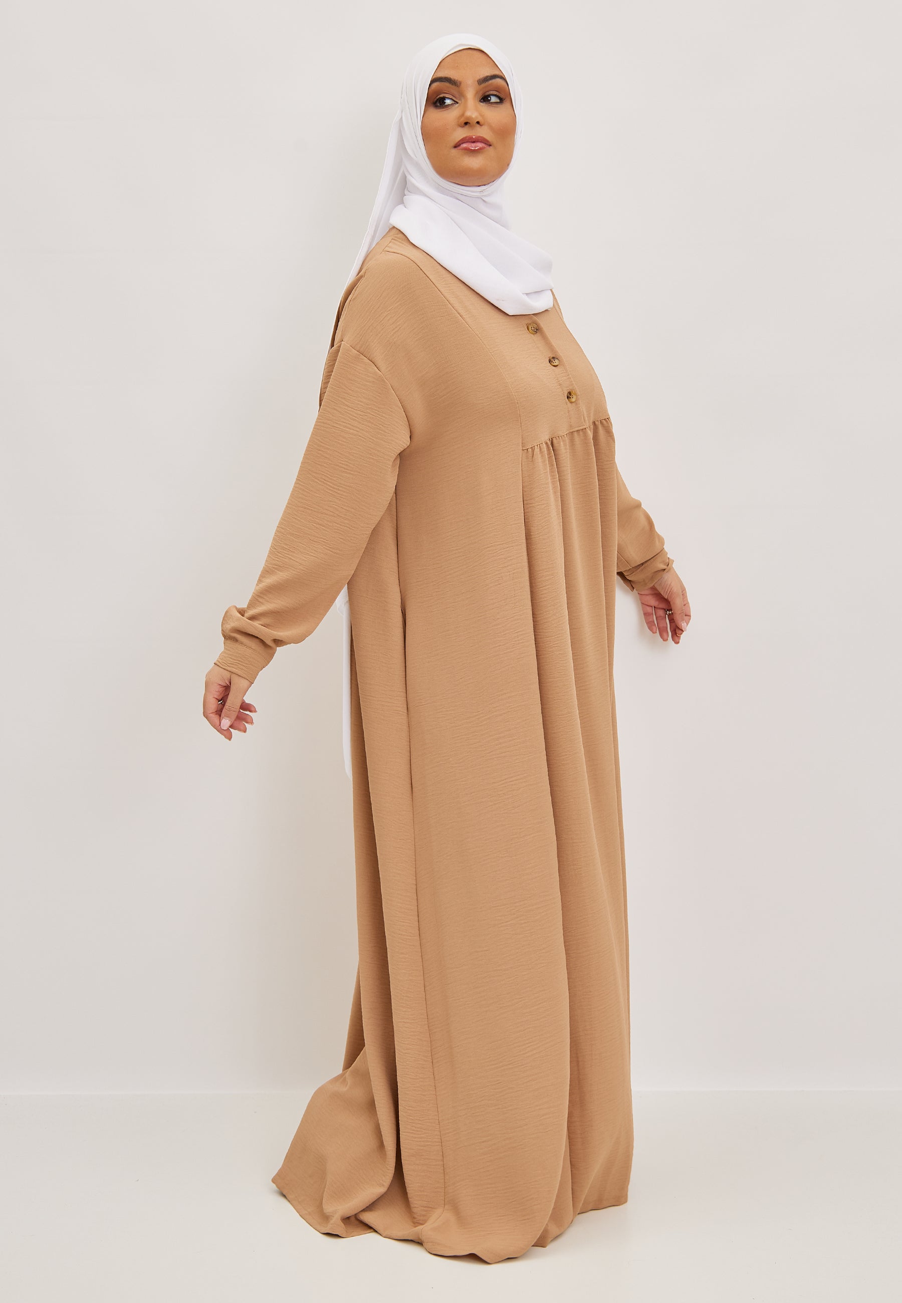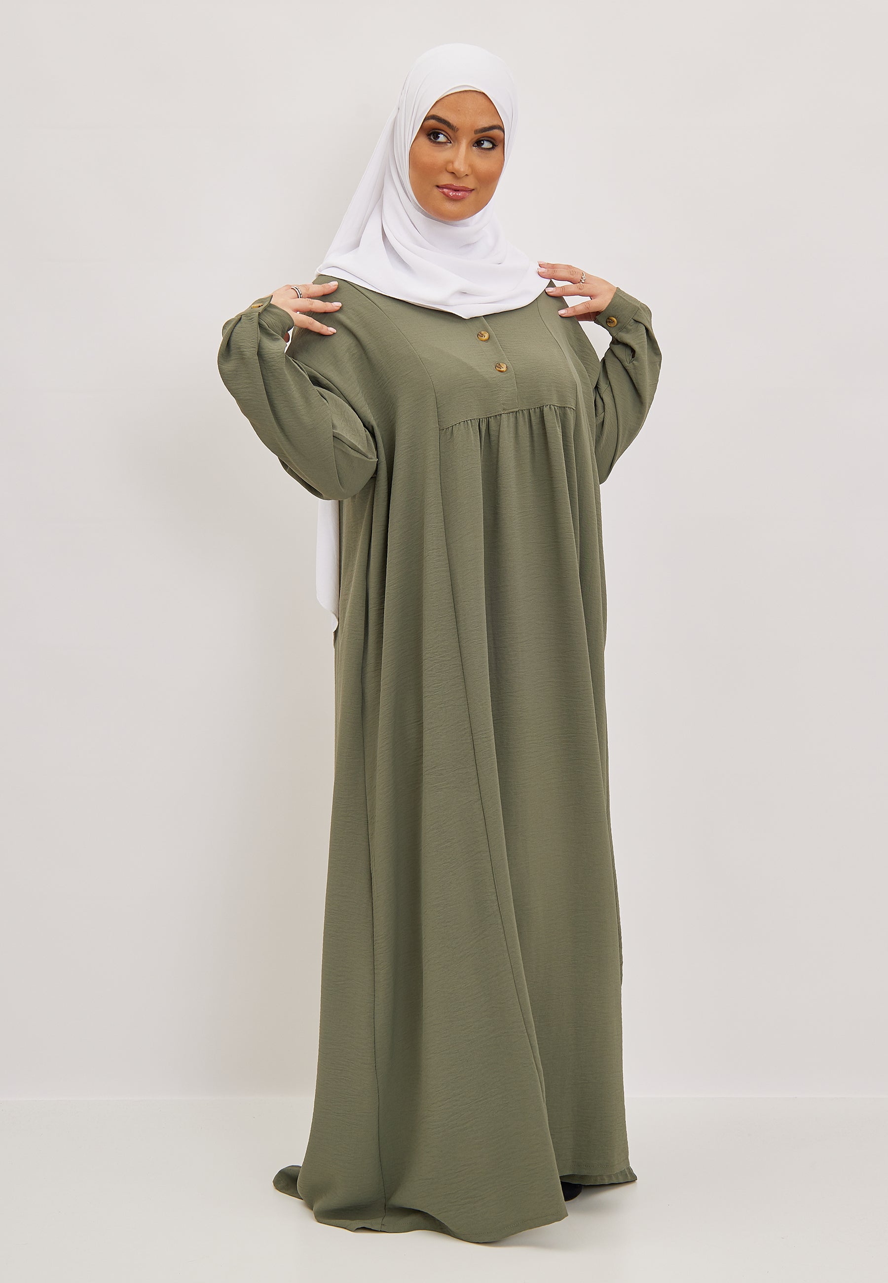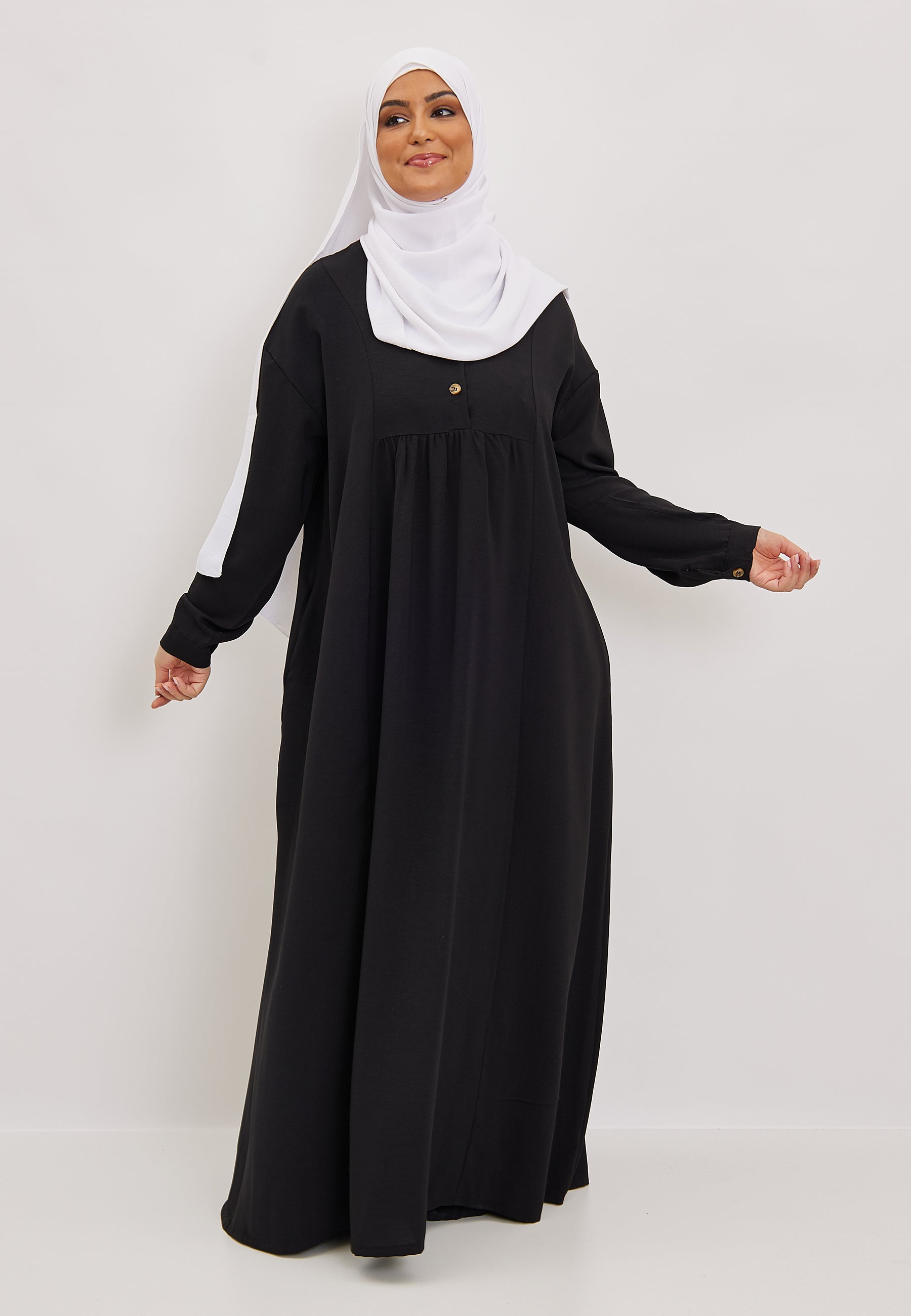L’Abaya Jazia, séduit par sa coupe droite et ses manches plissées boutonnées. Une pièce pensée pour le quotidien.