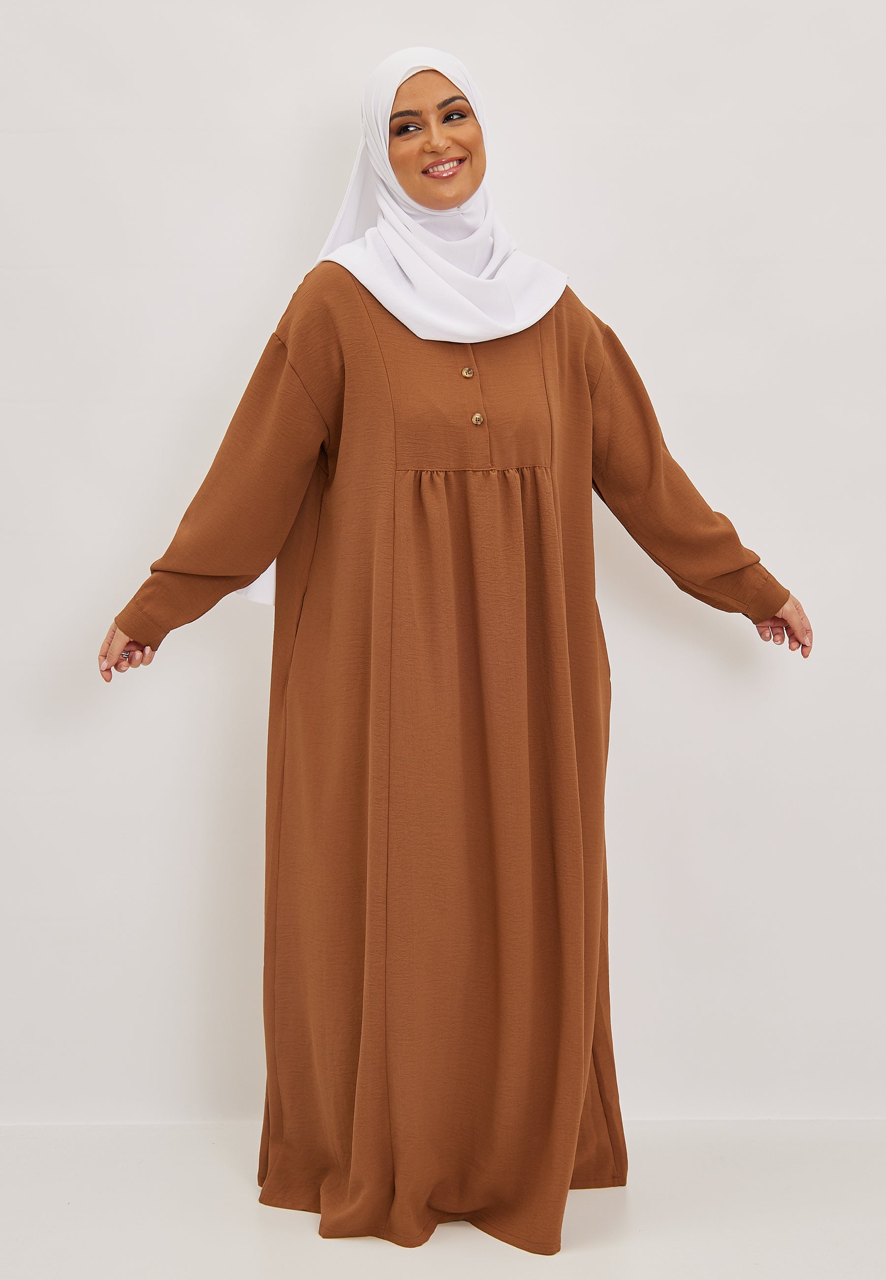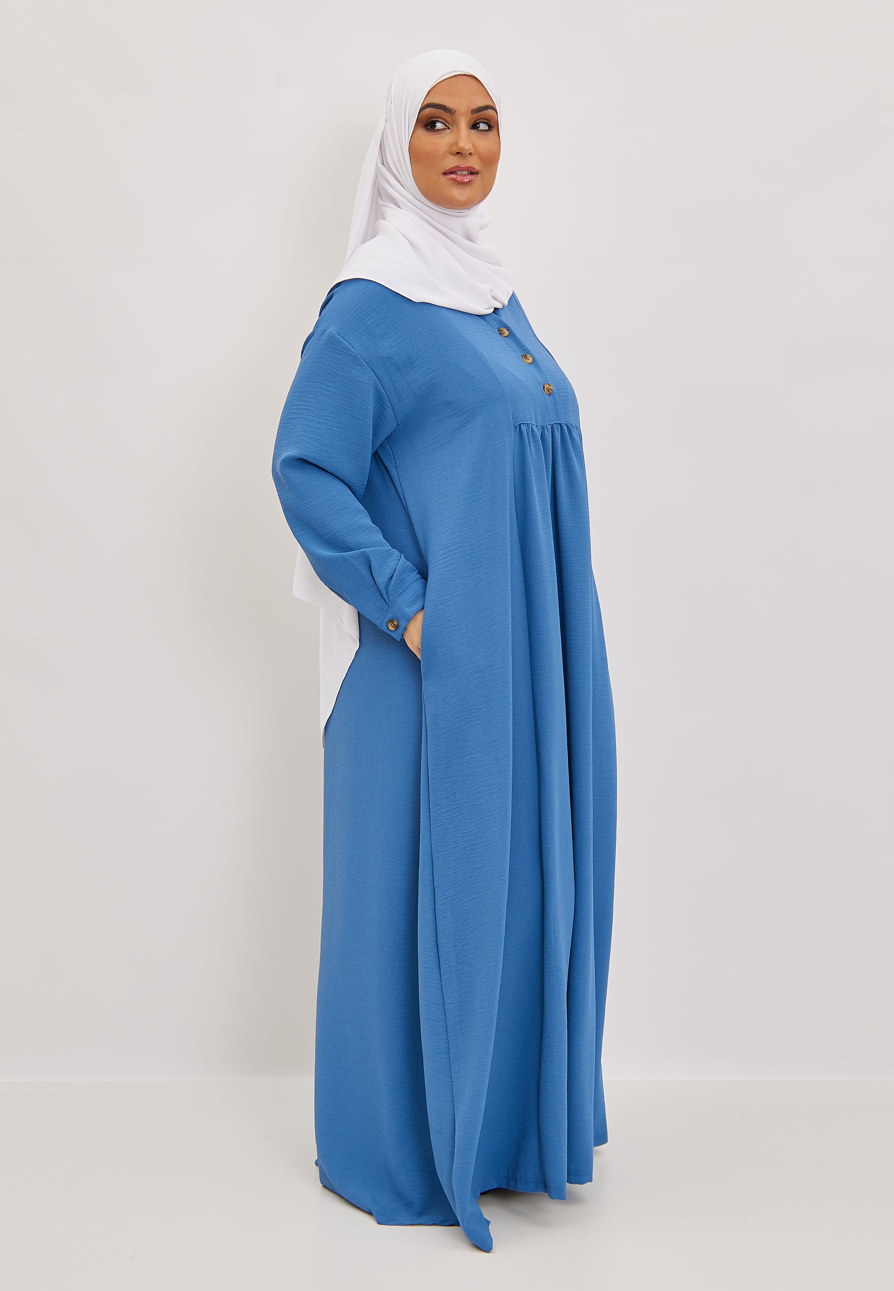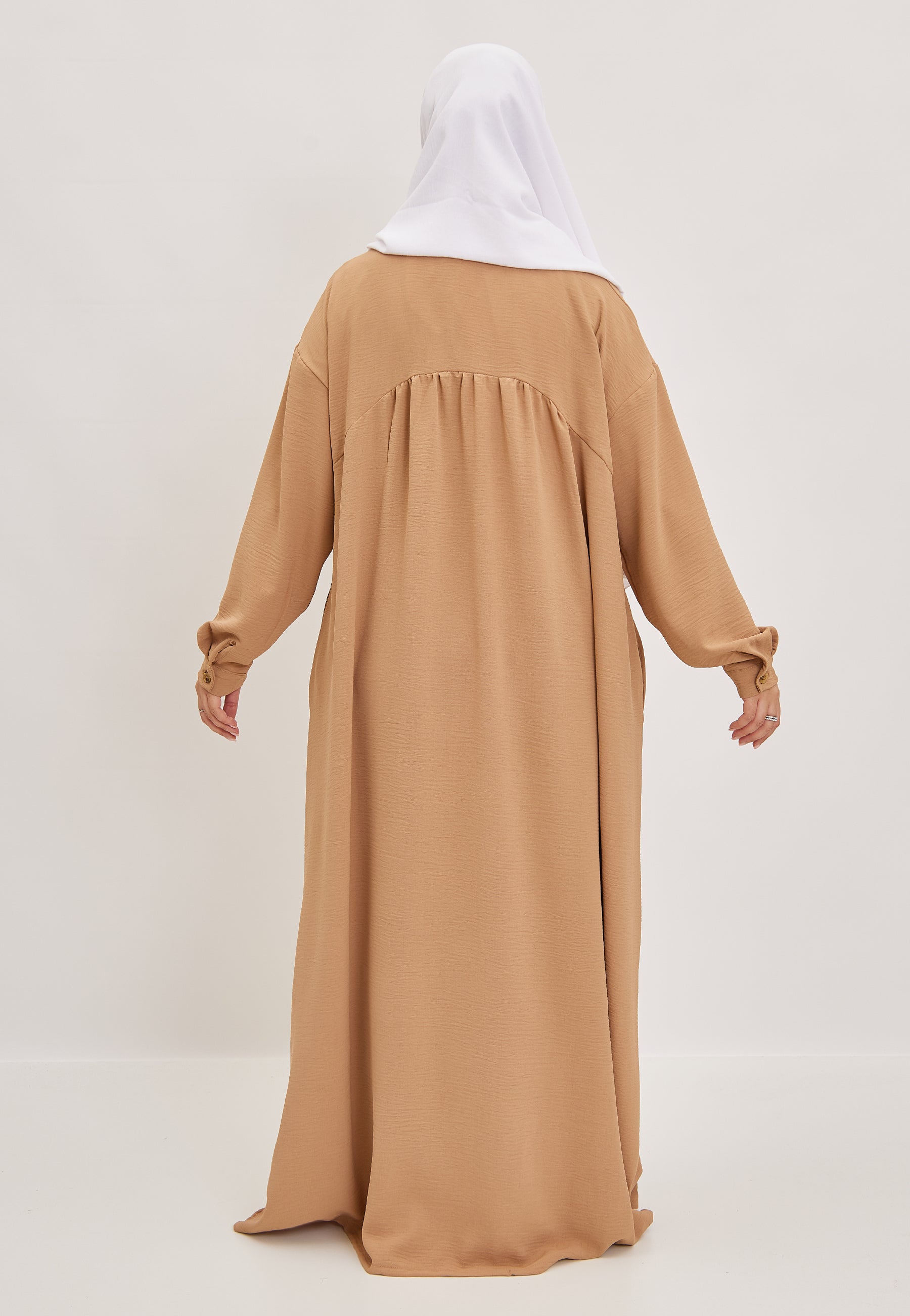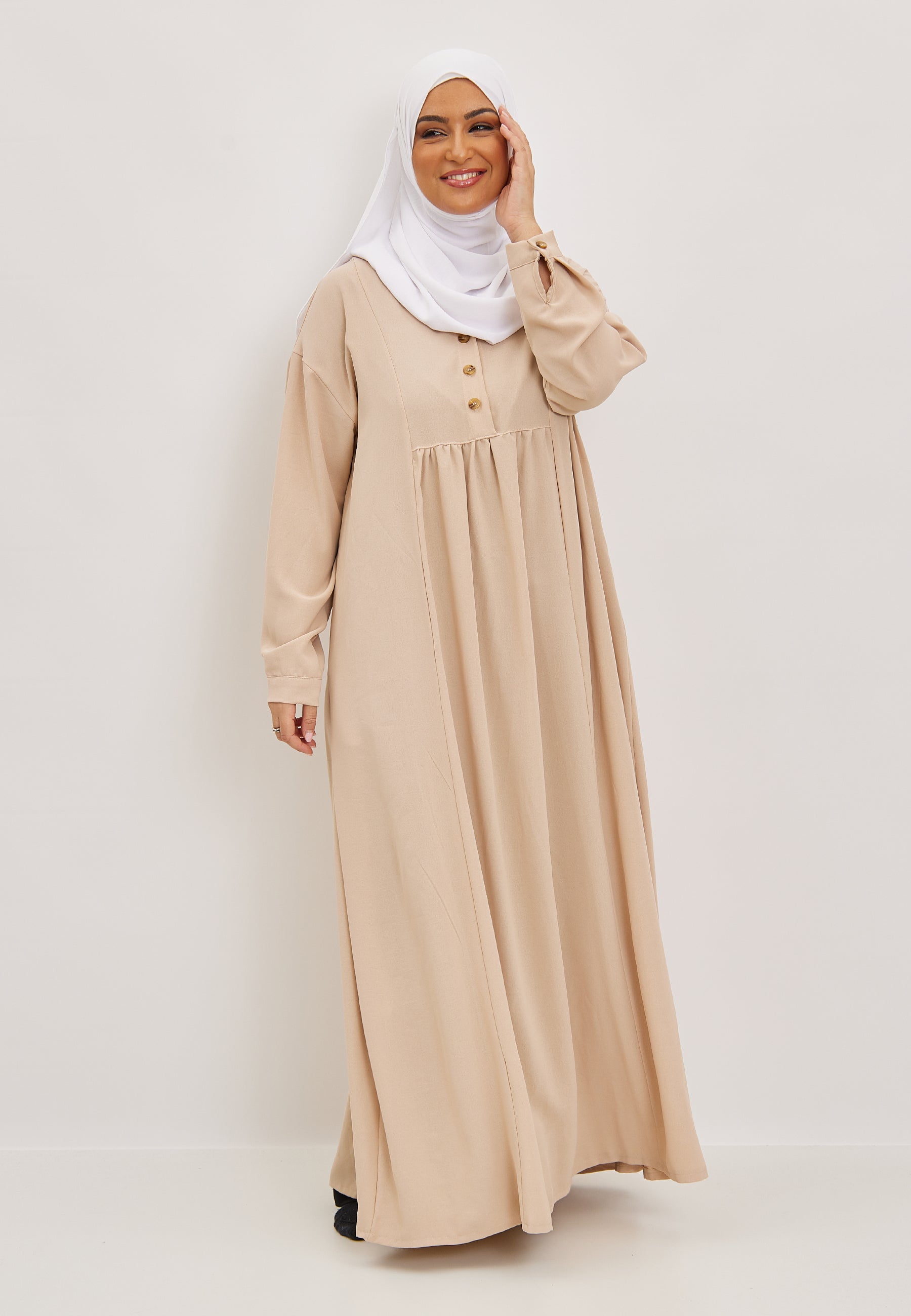 L’Abaya Jazia, séduit par sa coupe droite et ses manches plissées boutonnées. Une pièce pensée pour le quotidien.