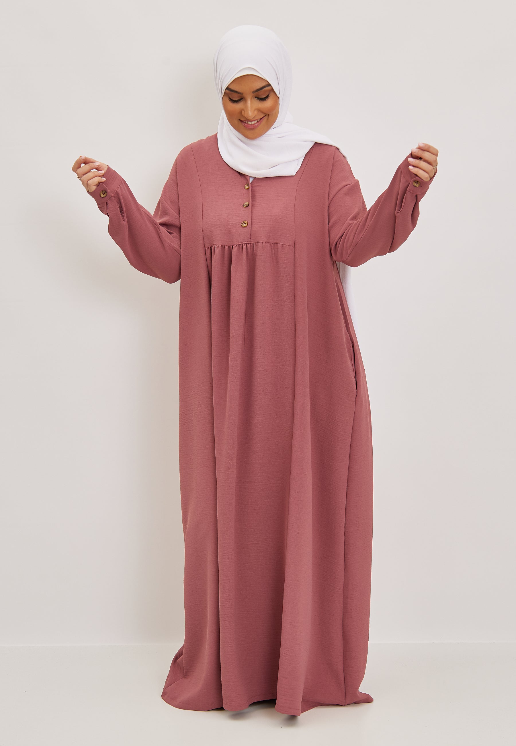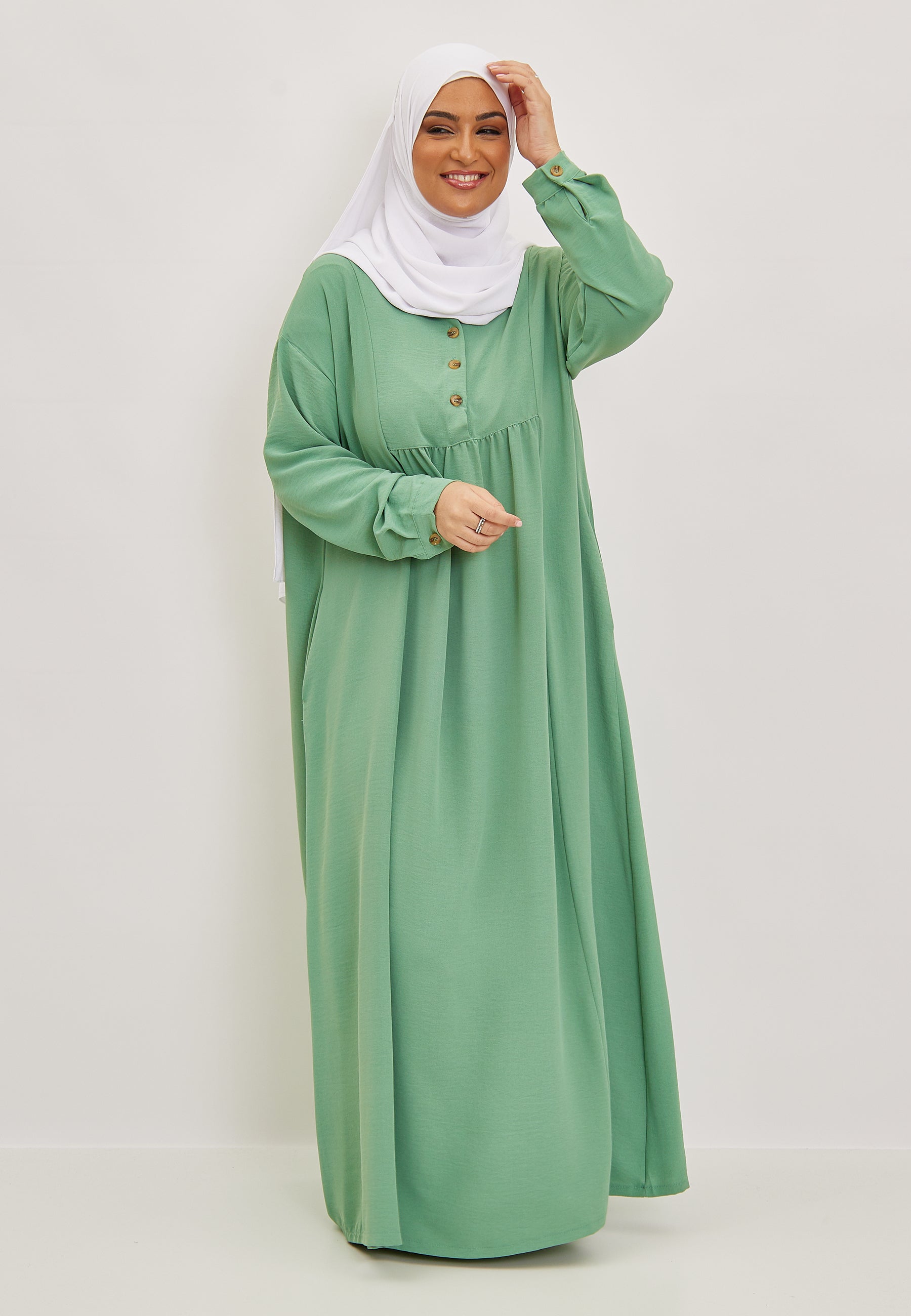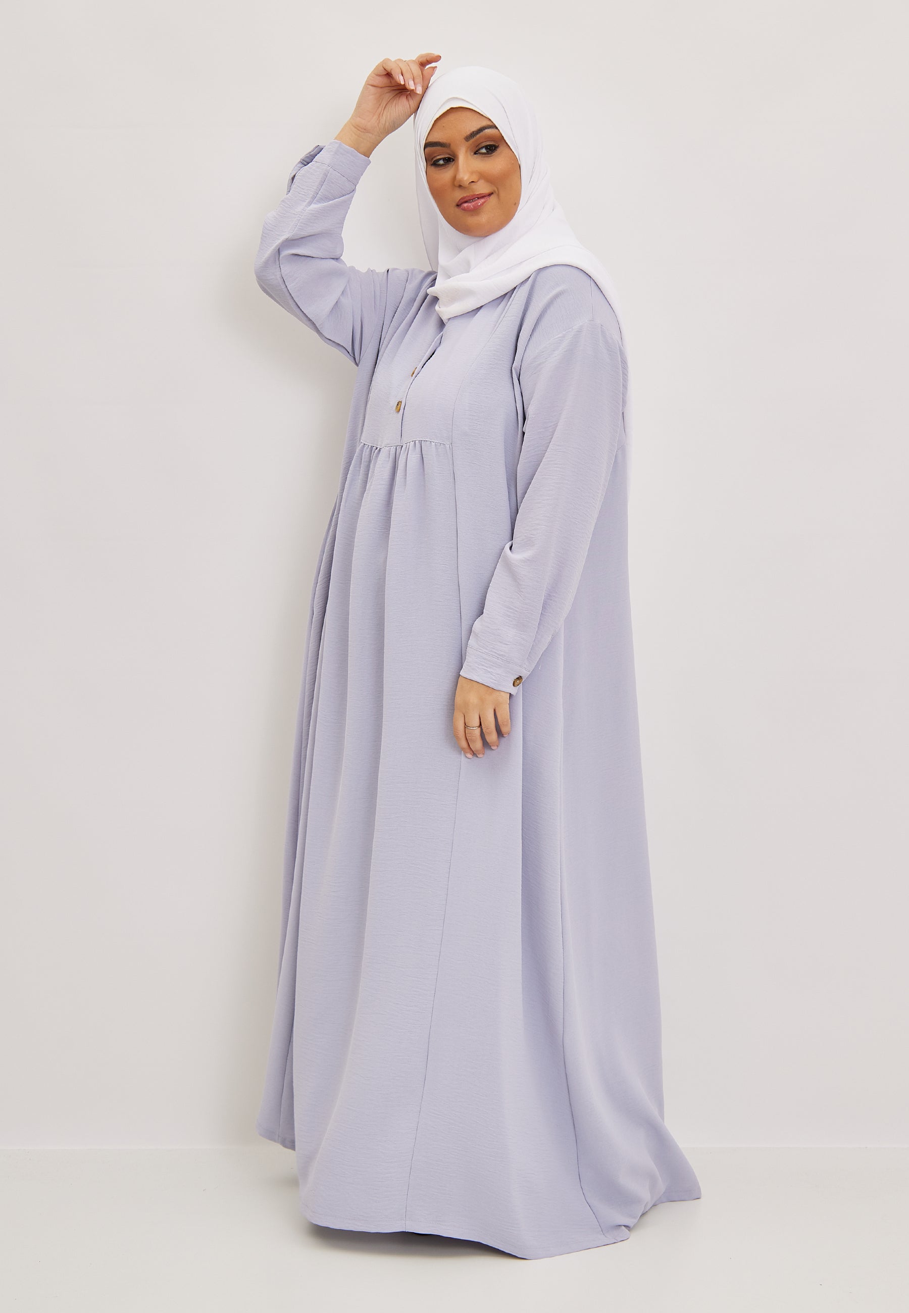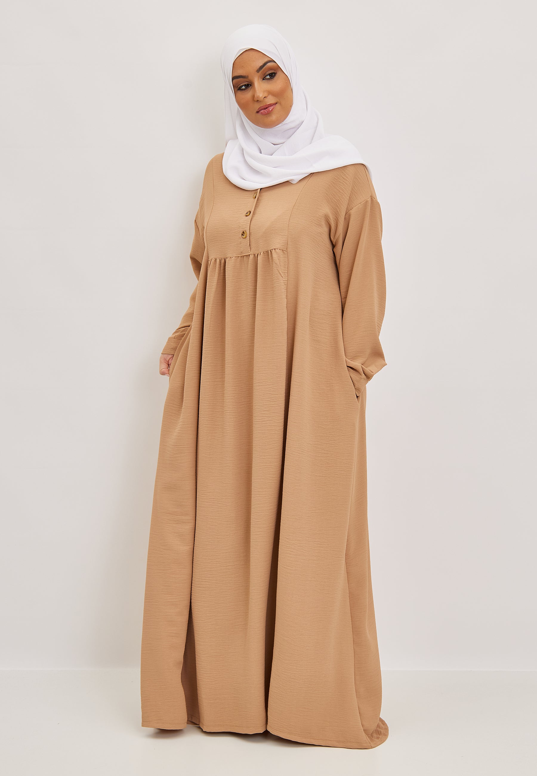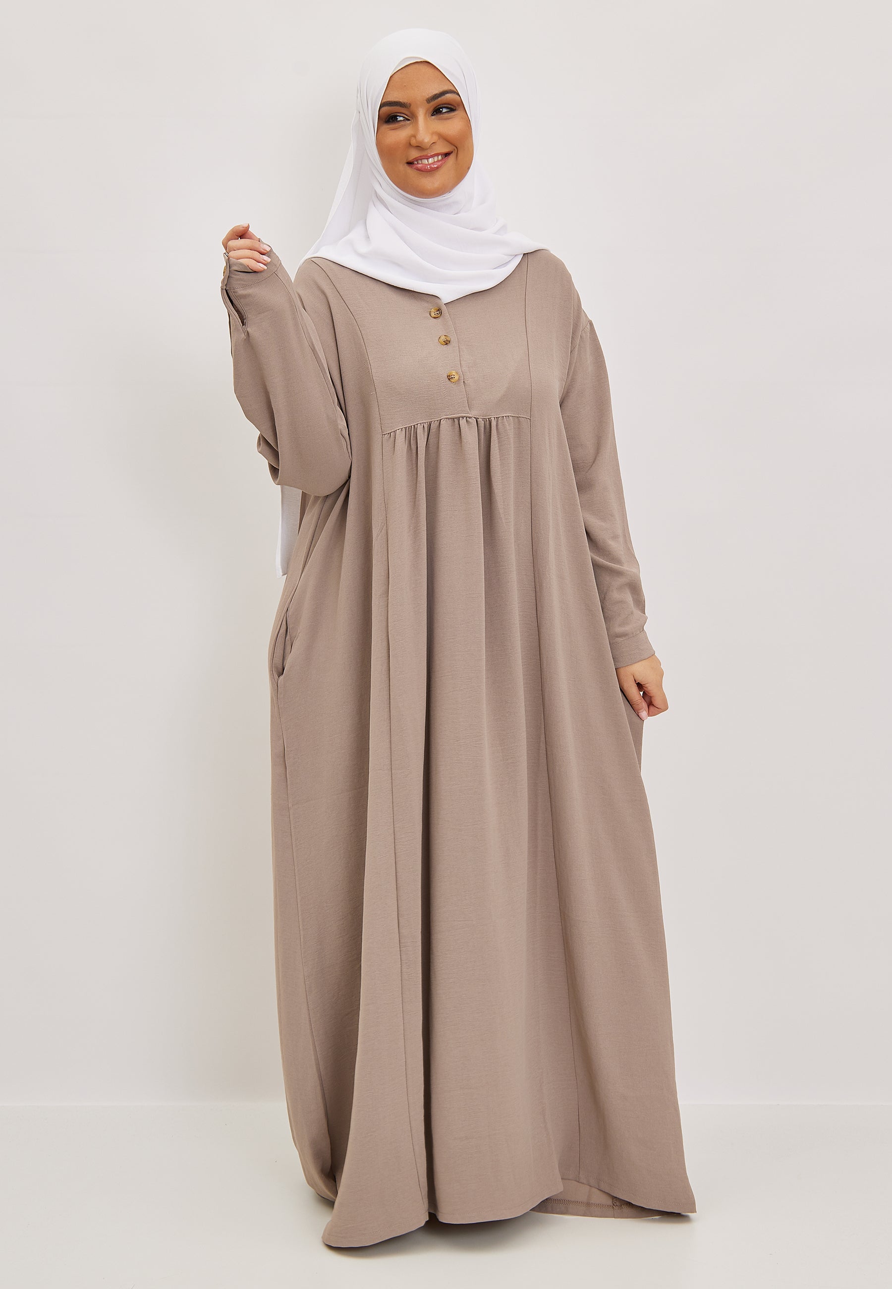 L’Abaya Jazia, séduit par sa coupe droite et ses manches plissées boutonnées. Une pièce pensée pour le quotidien.