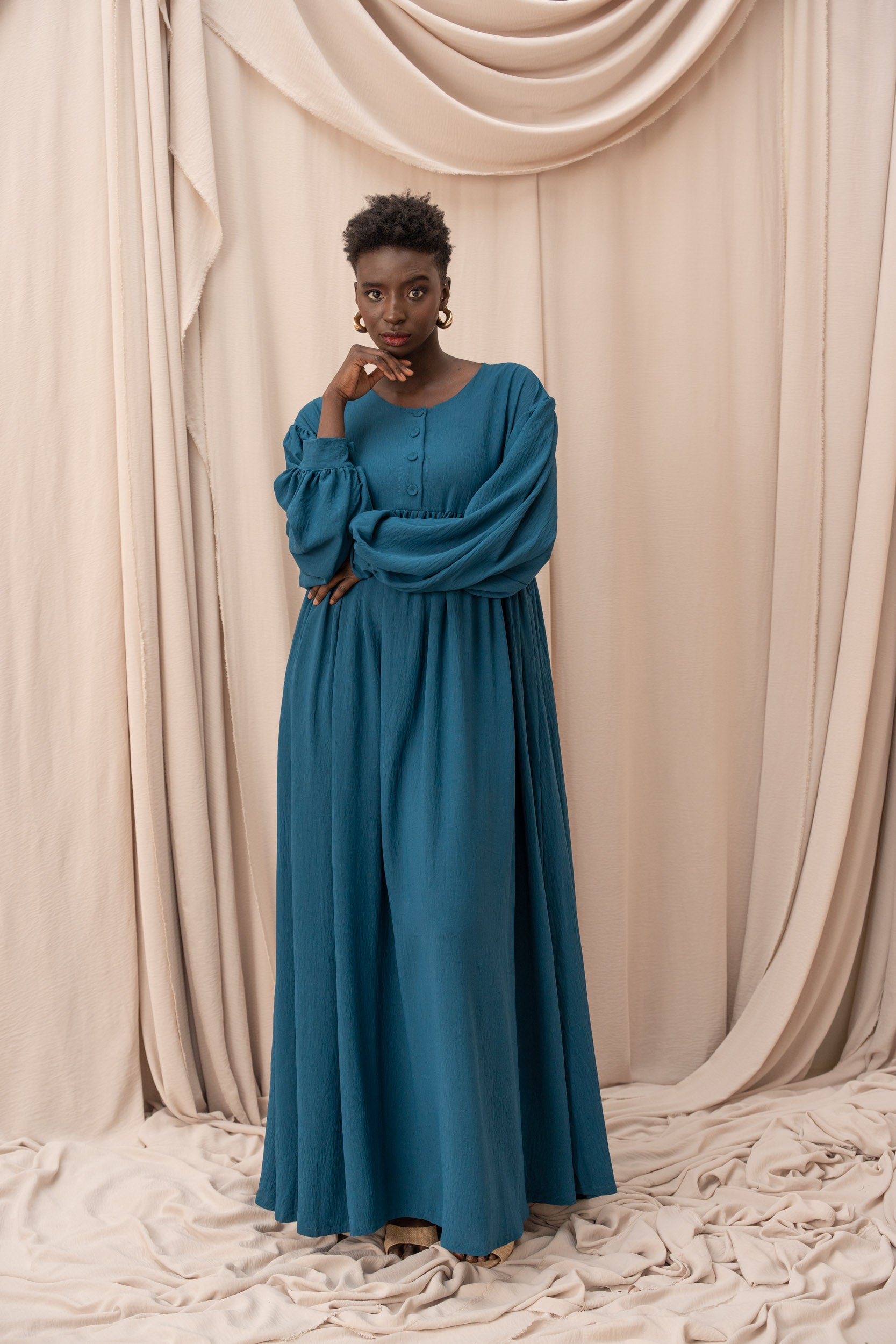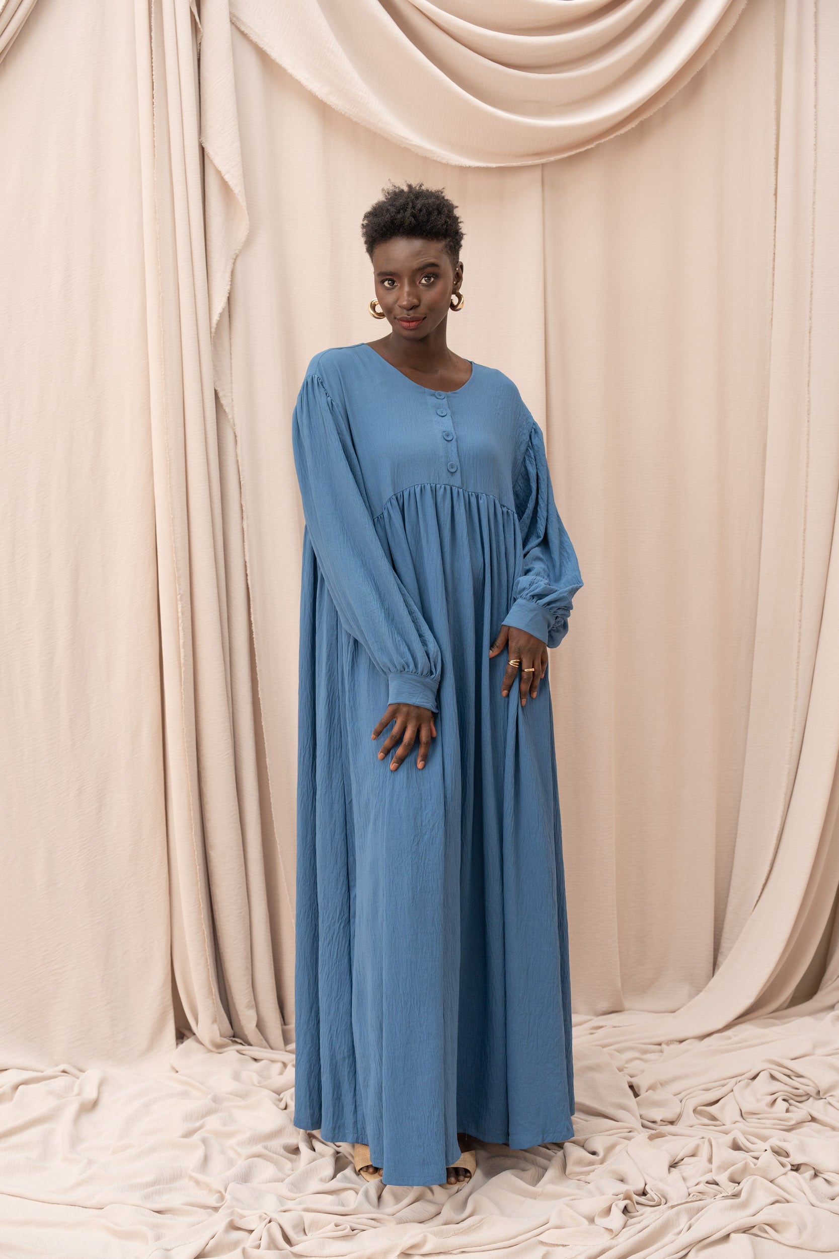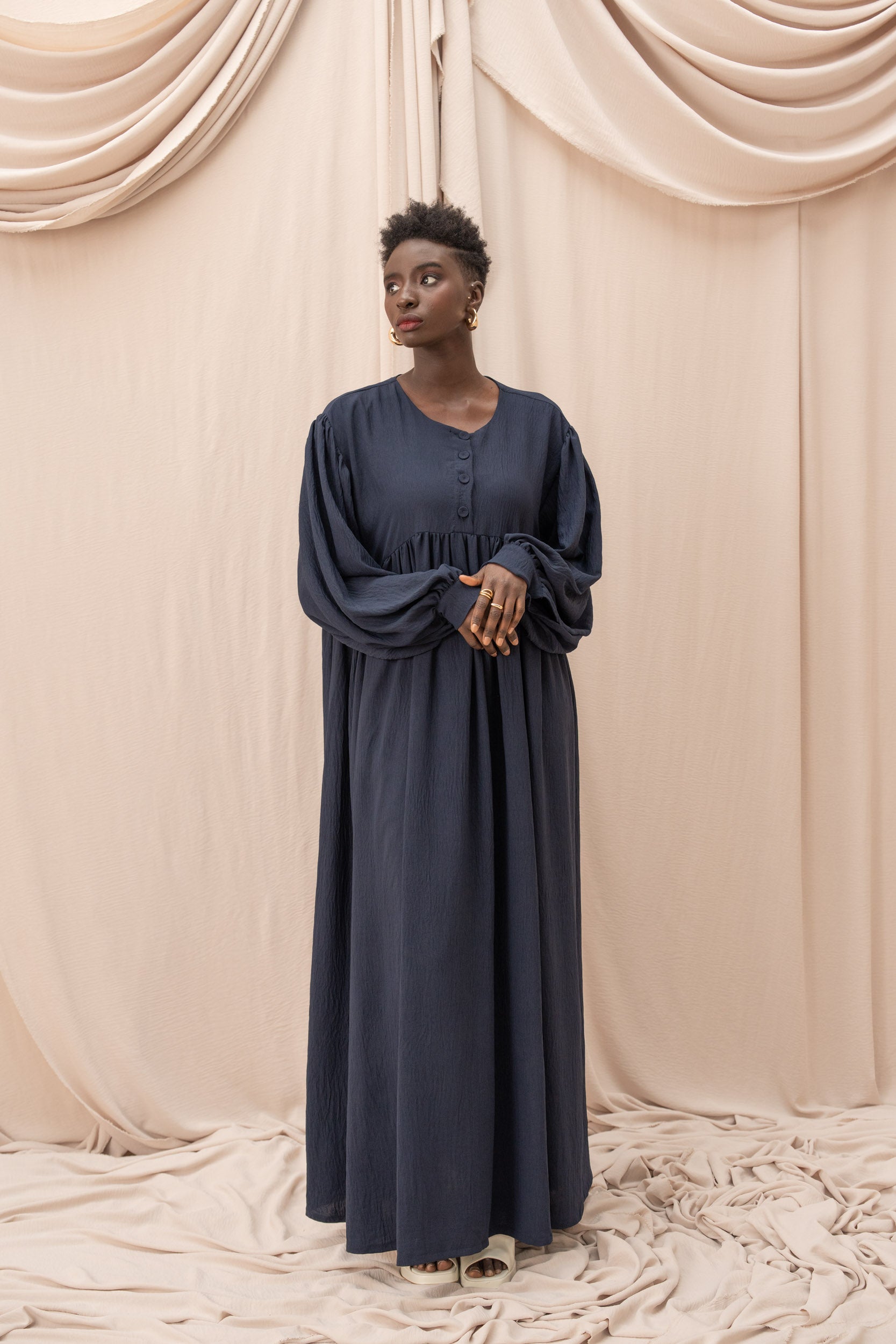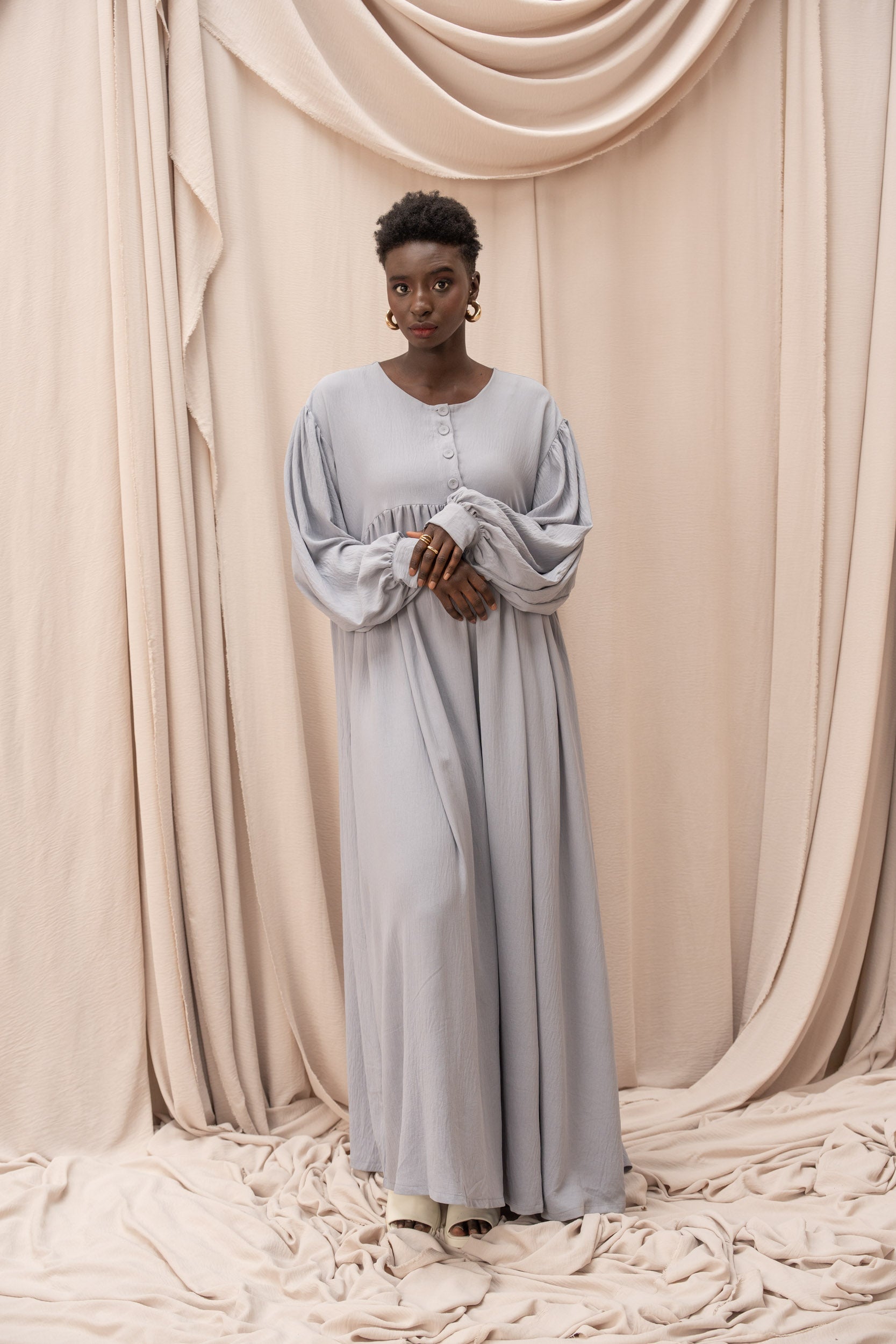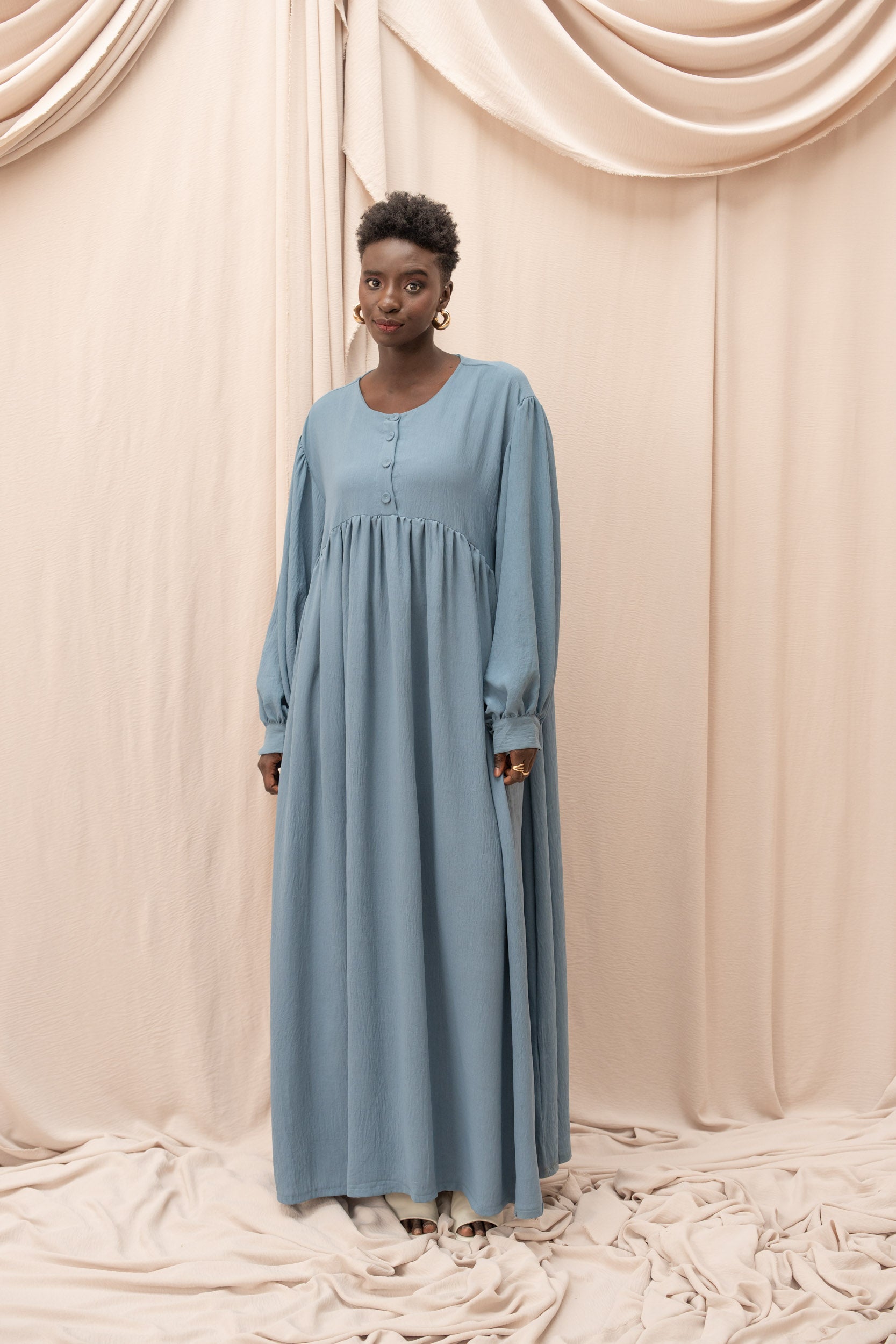 L'Abaya June en jazz, mêle élégance et praticité grâce à ses boutons qui facilitent l’allaitement ou l’habillage. Ses manches plissées et boutonnées ajoutent un détail sophistiqué, parfait pour un style raffiné. À associer avec un hijab ou un khimar pour une allure complète.