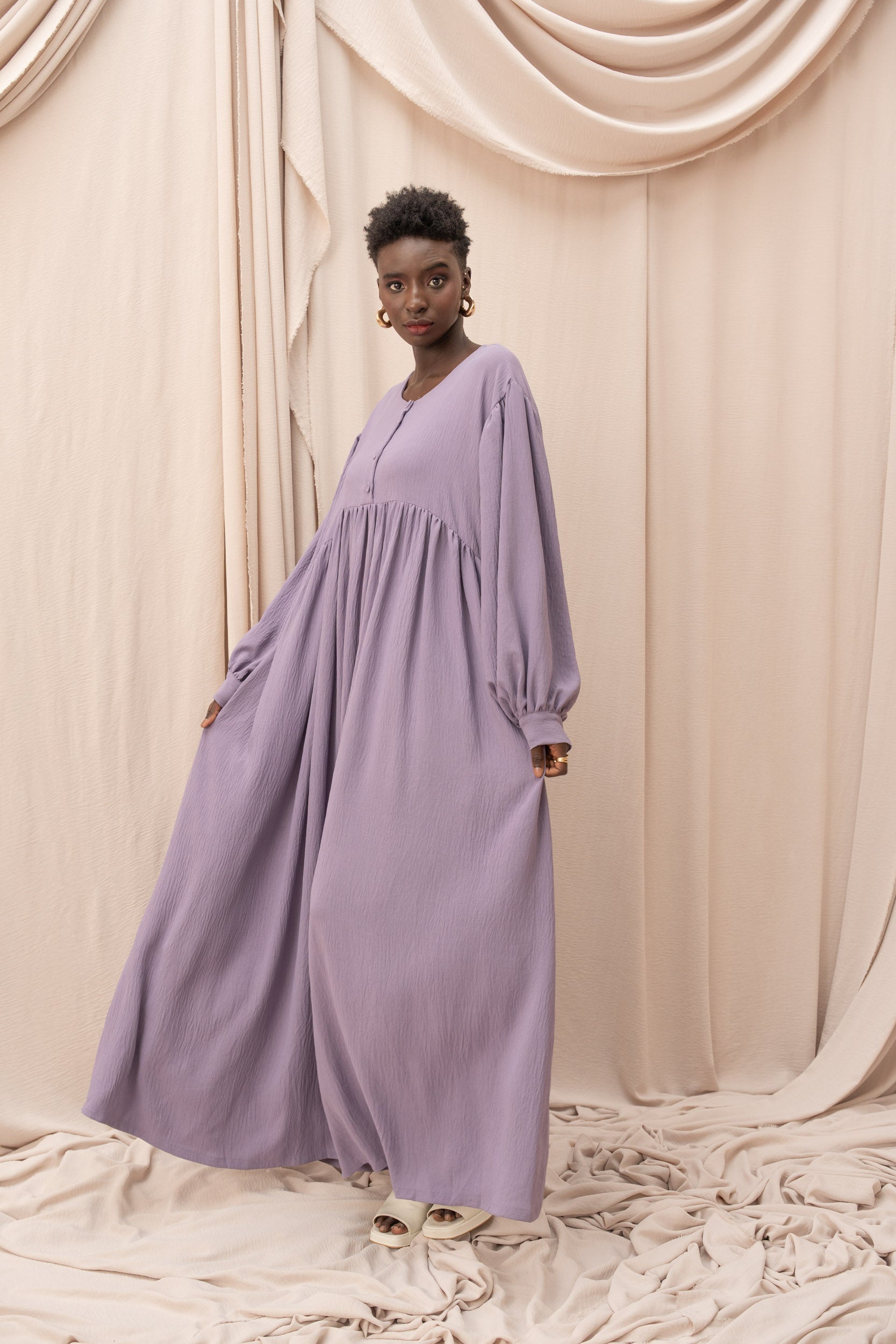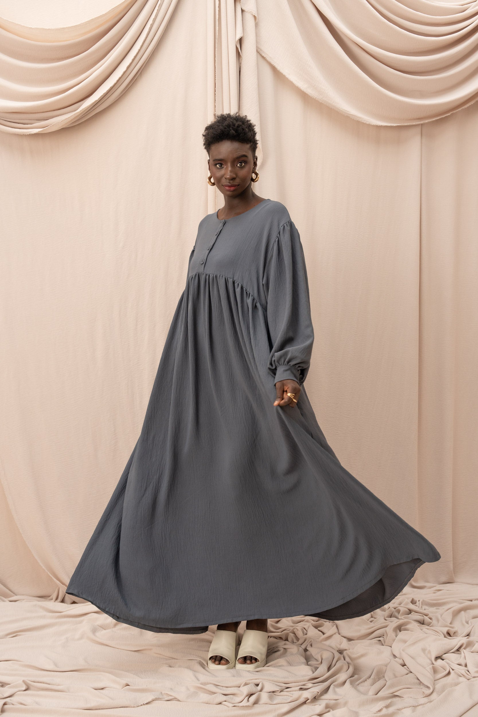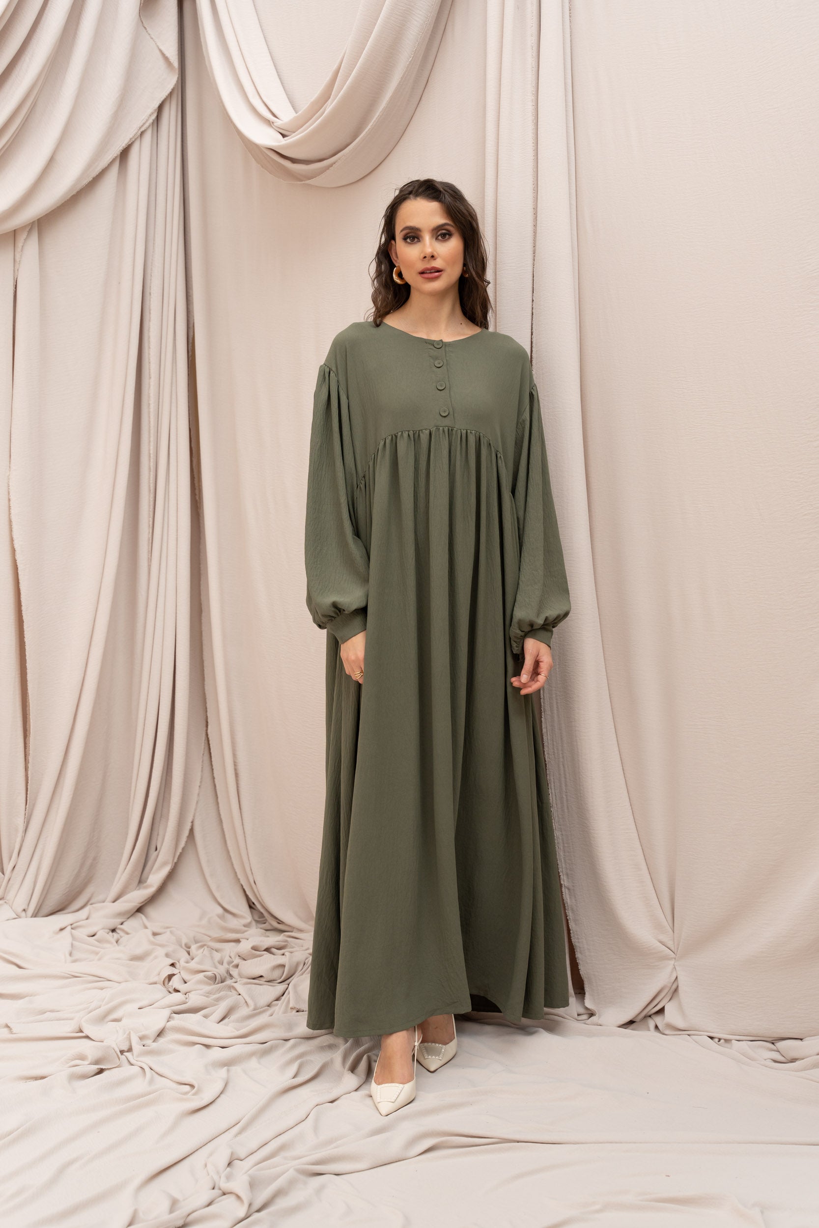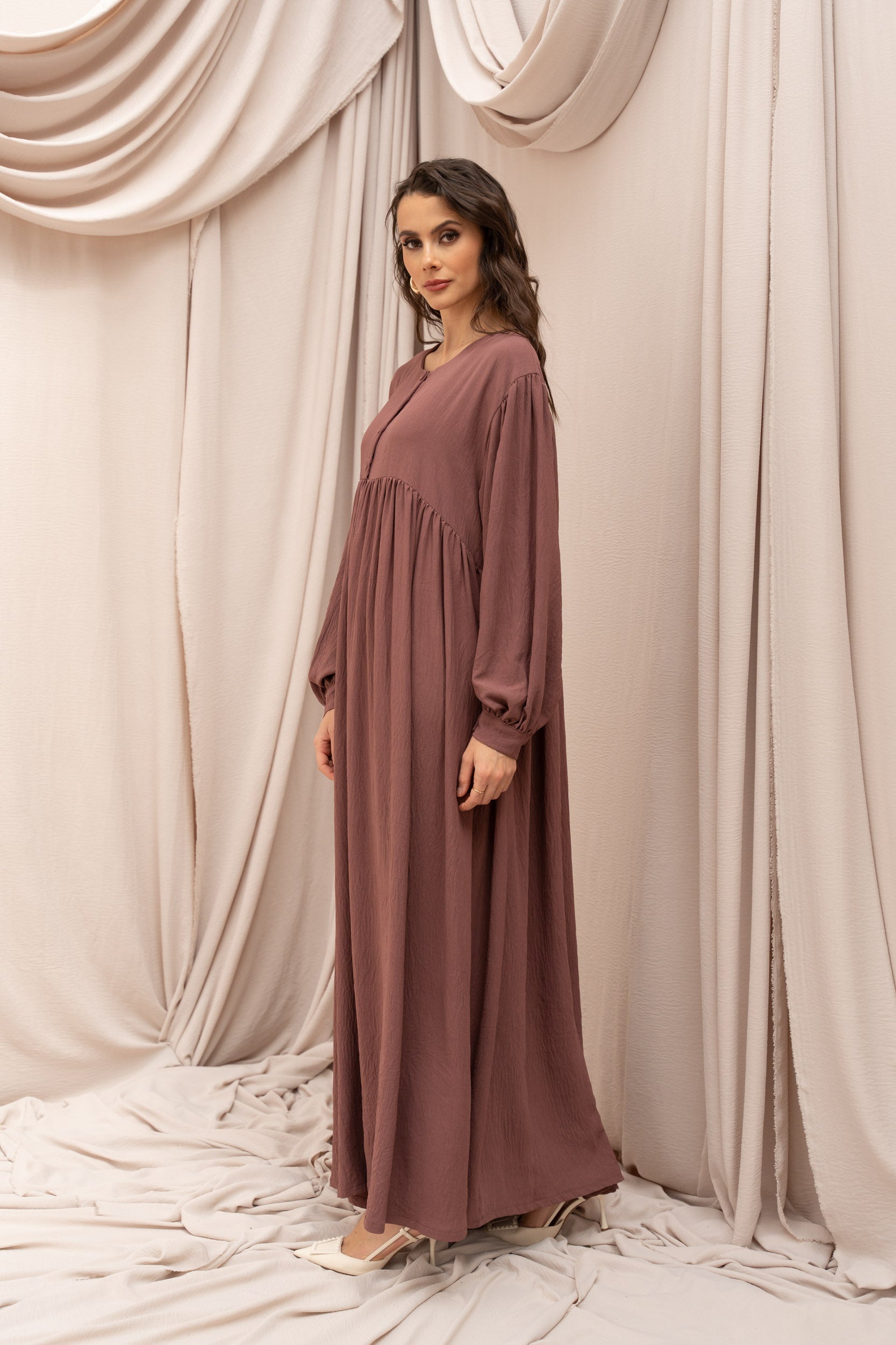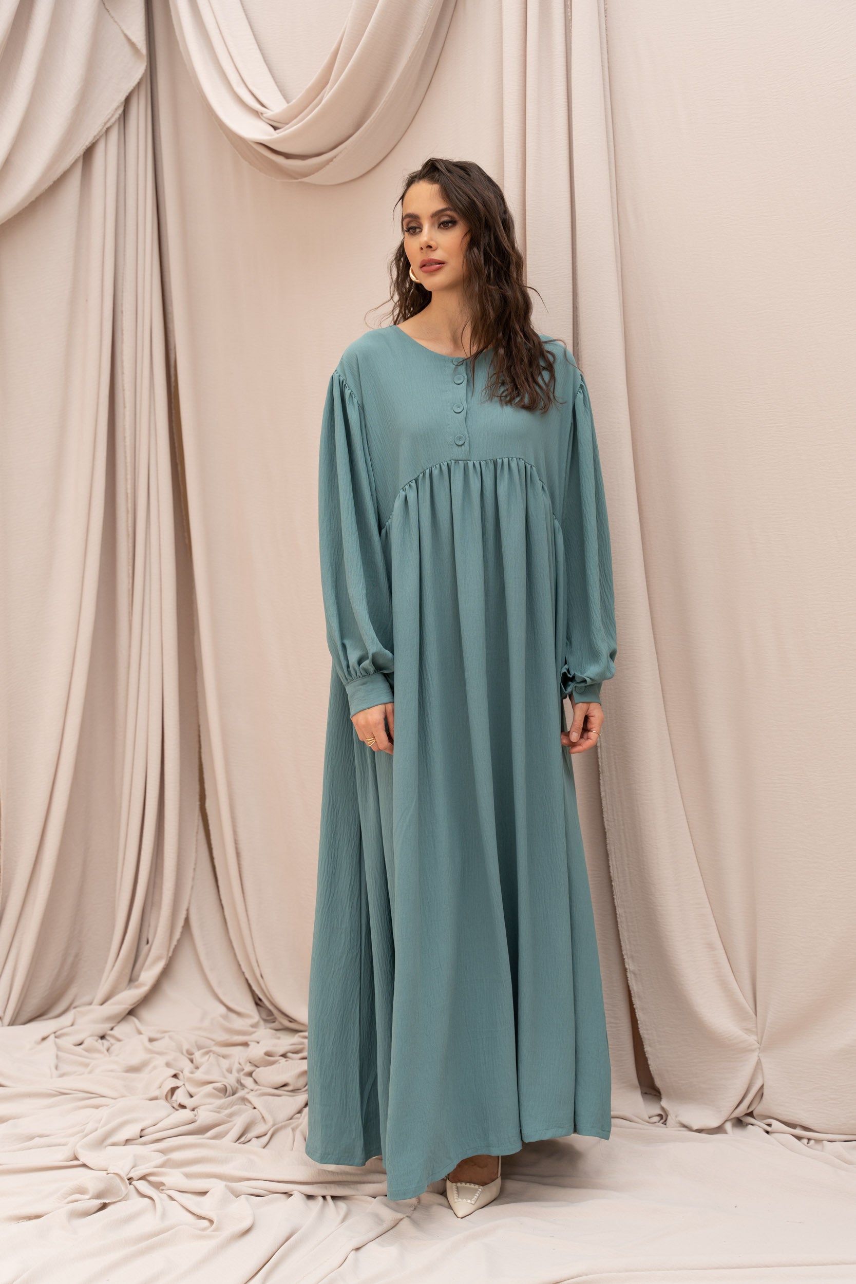 L'Abaya June en jazz, mêle élégance et praticité grâce à ses boutons qui facilitent l’allaitement ou l’habillage. Ses manches plissées et boutonnées ajoutent un détail sophistiqué, parfait pour un style raffiné. À associer avec un hijab ou un khimar pour une allure complète.