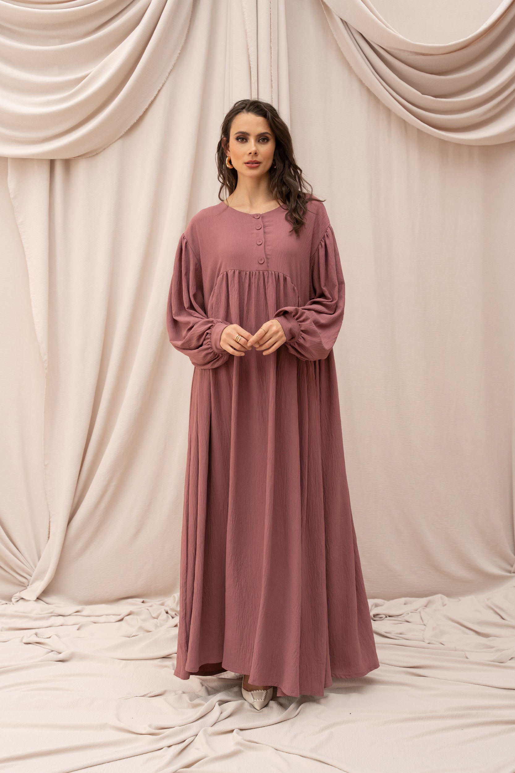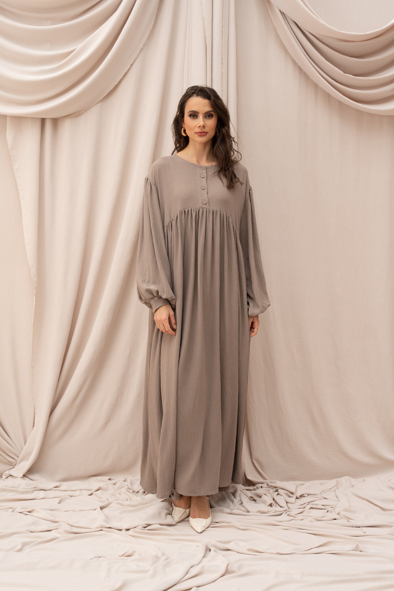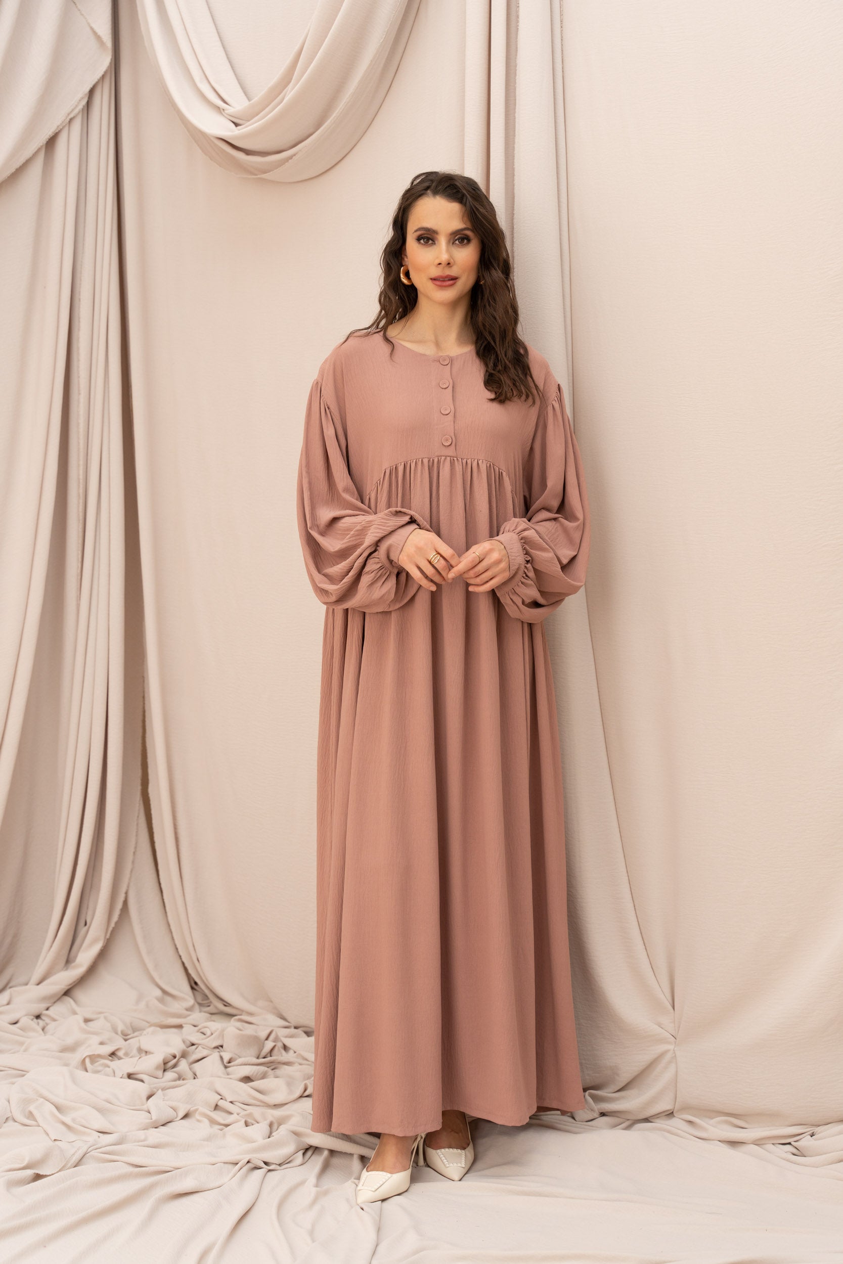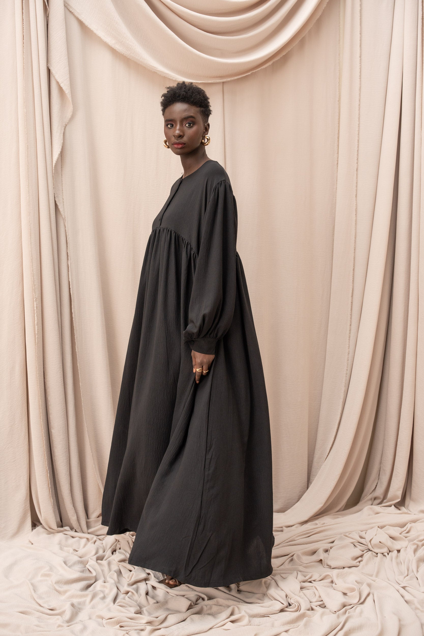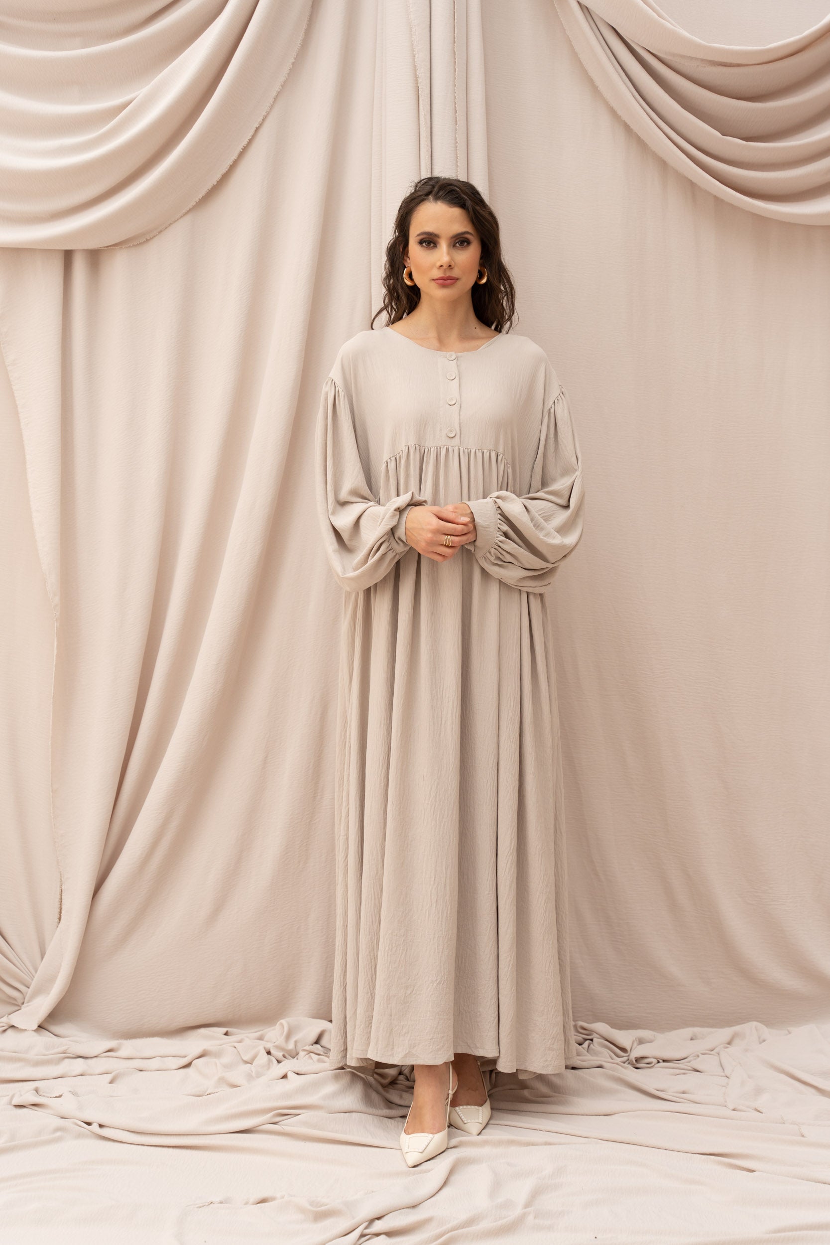 L'Abaya June en jazz, mêle élégance et praticité grâce à ses boutons qui facilitent l’allaitement ou l’habillage. Ses manches plissées et boutonnées ajoutent un détail sophistiqué, parfait pour un style raffiné. À associer avec un hijab ou un khimar pour une allure complète.