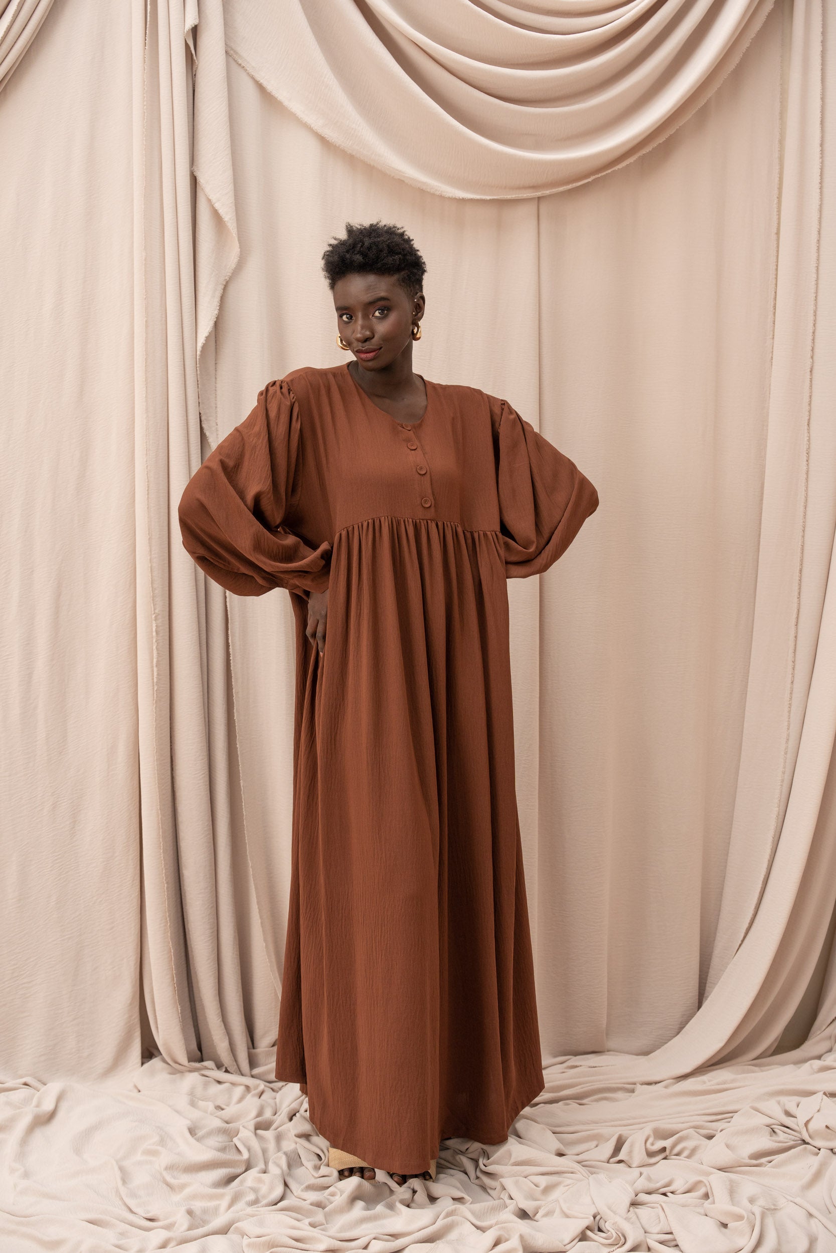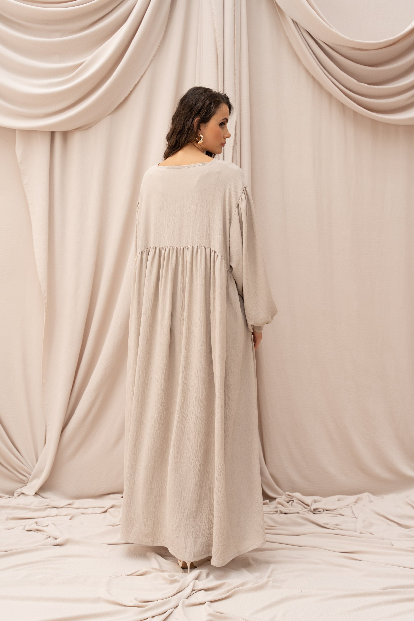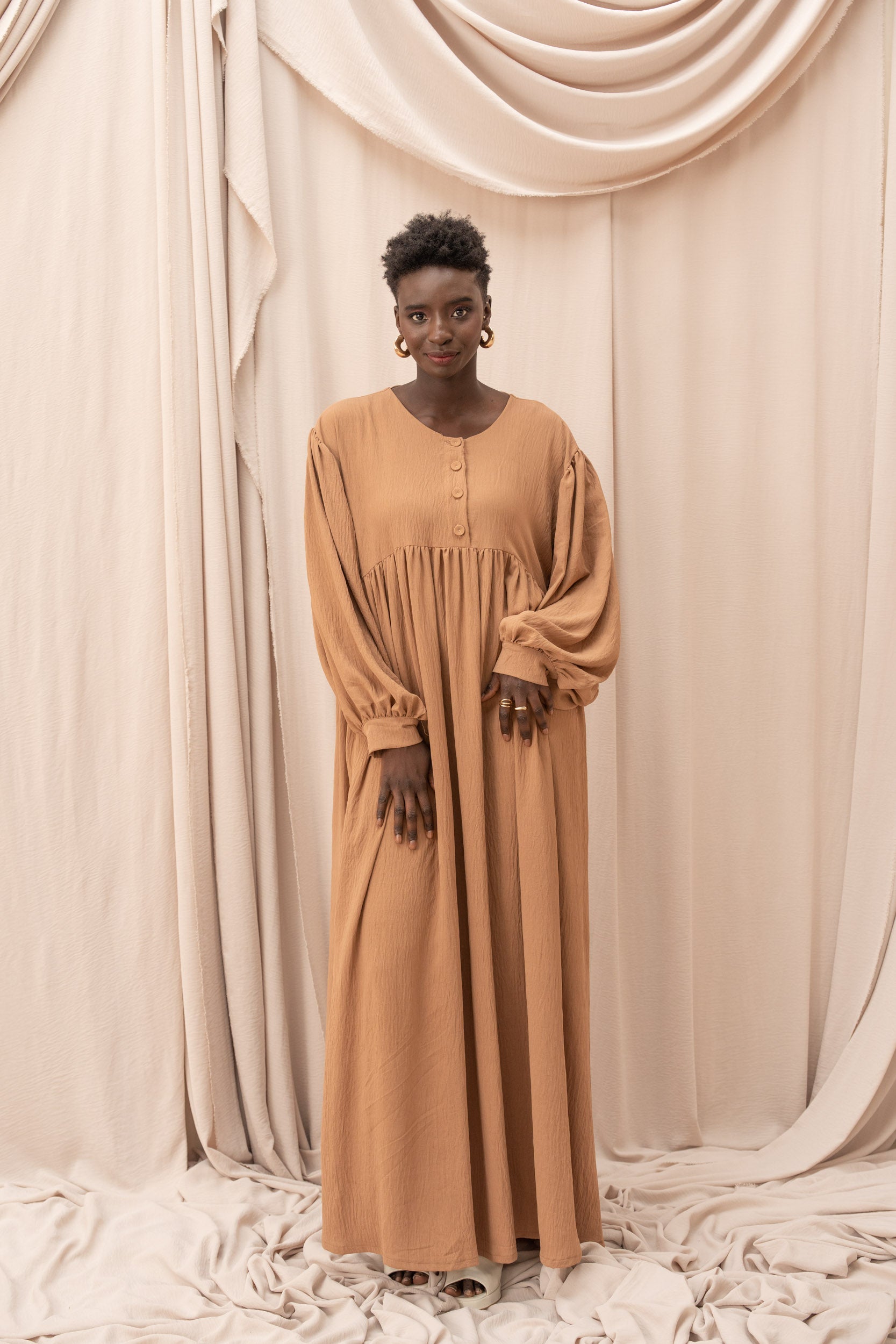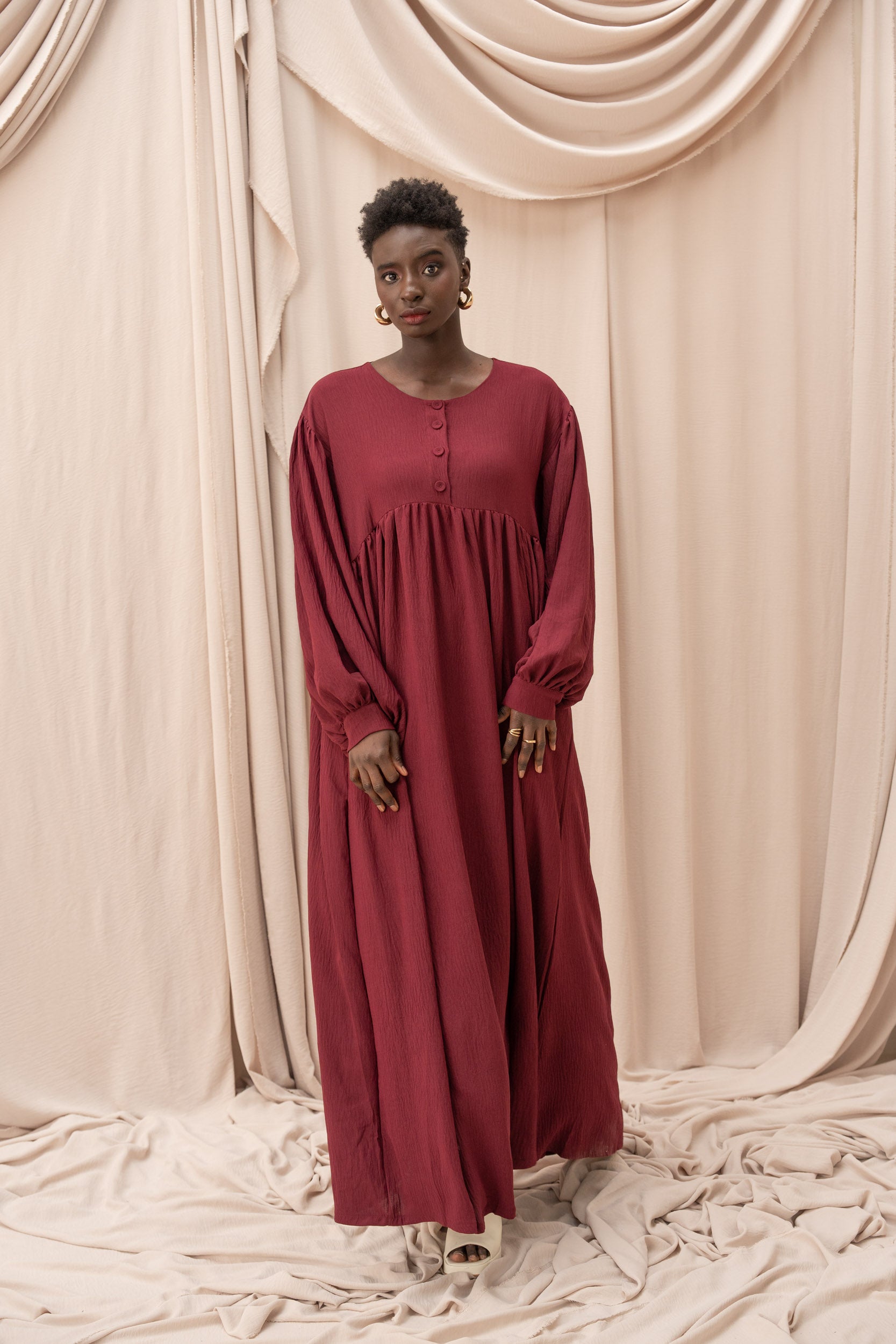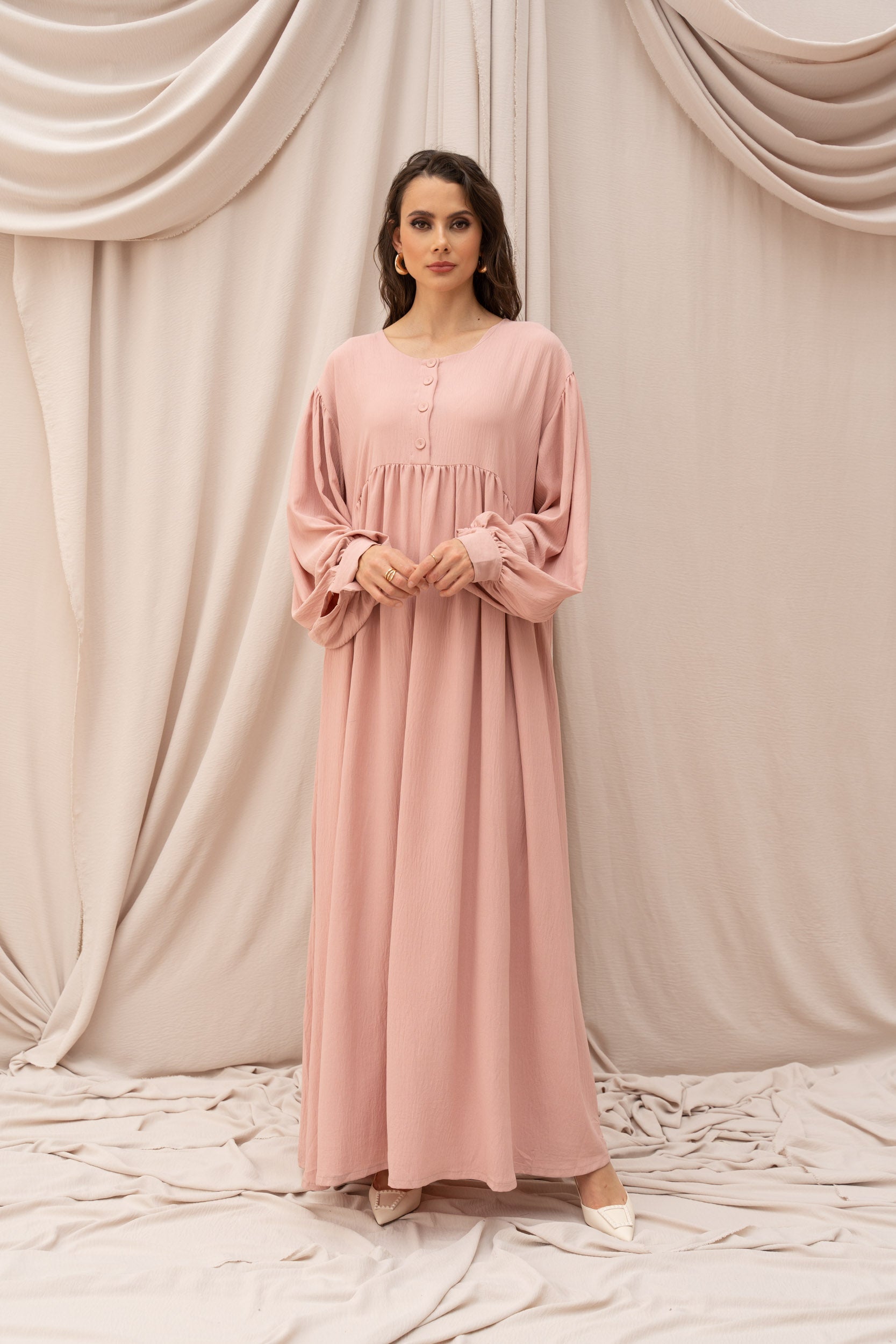 L'Abaya June en jazz, mêle élégance et praticité grâce à ses boutons qui facilitent l’allaitement ou l’habillage. Ses manches plissées et boutonnées ajoutent un détail sophistiqué, parfait pour un style raffiné. À associer avec un hijab ou un khimar pour une allure complète.
