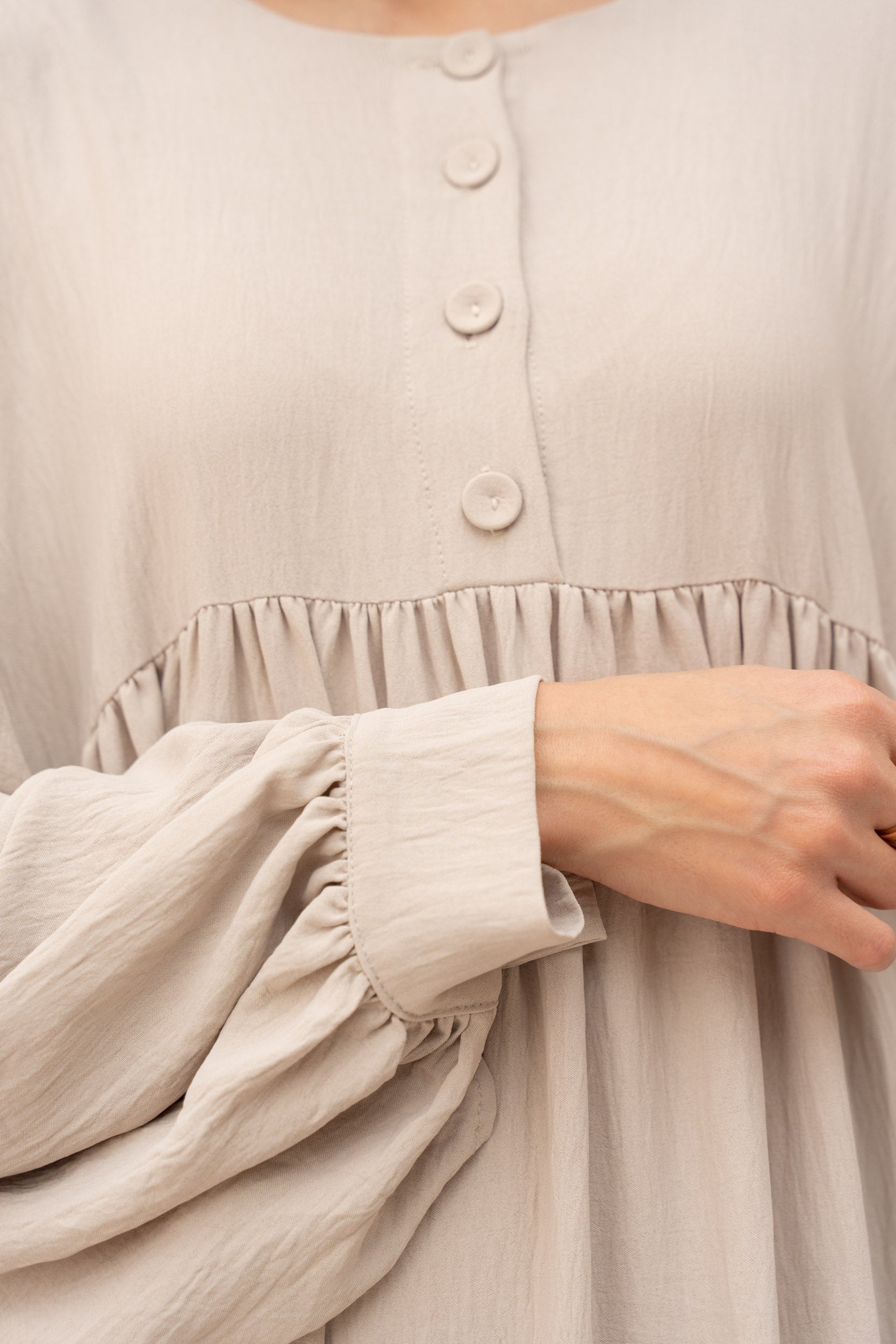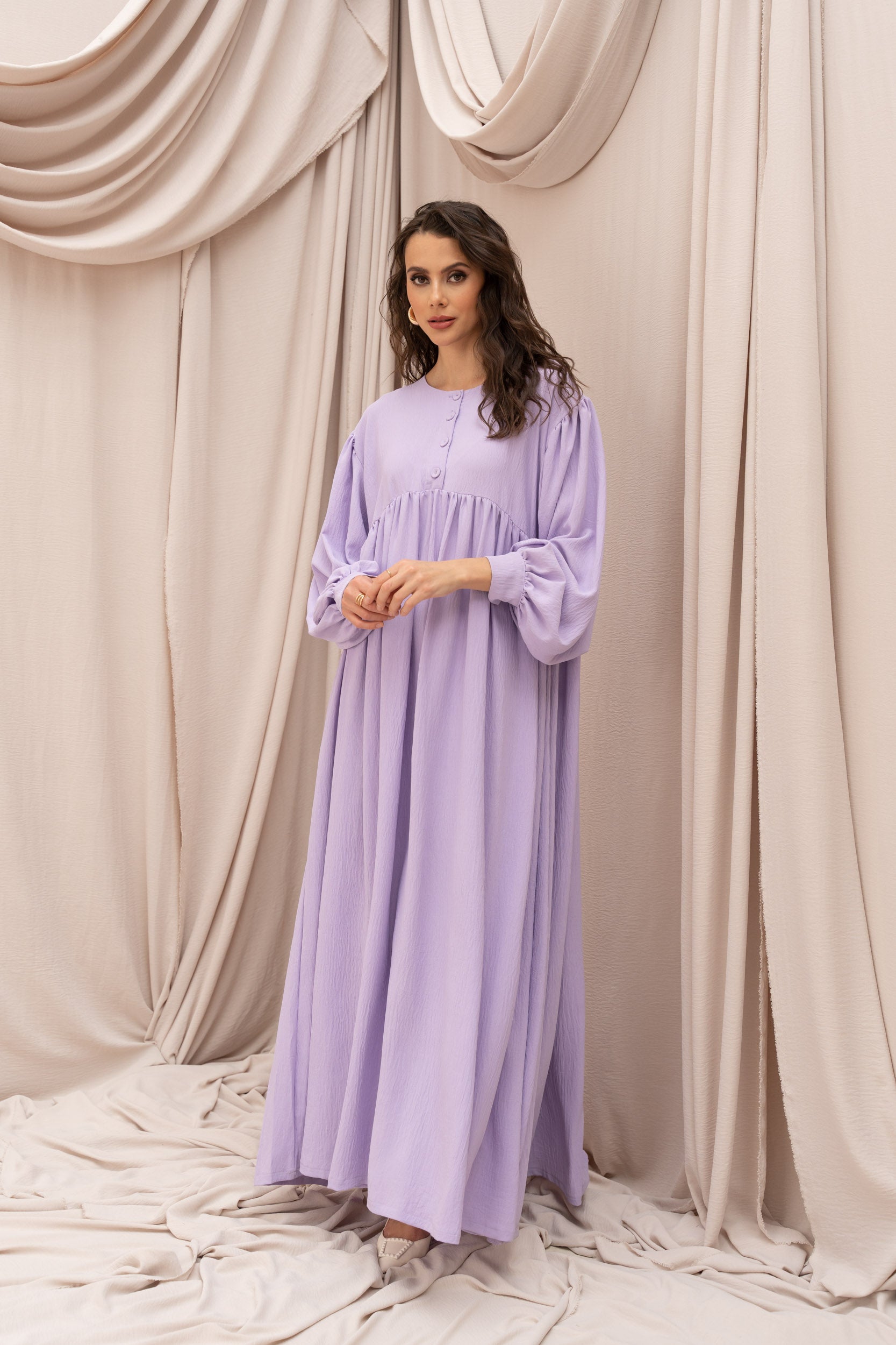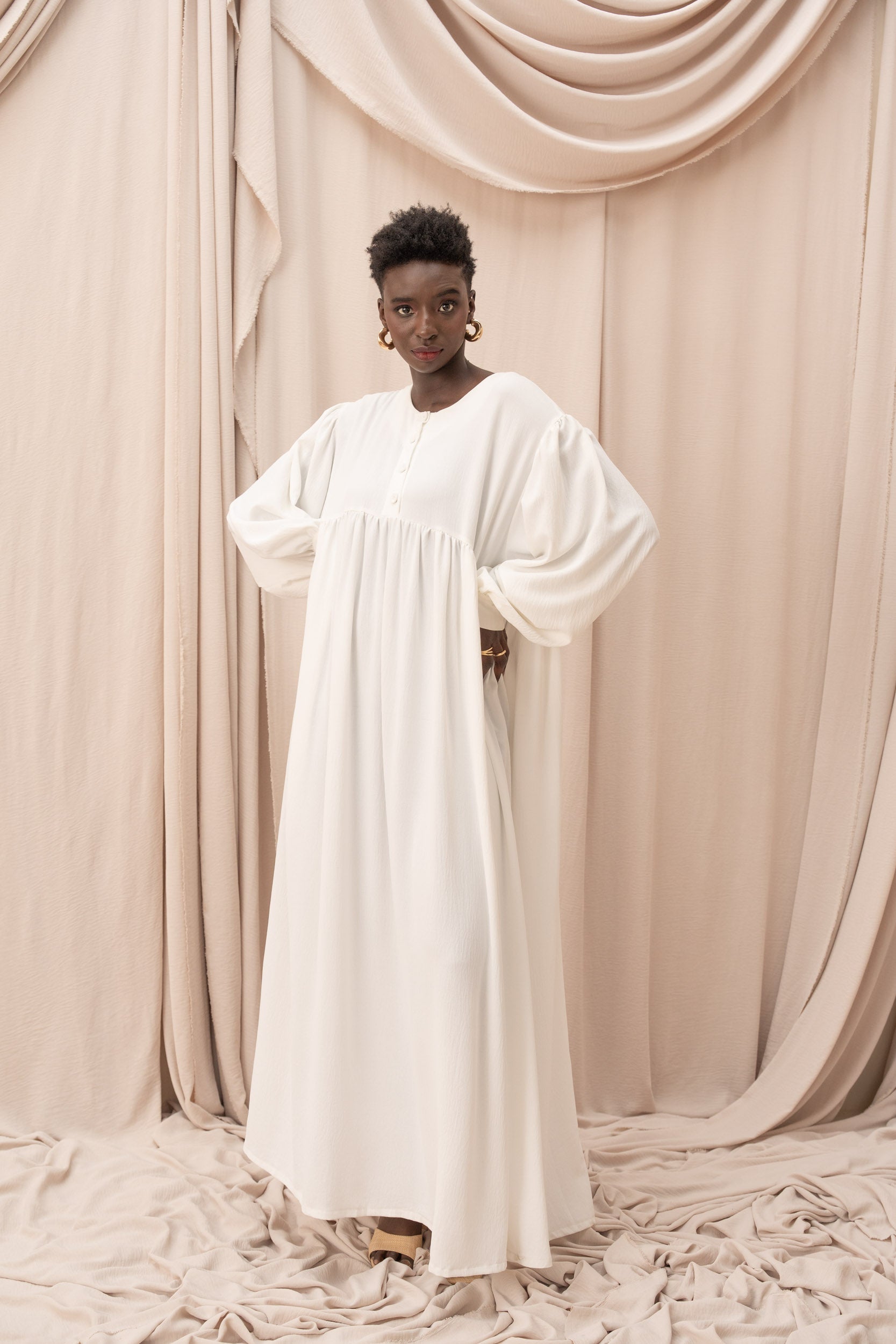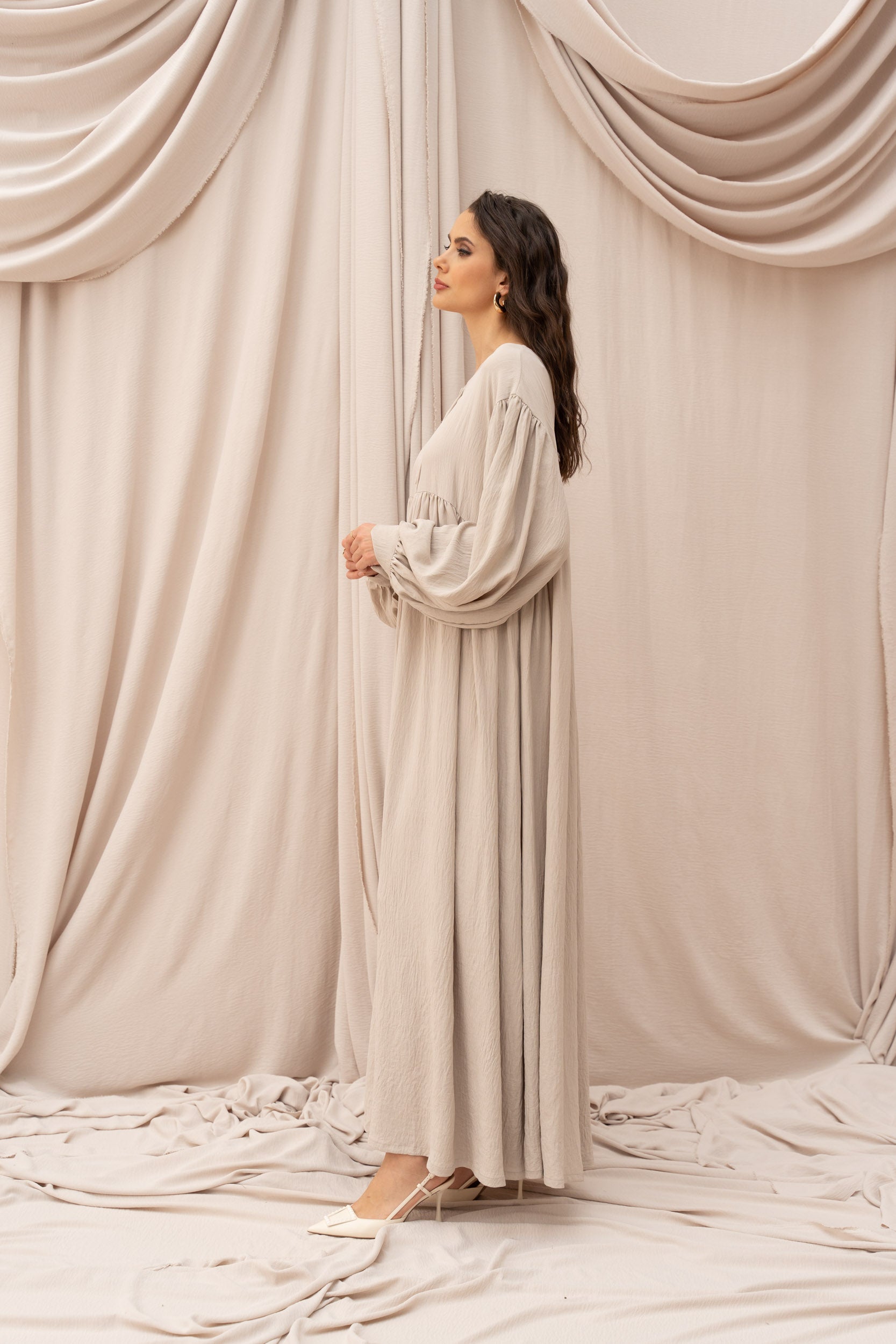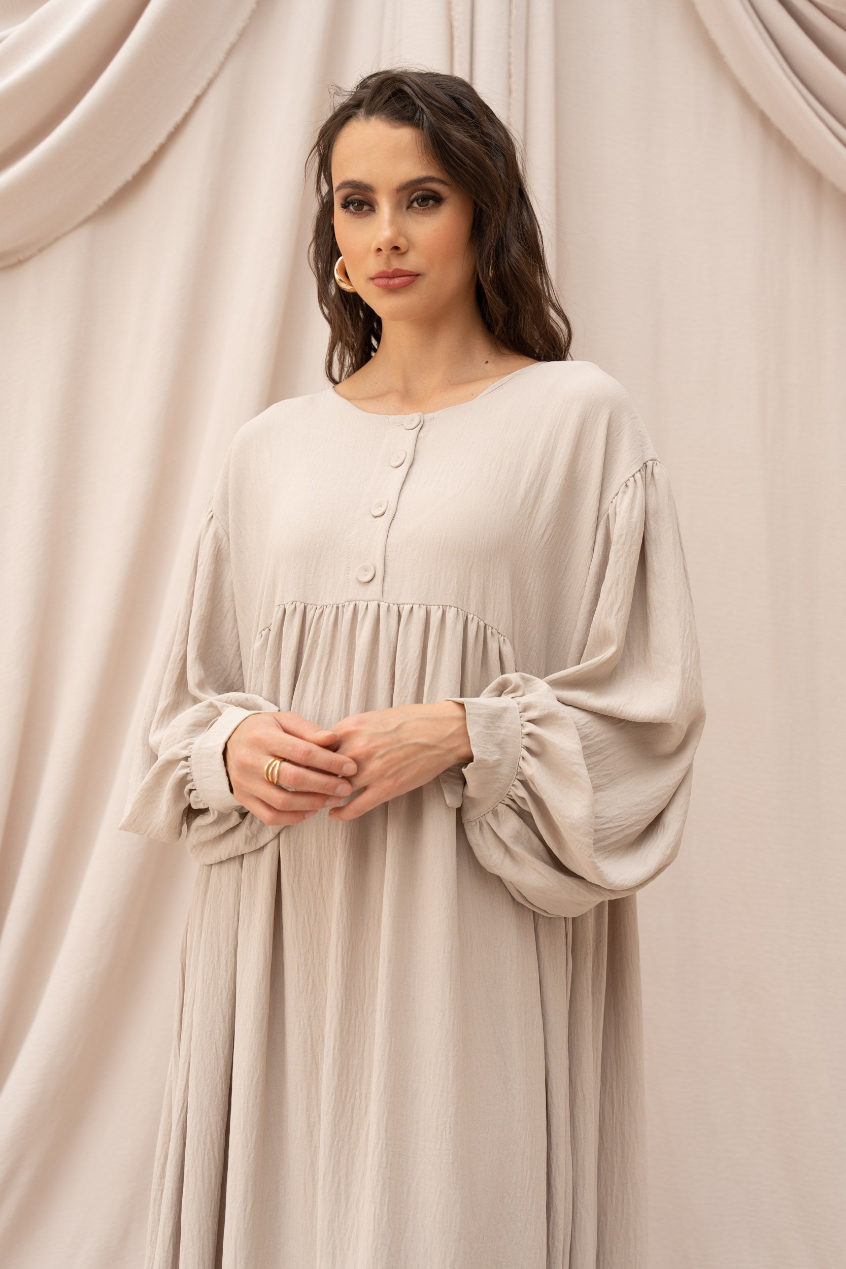 L'Abaya June en jazz, mêle élégance et praticité grâce à ses boutons qui facilitent l’allaitement ou l’habillage. Ses manches plissées et boutonnées ajoutent un détail sophistiqué, parfait pour un style raffiné. À associer avec un hijab ou un khimar pour une allure complète.