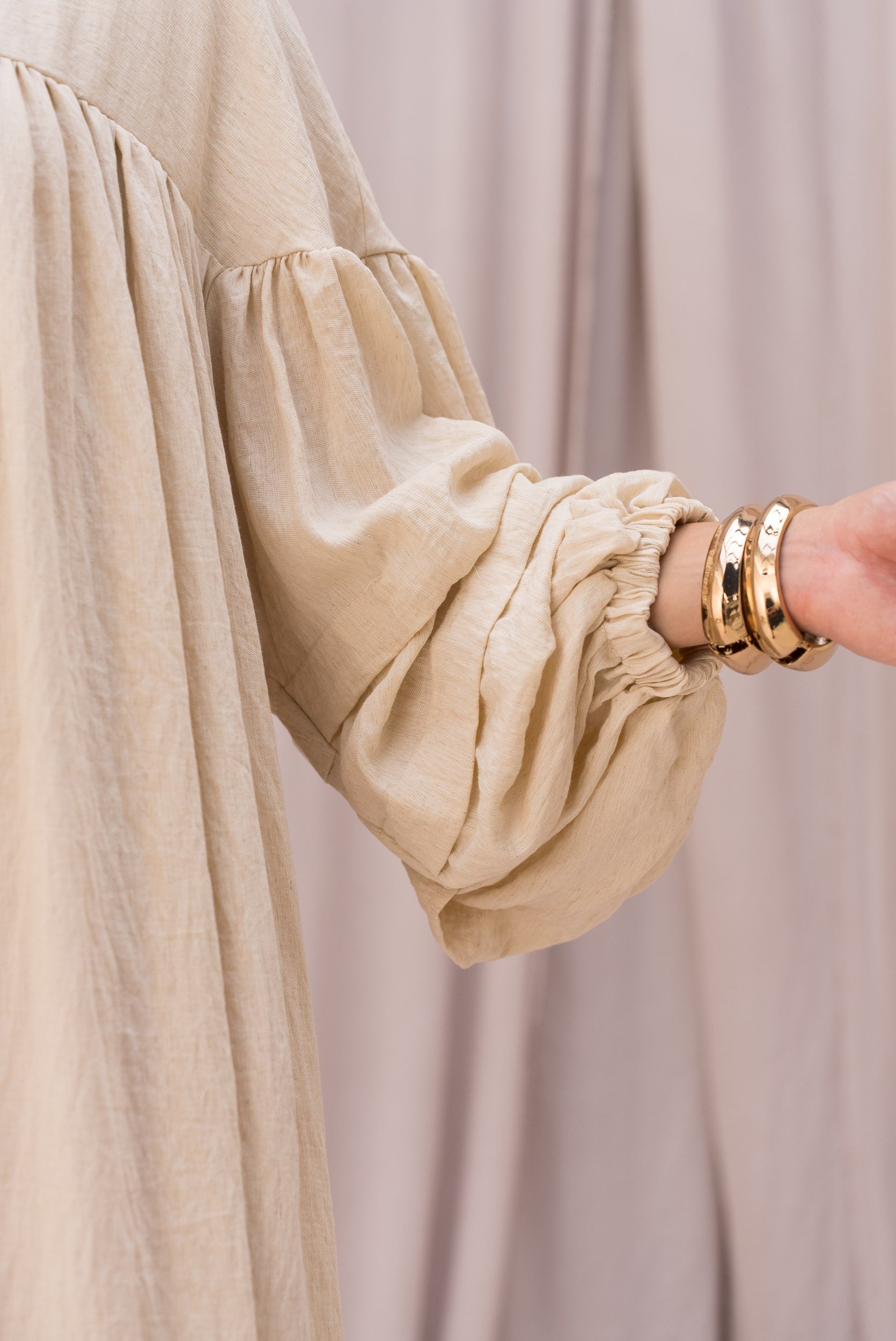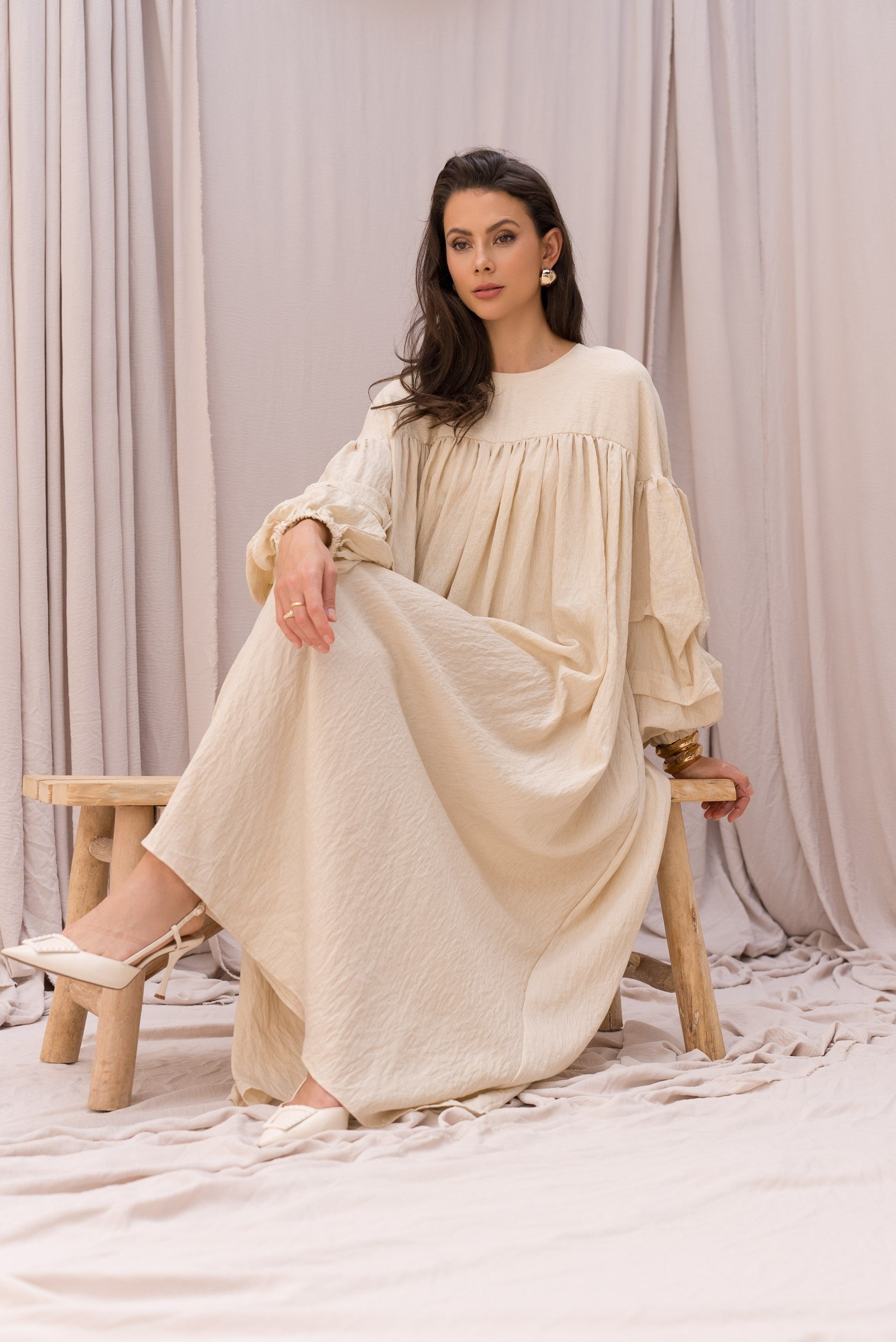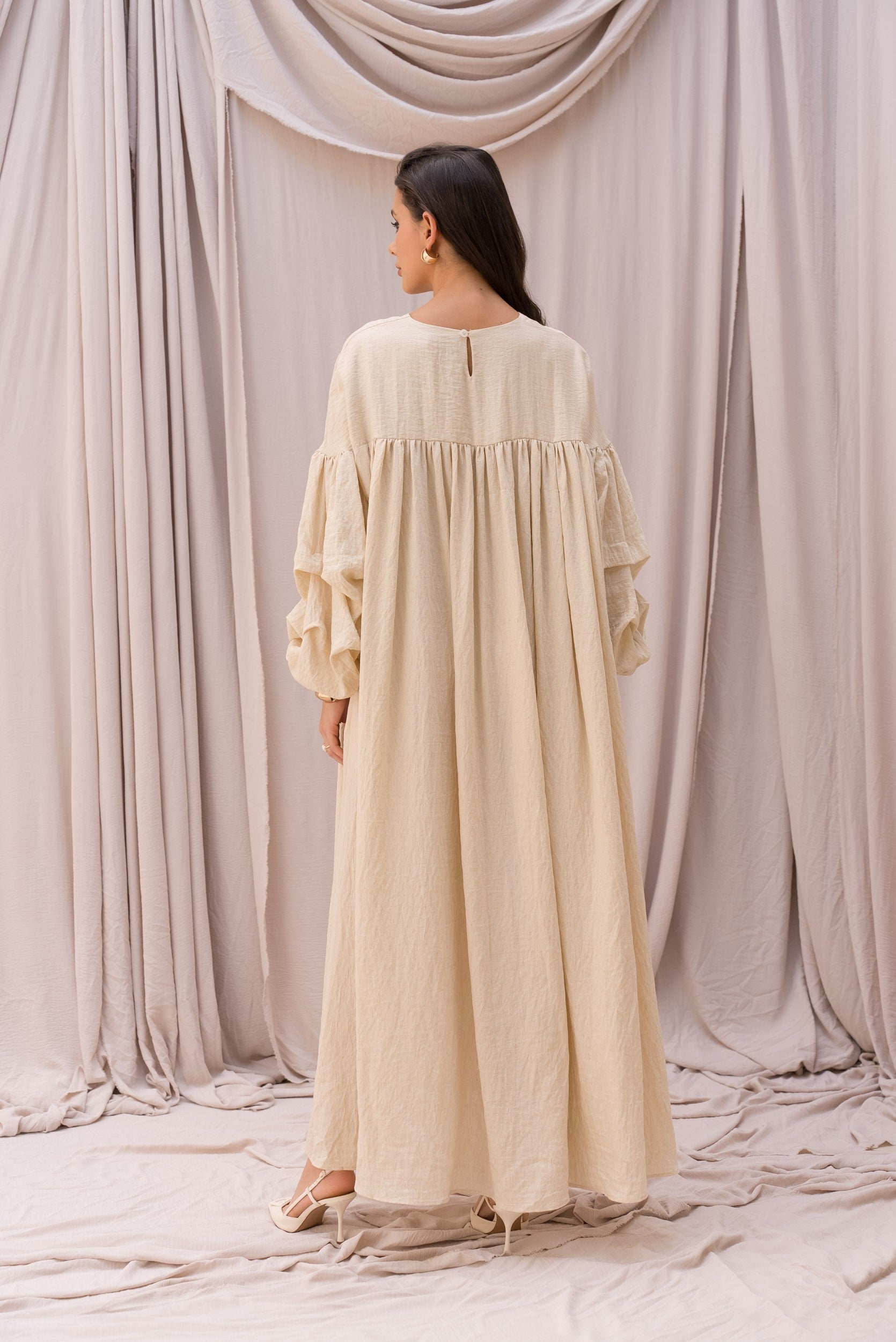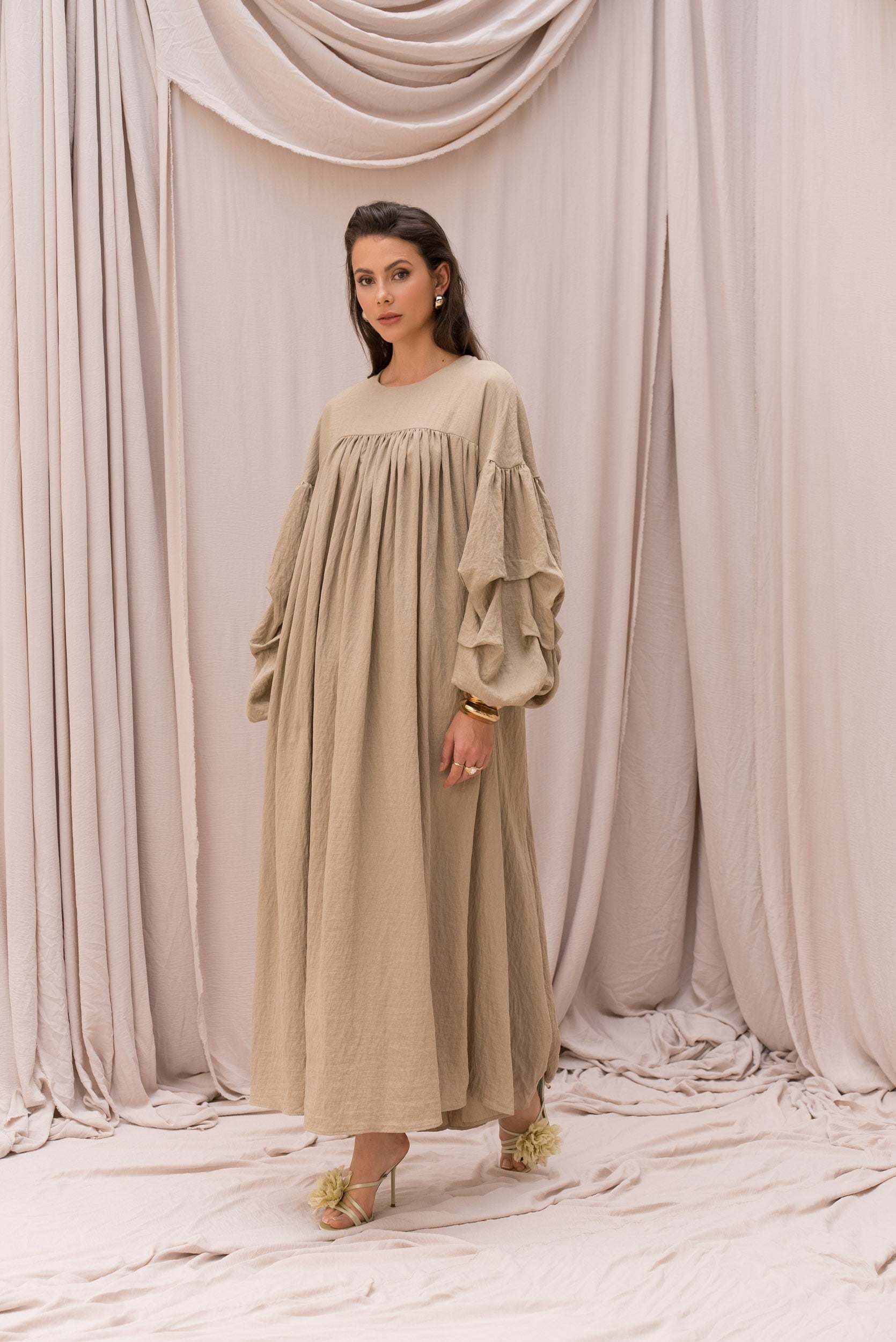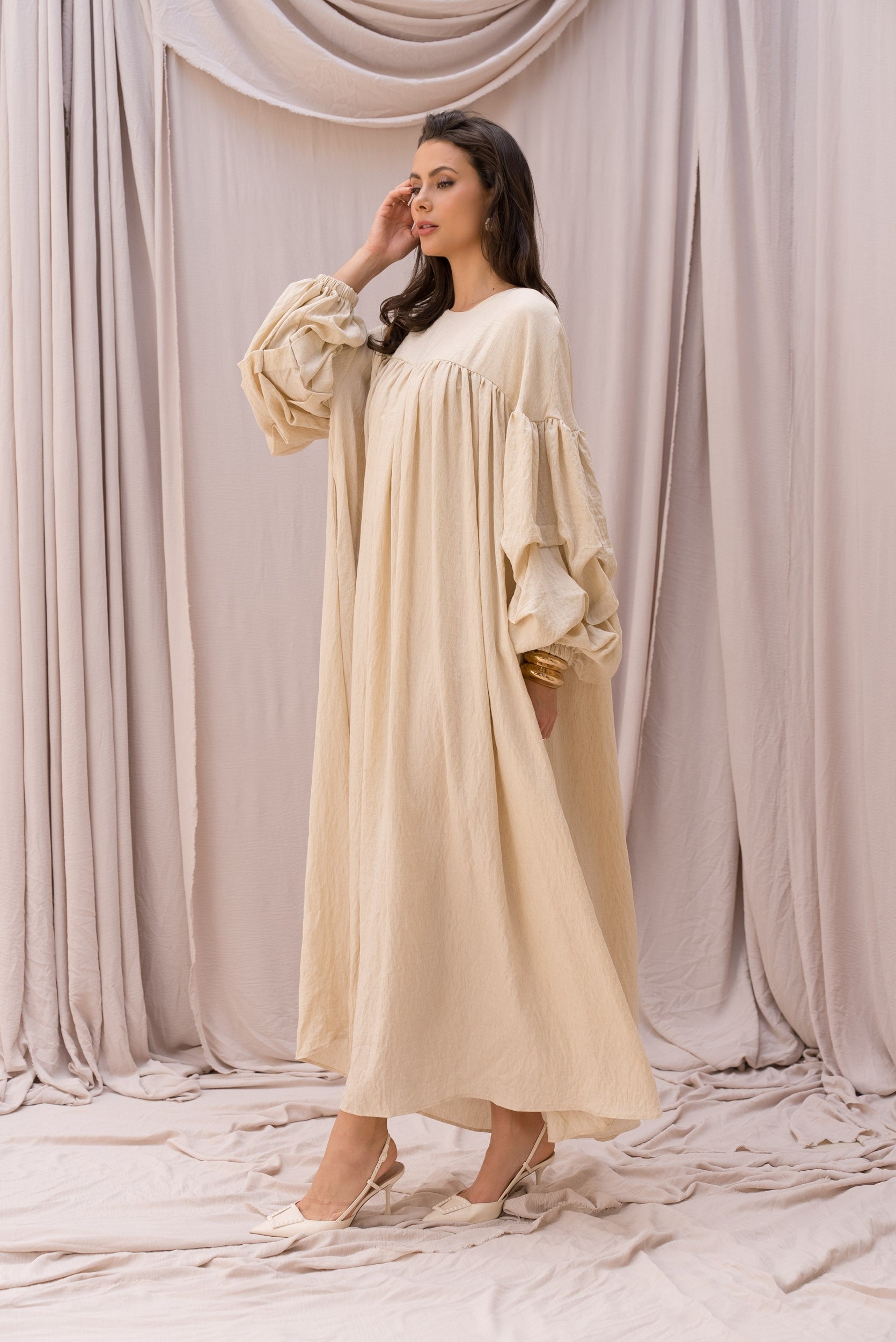 Ajoutez une touche de modernité et de modestie à votre garde-robe avec l'Abaya Laalia, conçue en lin pour garantir fraîcheur et confort pendant les périodes chaudes. Sa coupe ballon et ses détails sur les manches en font le choix parfait pour les occasions estivales.