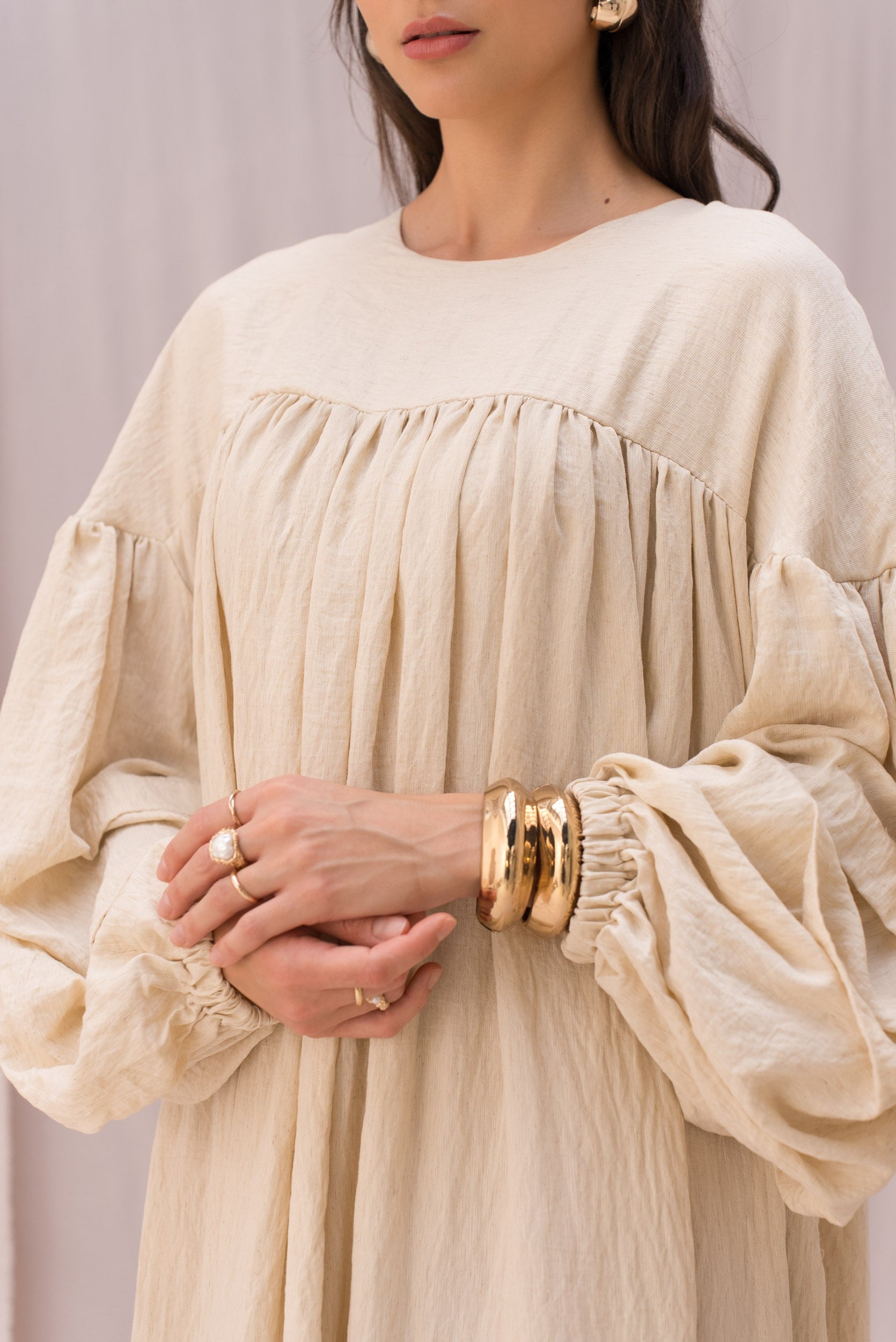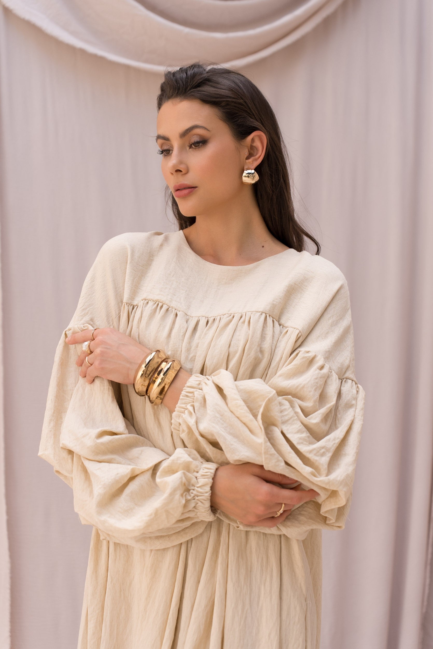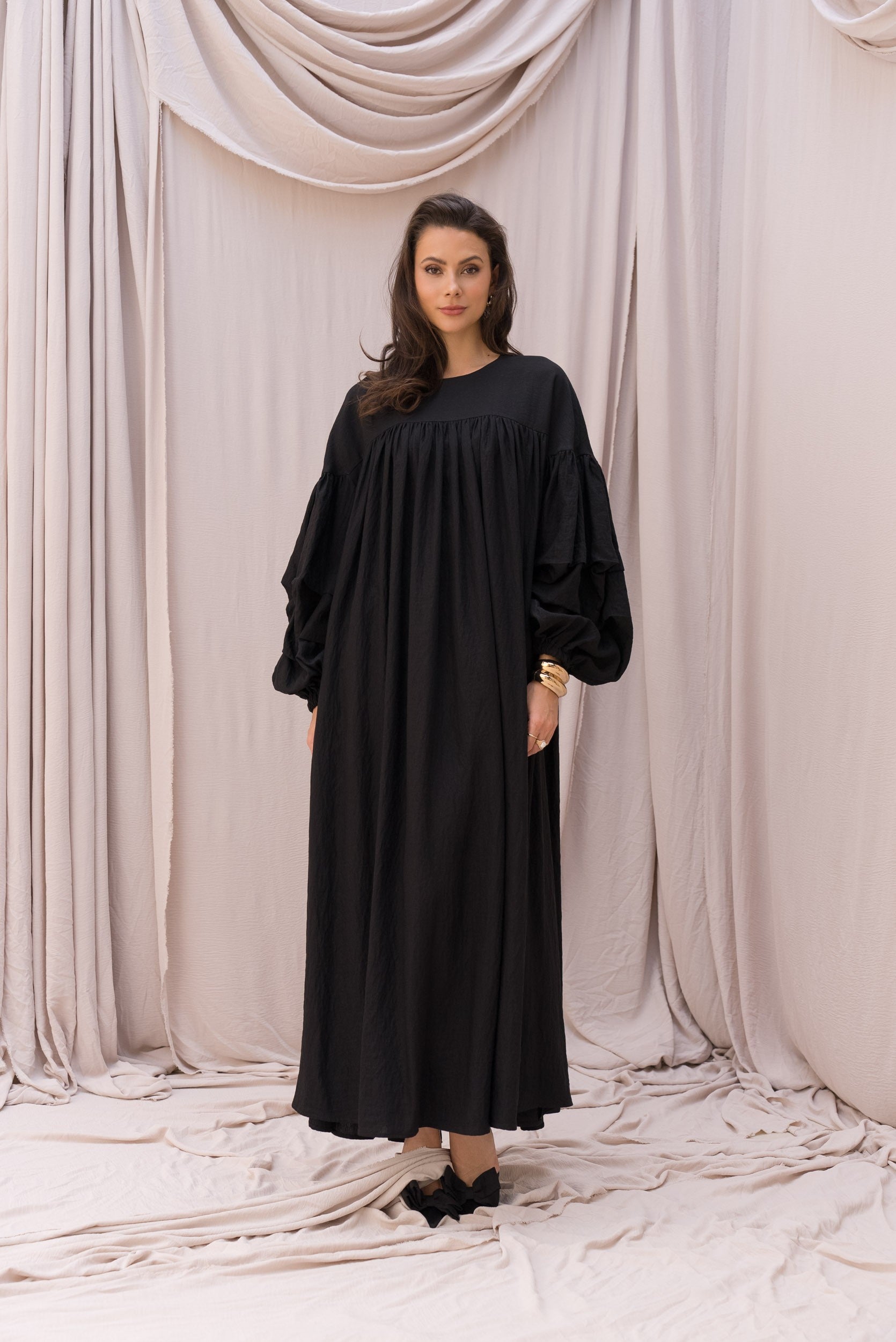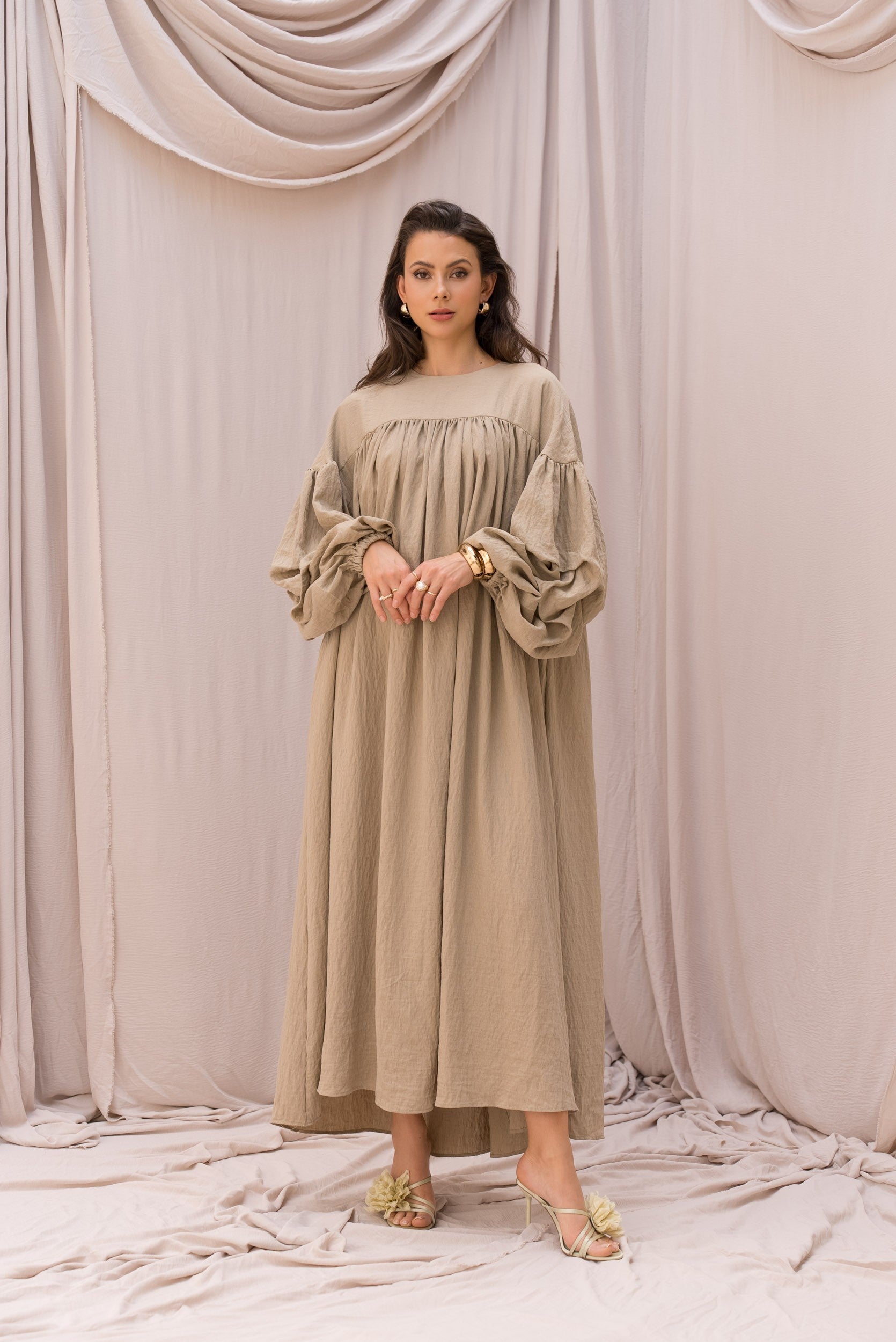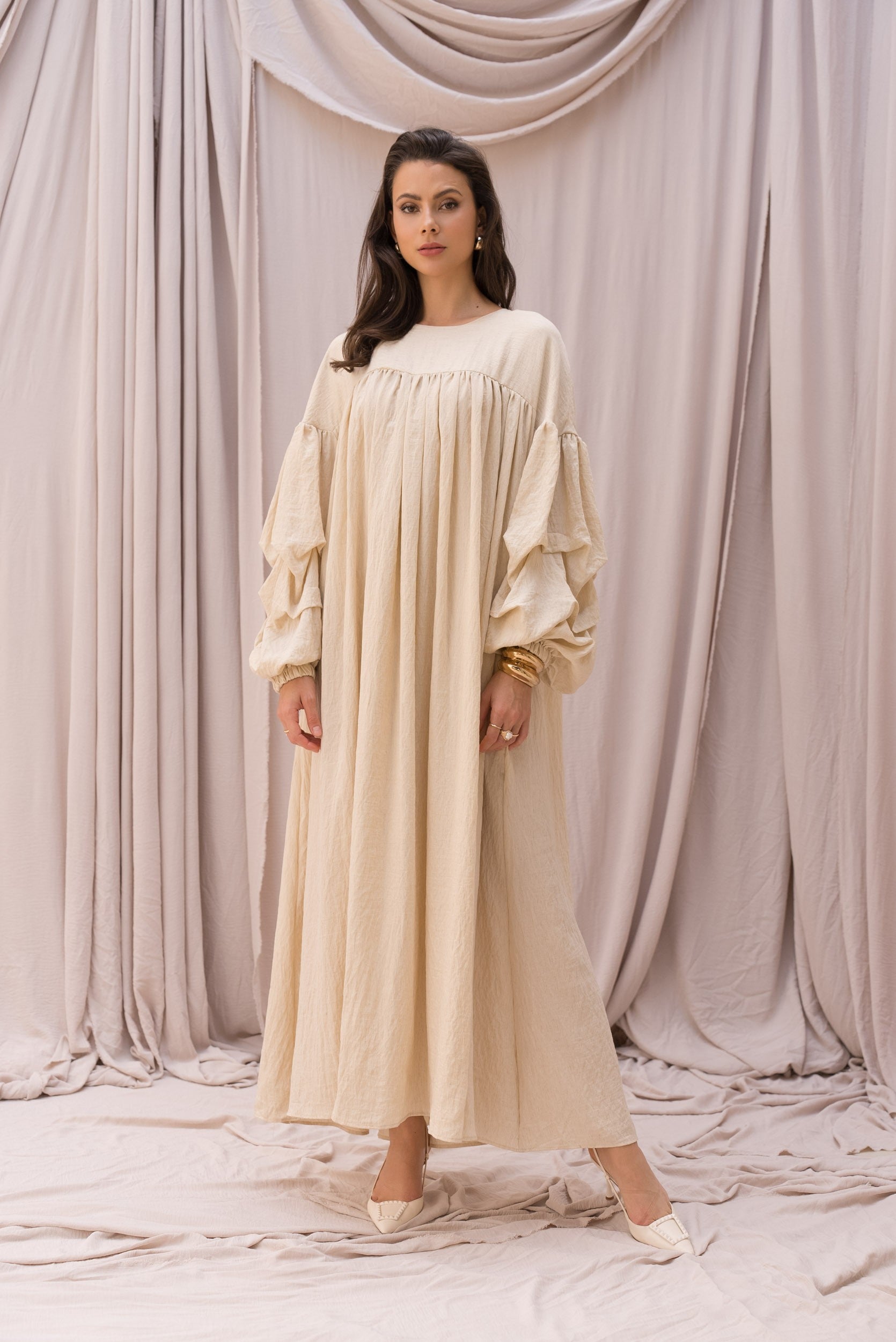 Ajoutez une touche de modernité et de modestie à votre garde-robe avec l'Abaya Laalia, conçue en lin pour garantir fraîcheur et confort pendant les périodes chaudes. Sa coupe ballon et ses détails sur les manches en font le choix parfait pour les occasions estivales.