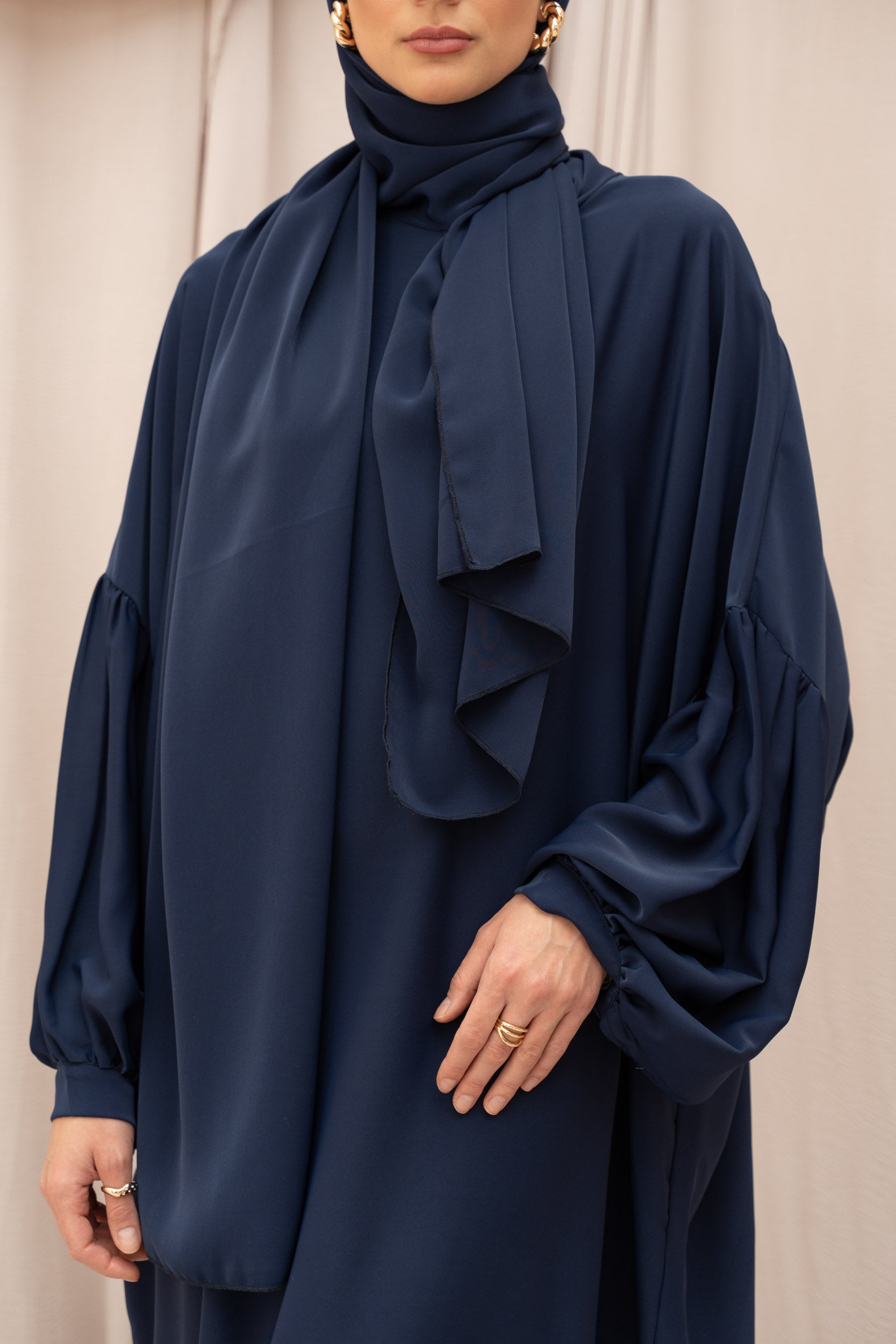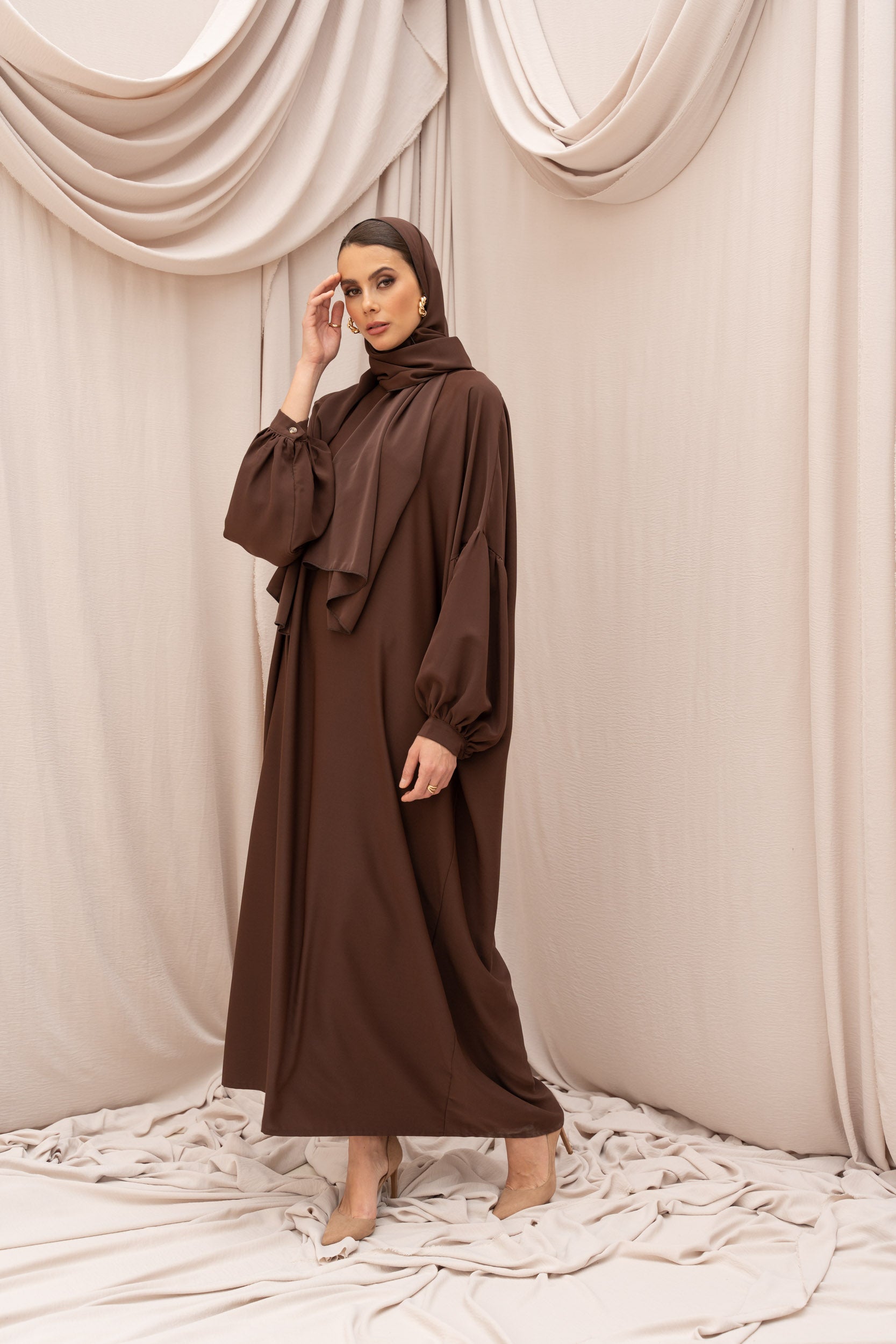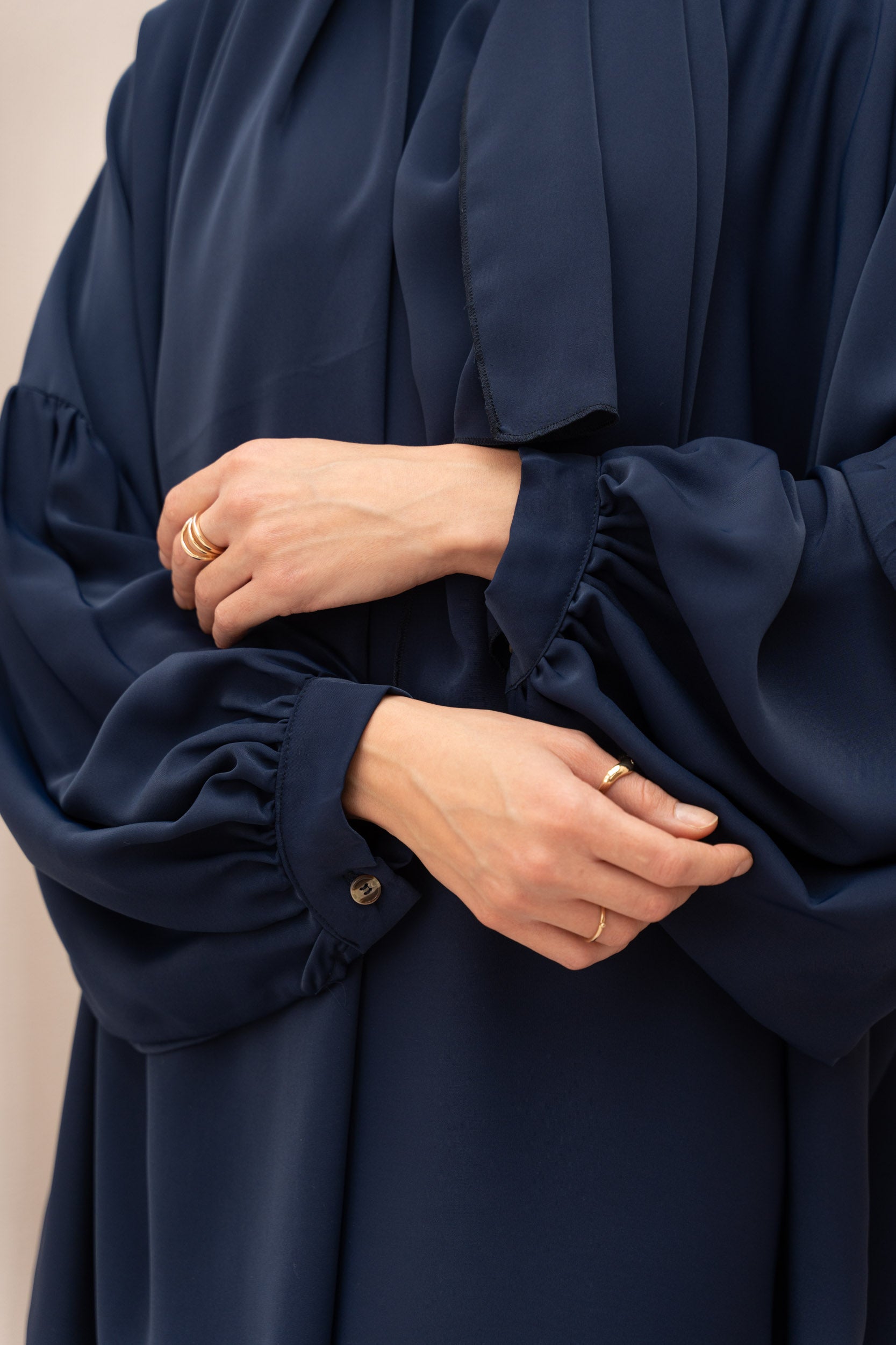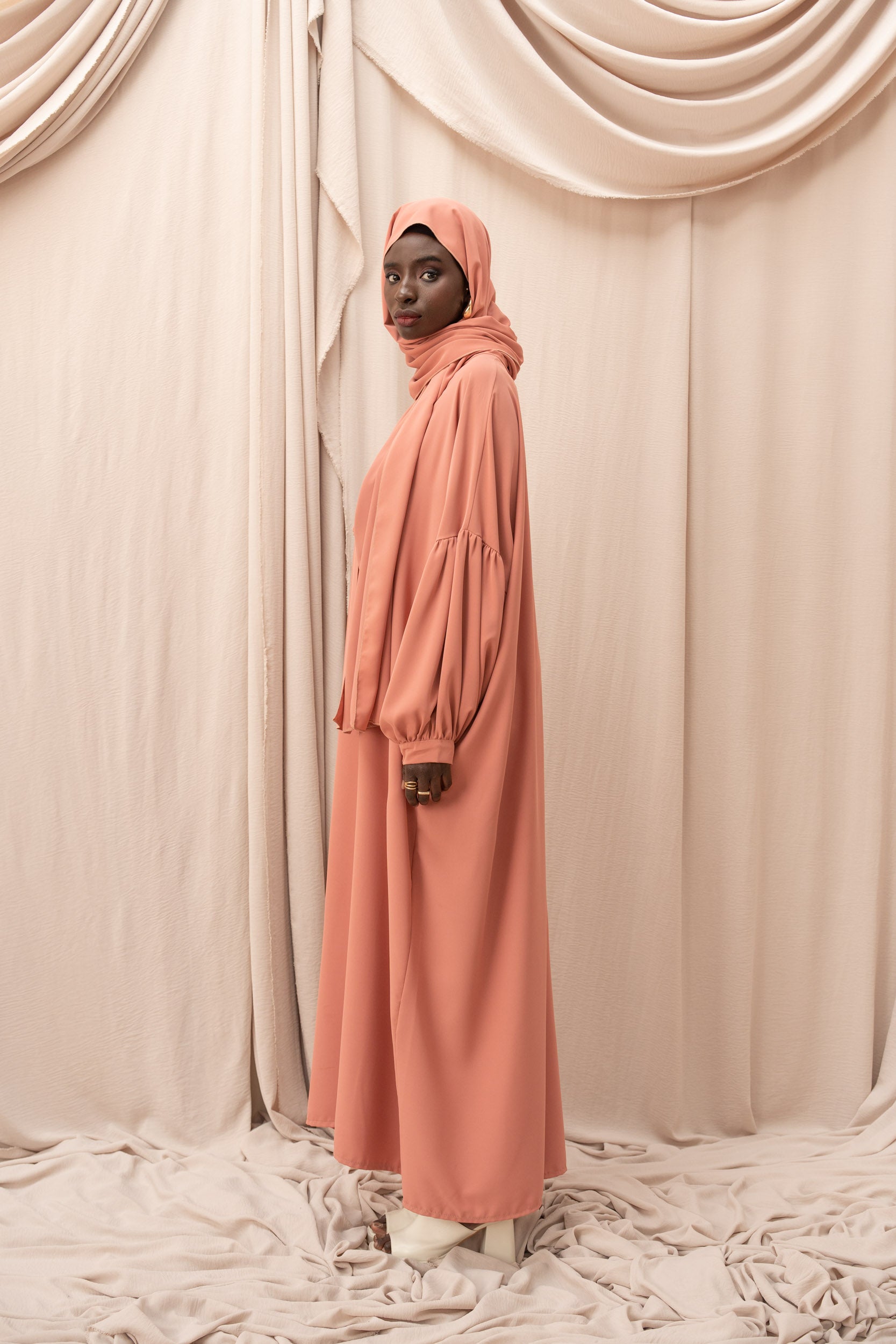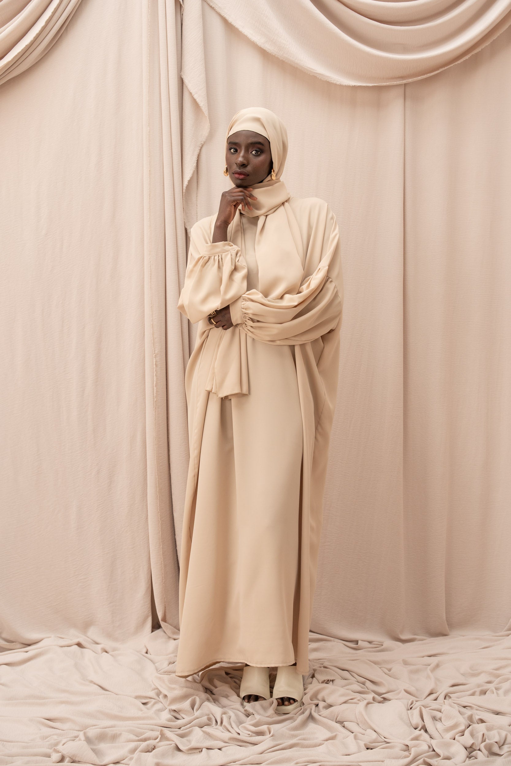 L'Abaya Mourida, en soie de médine, est un incontournable de votre garde-robe, grâce à sa simplicité et son voile intégré pratique. Les manches boutonnées ajoutent une touche d'harmonie à cette pièce.