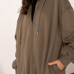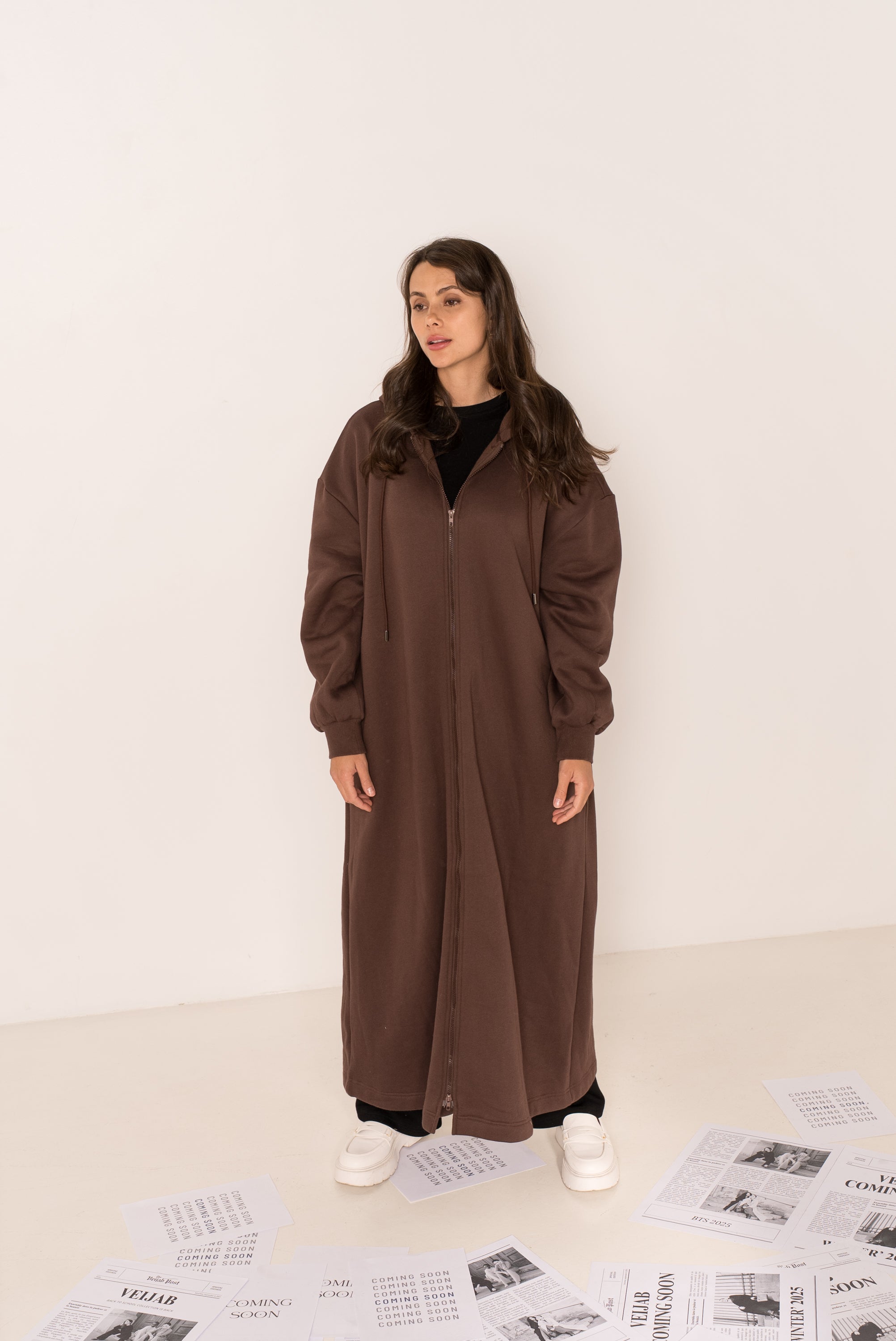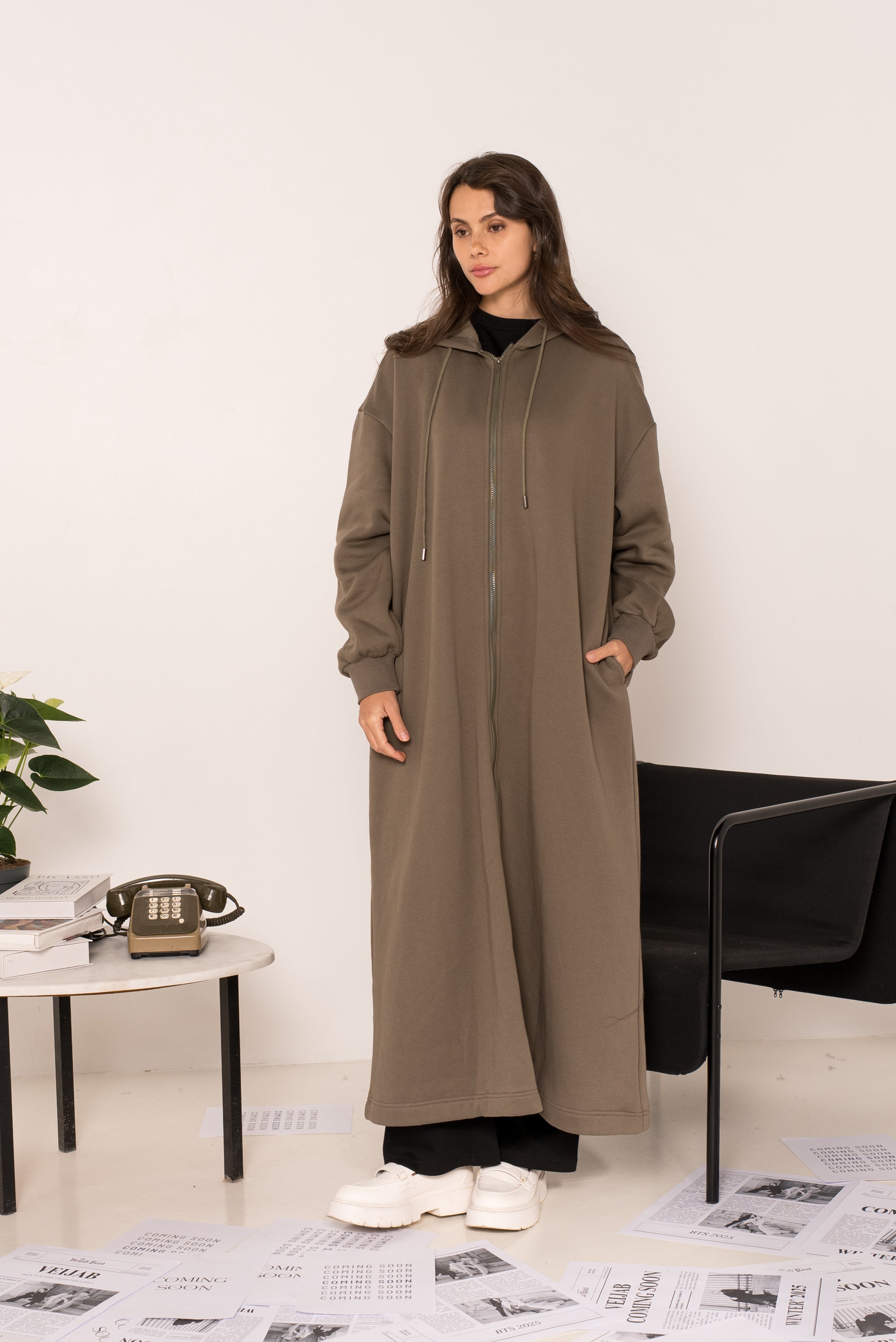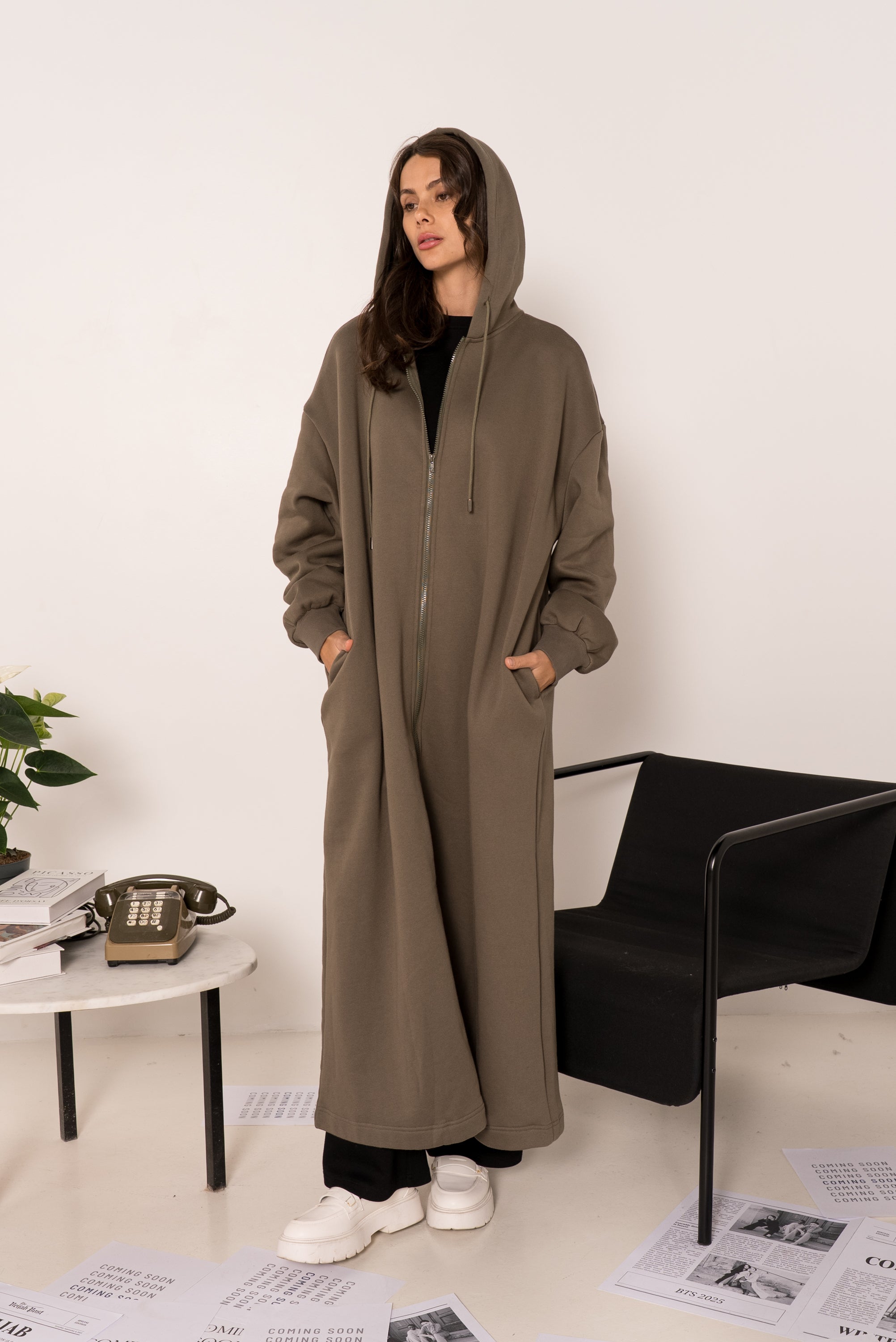 Sweat Hadia allie confort et modernité avec son zip intégral et sa capuche pratique, elle est idéale pour l’hiver. À porter seule ou sur une abaya, elle apporte chaleur, élégance et style décontracté.