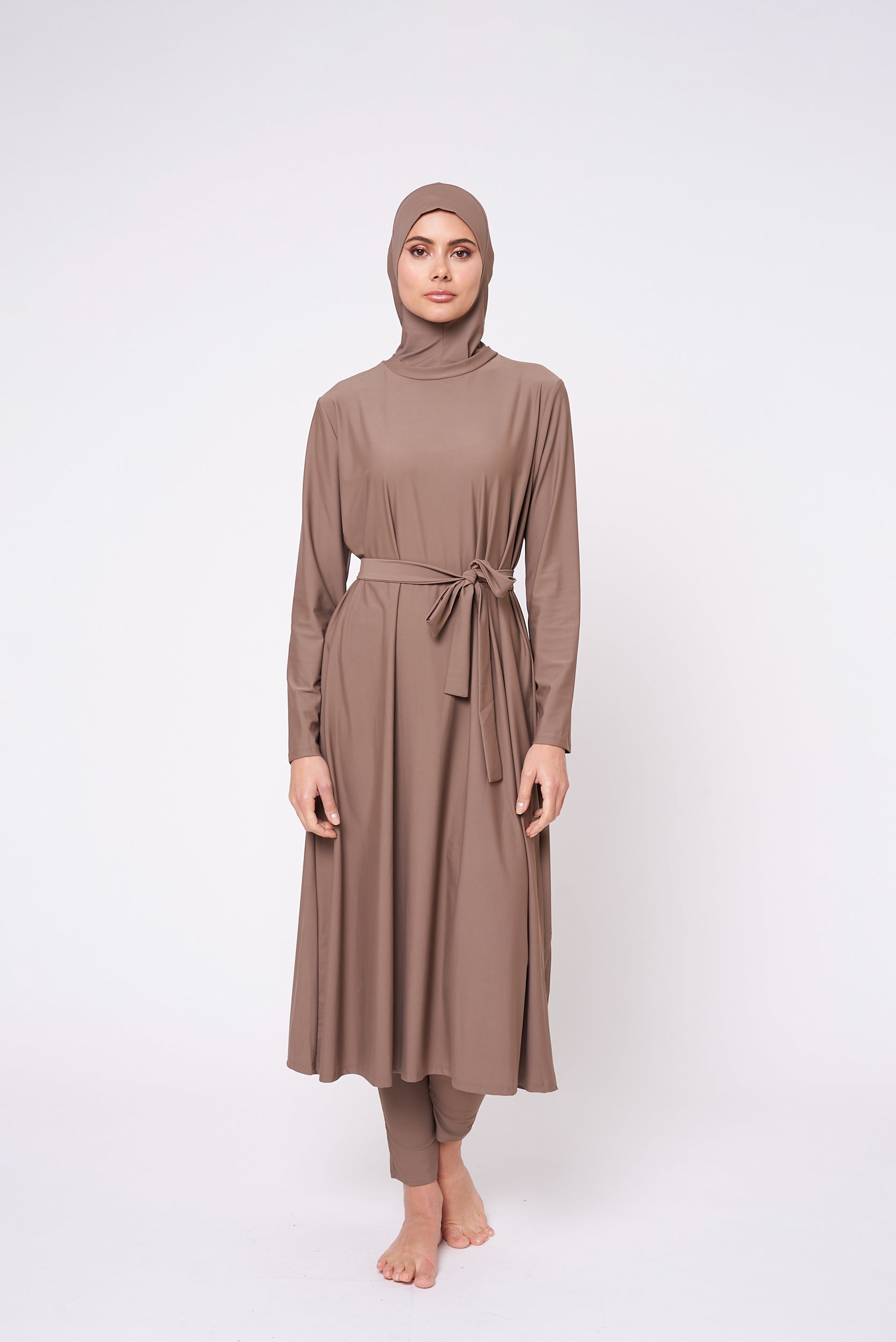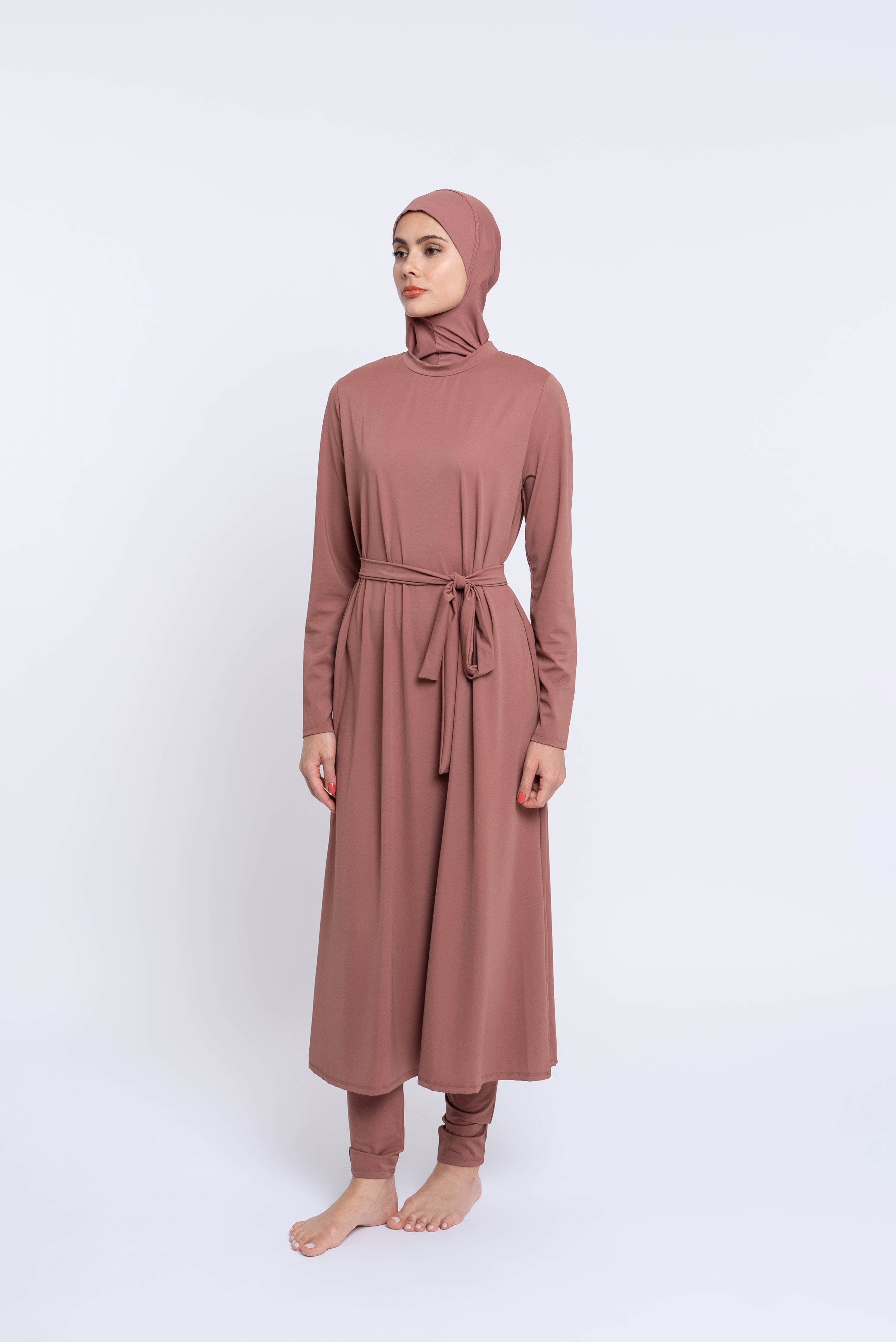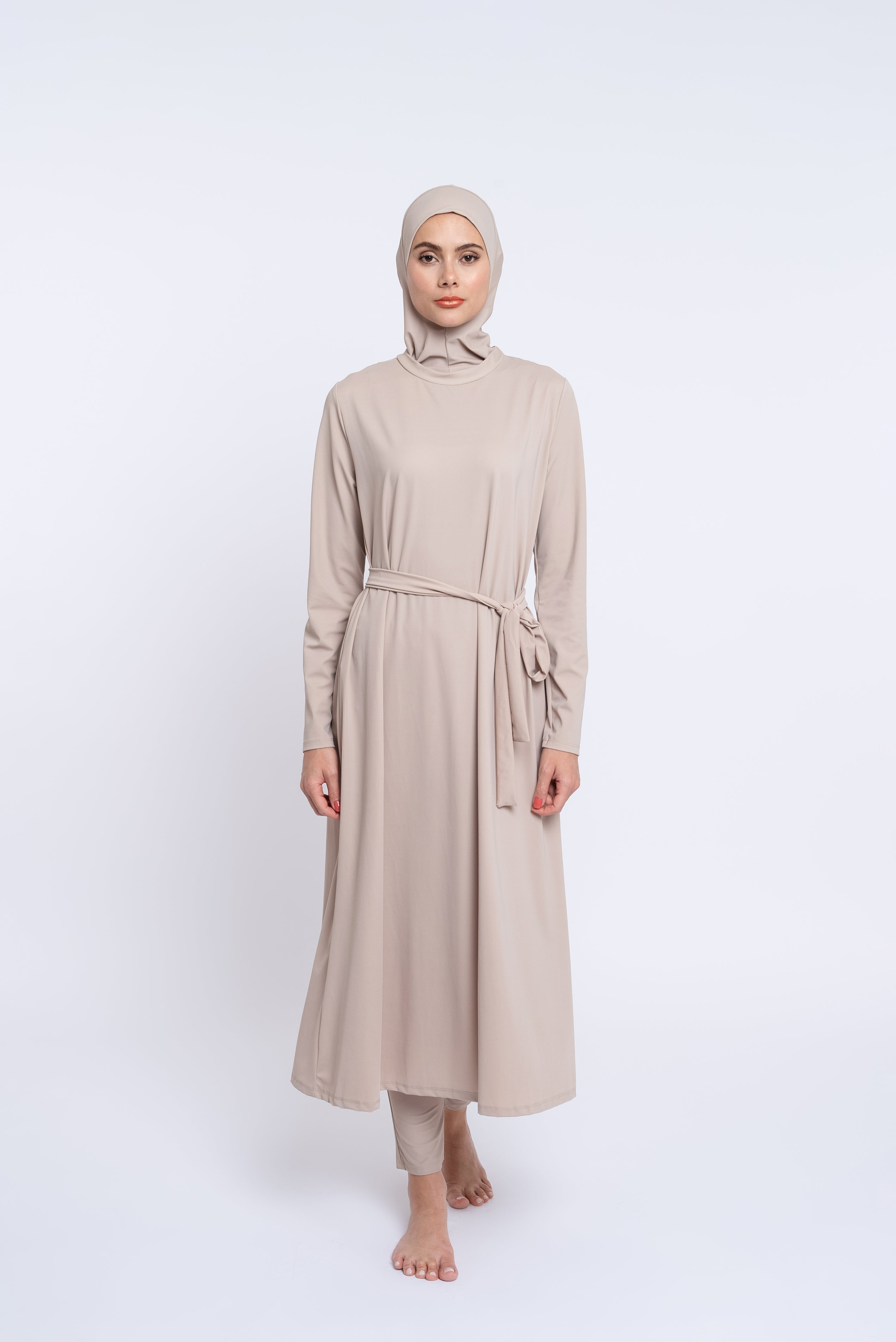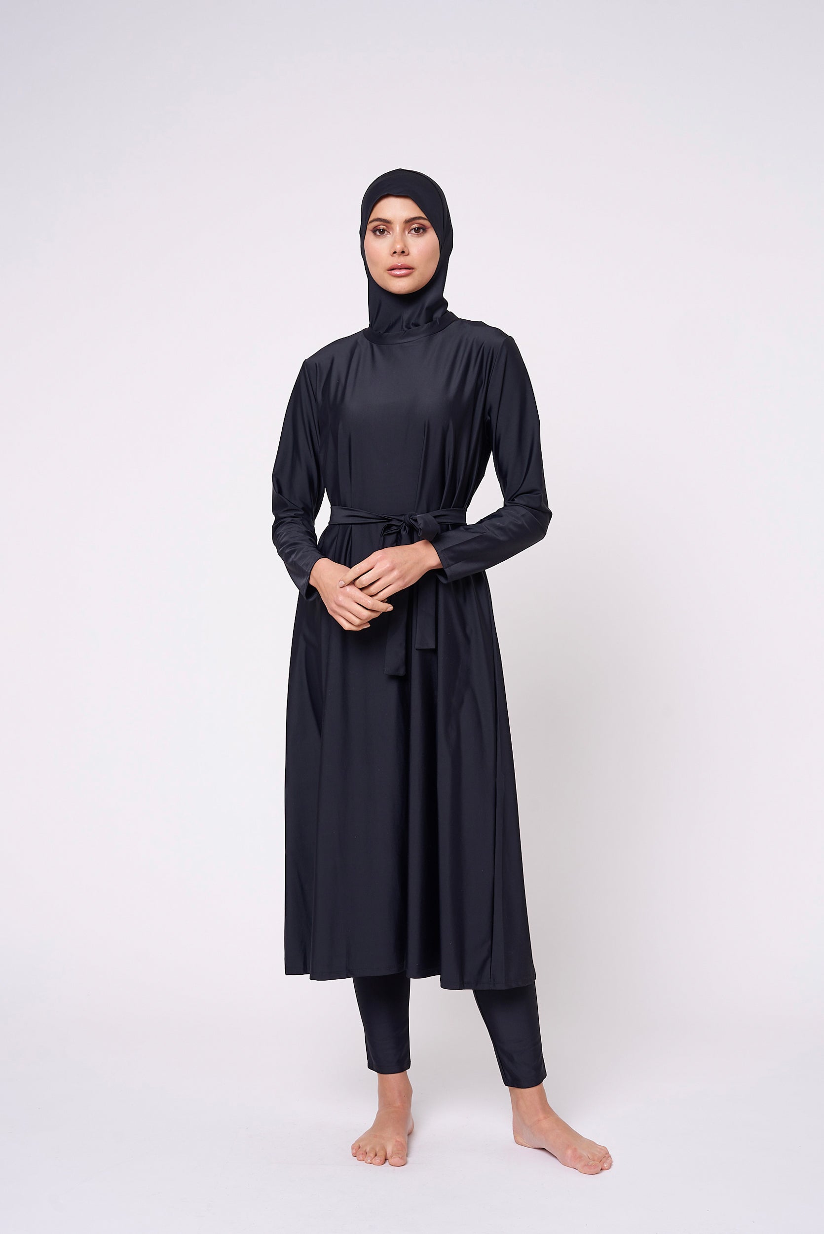 Le Burkini Baki dispose de deux façons d'attacher son voile. Premièrement, un voile à enfiler (pratique pour la natation) et un hijab qui s'attache à l'arrière de la tête. Le burkini à manches longues vous offre une protection optimale. Un système d'élastique de maintien à l'intérieur du jupon vous assure tranquillité.