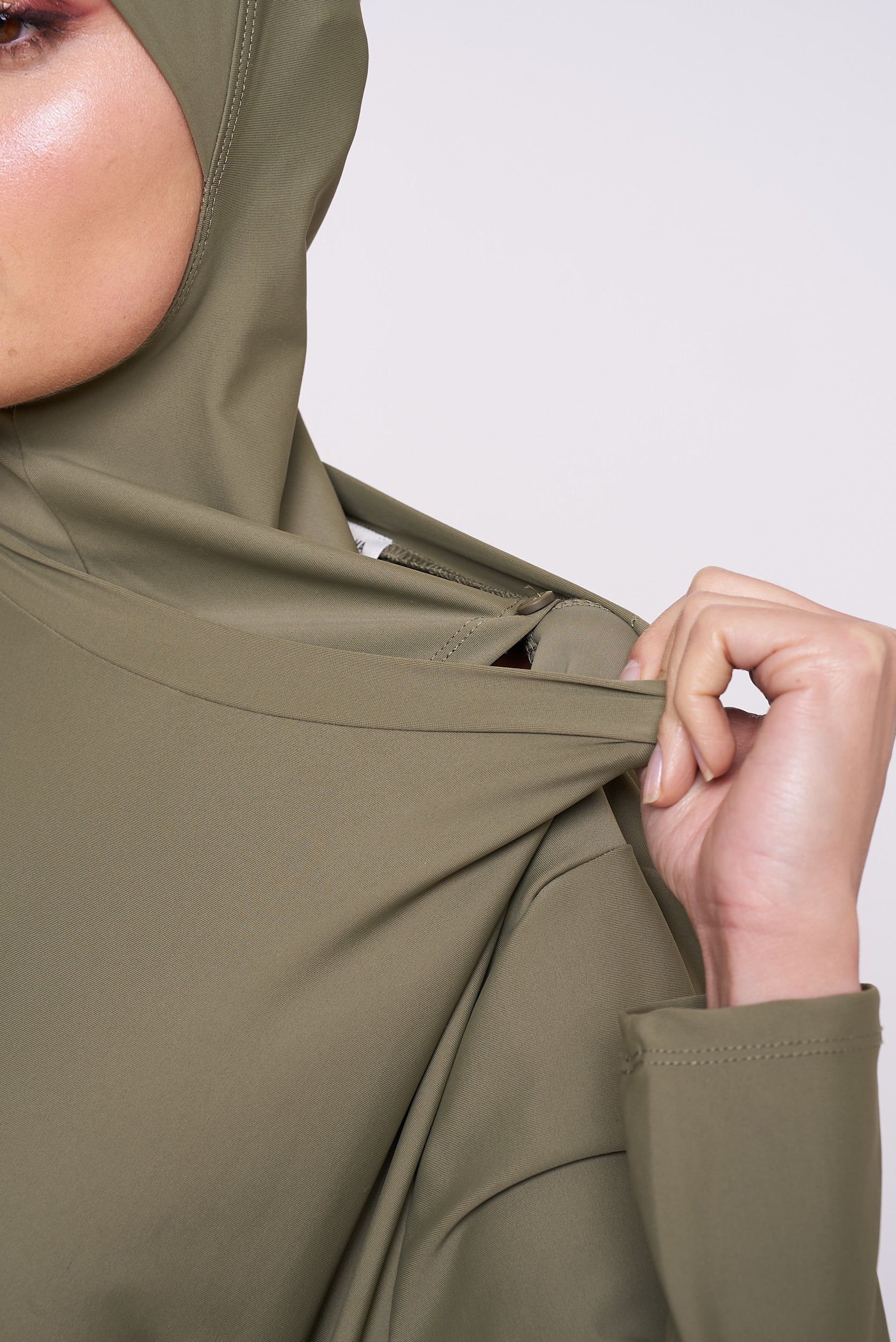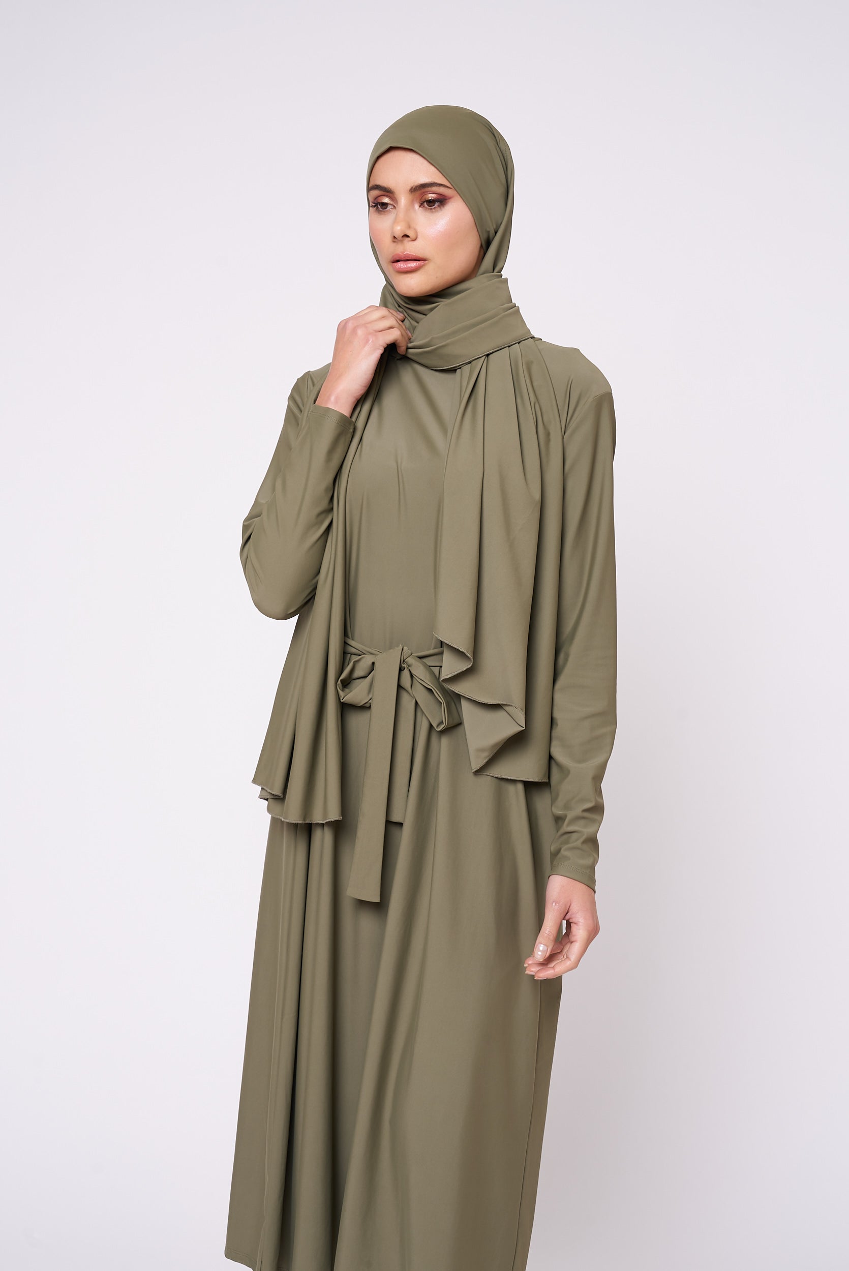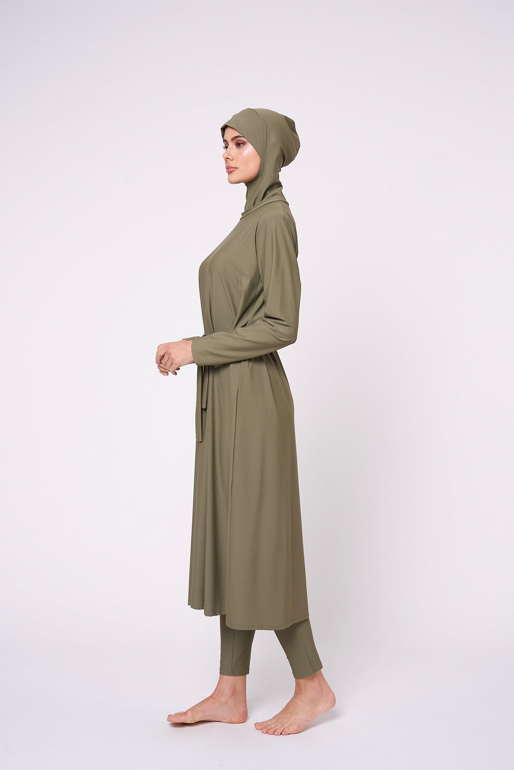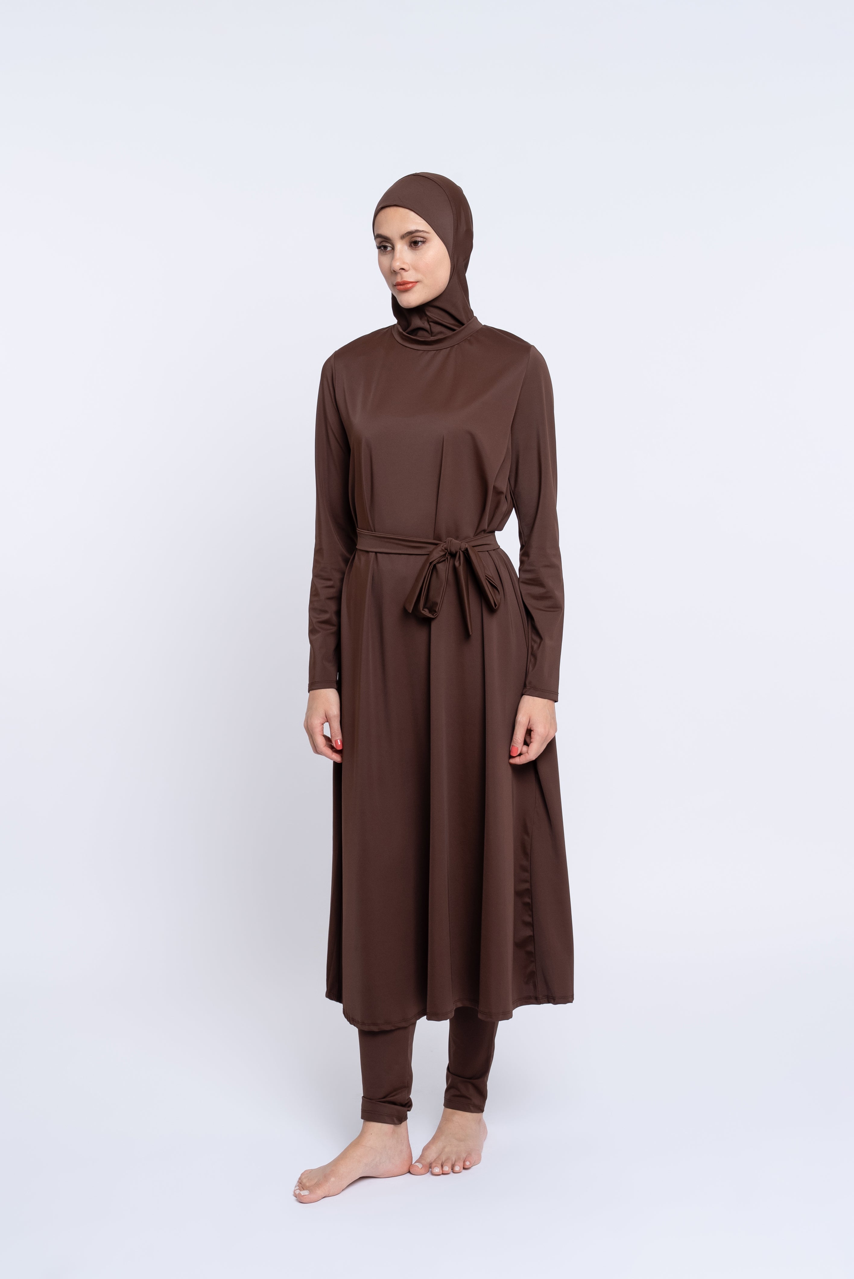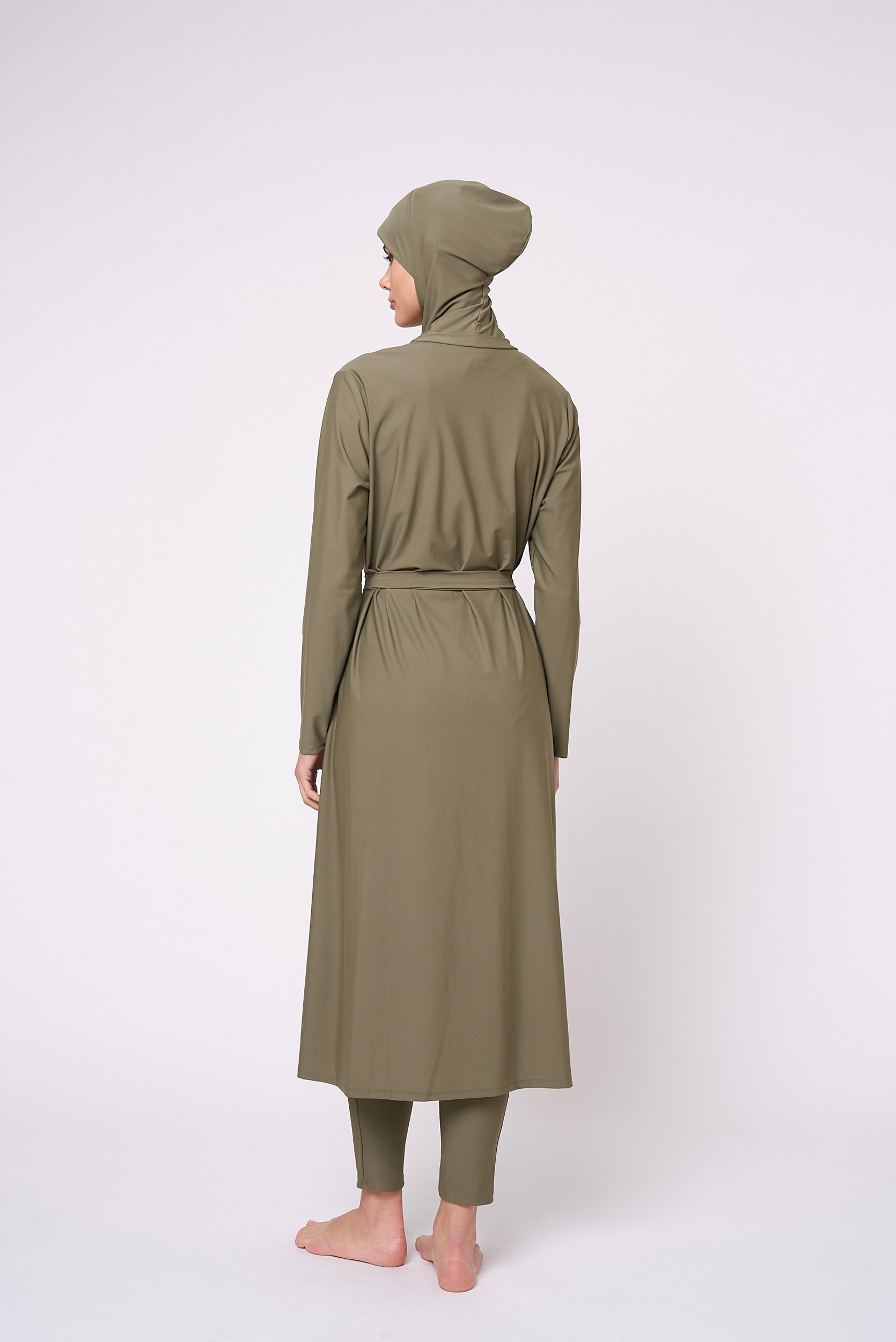 Le Burkini Baki dispose de deux façons d'attacher son voile. Premièrement, un voile à enfiler (pratique pour la natation) et un hijab qui s'attache à l'arrière de la tête. Le burkini à manches longues vous offre une protection optimale. Un système d'élastique de maintien à l'intérieur du jupon vous assure tranquillité.