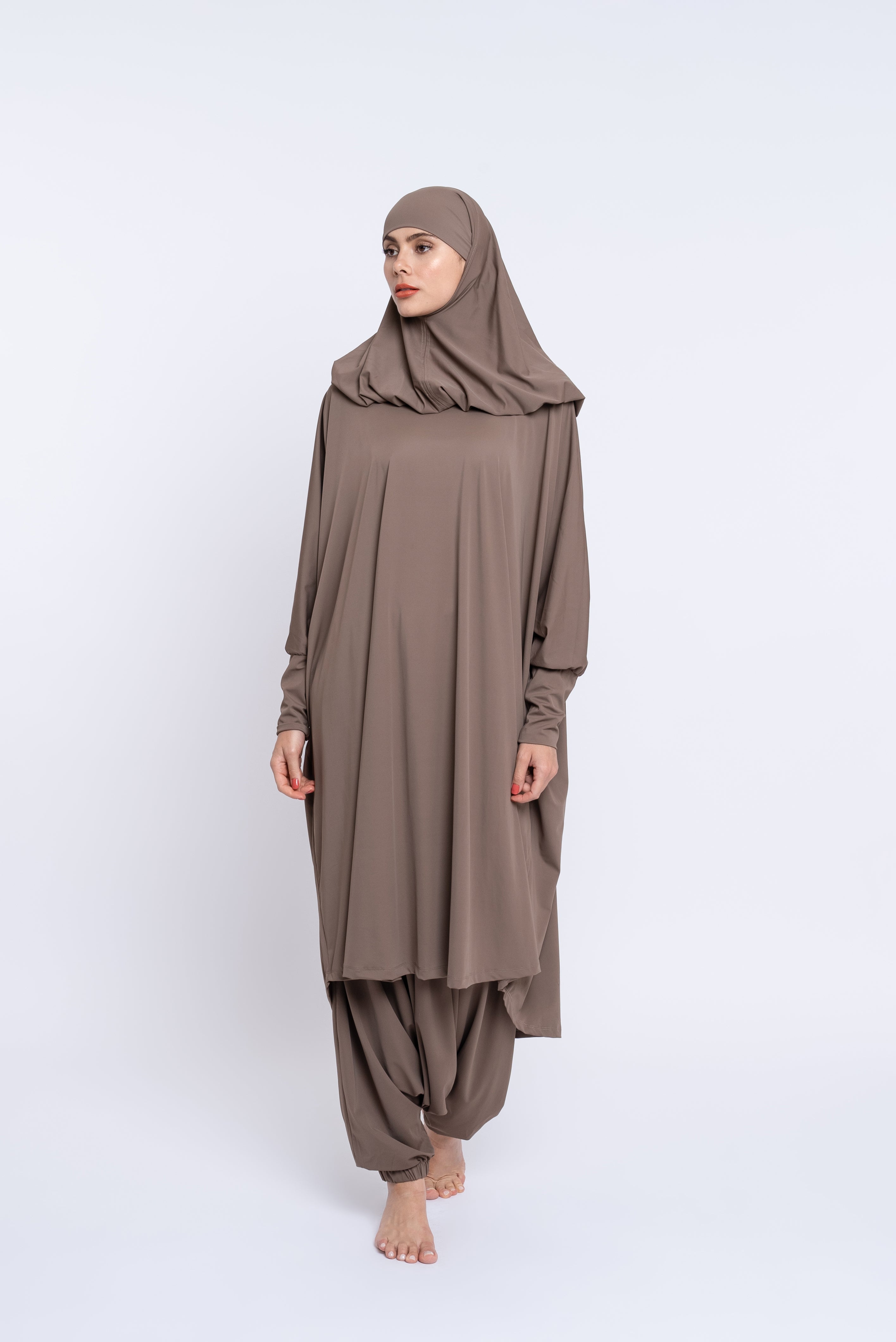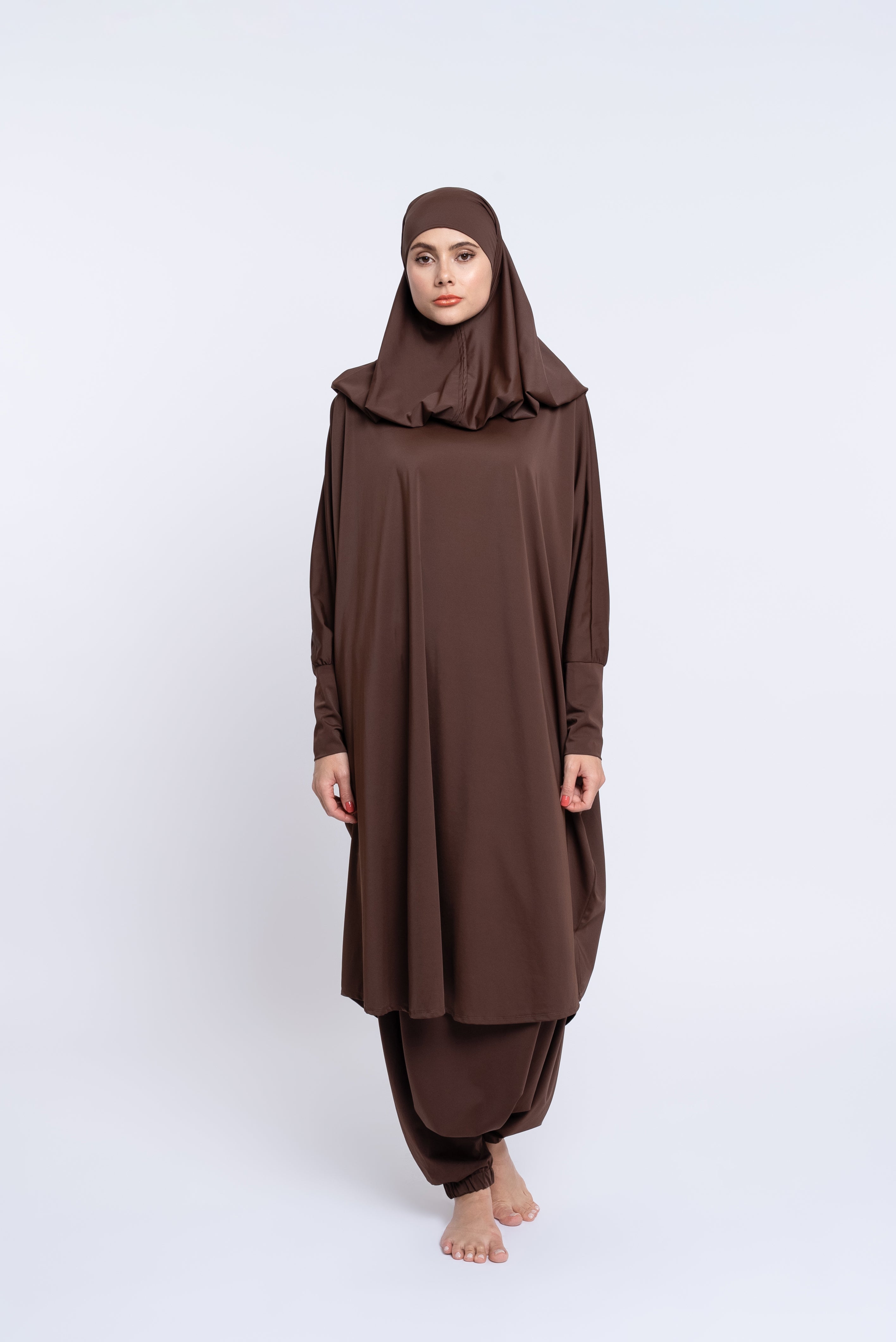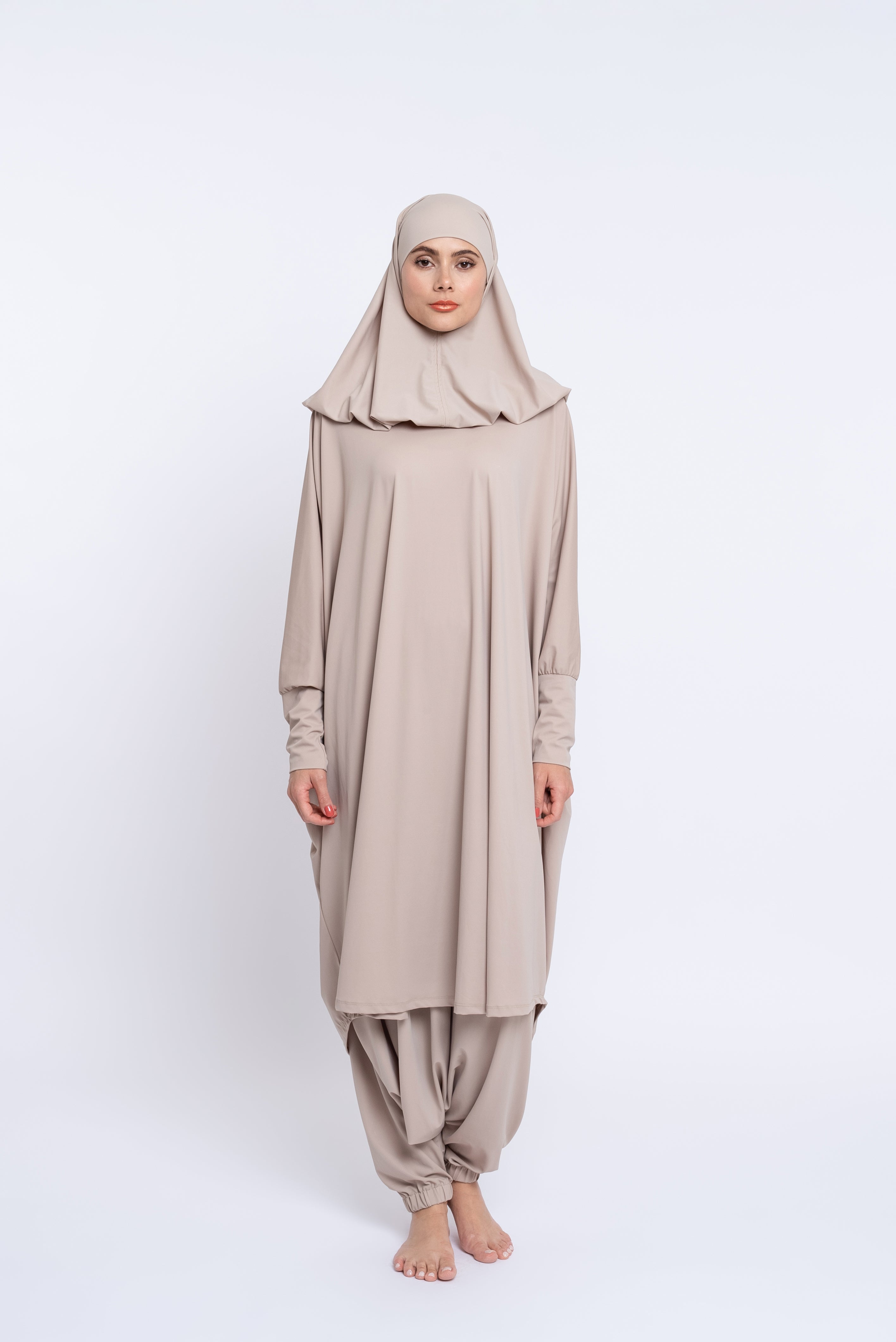 Le Burkini Basma possède deux pièces : tunique et sarouel. Le burkini à manches longues vous offre une protection optimale. Un système d'élastique de maintien à l'intérieur du jupon vous assure sécurité et tranquillité.