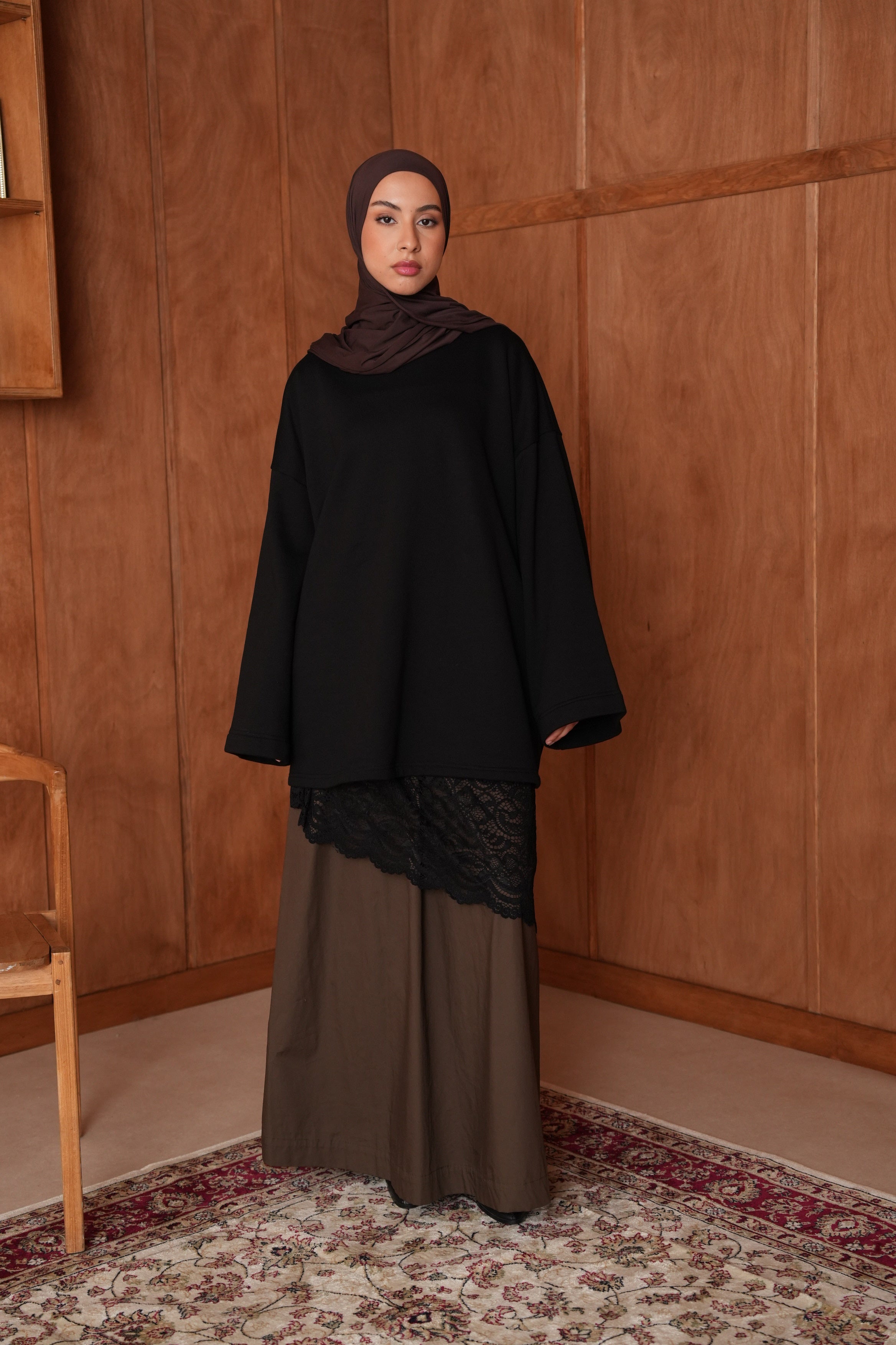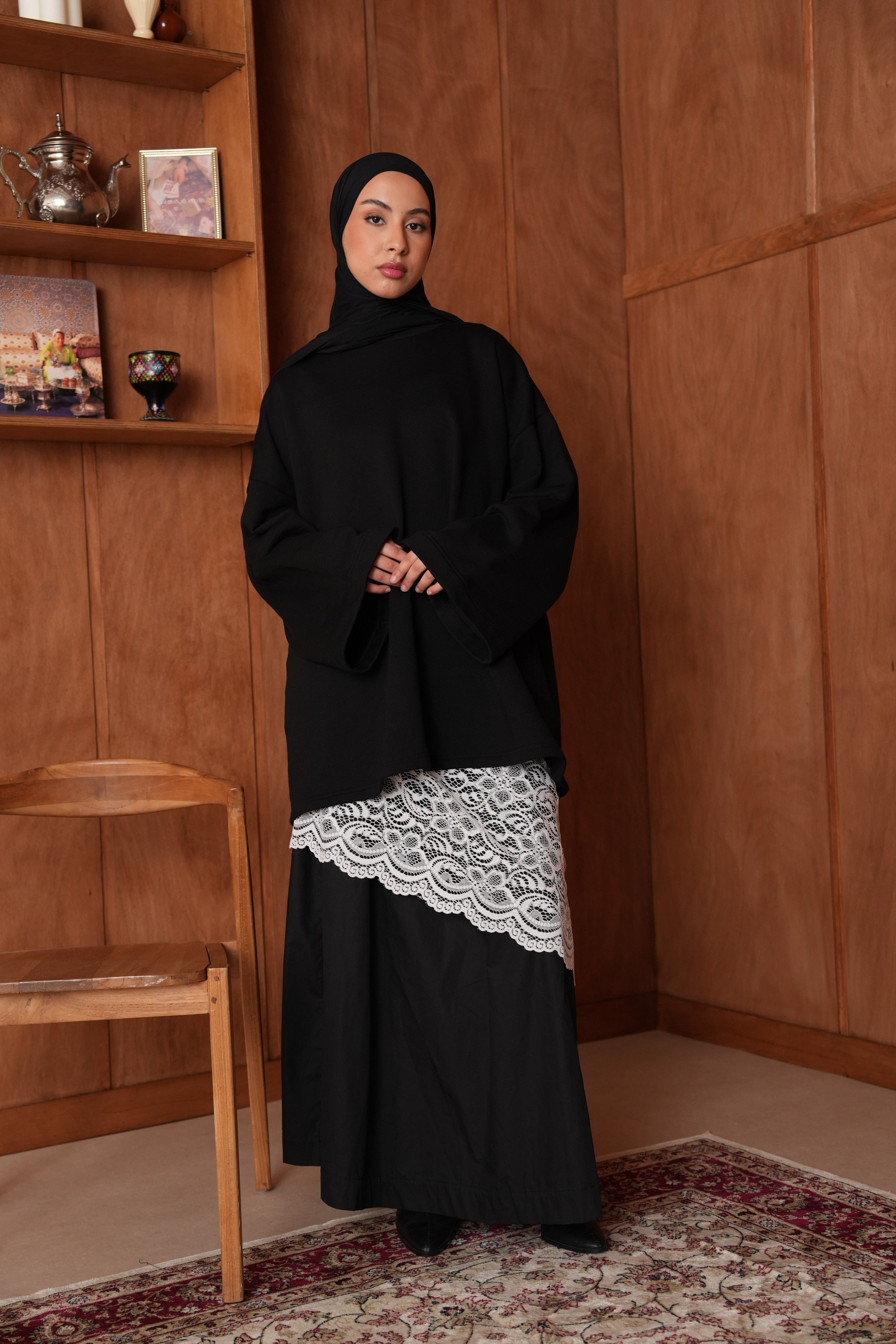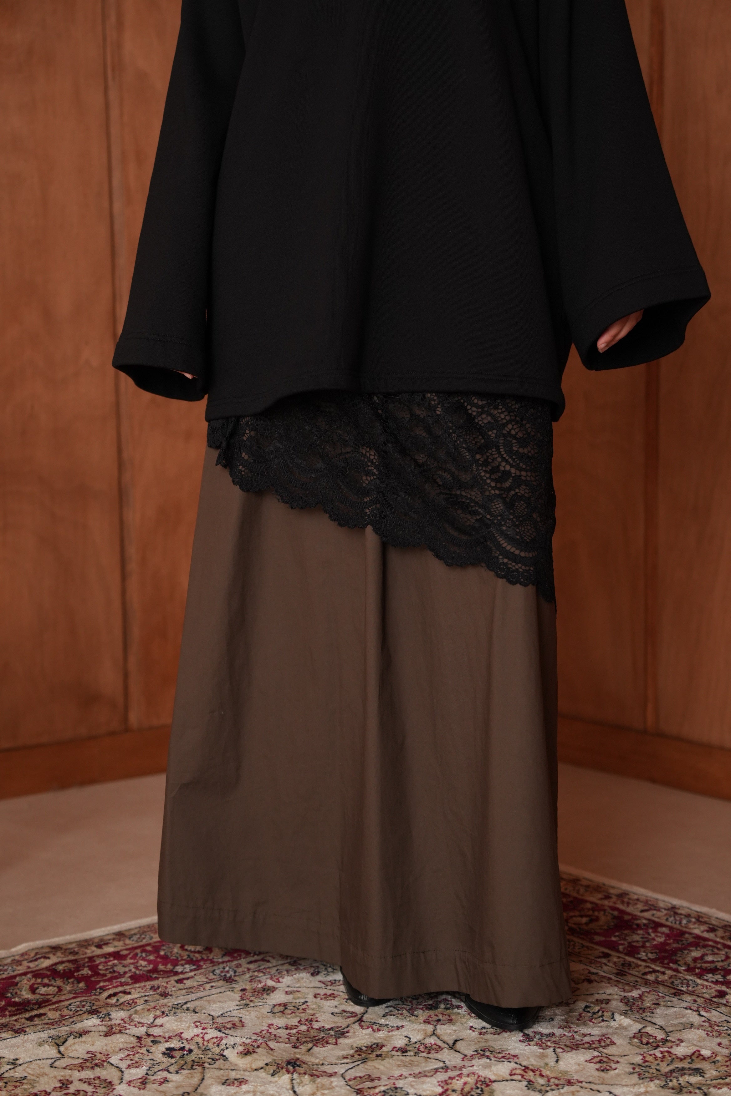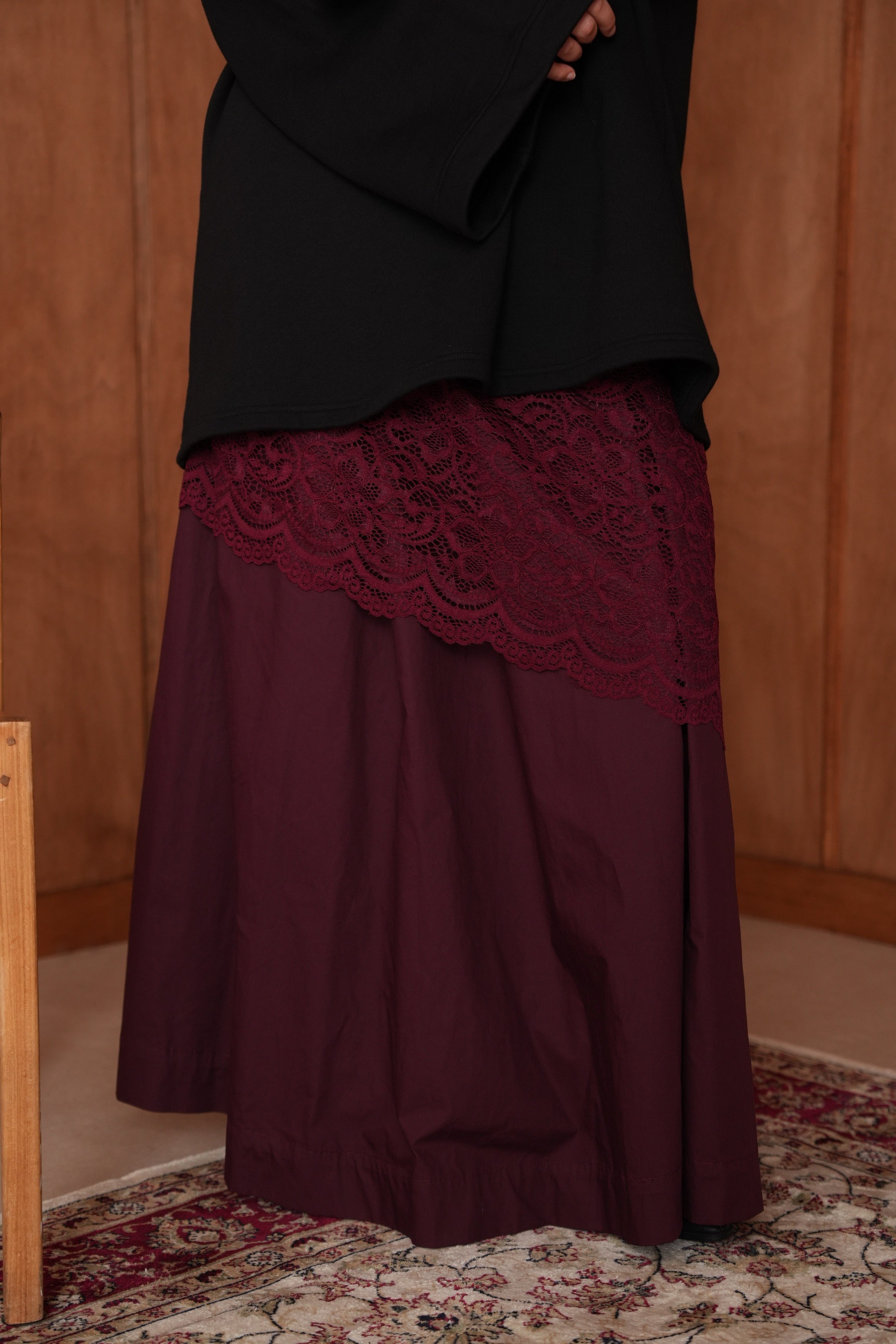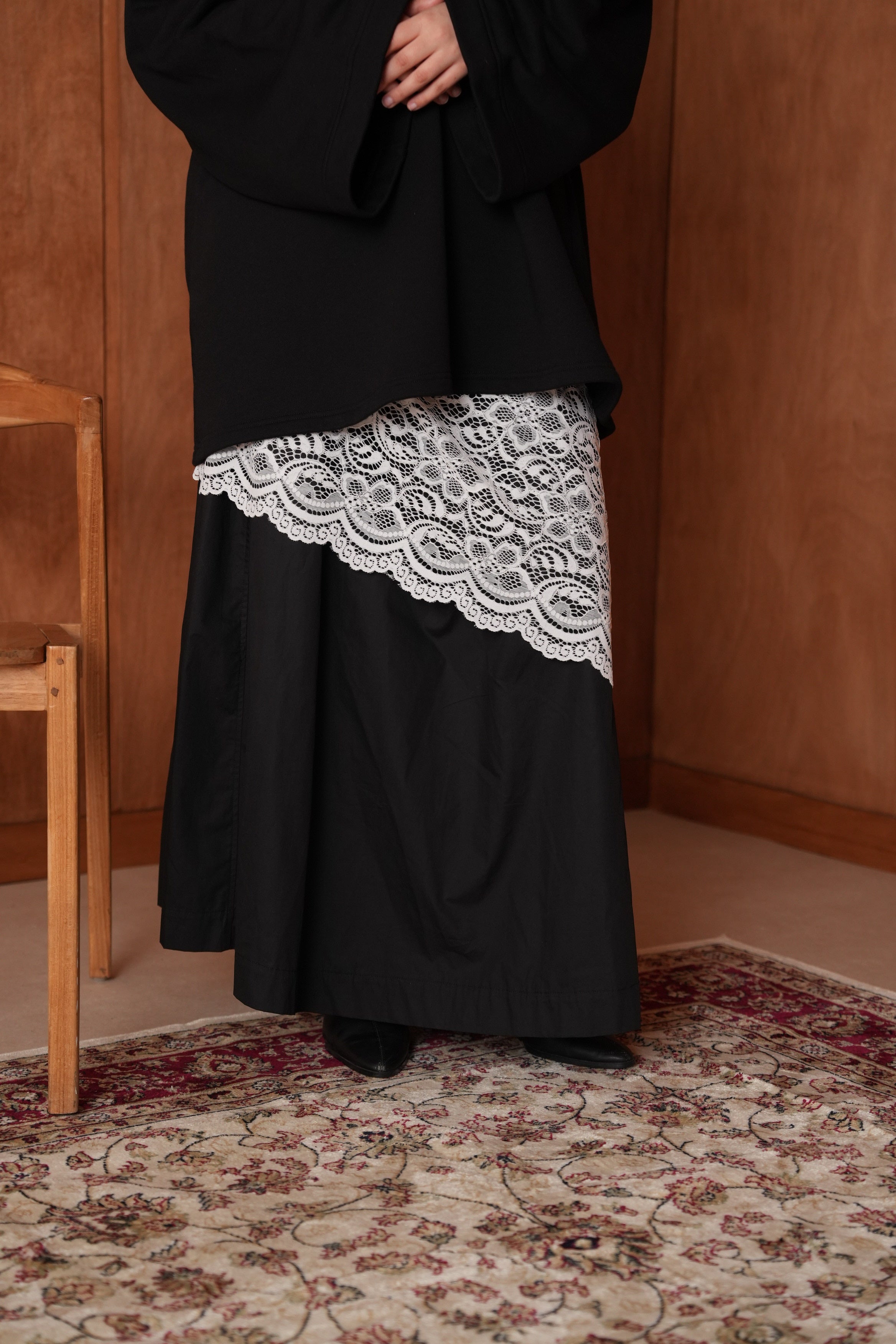 Une jupe fluide rehaussée d’une dentelle asymétrique qui fait toute la différence.