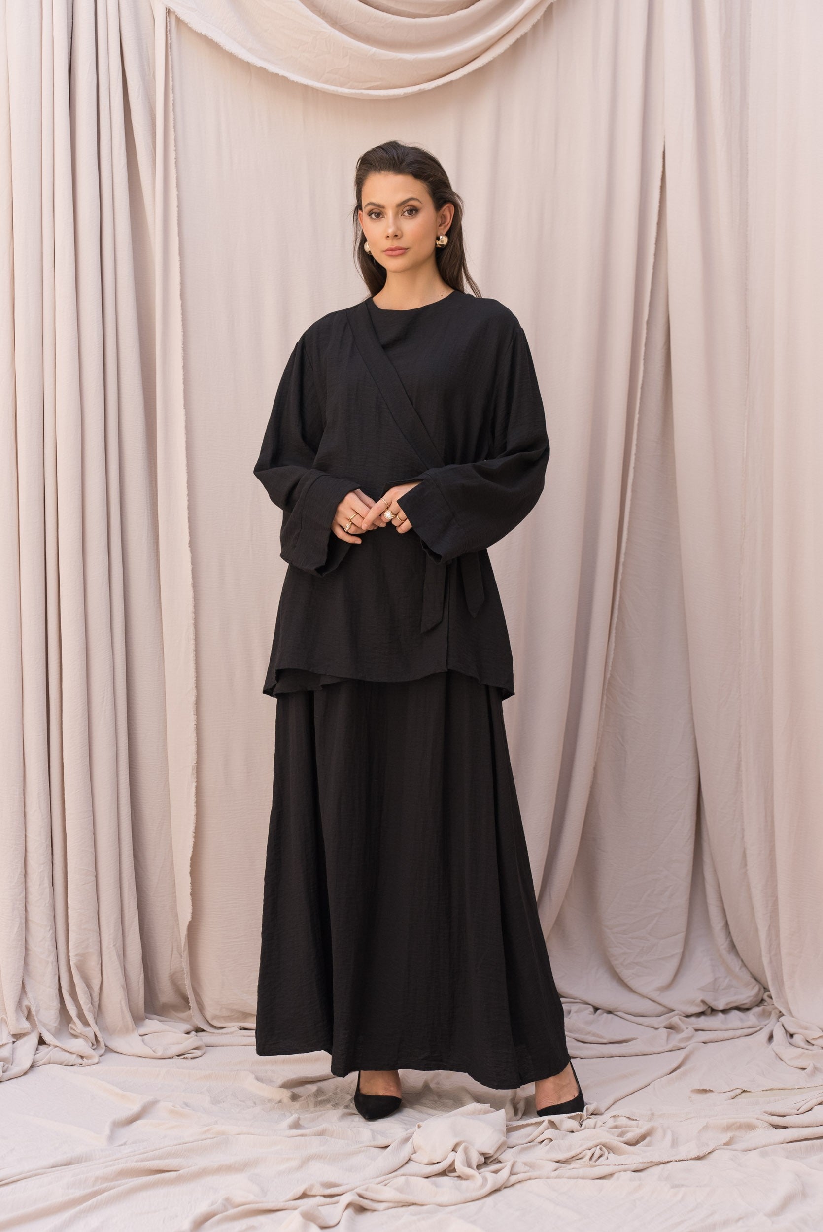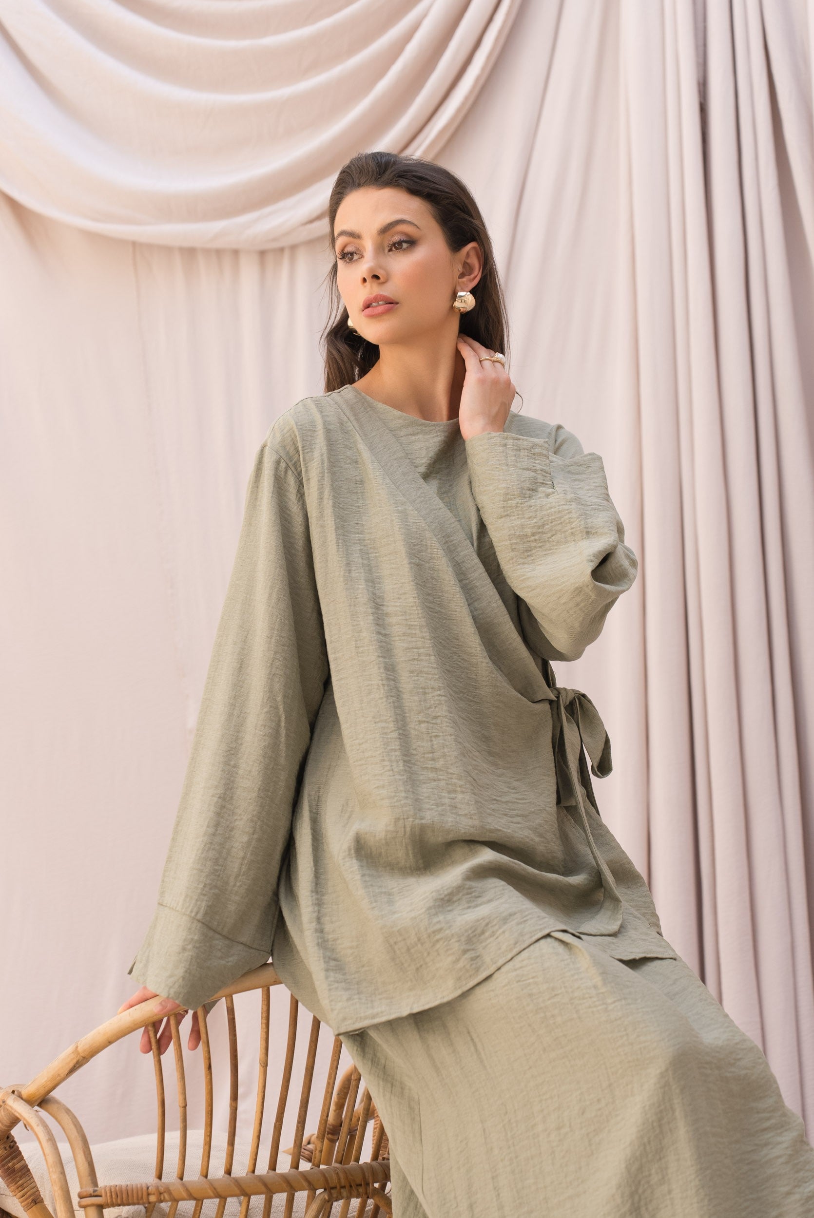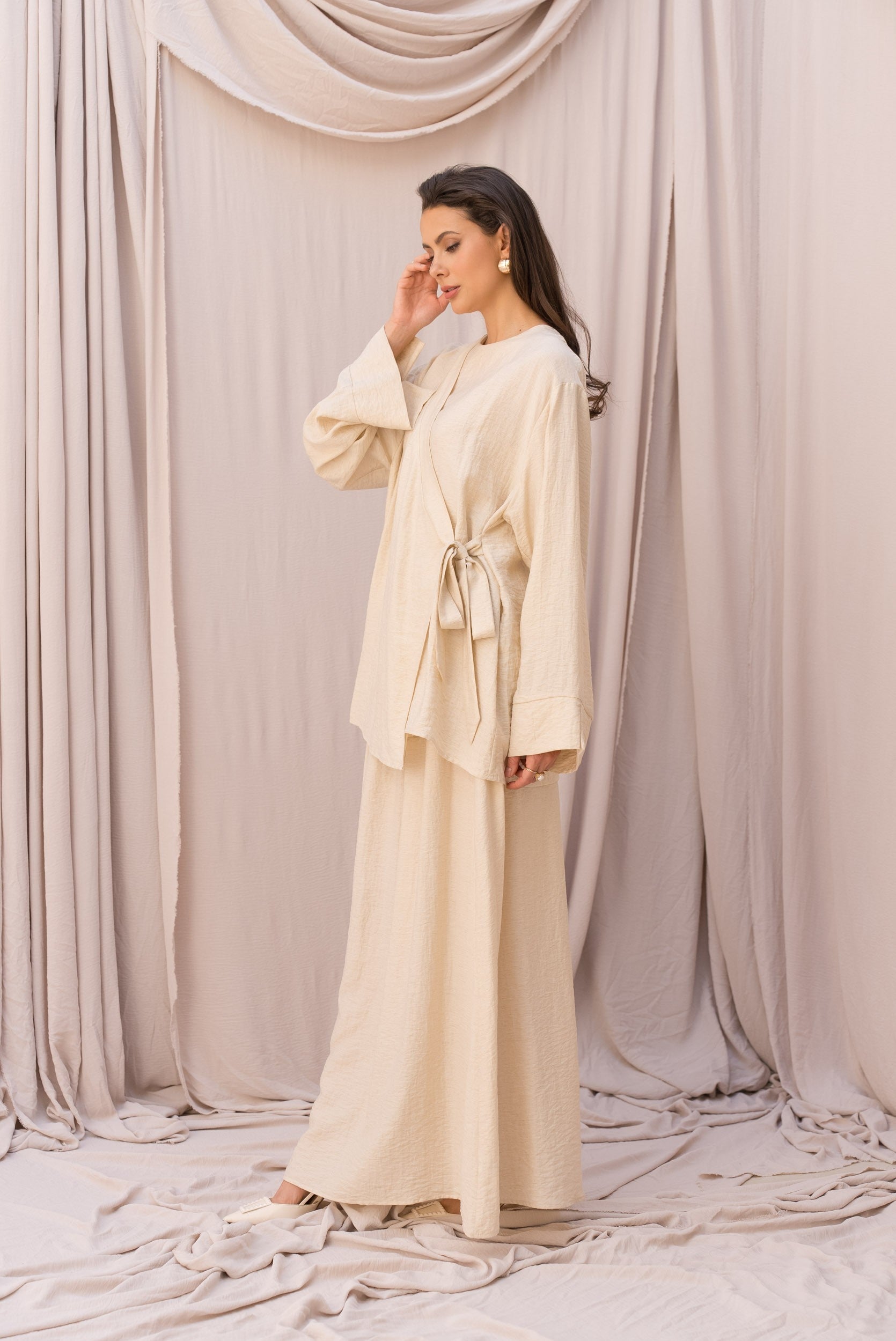 L'ensemble Laissa en lin se distingue par son haut style kimono, alliant confort et élégance. Parfait pour toutes les saisons et les occasions décontractées.
