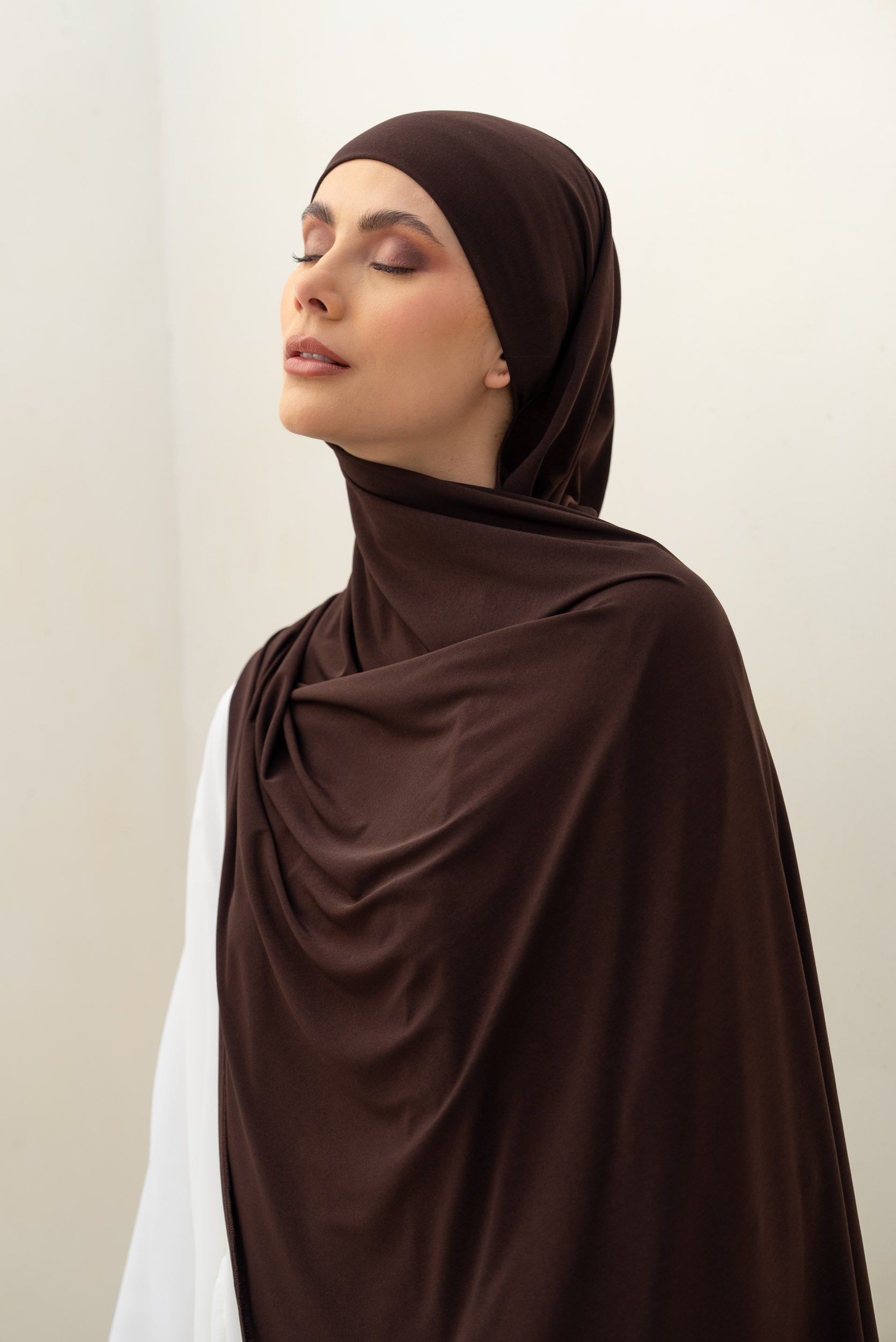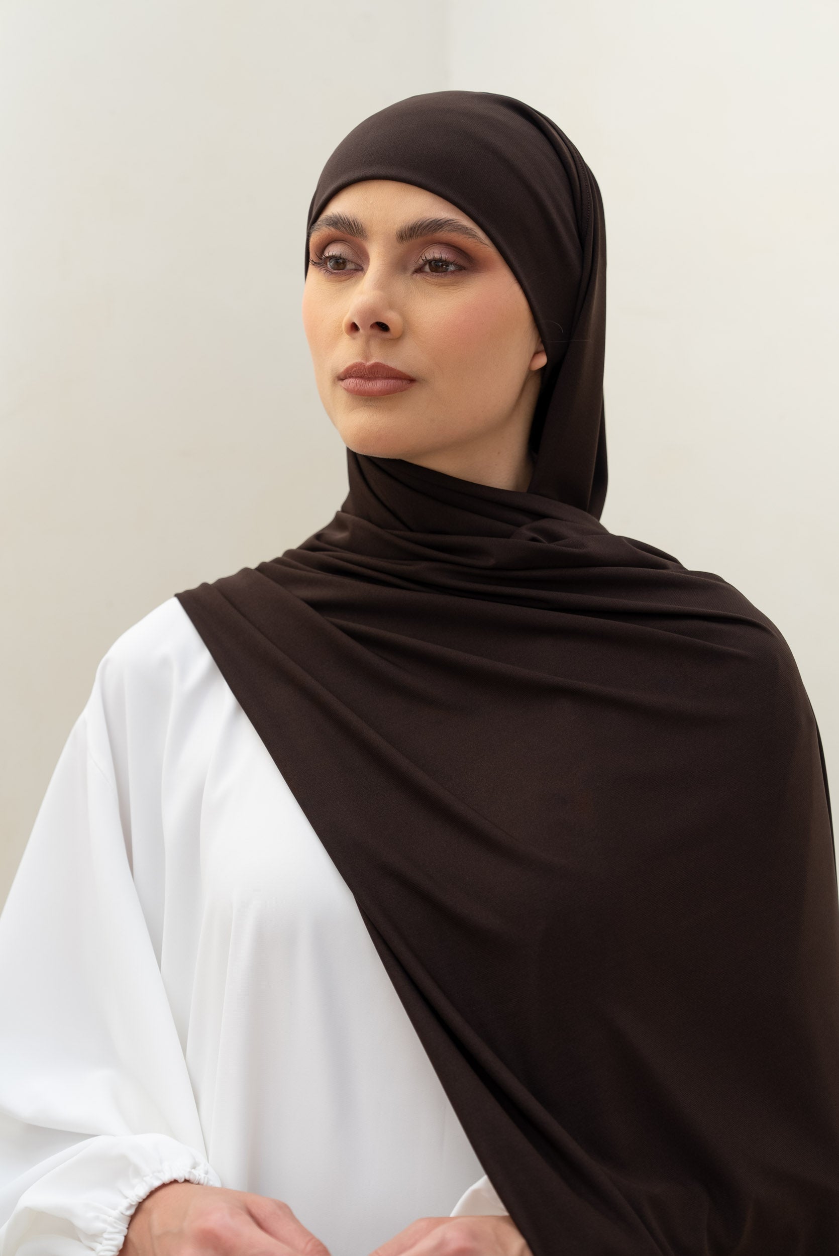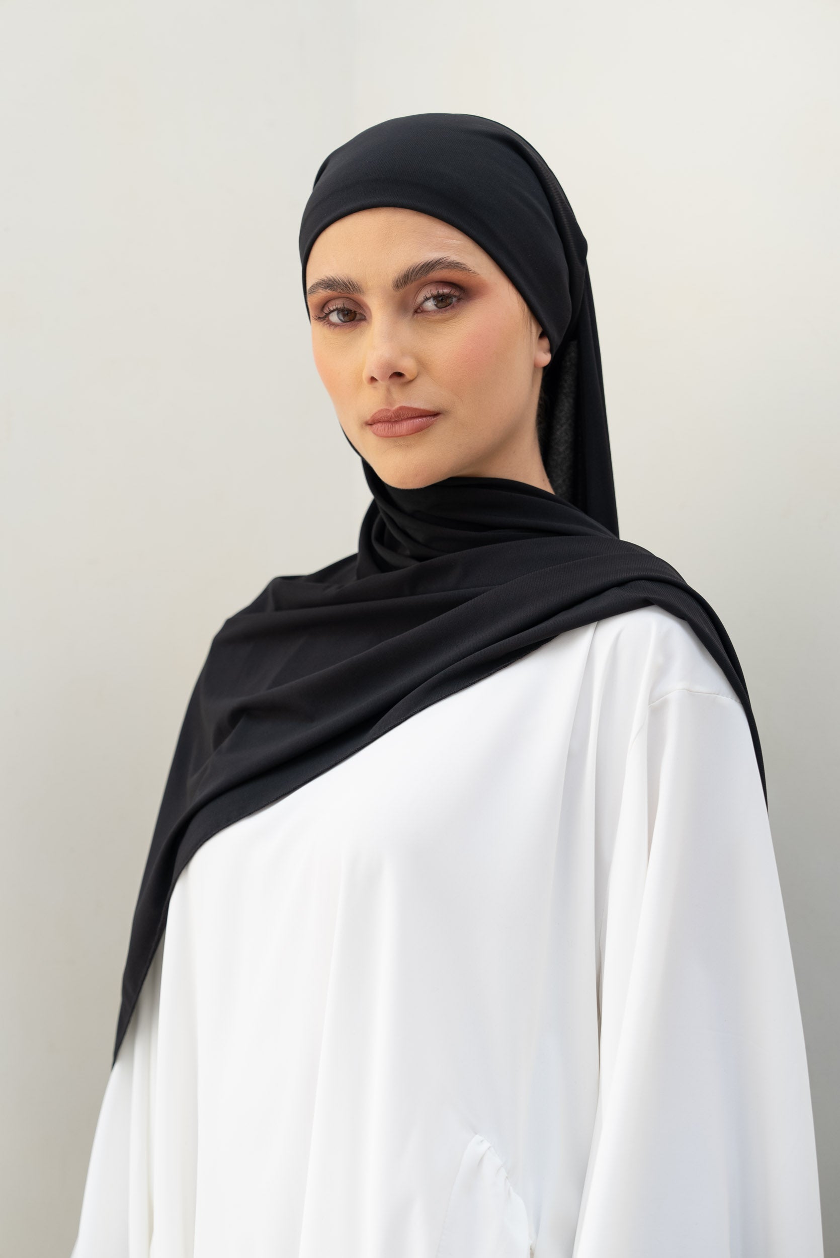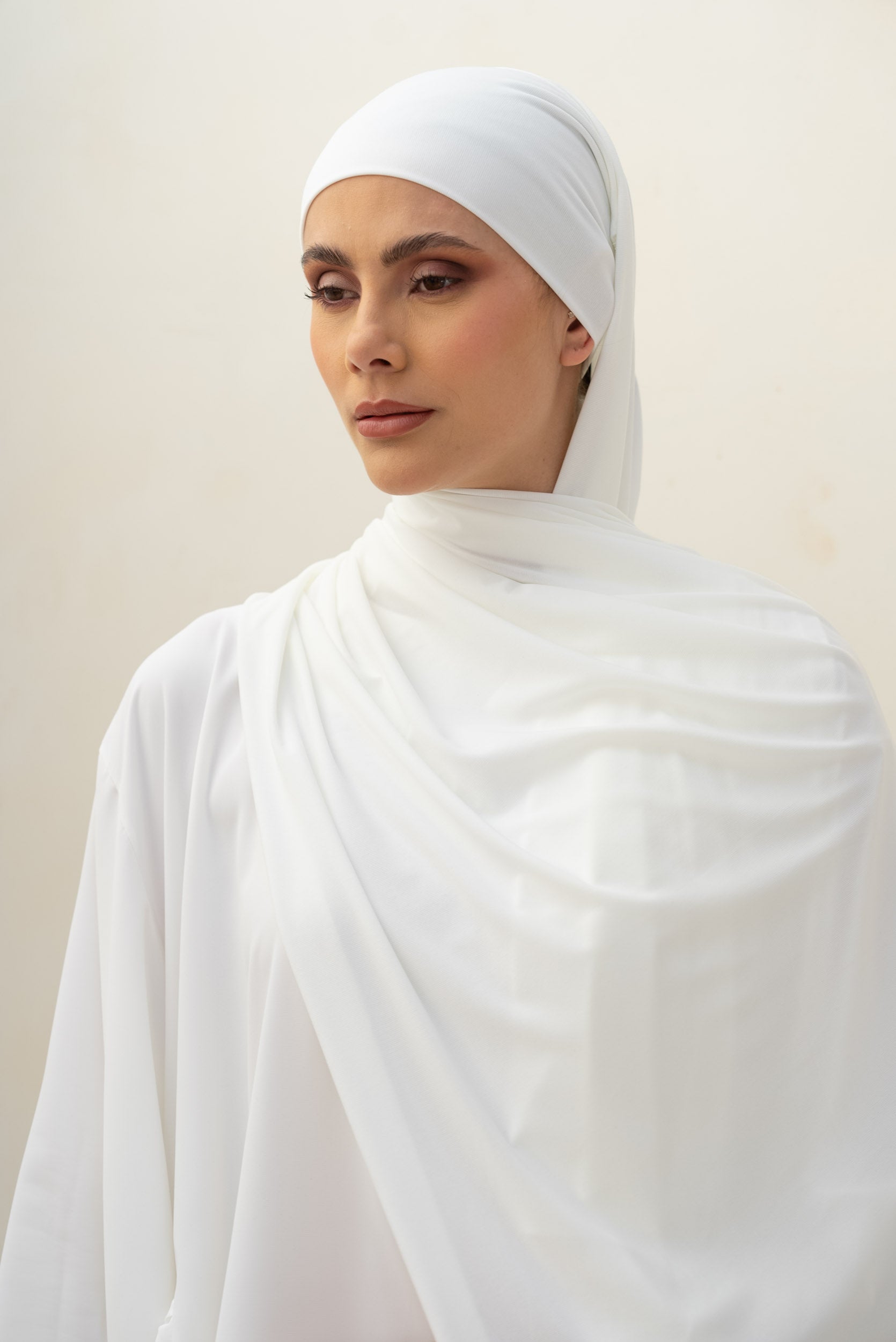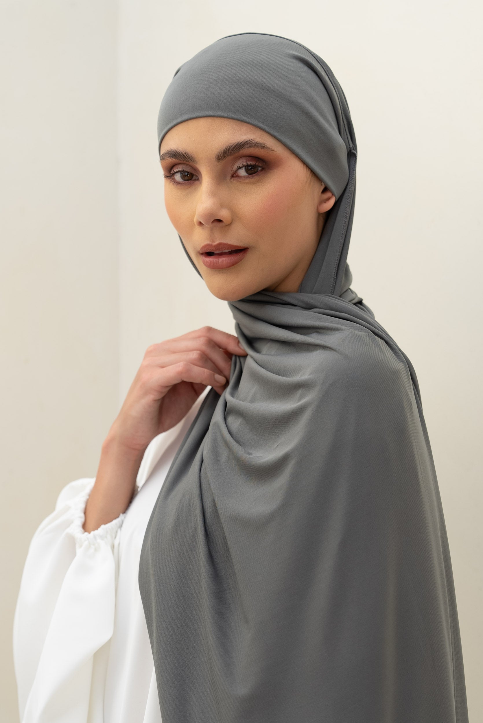 Ce voile en jersey, avec son système d'attache discret, reste en place toute la journée. Il est idéal pour toutes les saisons et s’adapte facilement à des tenues variées, des abayas aux robes décontractées. Son drapé fluide et sa capacité à s’étirer offrent un look élégant et moderne.
