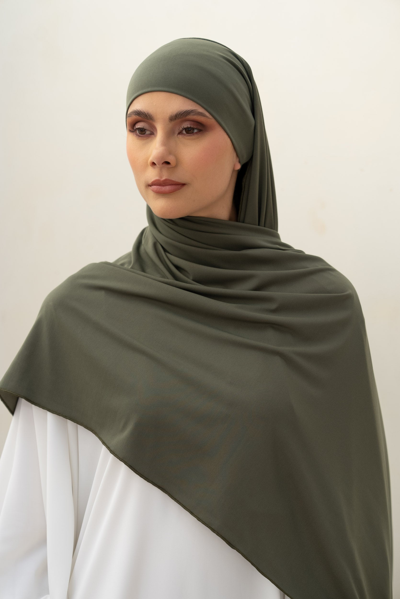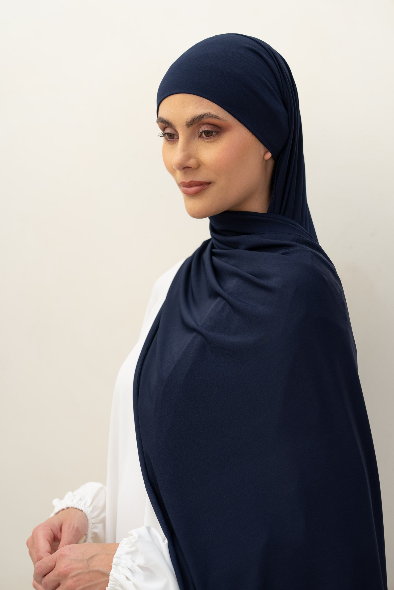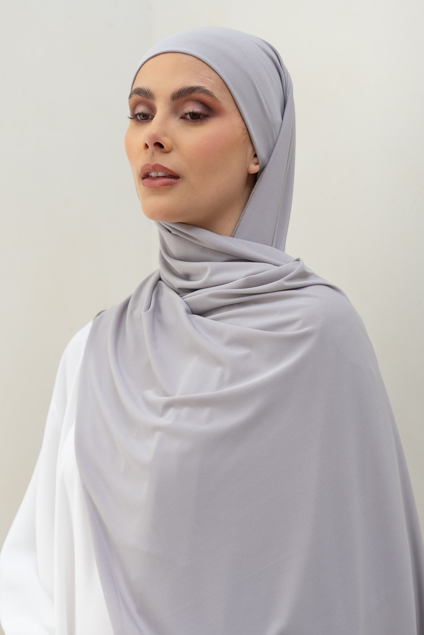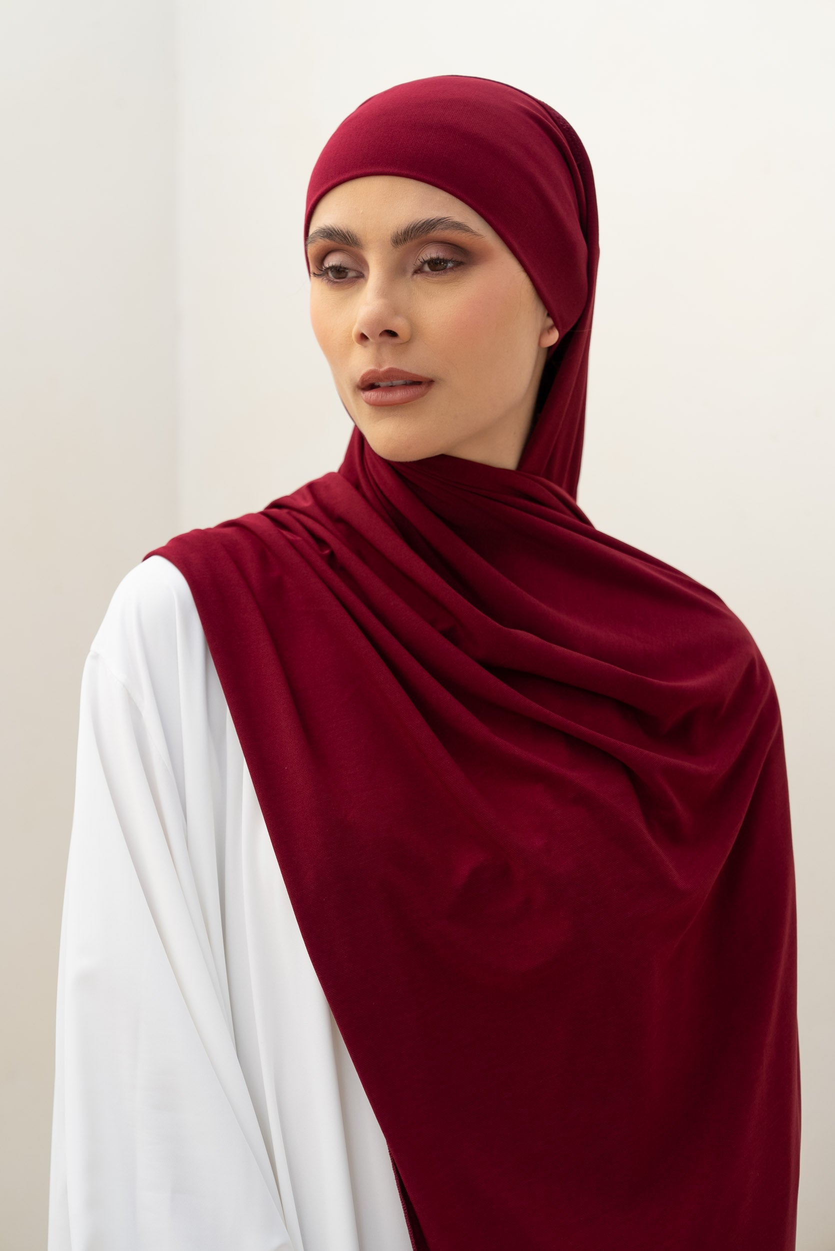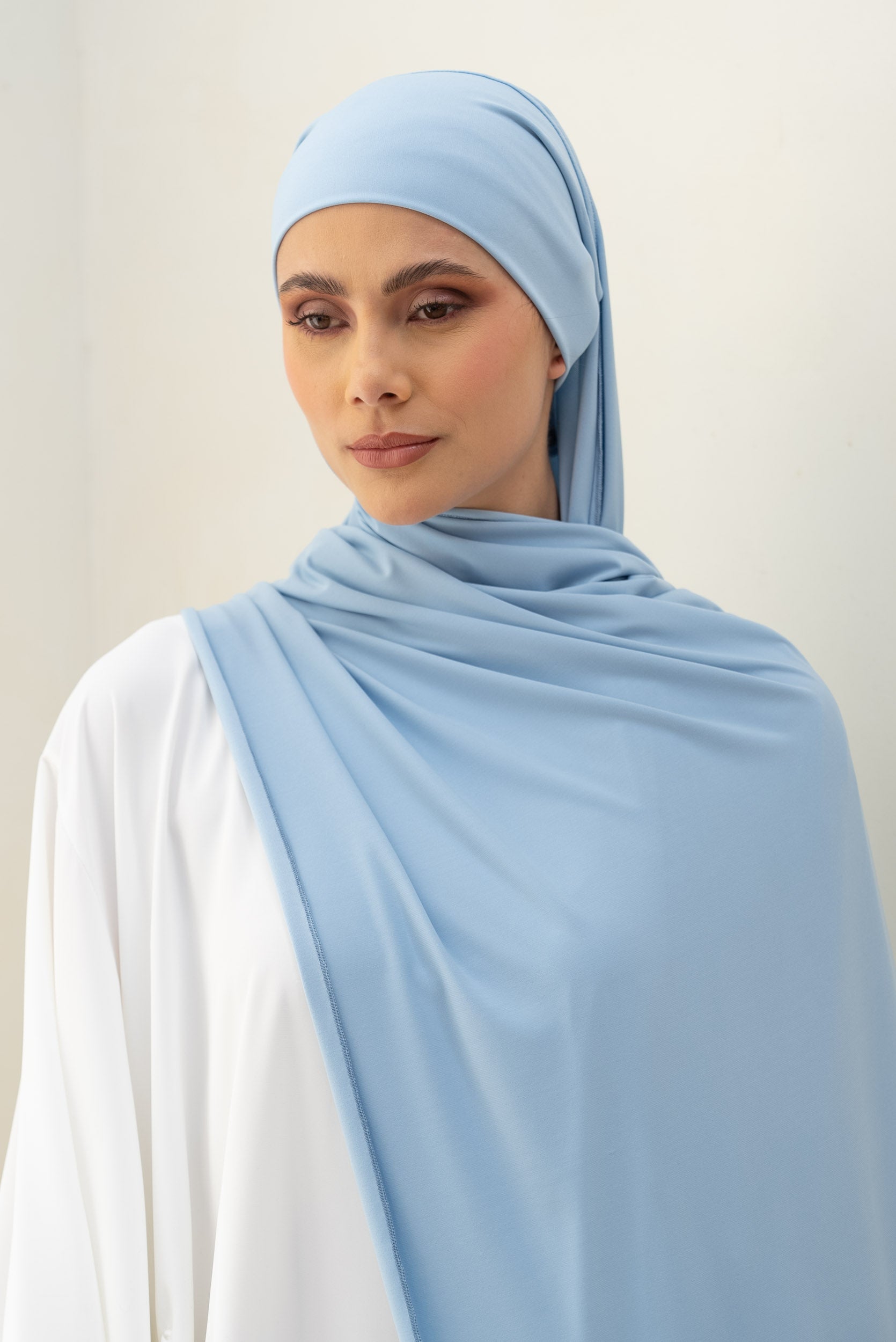 Ce voile en jersey, avec son système d'attache discret, reste en place toute la journée. Il est idéal pour toutes les saisons et s’adapte facilement à des tenues variées, des abayas aux robes décontractées. Son drapé fluide et sa capacité à s’étirer offrent un look élégant et moderne.