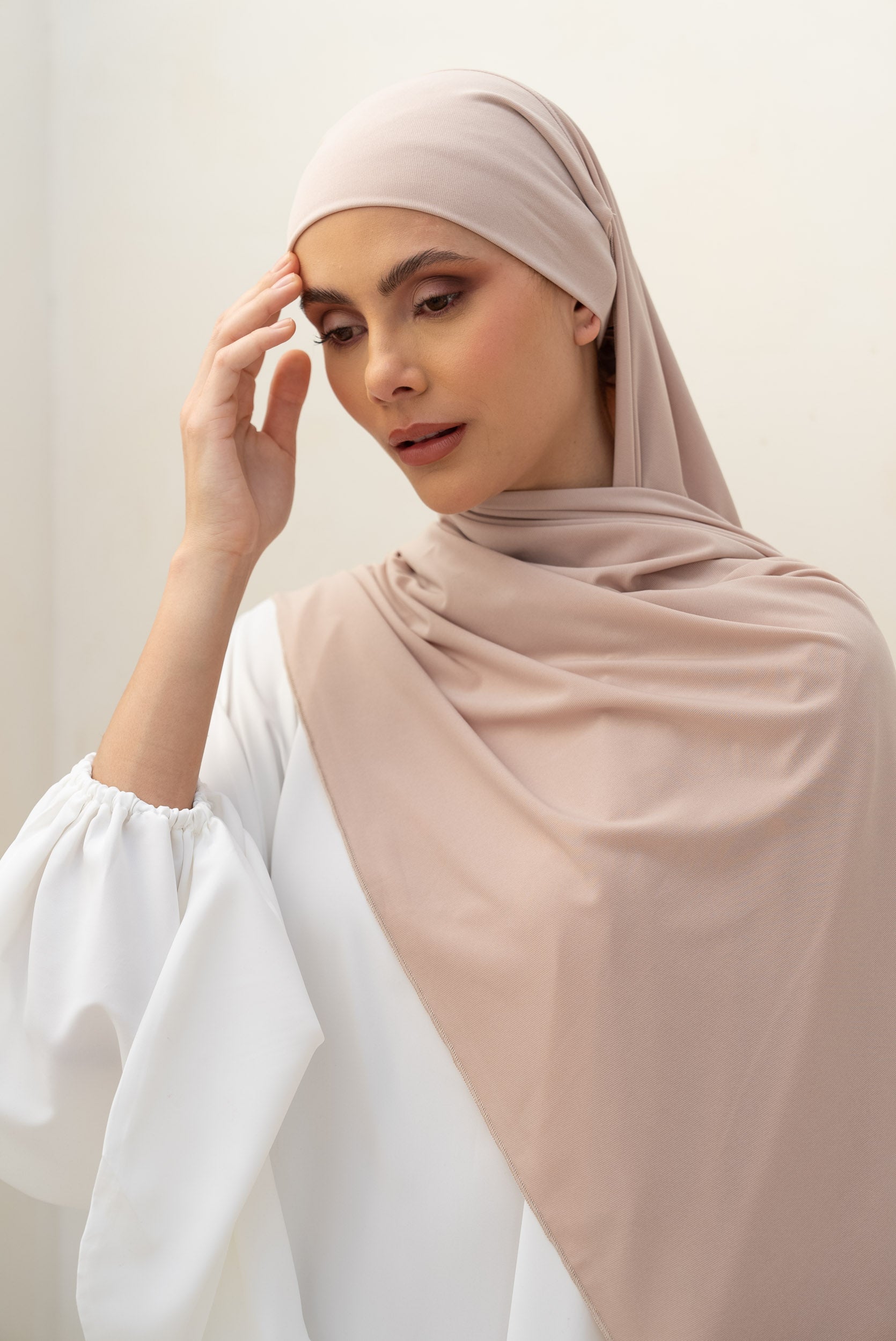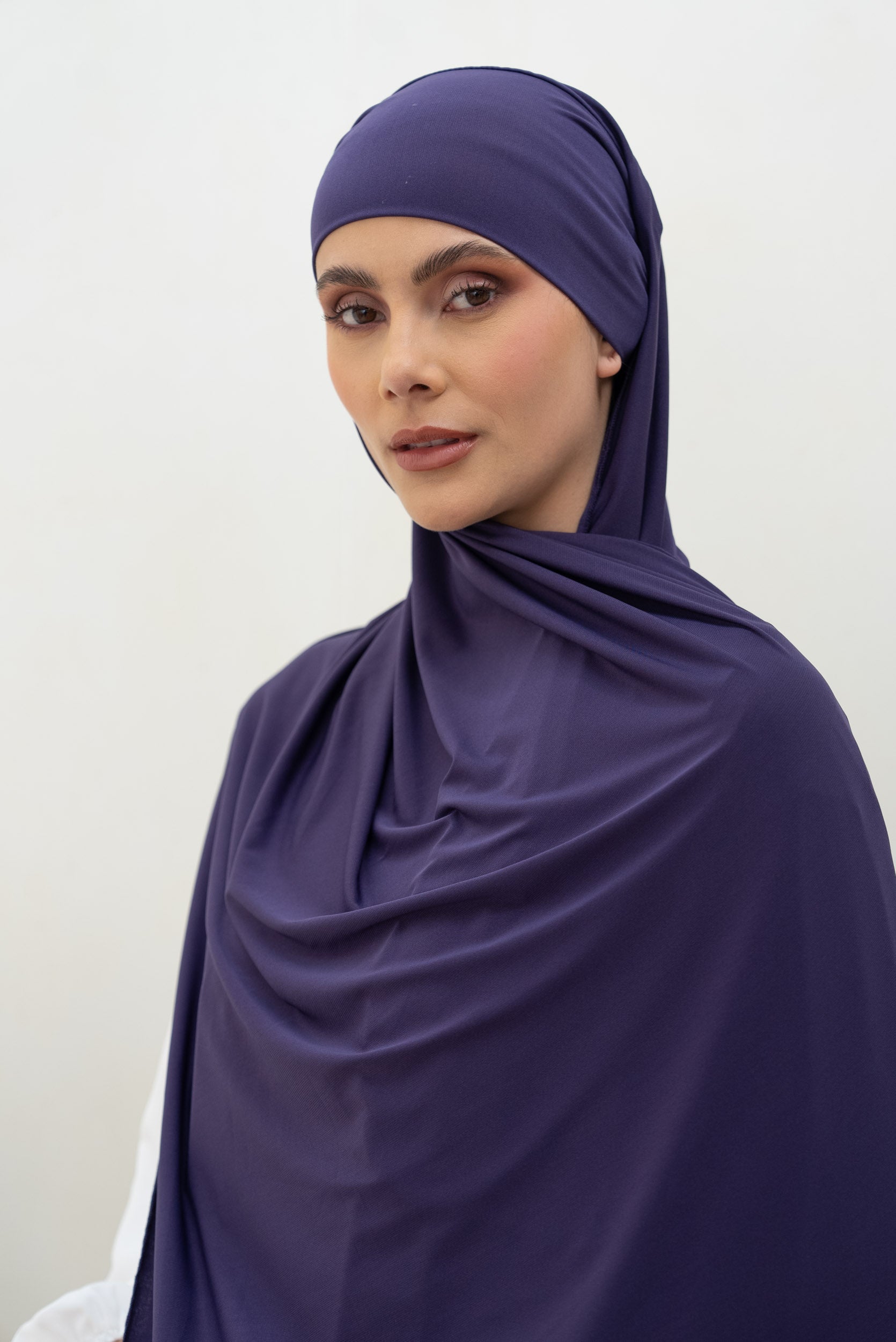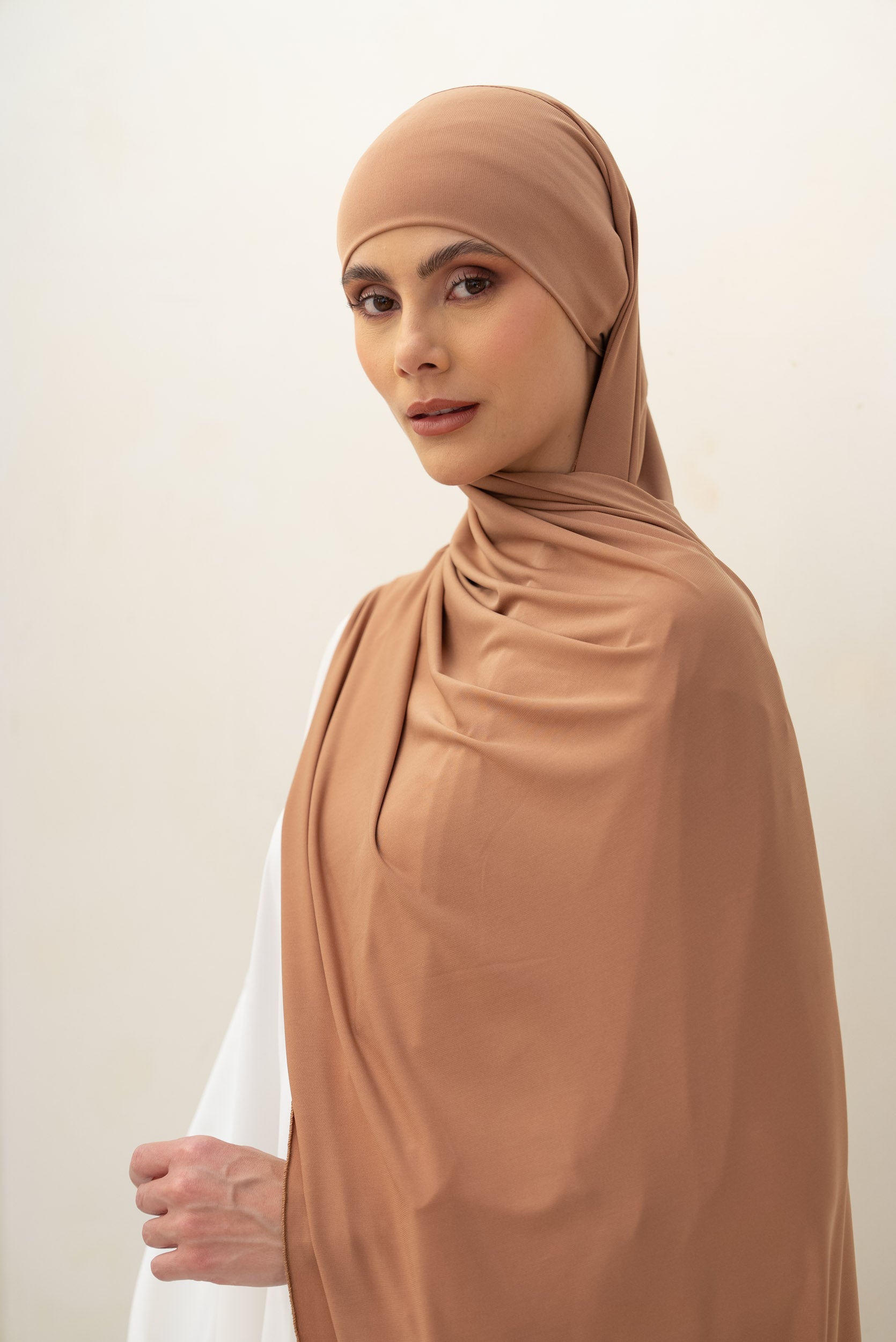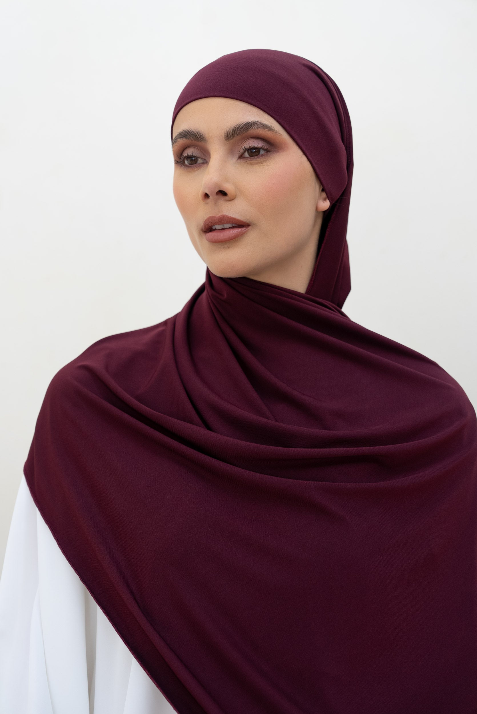 Ce voile en jersey, avec son système d'attache discret, reste en place toute la journée. Il est idéal pour toutes les saisons et s’adapte facilement à des tenues variées, des abayas aux robes décontractées. Son drapé fluide et sa capacité à s’étirer offrent un look élégant et moderne.