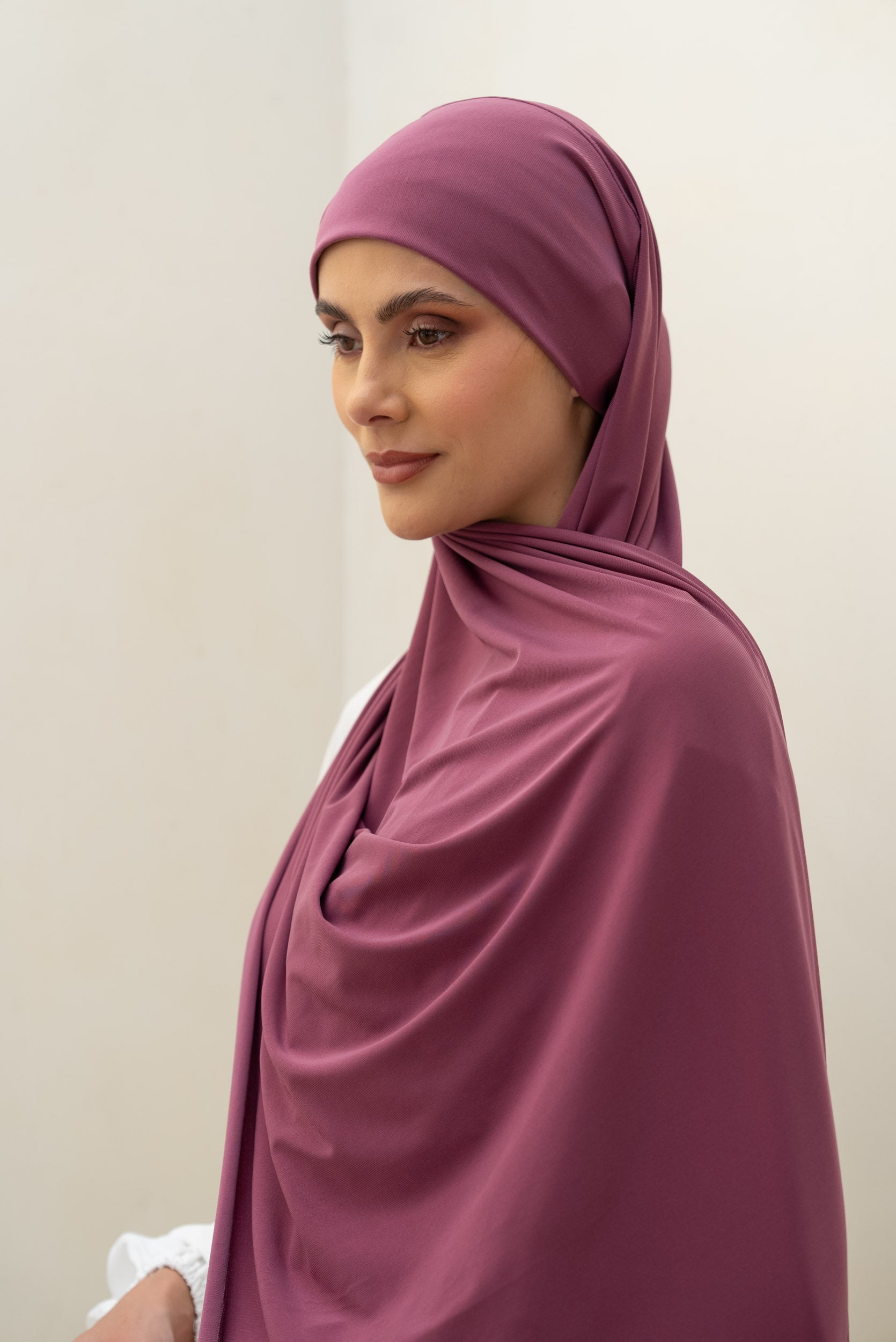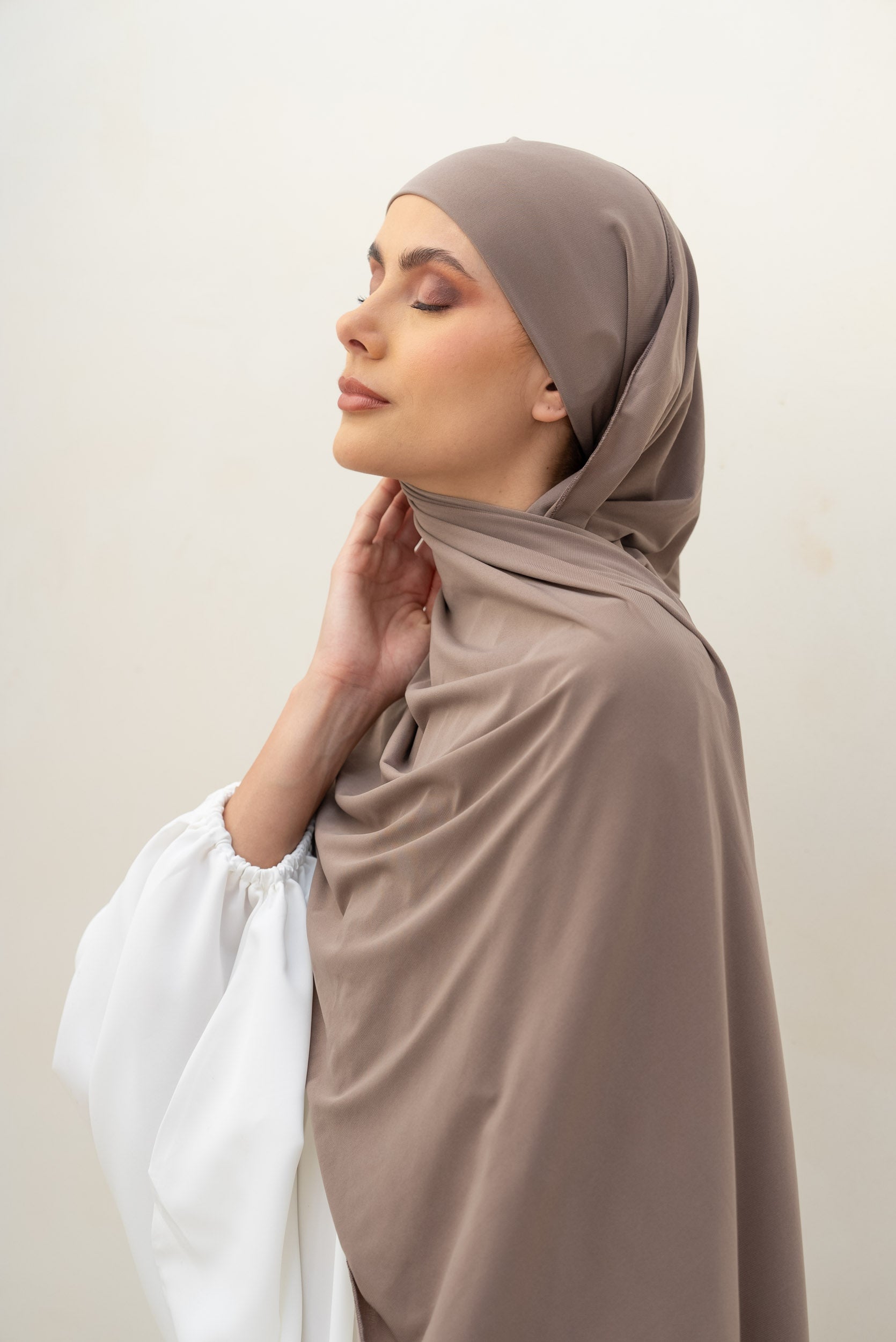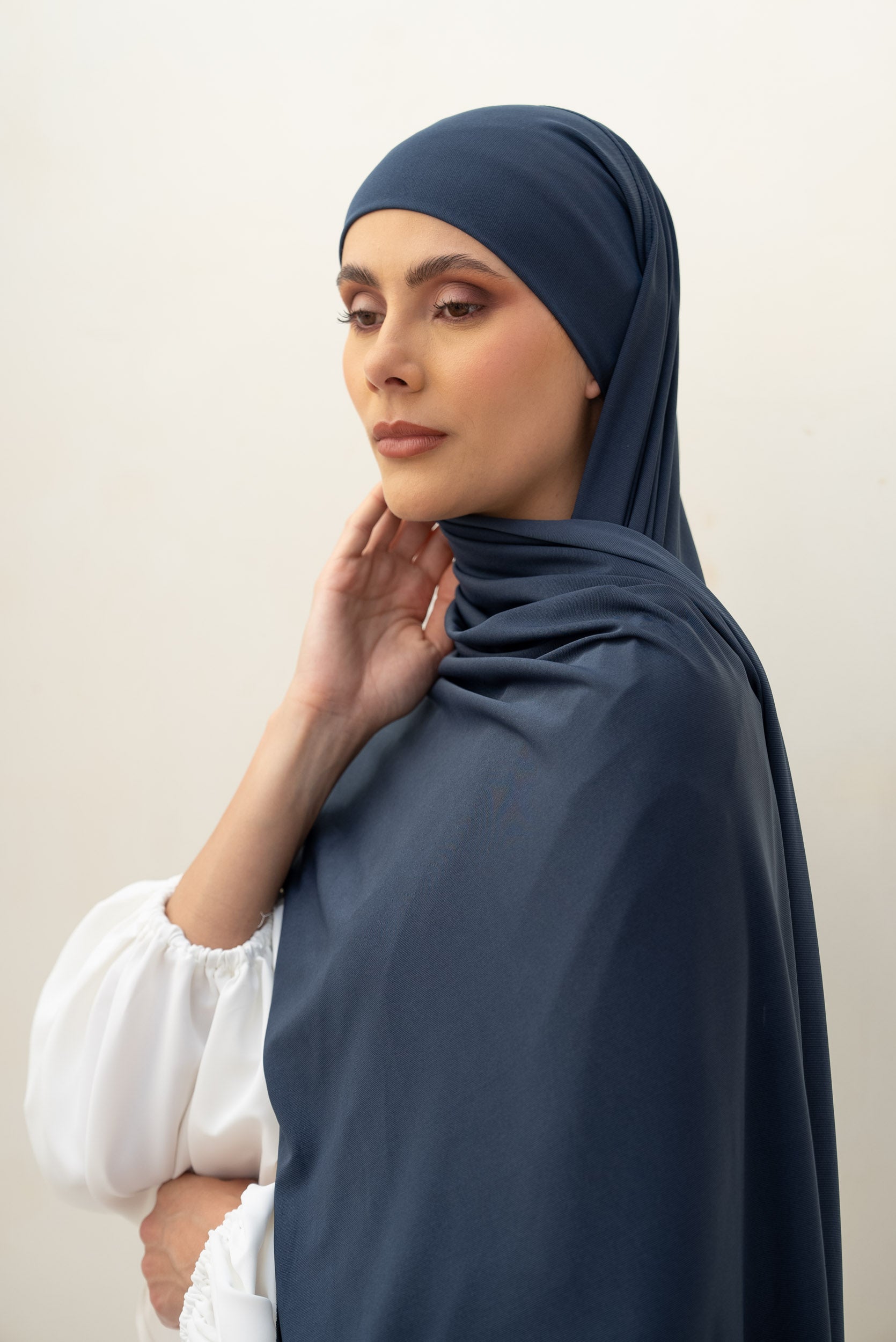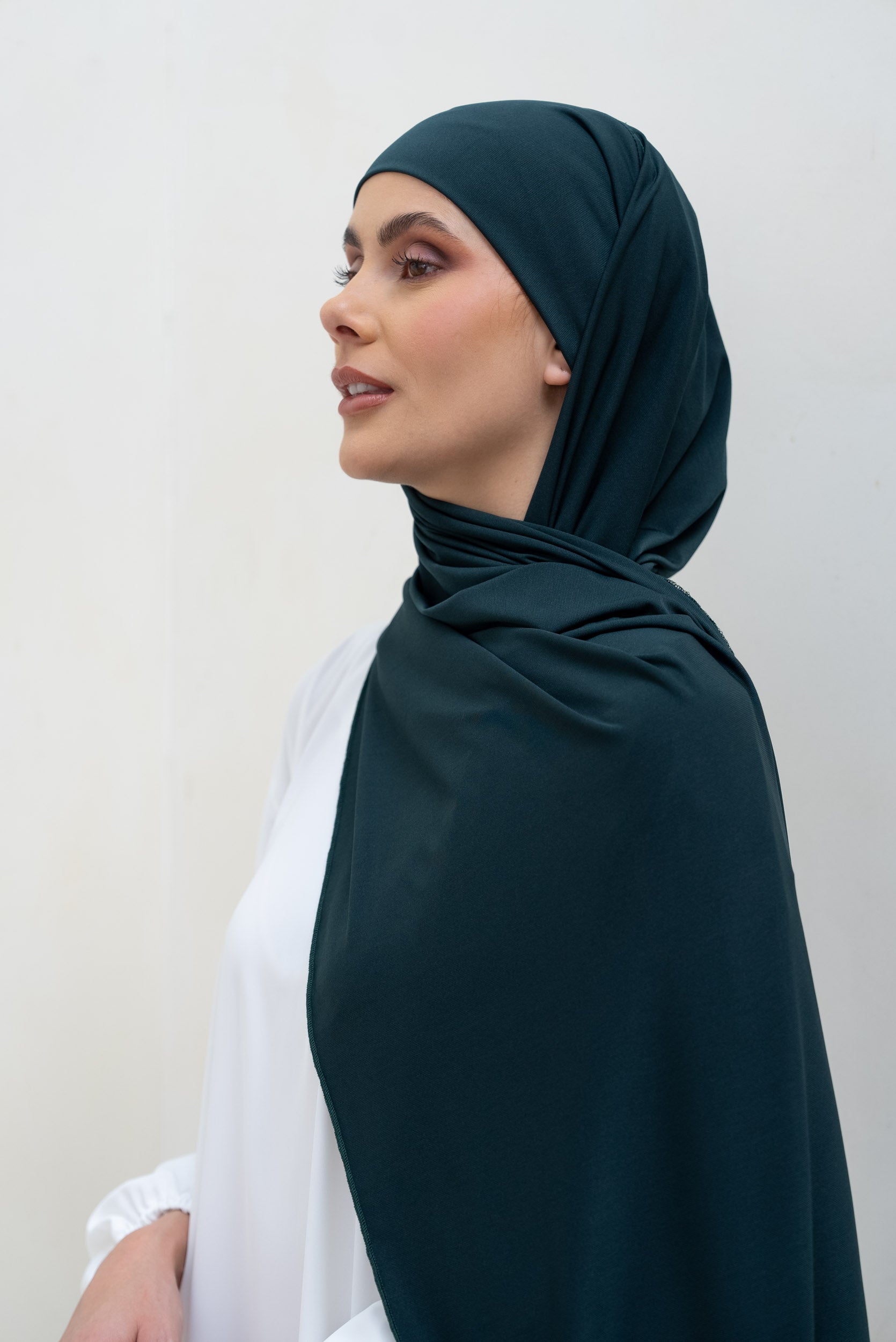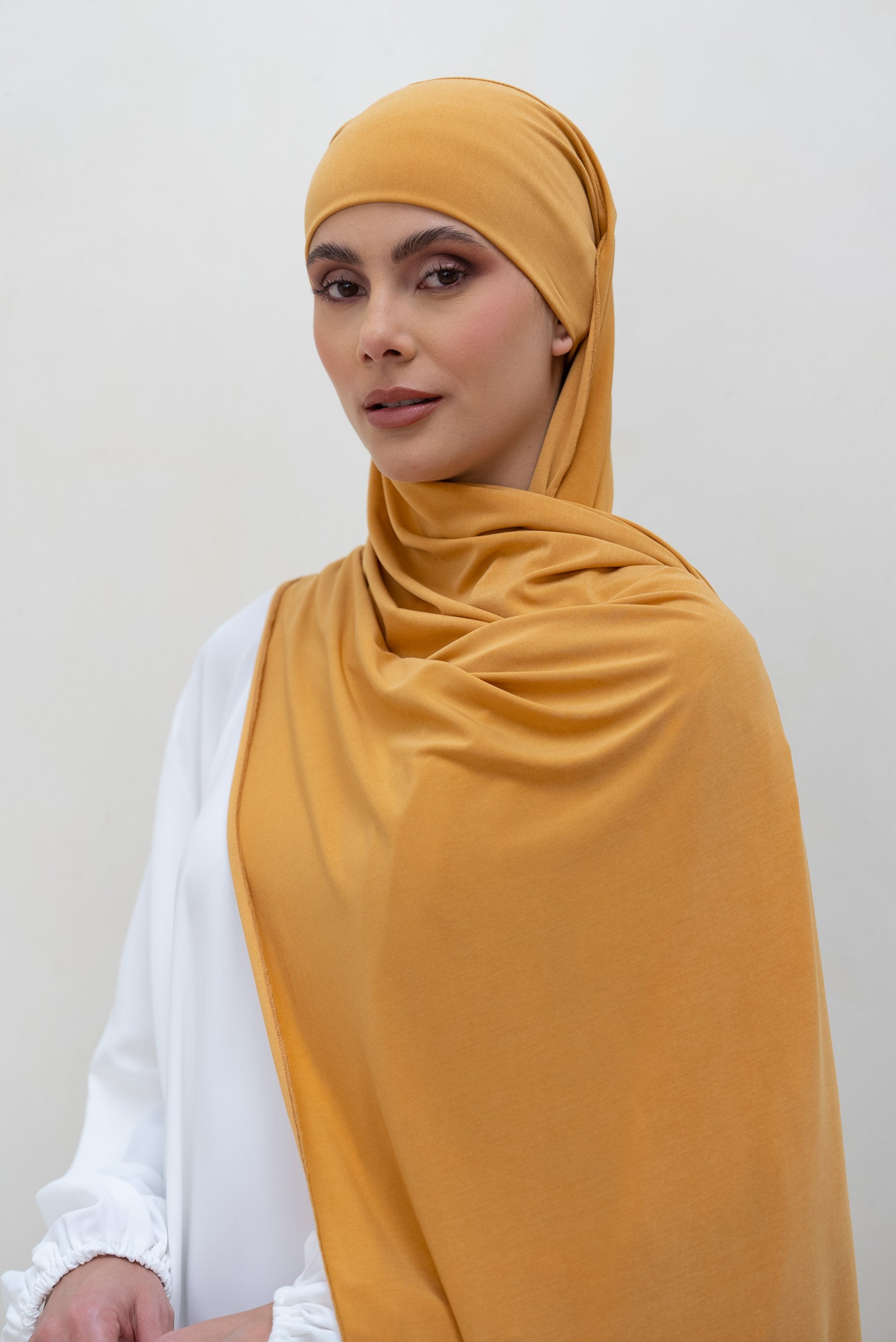 Ce voile en jersey, avec son système d'attache discret, reste en place toute la journée. Il est idéal pour toutes les saisons et s’adapte facilement à des tenues variées, des abayas aux robes décontractées. Son drapé fluide et sa capacité à s’étirer offrent un look élégant et moderne.