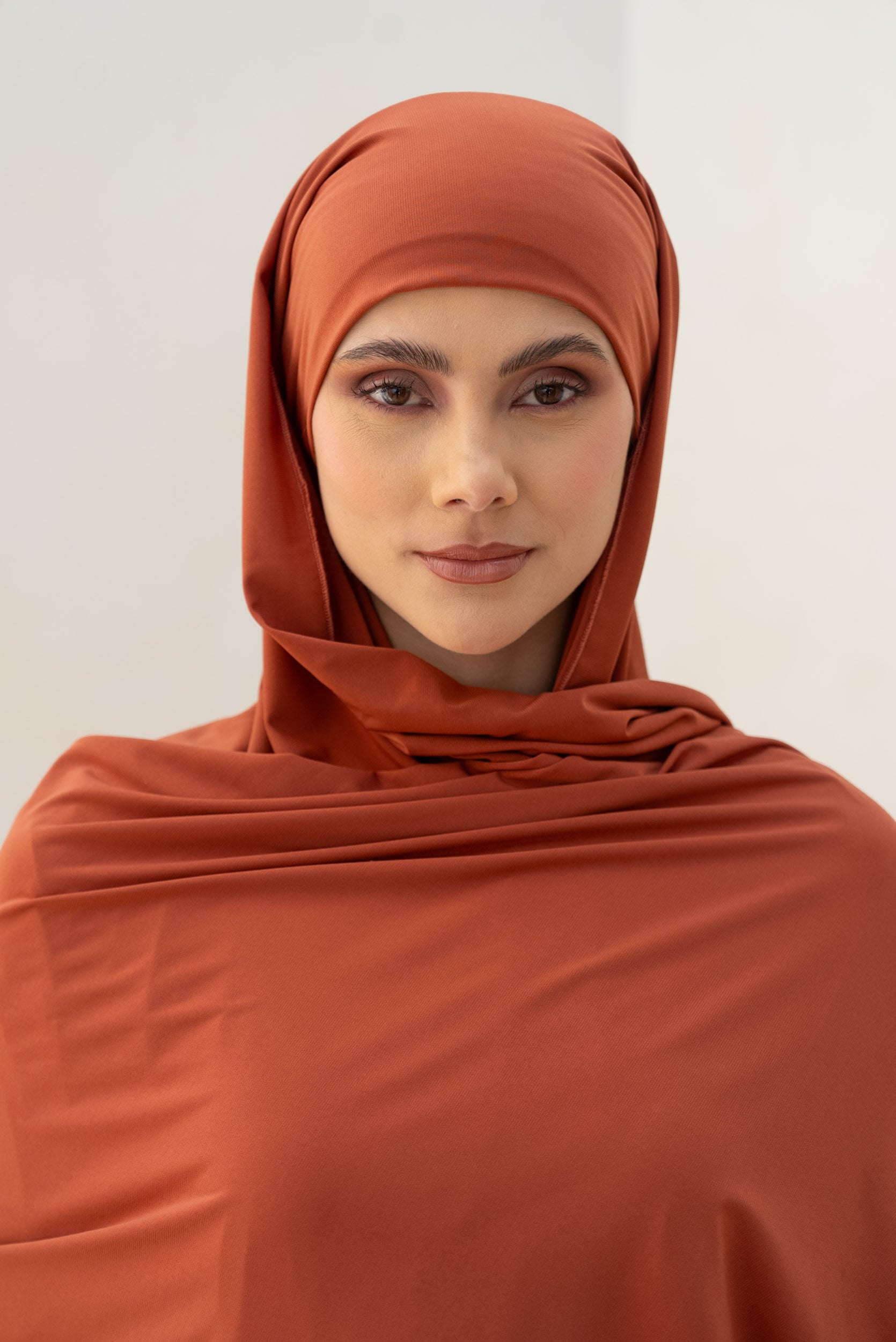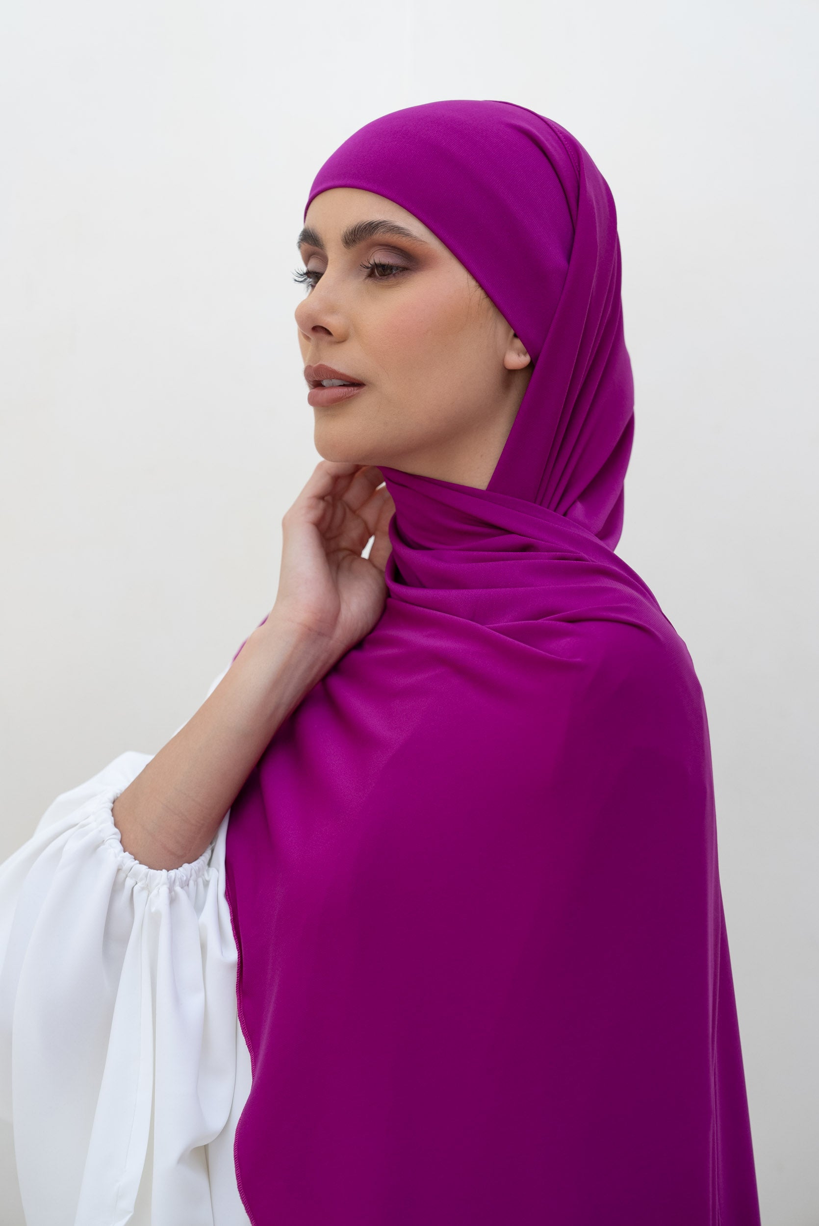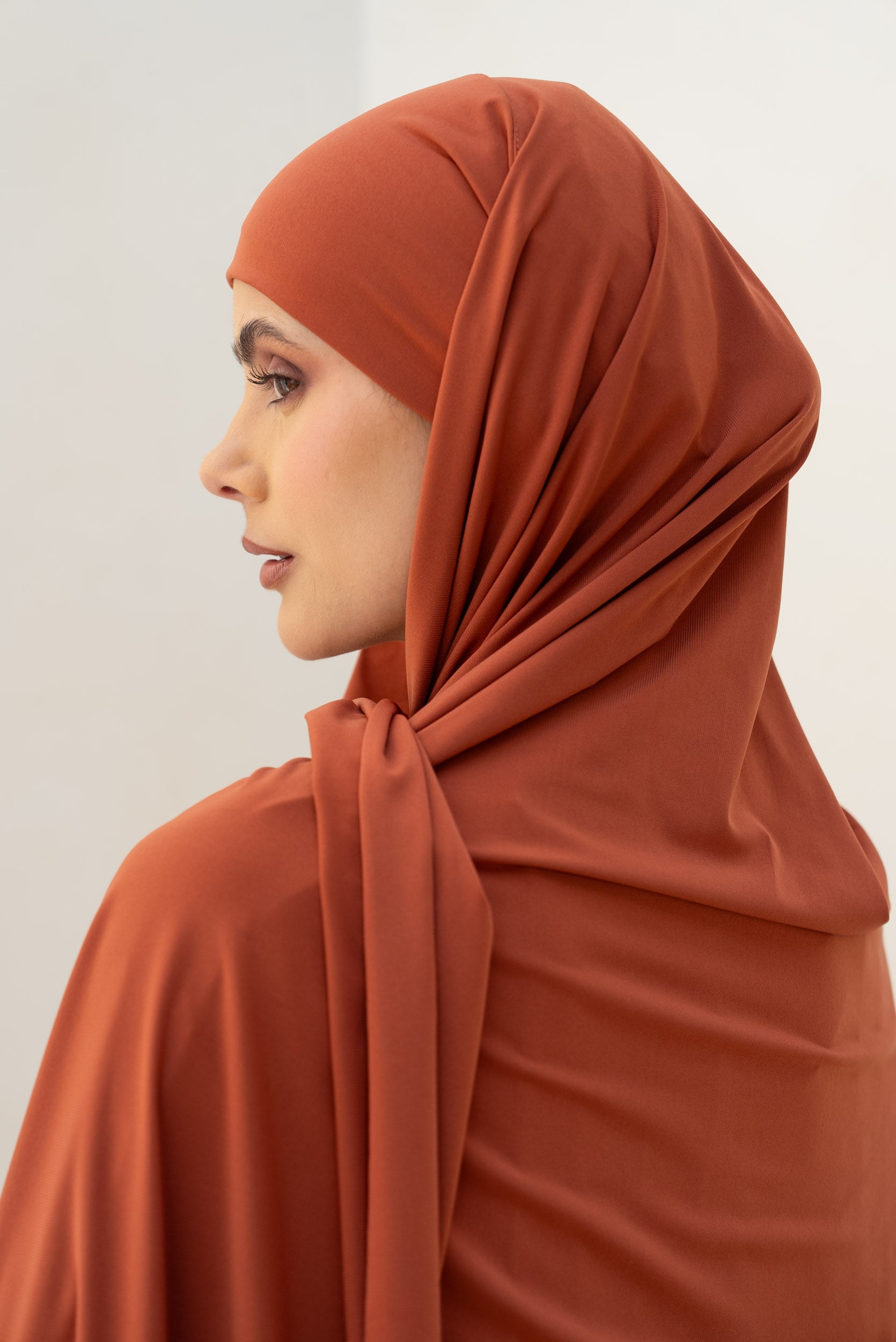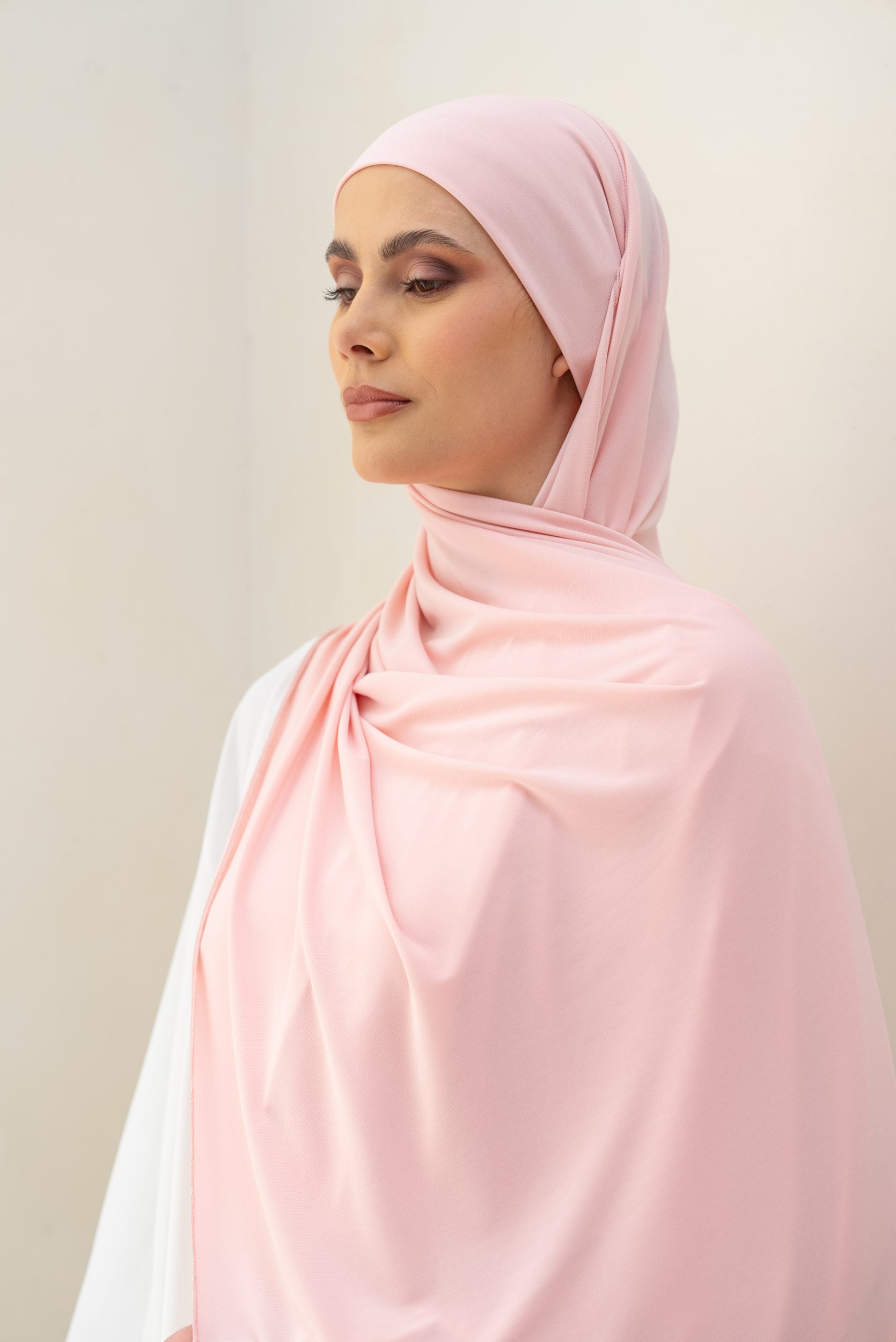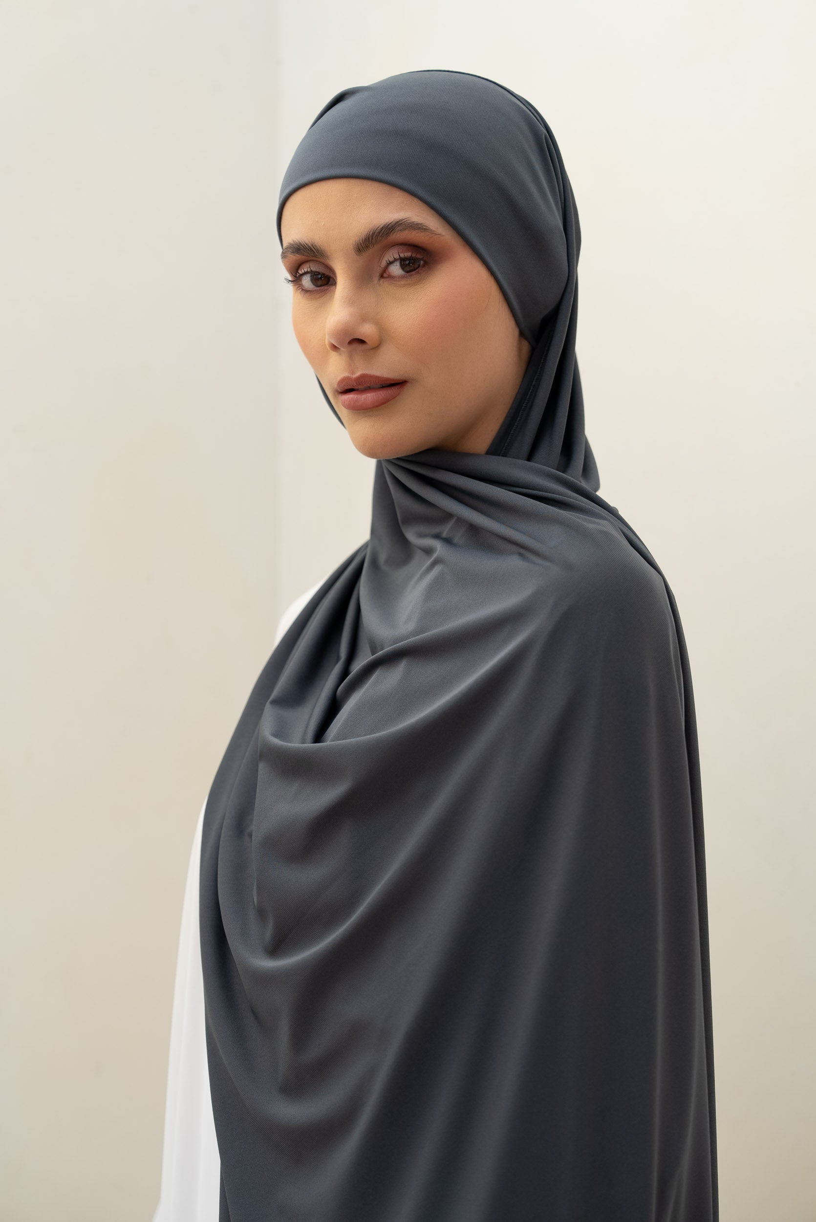 Ce voile en jersey, avec son système d'attache discret, reste en place toute la journée. Il est idéal pour toutes les saisons et s’adapte facilement à des tenues variées, des abayas aux robes décontractées. Son drapé fluide et sa capacité à s’étirer offrent un look élégant et moderne.