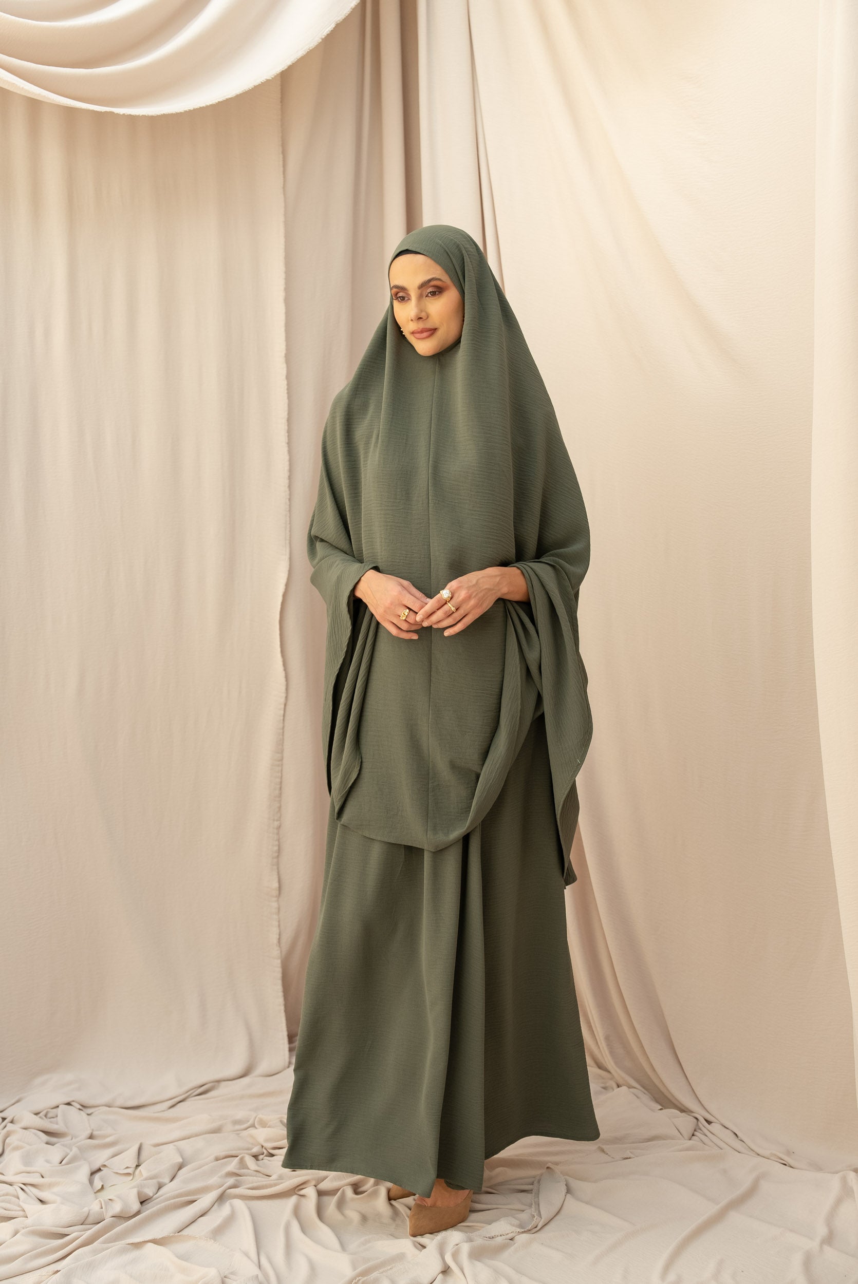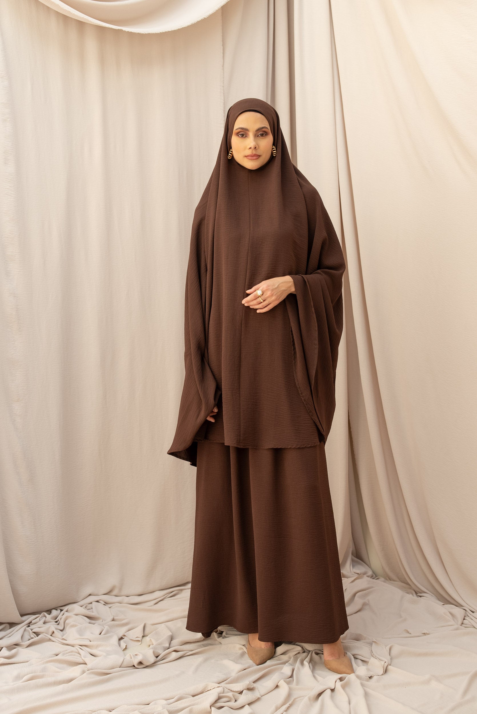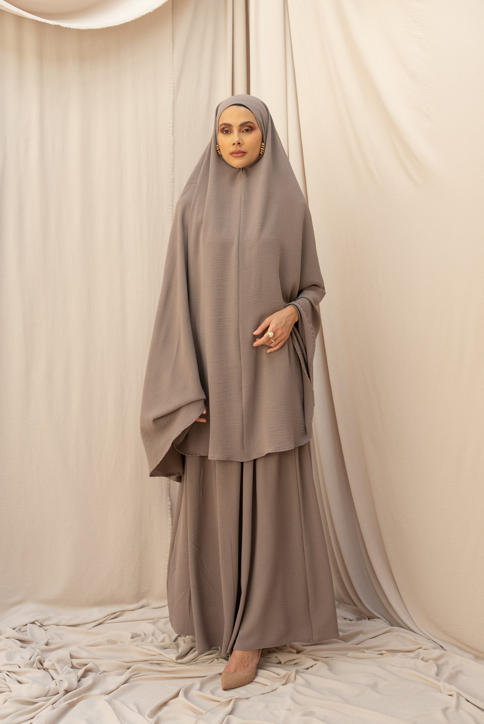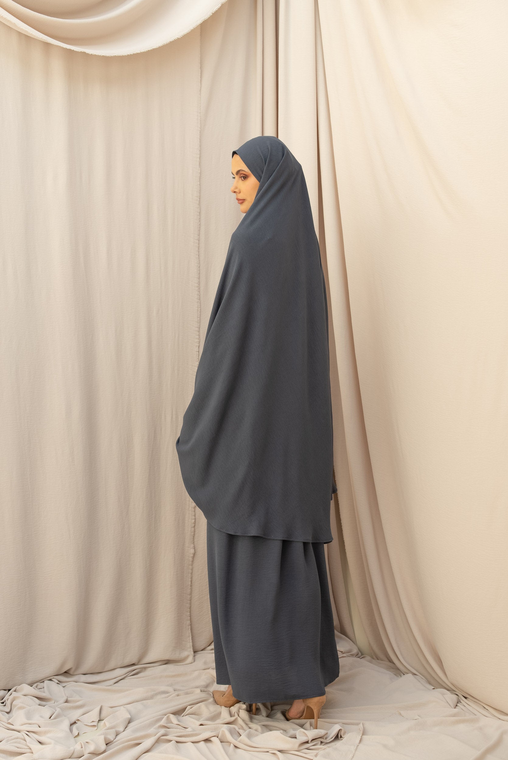Le Jilbab Janne est un ensemble deux pièces composé d’un khimar sans attache à la coupe ronde, et d’une jupe ample en tissu jazz. Ce tissu est apprécié pour sa légèreté. Un modèle pensé pour le quotidien comme pour les occasions