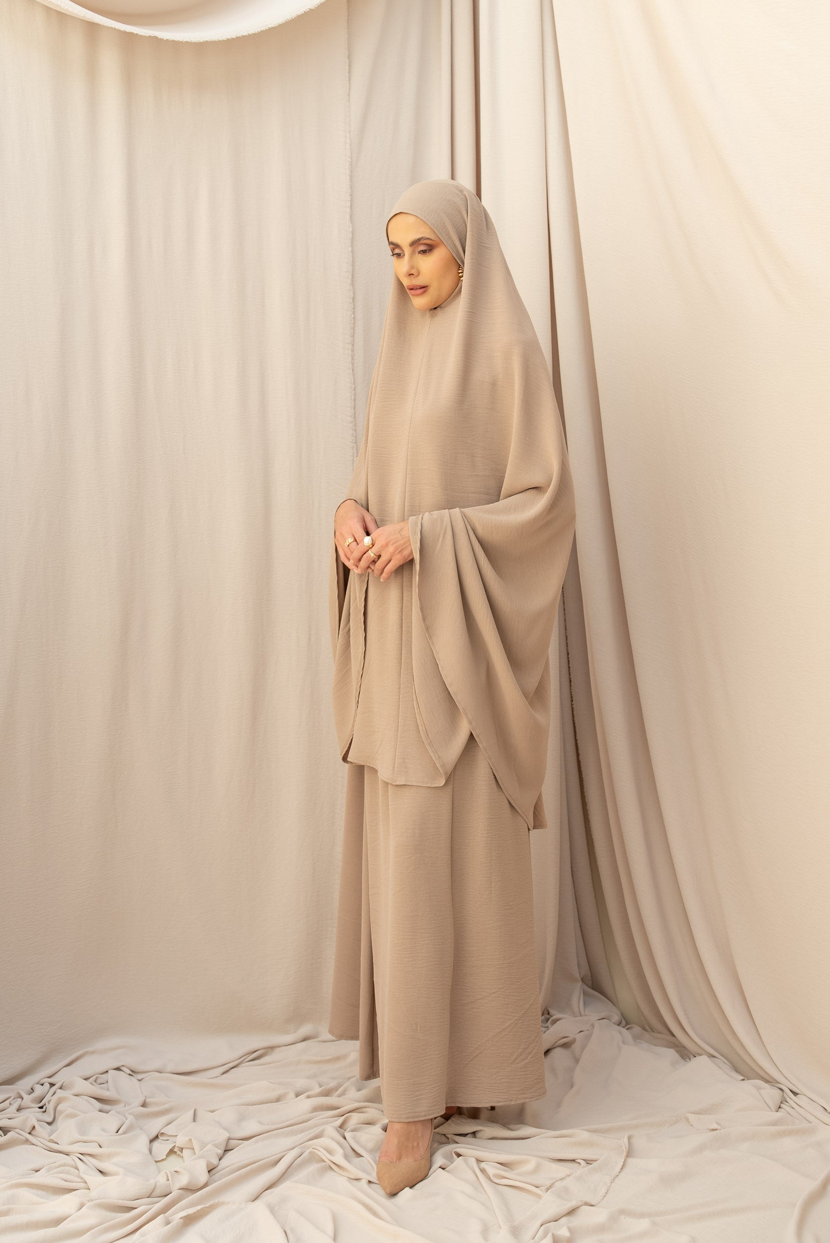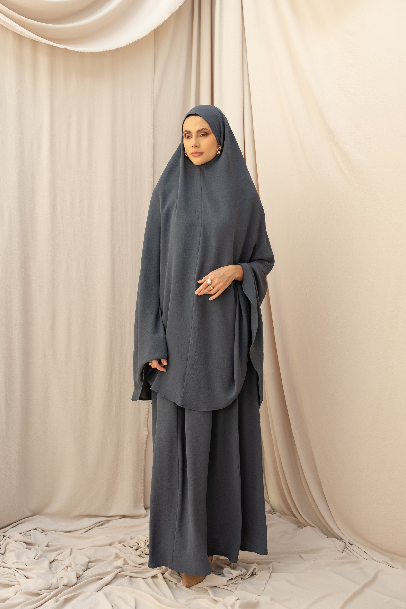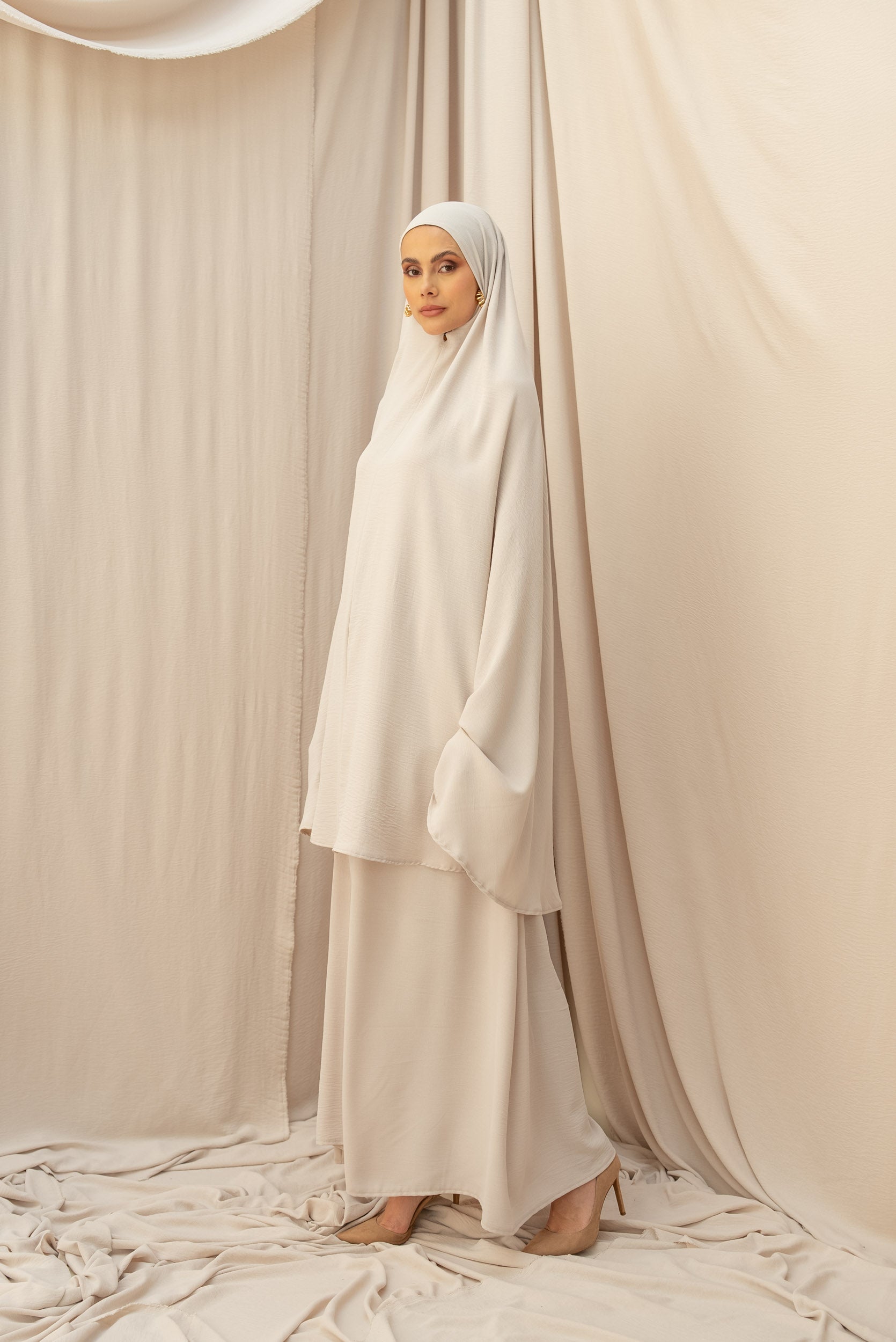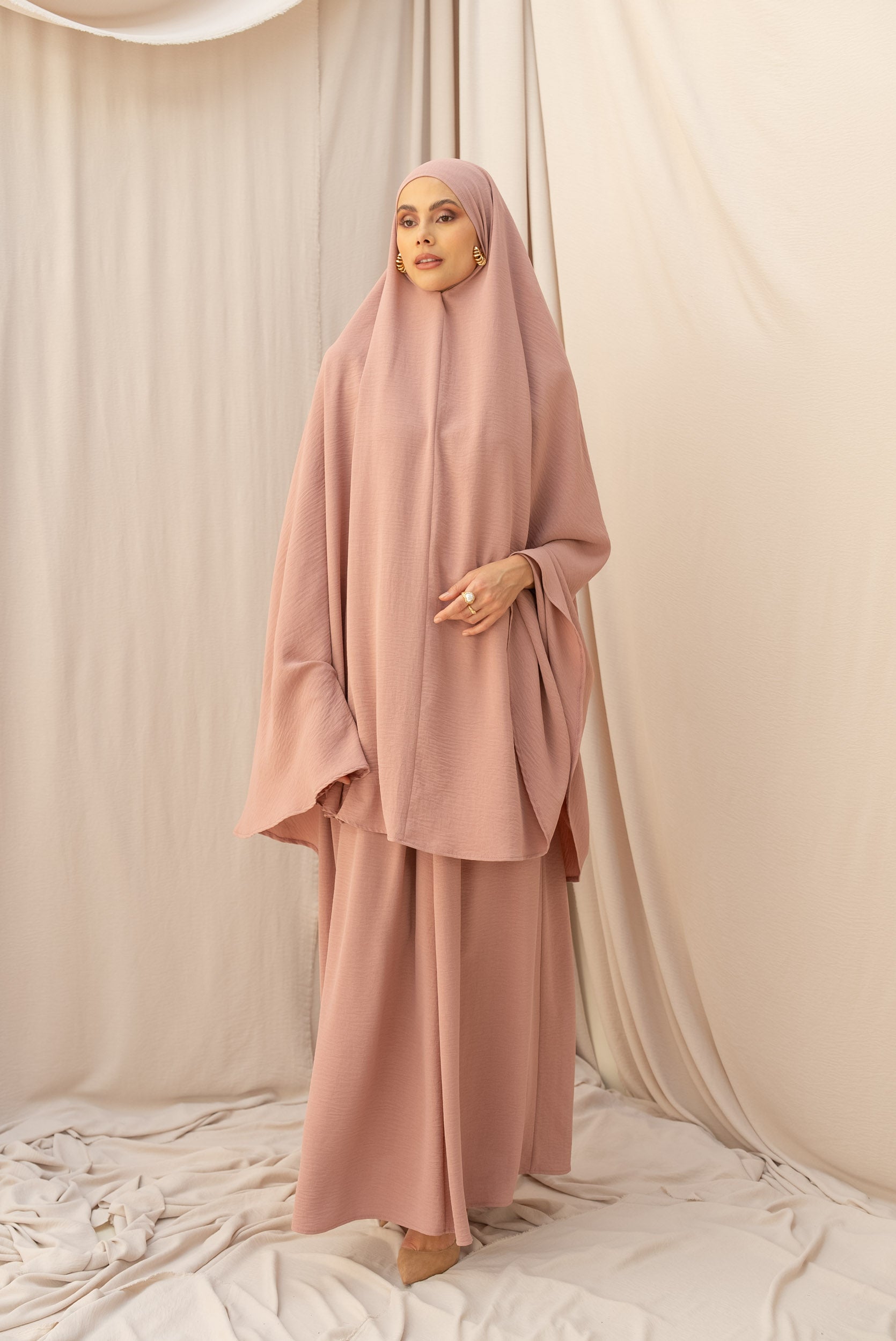 Le Jilbab Janne est un ensemble deux pièces composé d’un khimar sans attache à la coupe ronde, et d’une jupe ample en tissu jazz. Ce tissu est apprécié pour sa légèreté. Un modèle pensé pour le quotidien comme pour les occasions