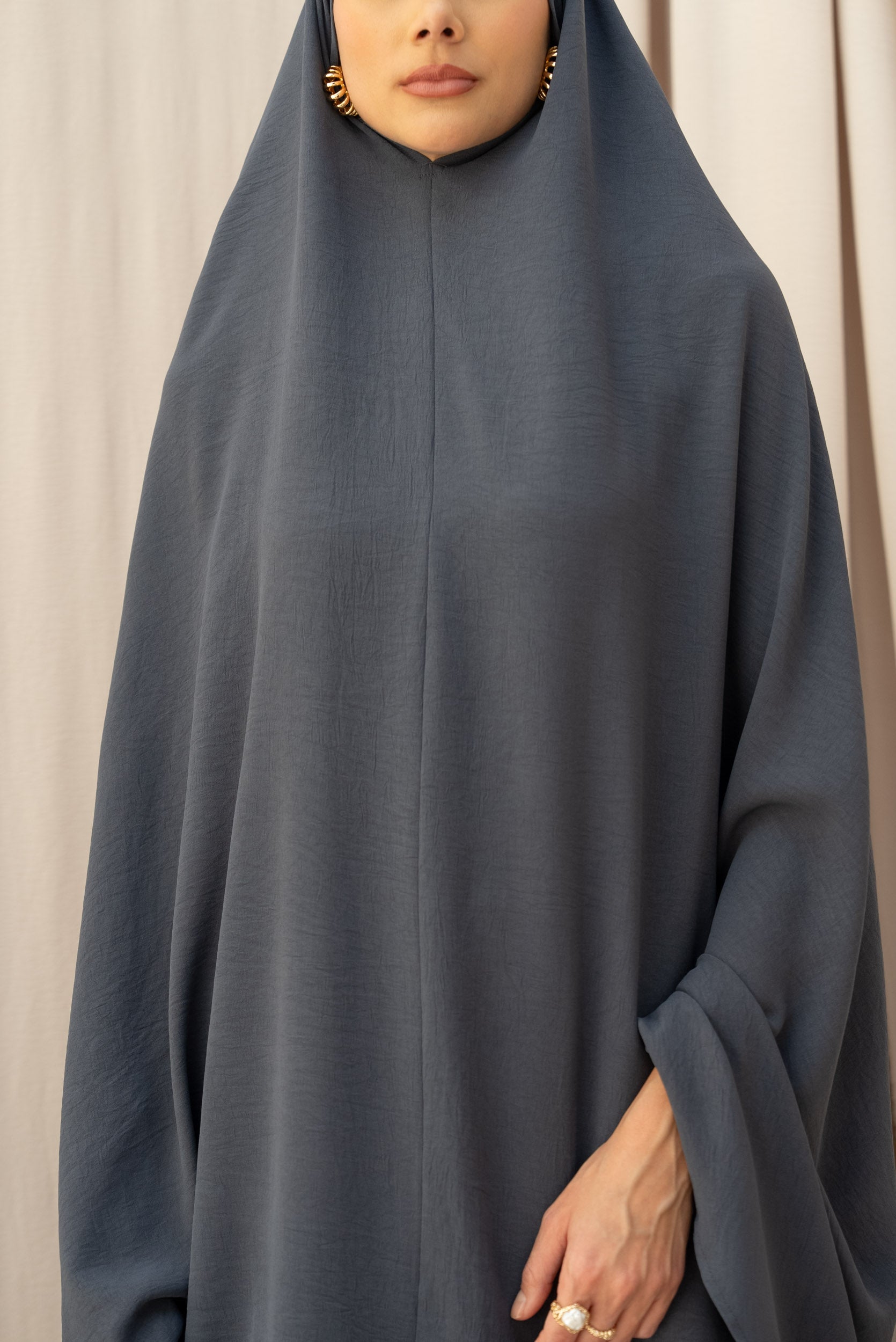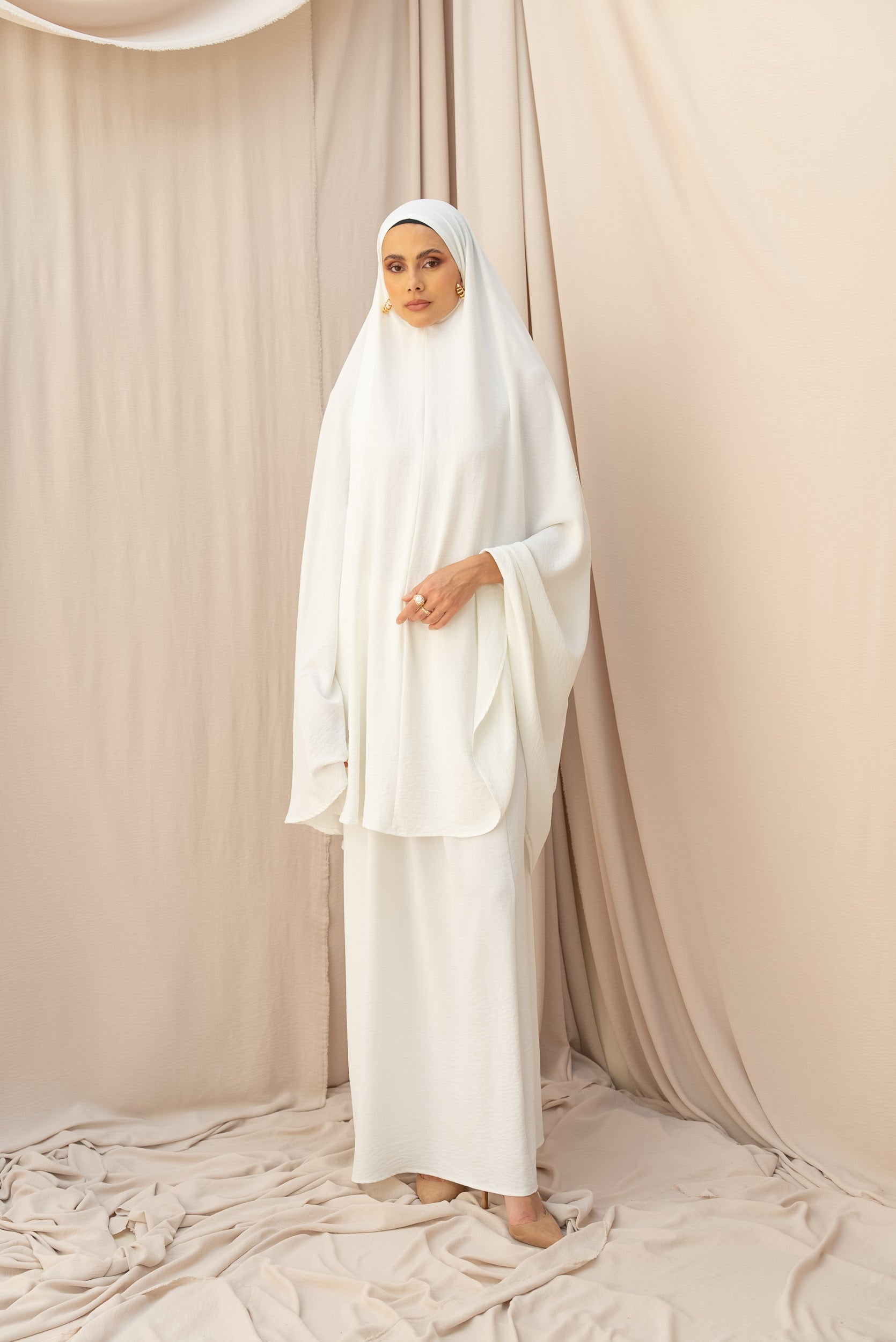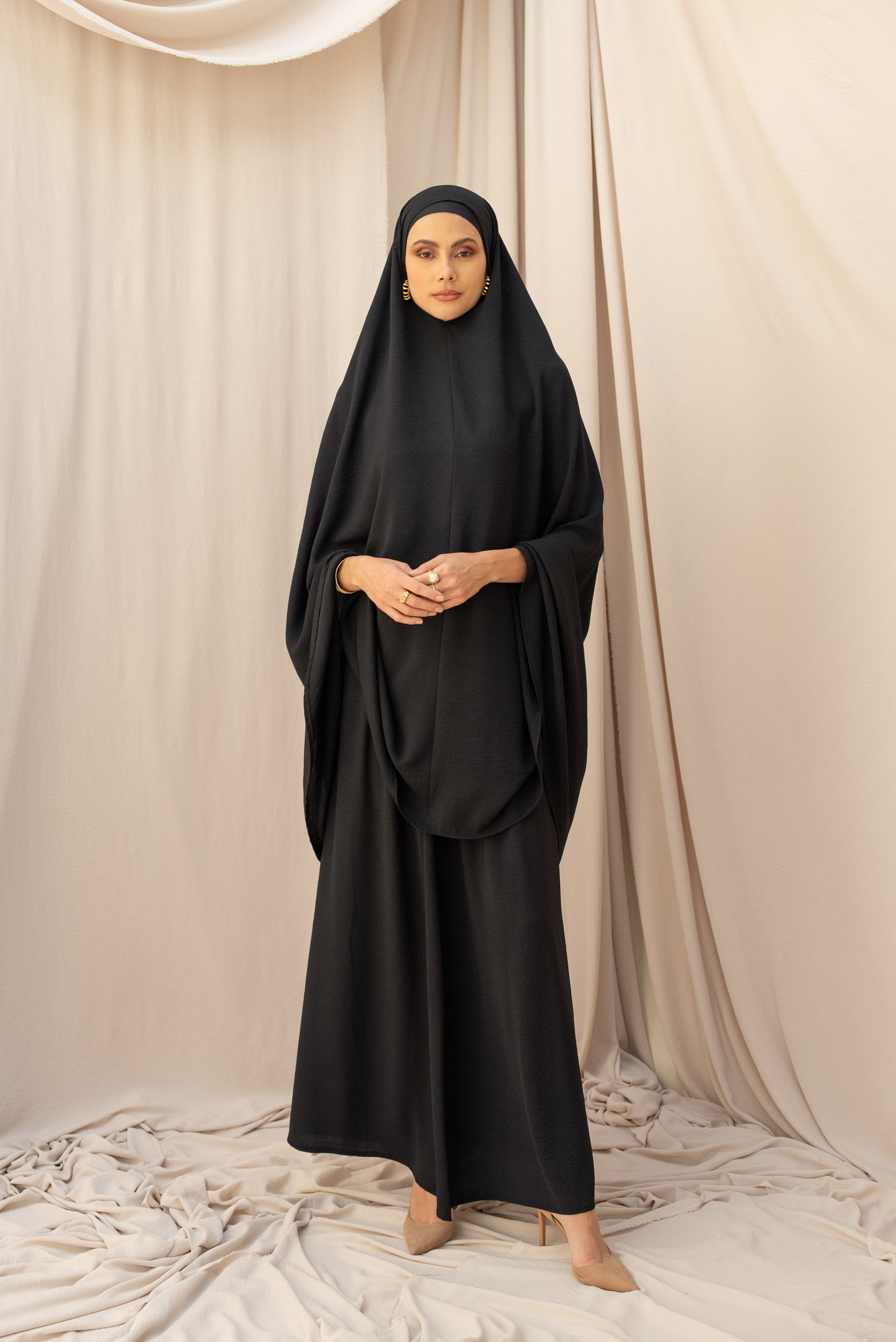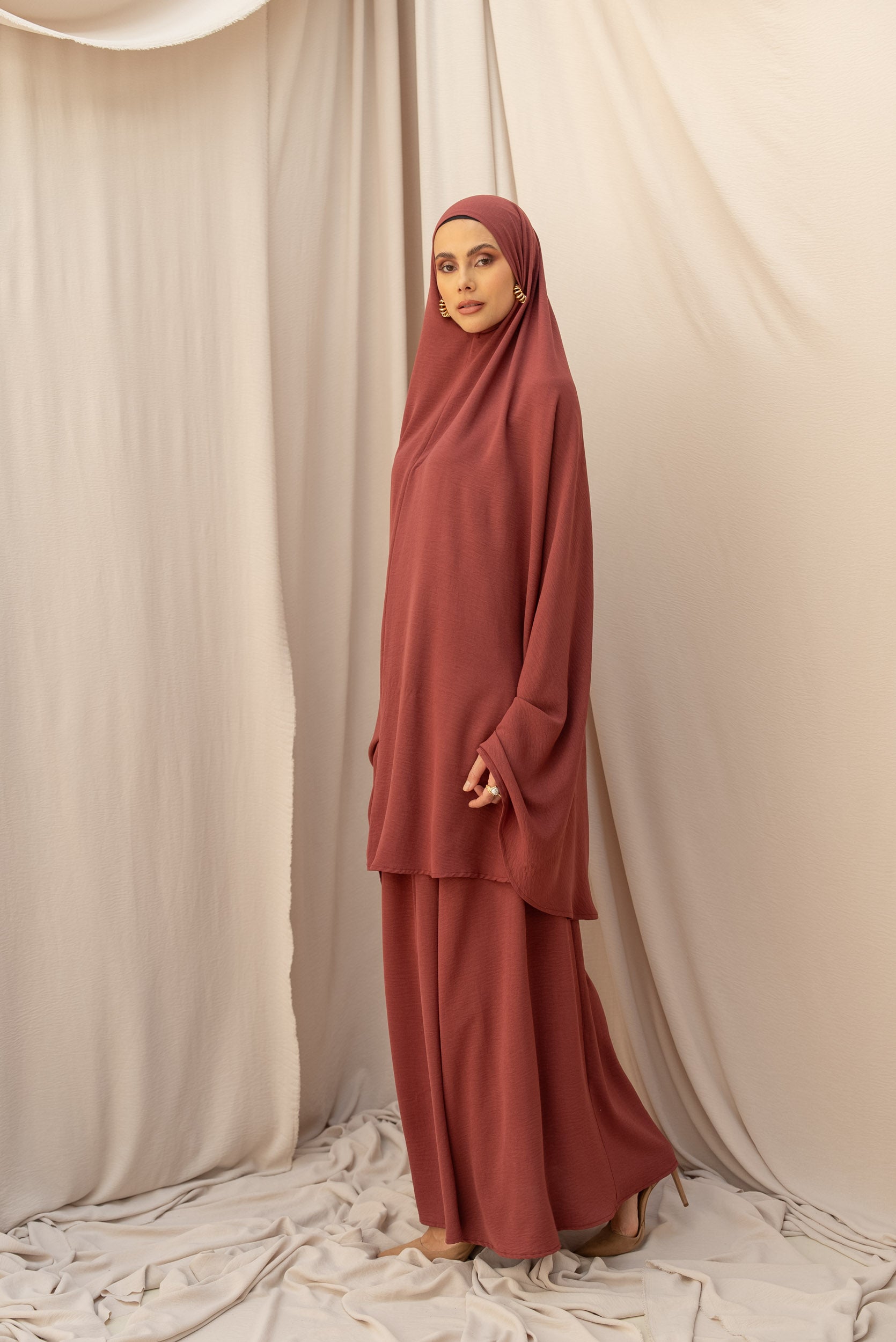 Le Jilbab Janne est un ensemble deux pièces composé d’un khimar sans attache à la coupe ronde, et d’une jupe ample en tissu jazz. Ce tissu est apprécié pour sa légèreté. Un modèle pensé pour le quotidien comme pour les occasions