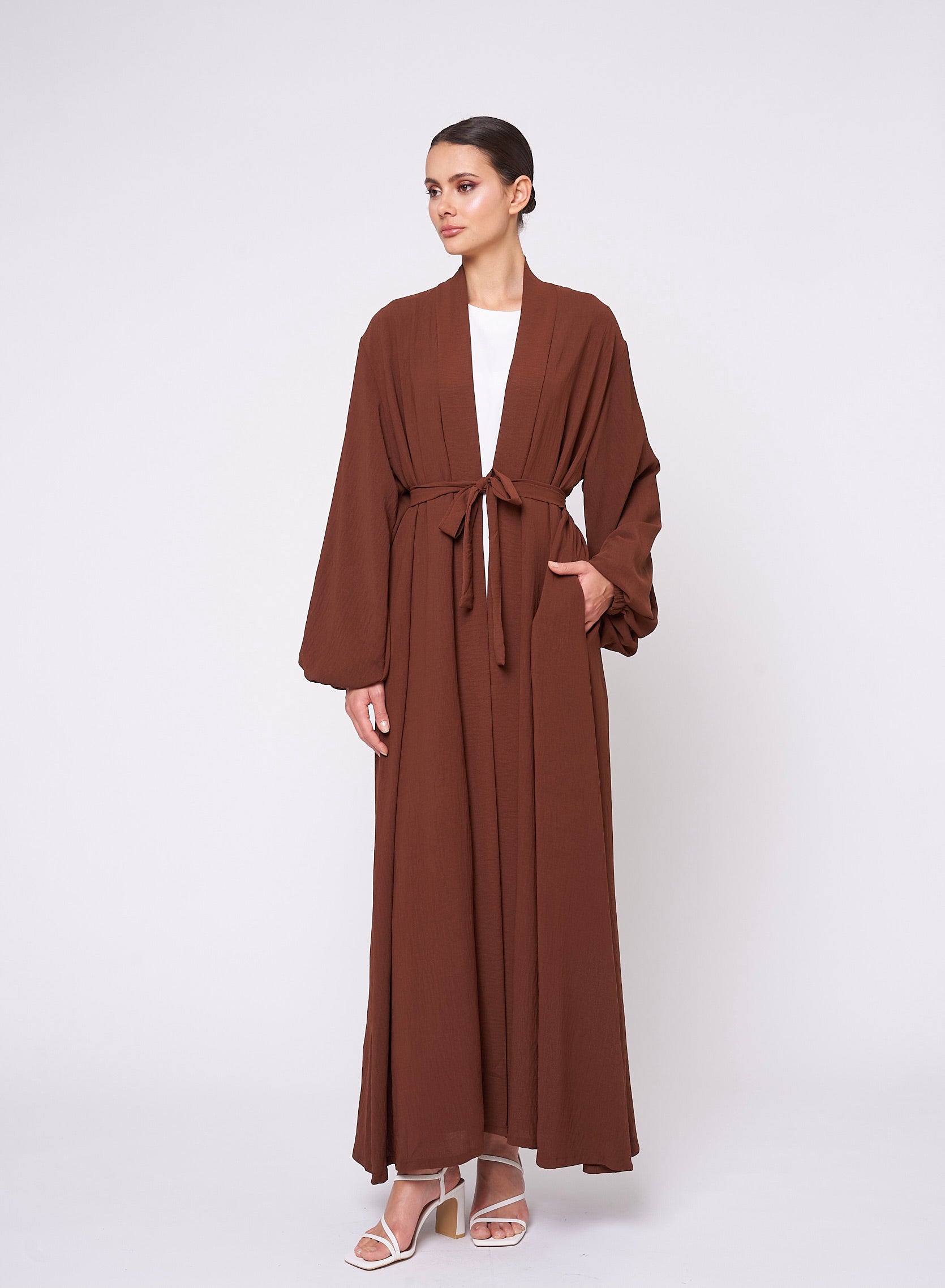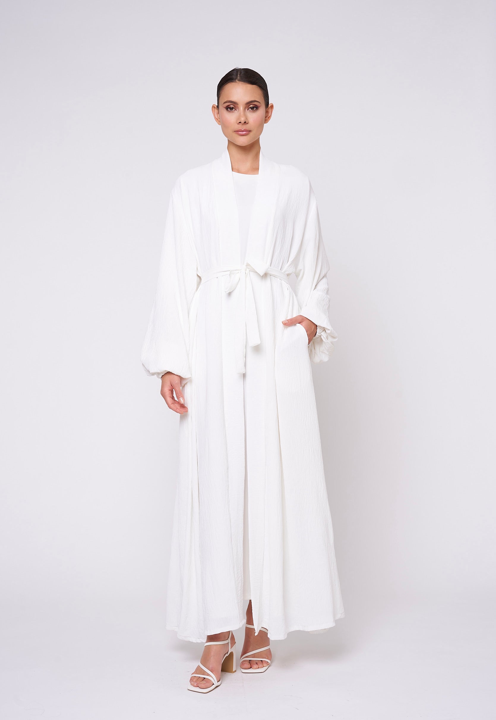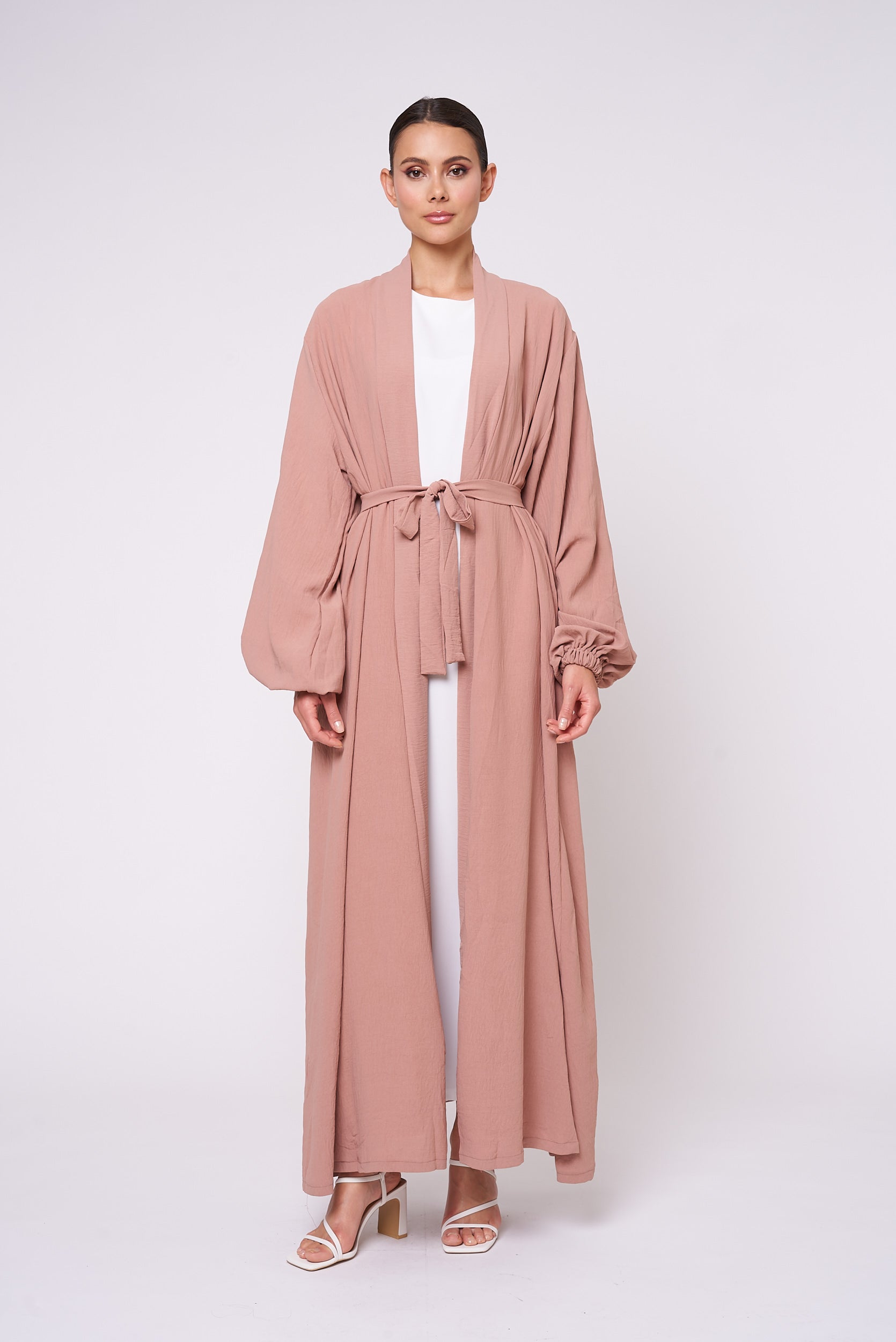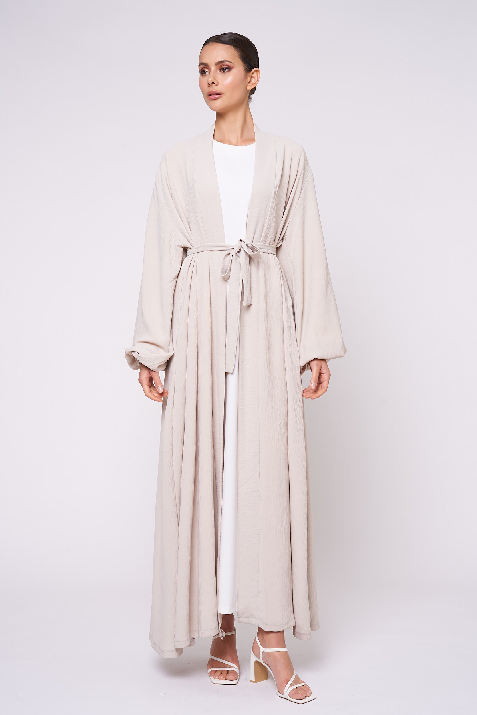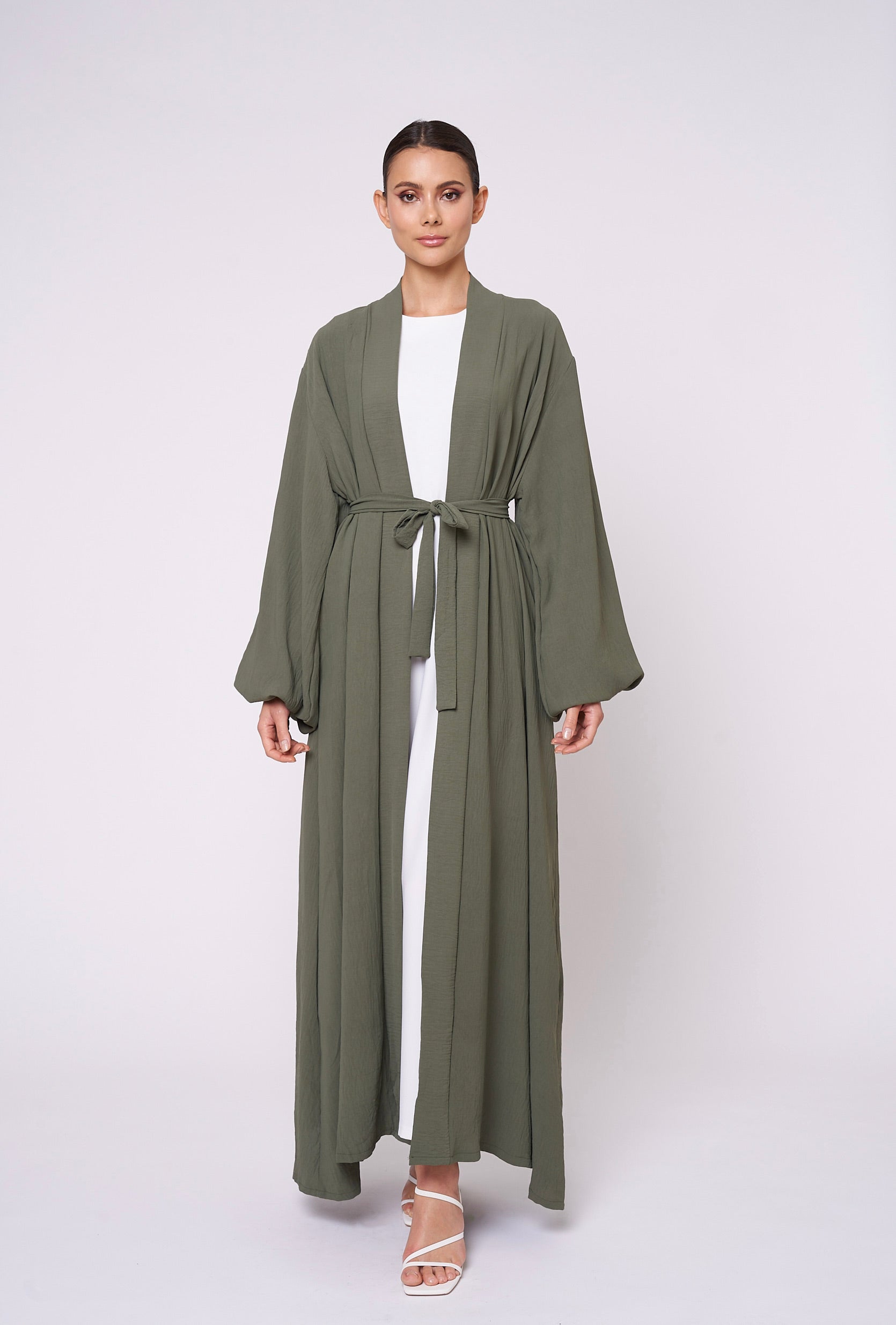Le Kimono Jaz, une valeur sûre pour vos événements. Confectionné en tissu jazz, il mise sur une coupe droite et des manches bouffantes pour un rendu raffiné. À porter sur une abaya, de jour comme de soirée.