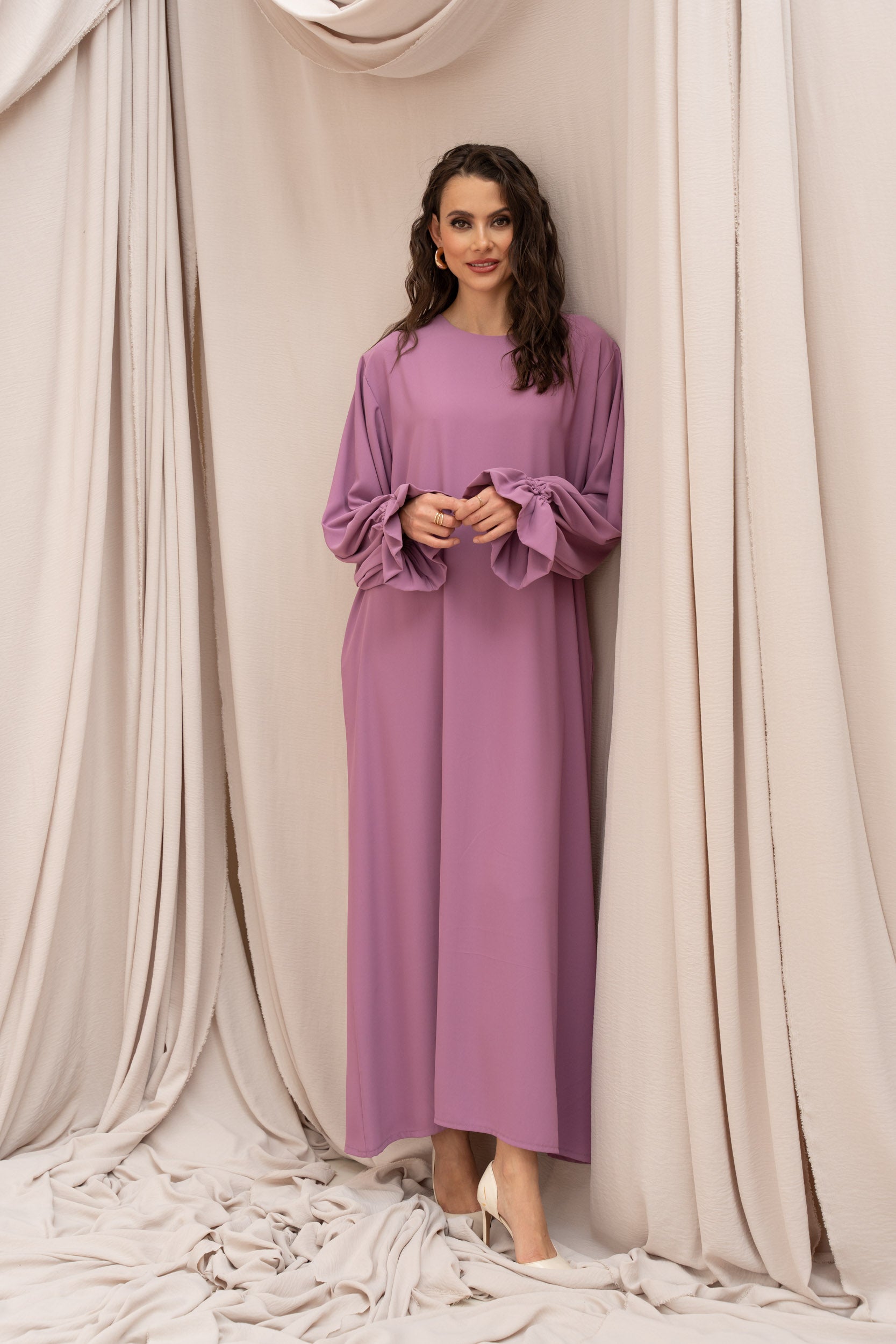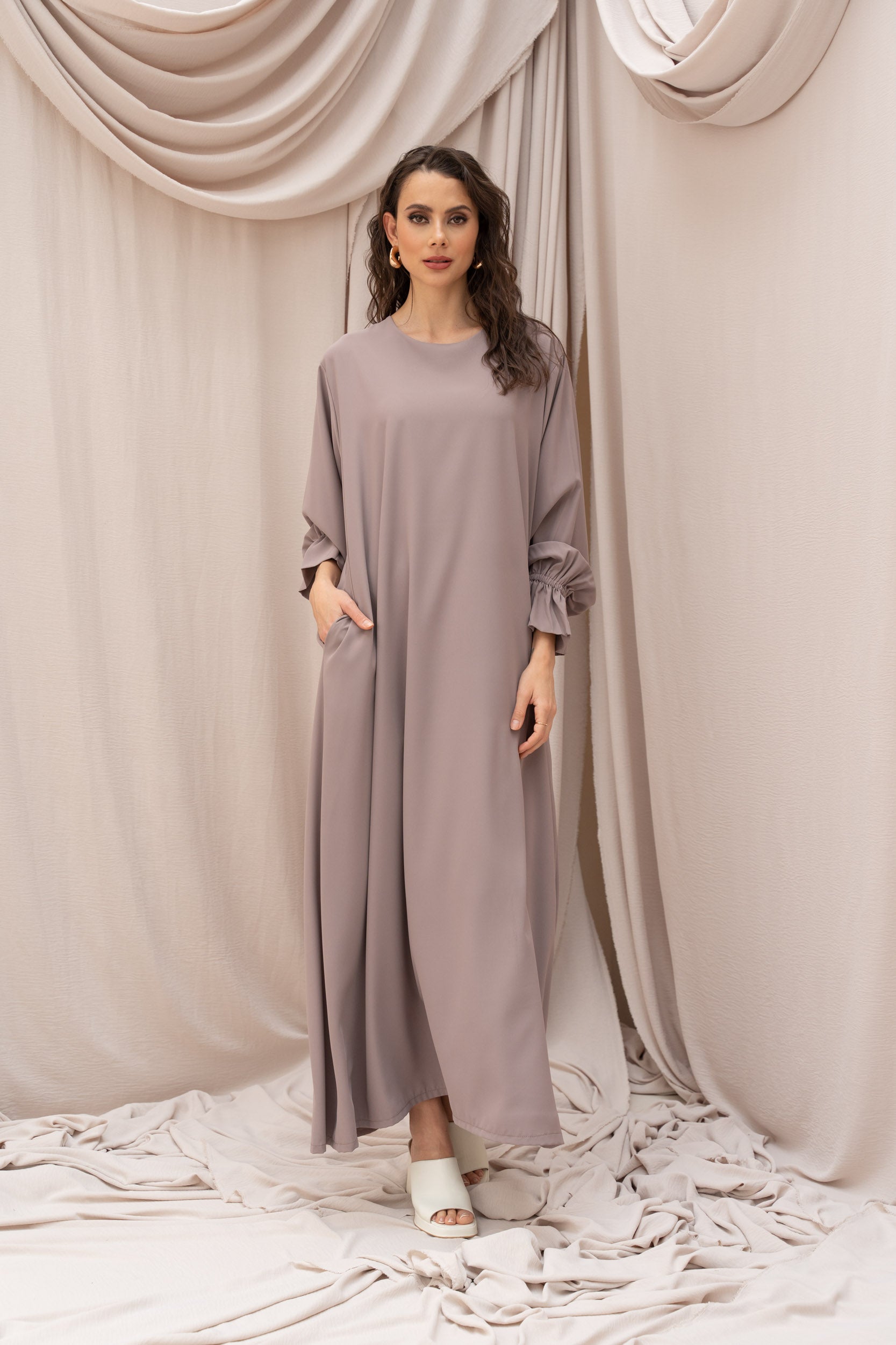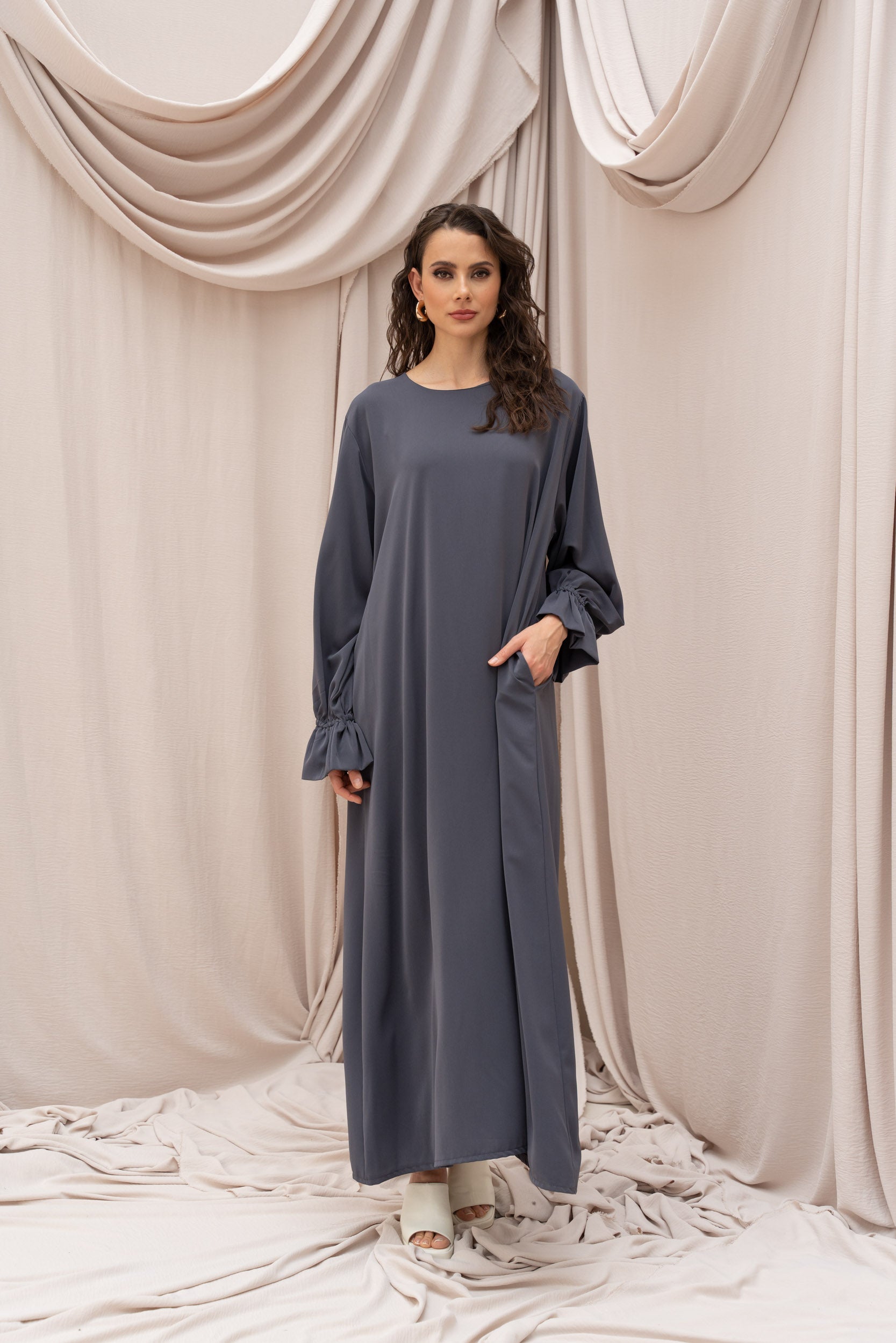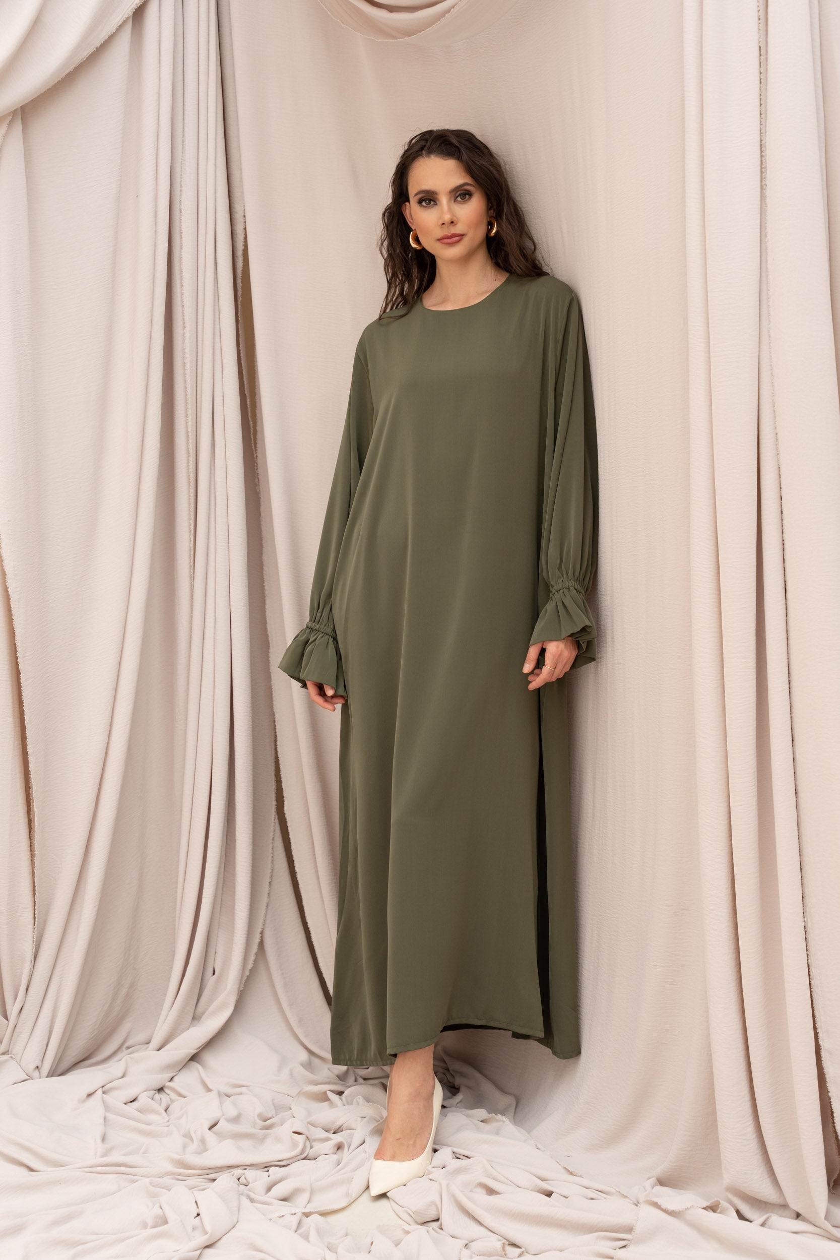 La robe Maram, en soie de médine de qualité supérieure, incarne l’alliance parfaite entre fluidité et raffinement. Sa coupe droite et ses manches tulipes élastiques ajoutent une touche chic. À associer avec un hijab ou khimar pour une allure complète.