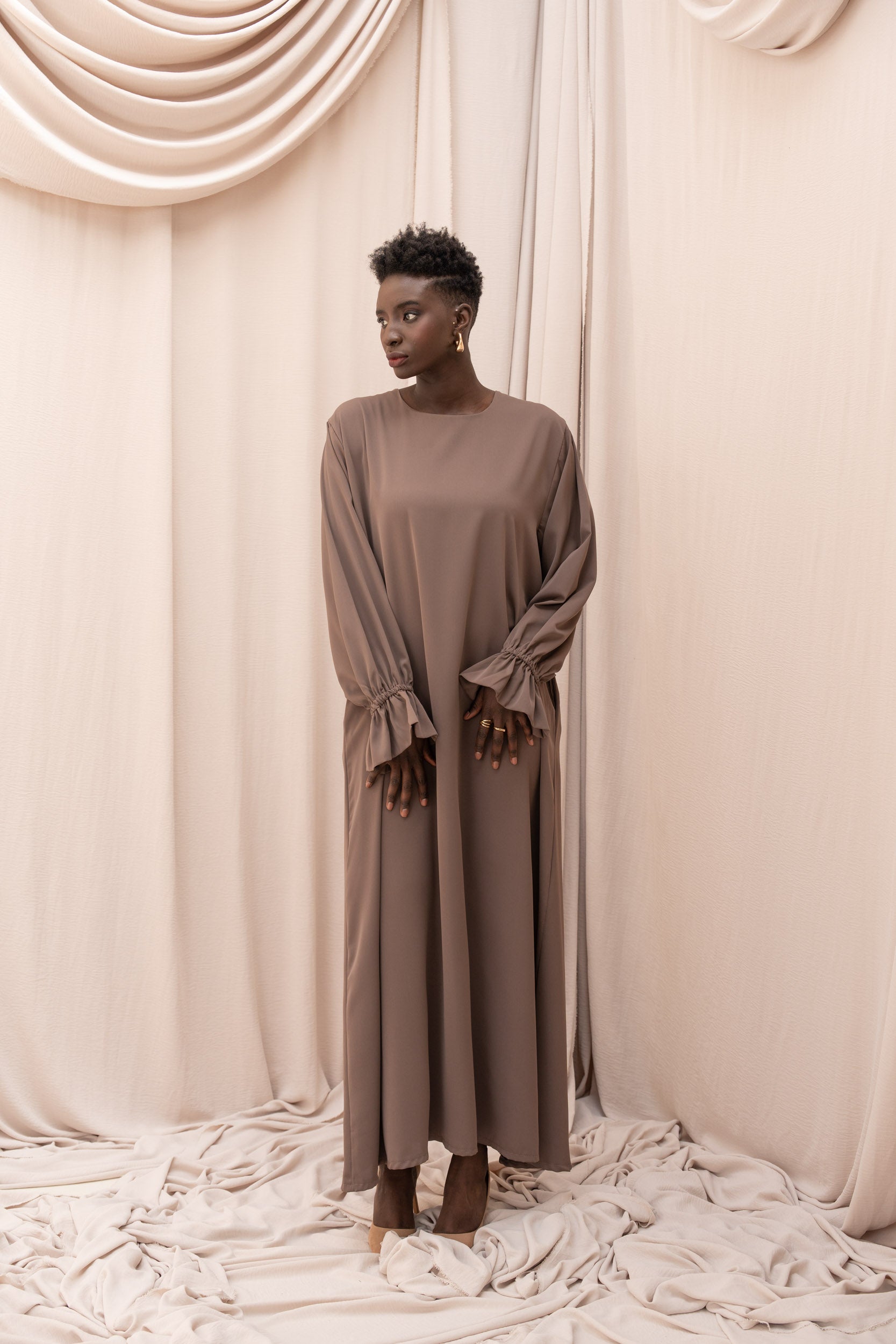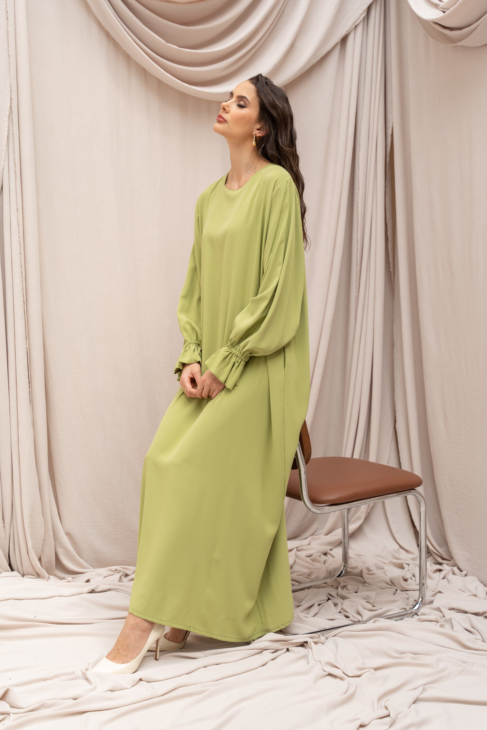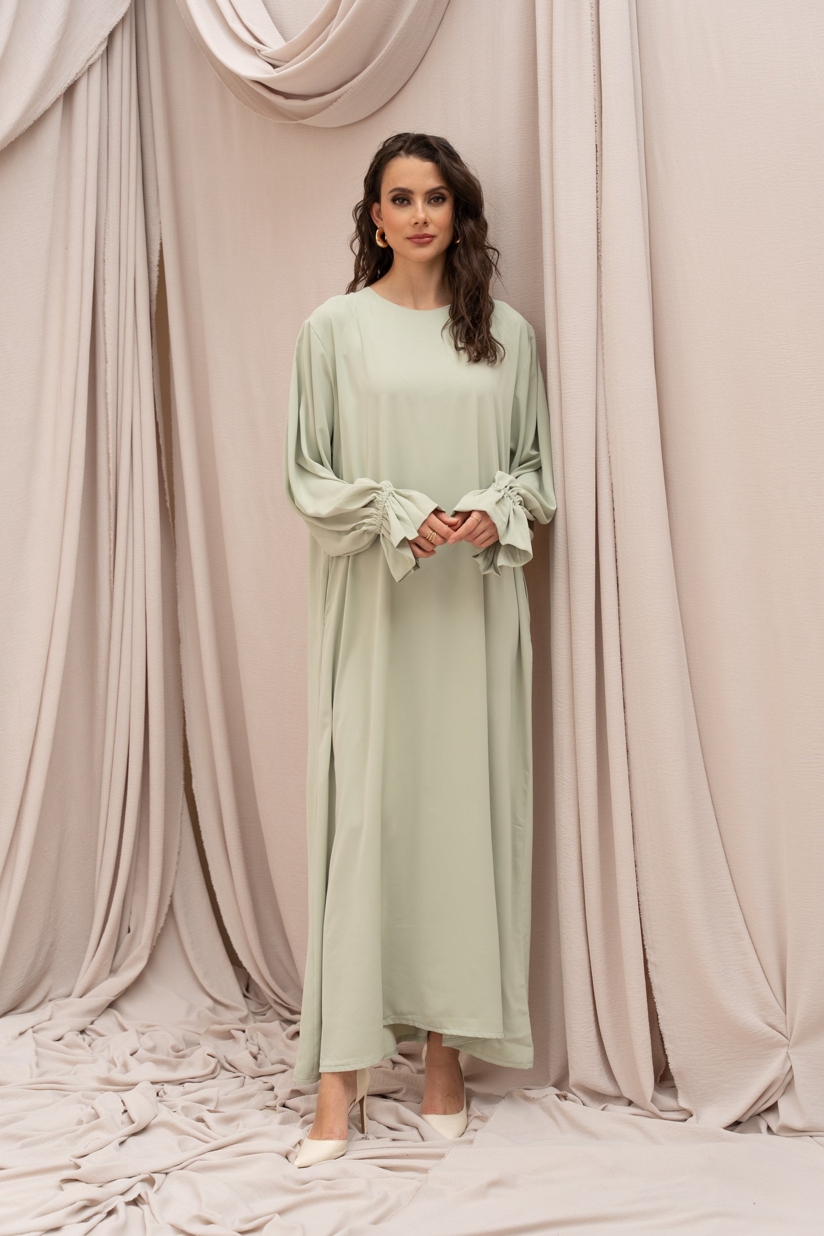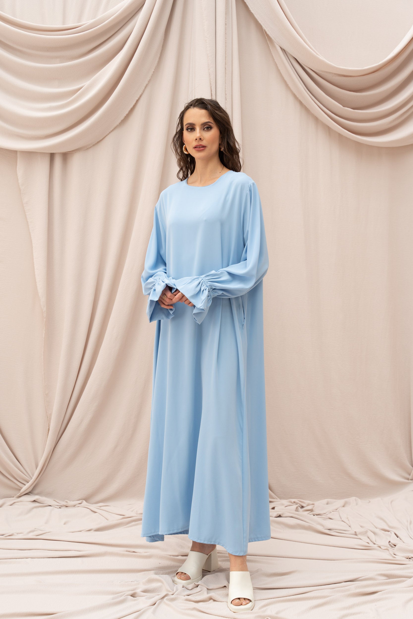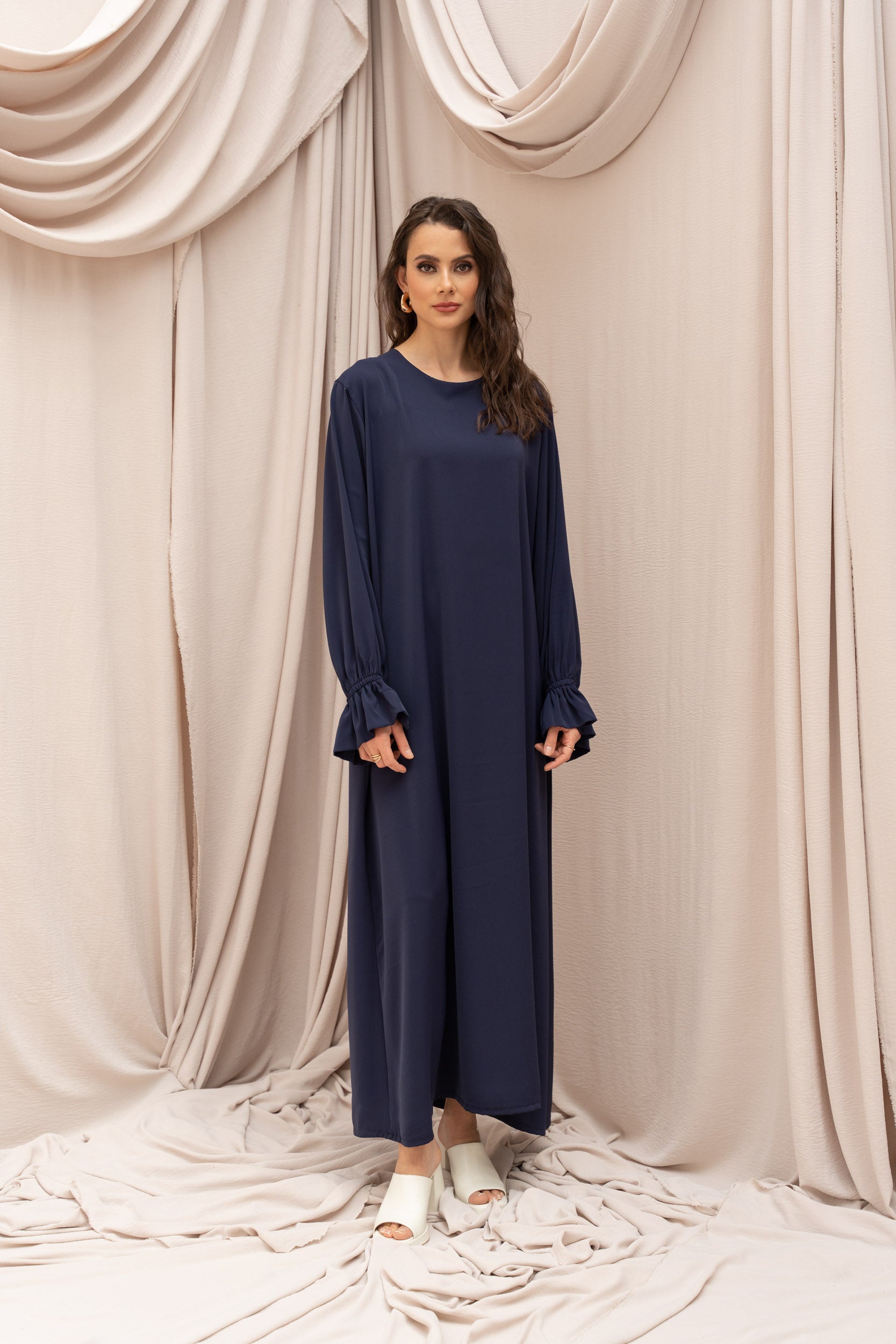 La robe Maram, en soie de médine de qualité supérieure, incarne l’alliance parfaite entre fluidité et raffinement. Sa coupe droite et ses manches tulipes élastiques ajoutent une touche chic. À associer avec un hijab ou khimar pour une allure complète.