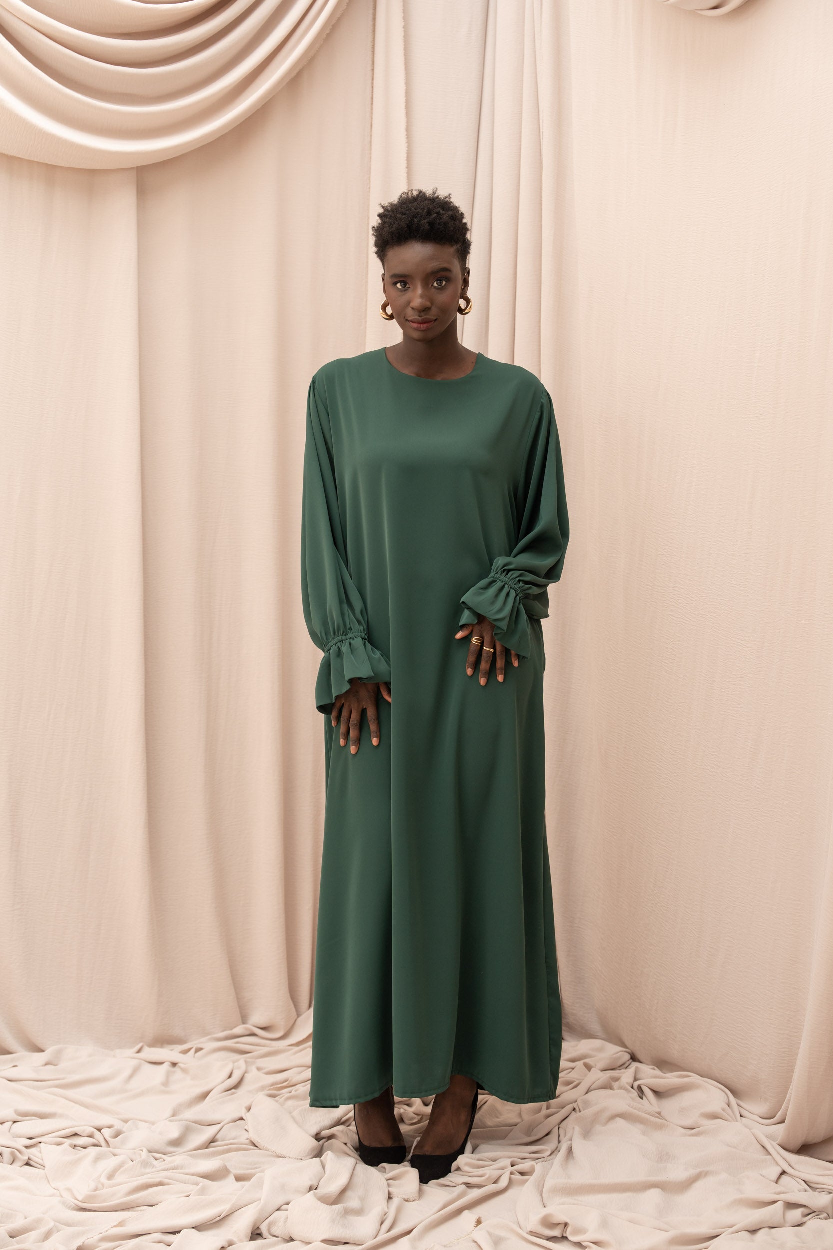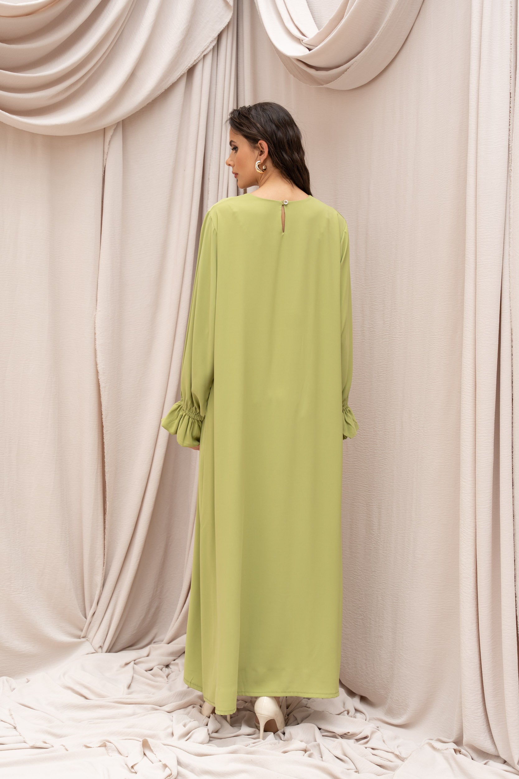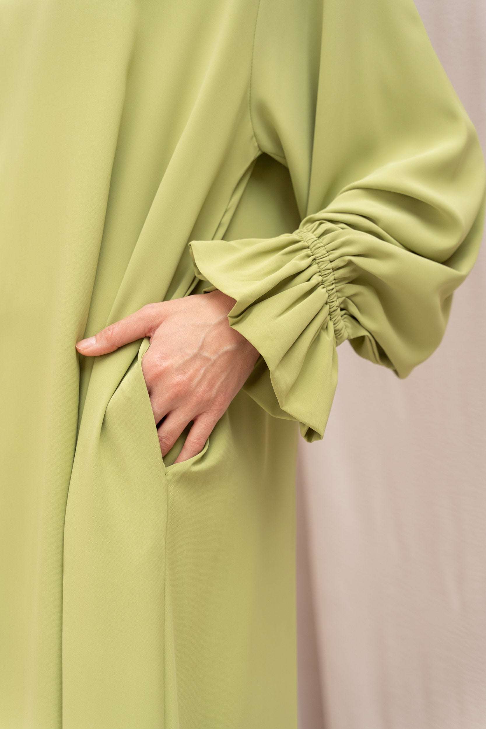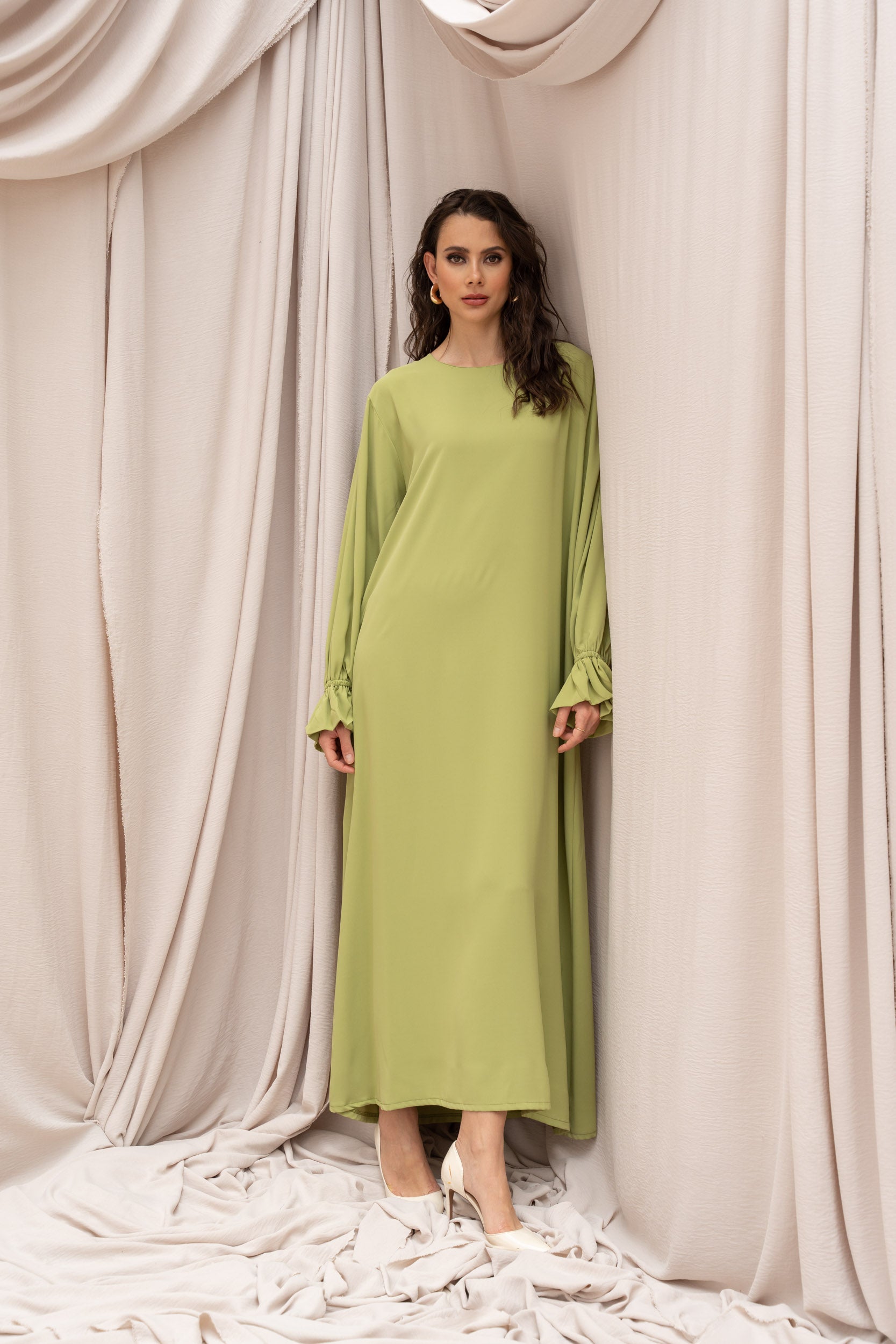 La robe Maram, en soie de médine de qualité supérieure, incarne l’alliance parfaite entre fluidité et raffinement. Sa coupe droite et ses manches tulipes élastiques ajoutent une touche chic. À associer avec un hijab ou khimar pour une allure complète.