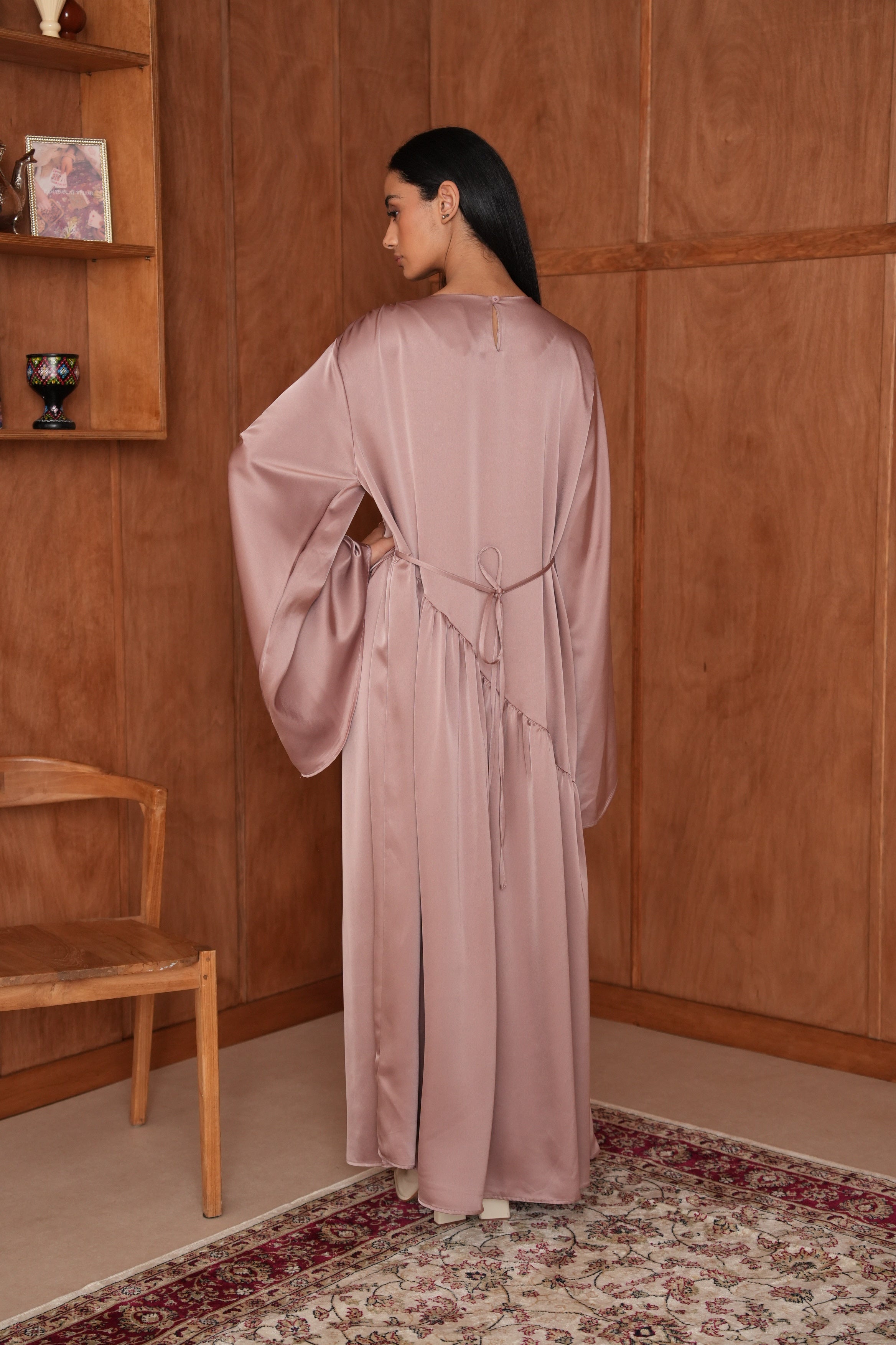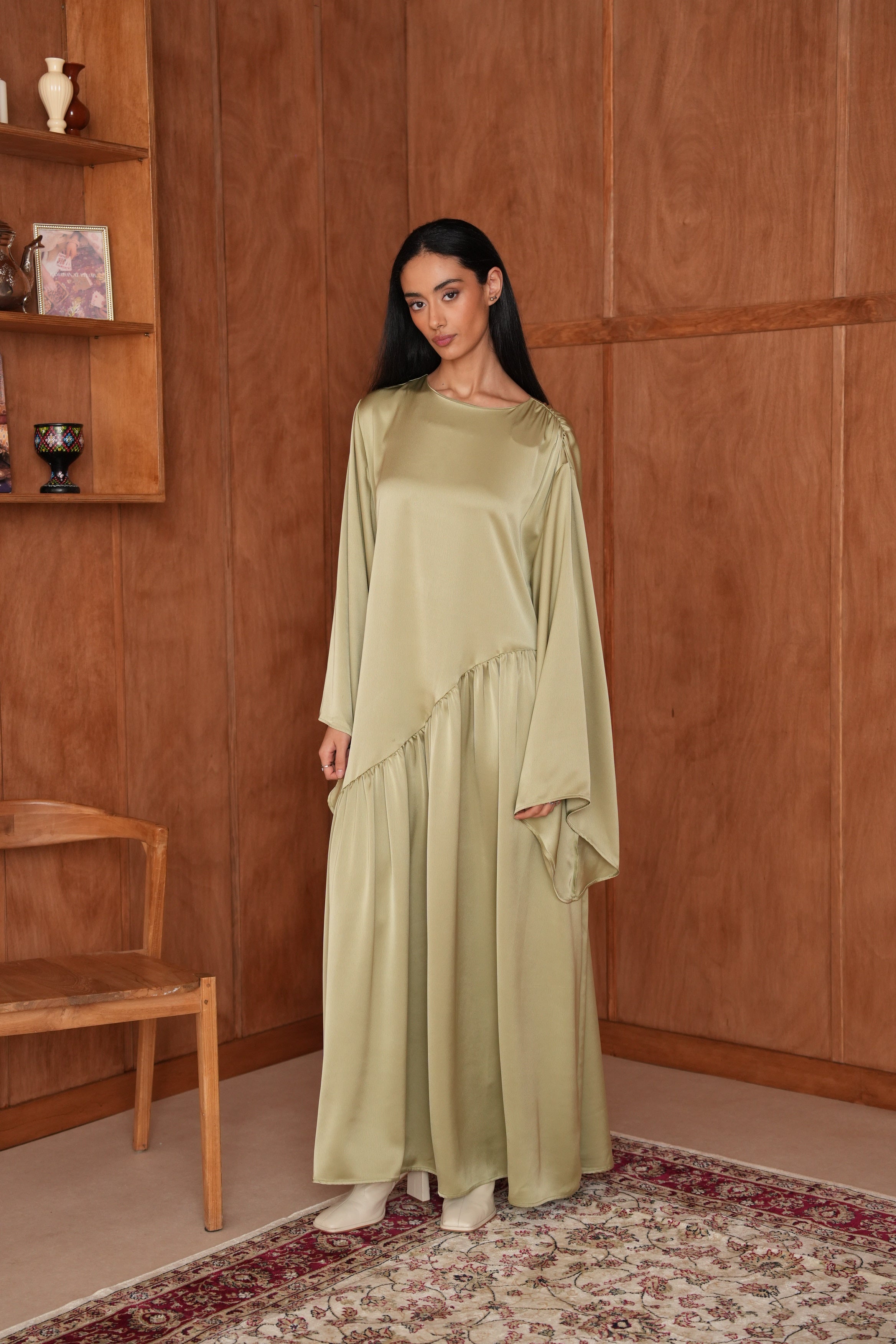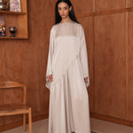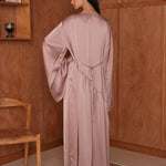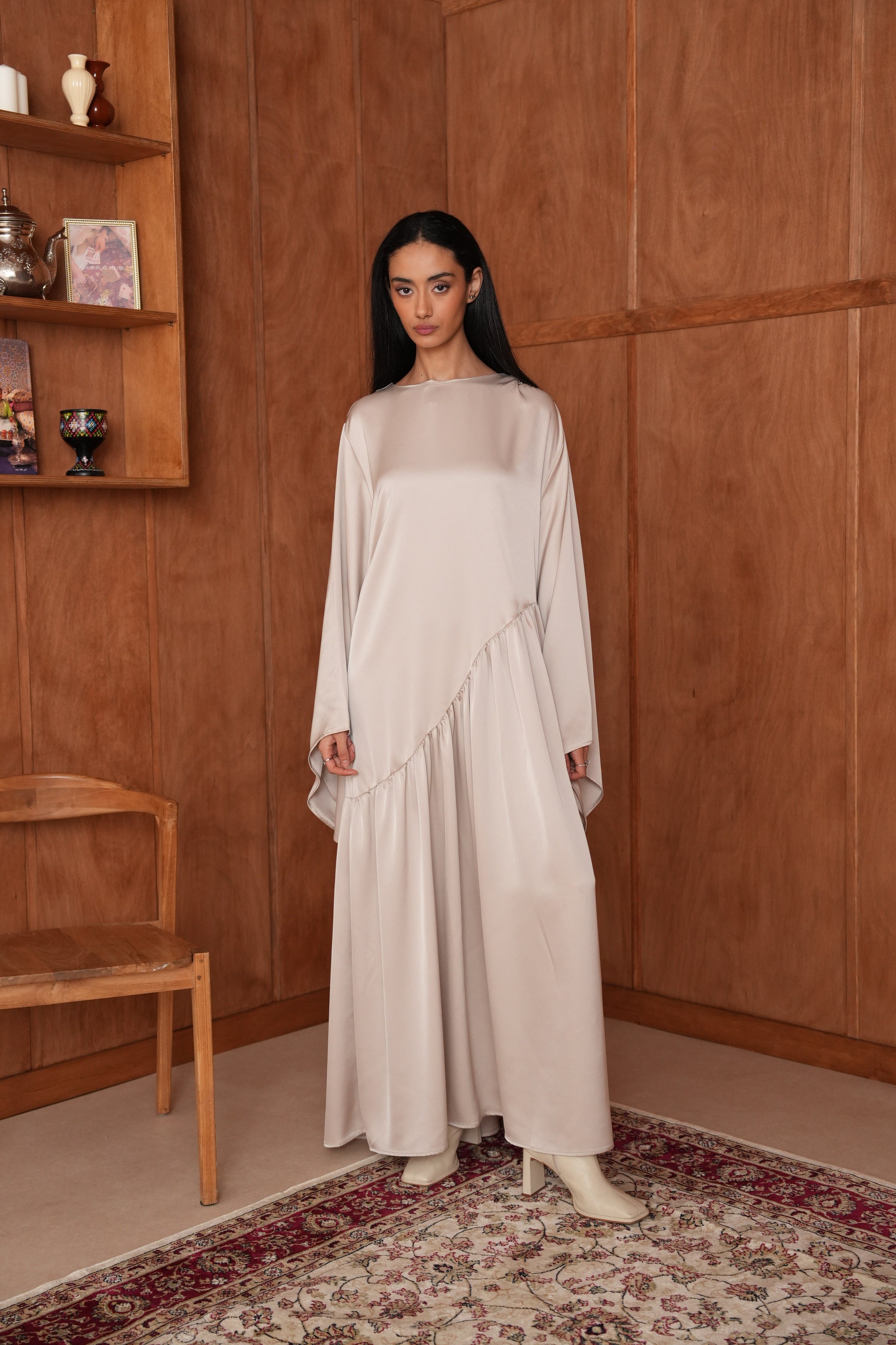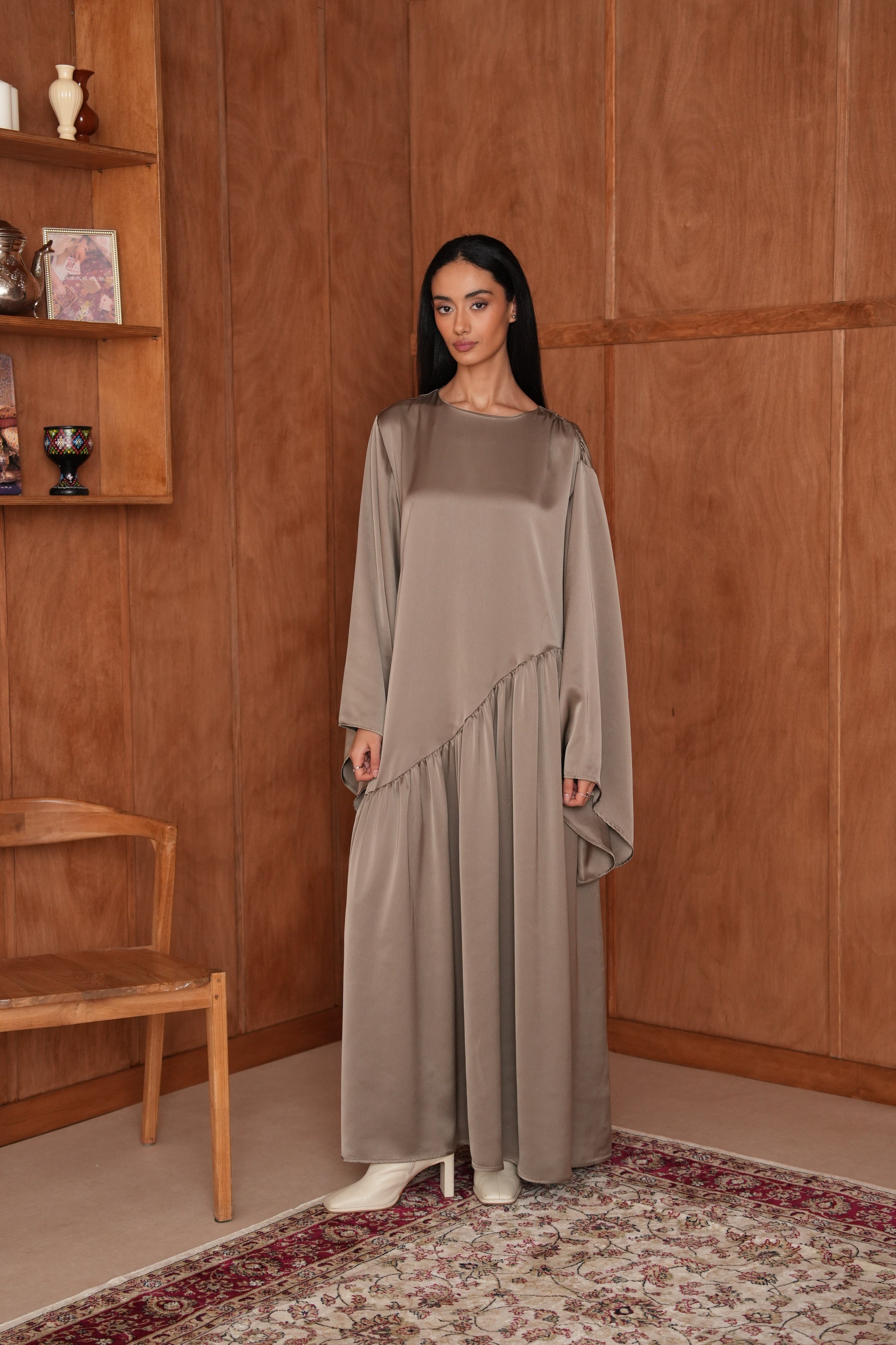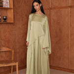 La Robe Hidaya en satin asymétrique allie élégance et modernité. Son tissu doux et lumineux épouse la silhouette avec fluidité, et son fil à nouer derrière permet de créer un joli effet ajusté. Pour un rendu plus modeste, vous pouvez aussi la porter simplement sans l’attacher. Idéale pour vos soirées et occasions spéciales.