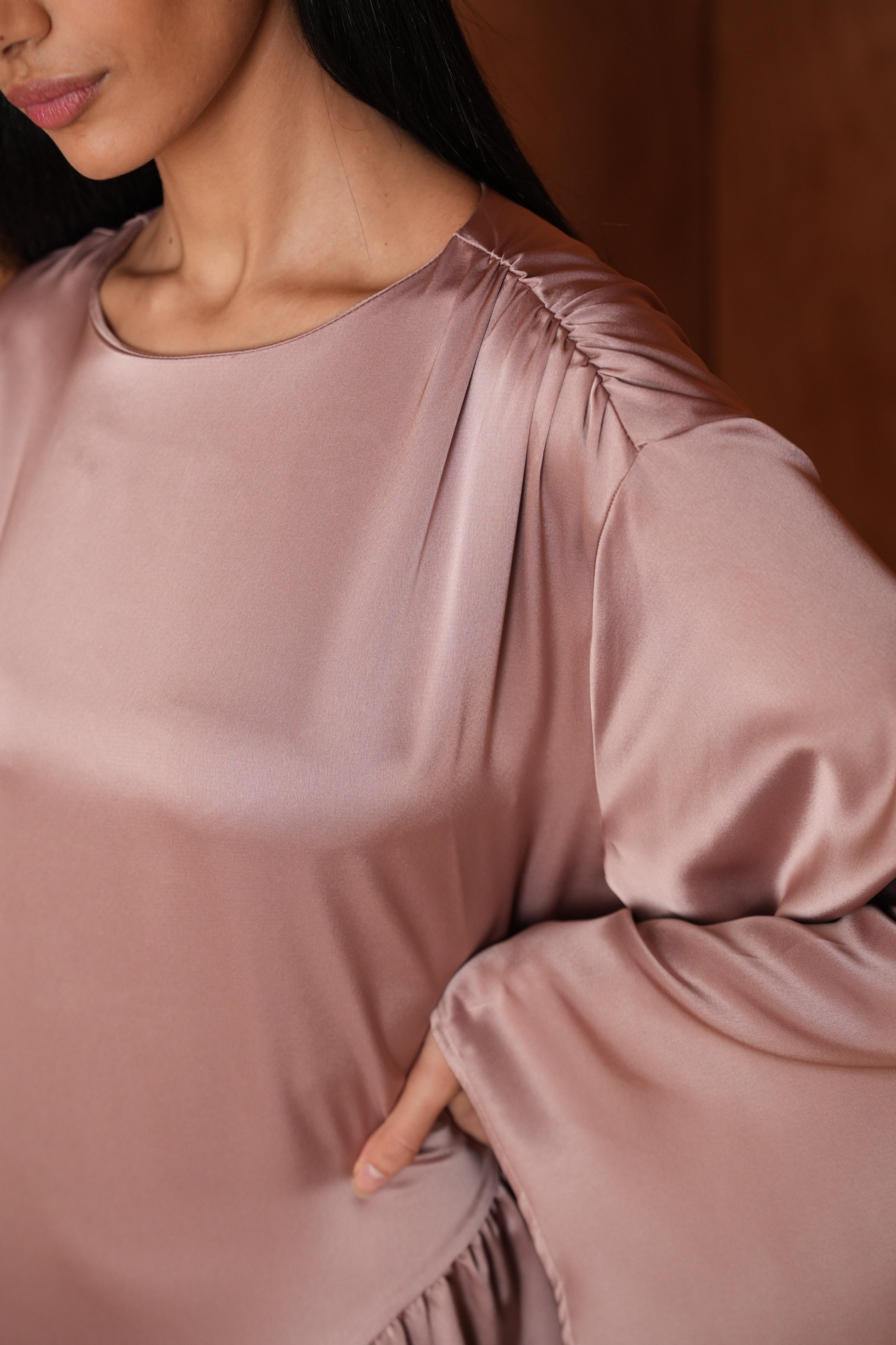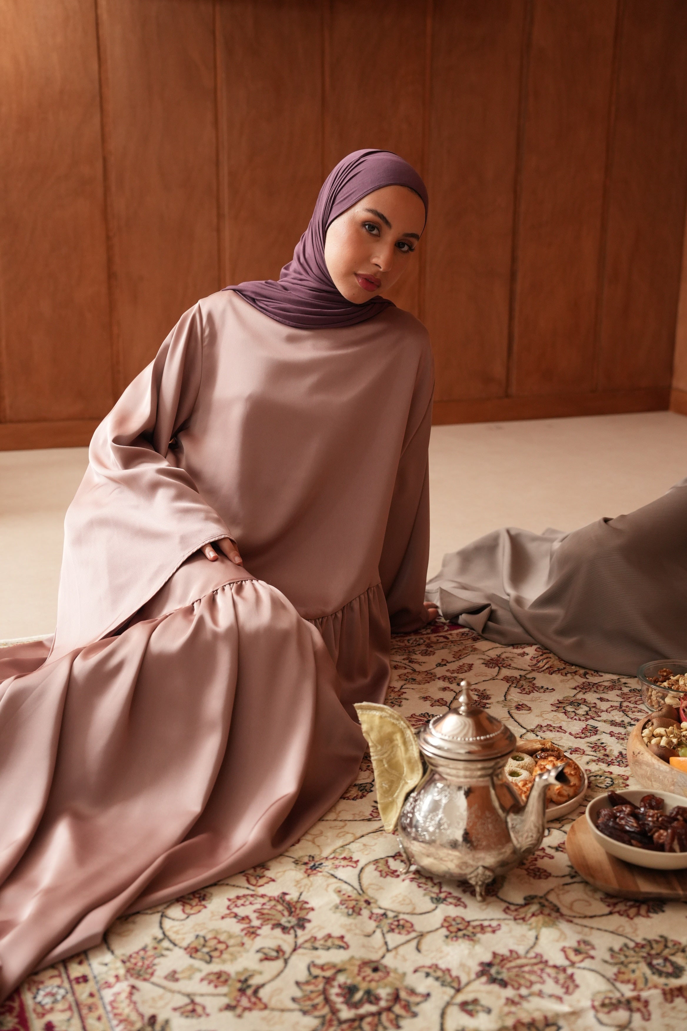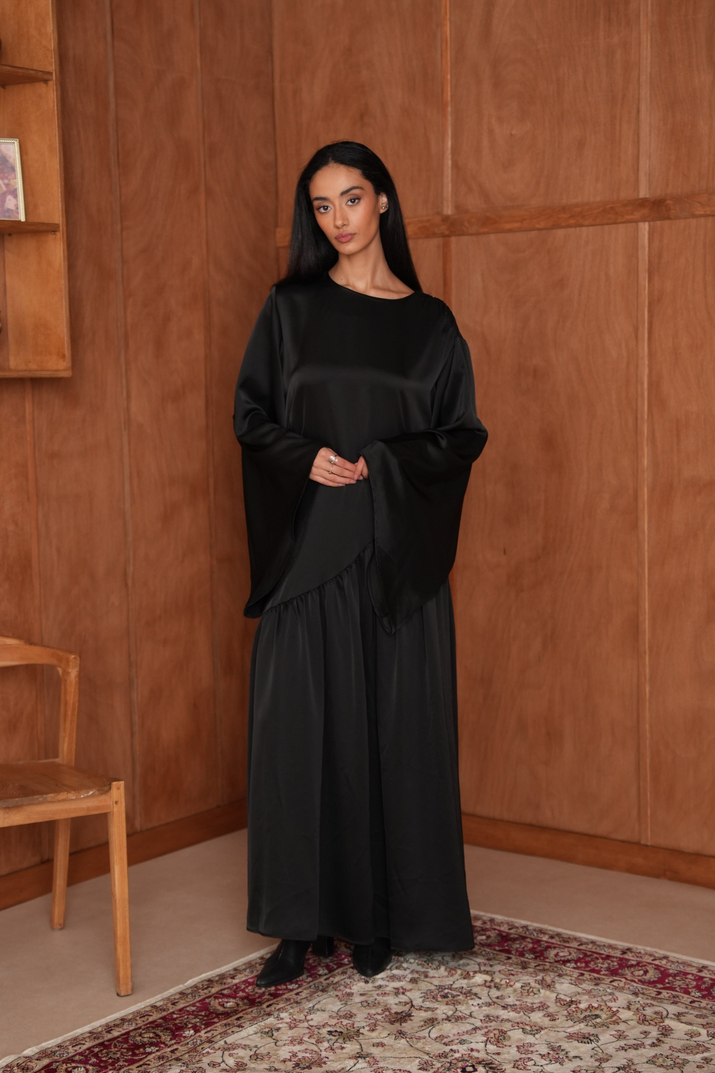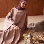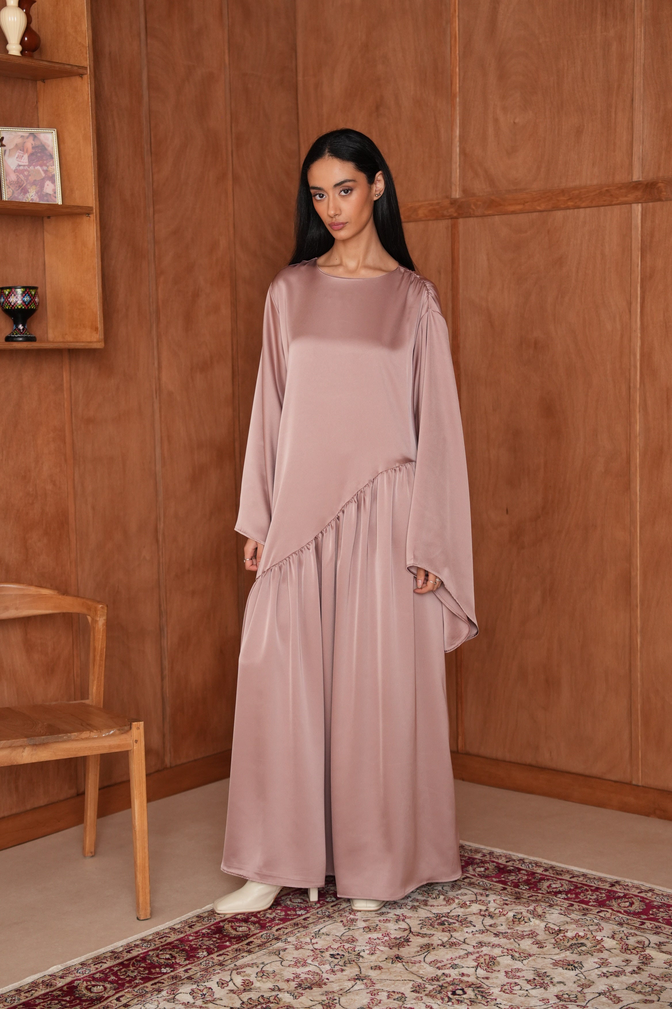 La Robe Hidaya en satin asymétrique allie élégance et modernité. Son tissu doux et lumineux épouse la silhouette avec fluidité, et son fil à nouer derrière permet de créer un joli effet ajusté. Pour un rendu plus modeste, vous pouvez aussi la porter simplement sans l’attacher. Idéale pour vos soirées et occasions spéciales.